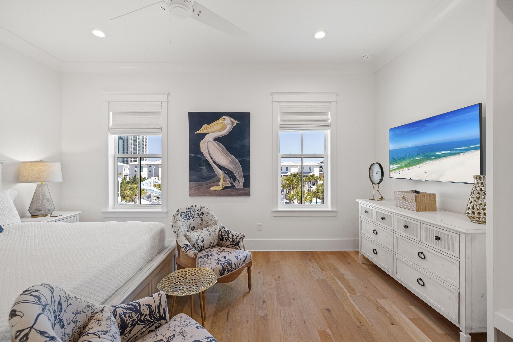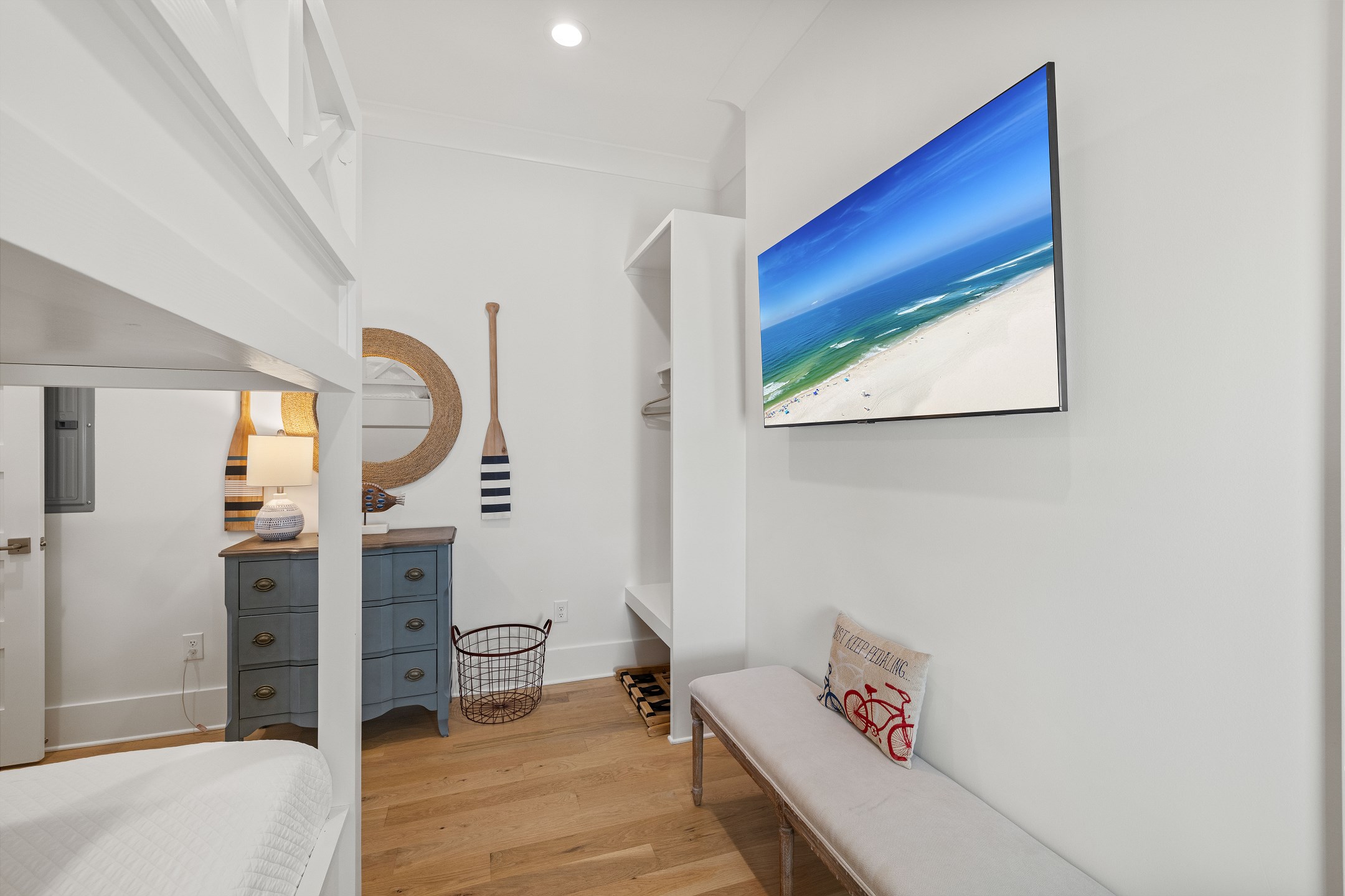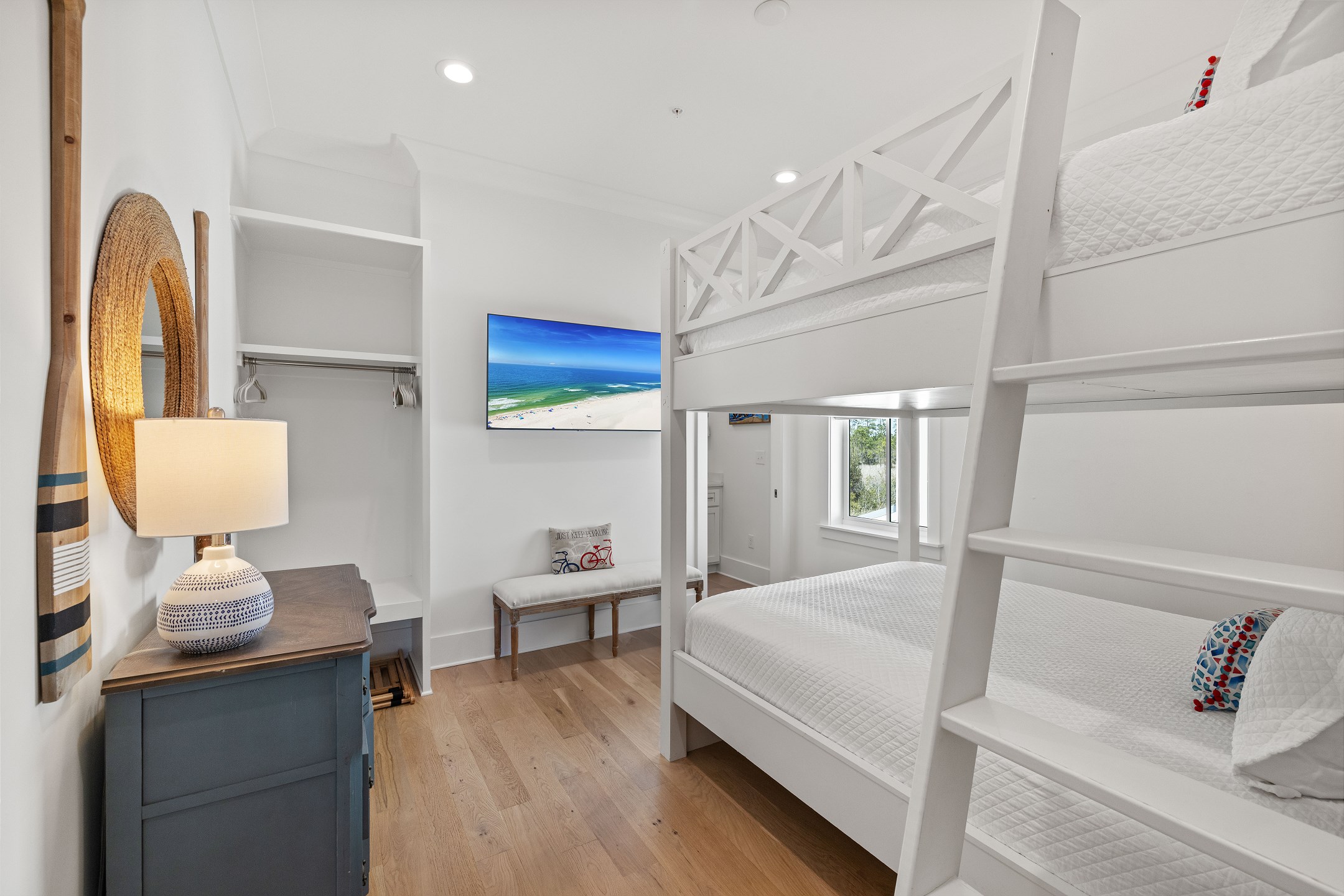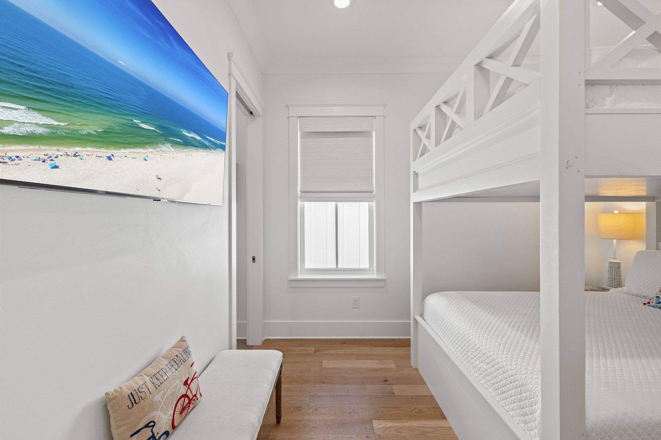 The cottage offers versatile sleeping options—the Primary bedroom with a King bed, the Guest bedroom with a custom built-in Queen-over-Queen bunk bed, and the living room with a custom built-in Twin-over-Twin bunk bed. Each room is equipped with large smart TVs for a high-quality entertainment experience. Guests can log into their streaming accounts for personalized viewing, ensuring a relaxing and enjoyable stay. Book your stay at Wade 'n Sea in Beach Village Resort for a vacation that's extraordinary in every way.