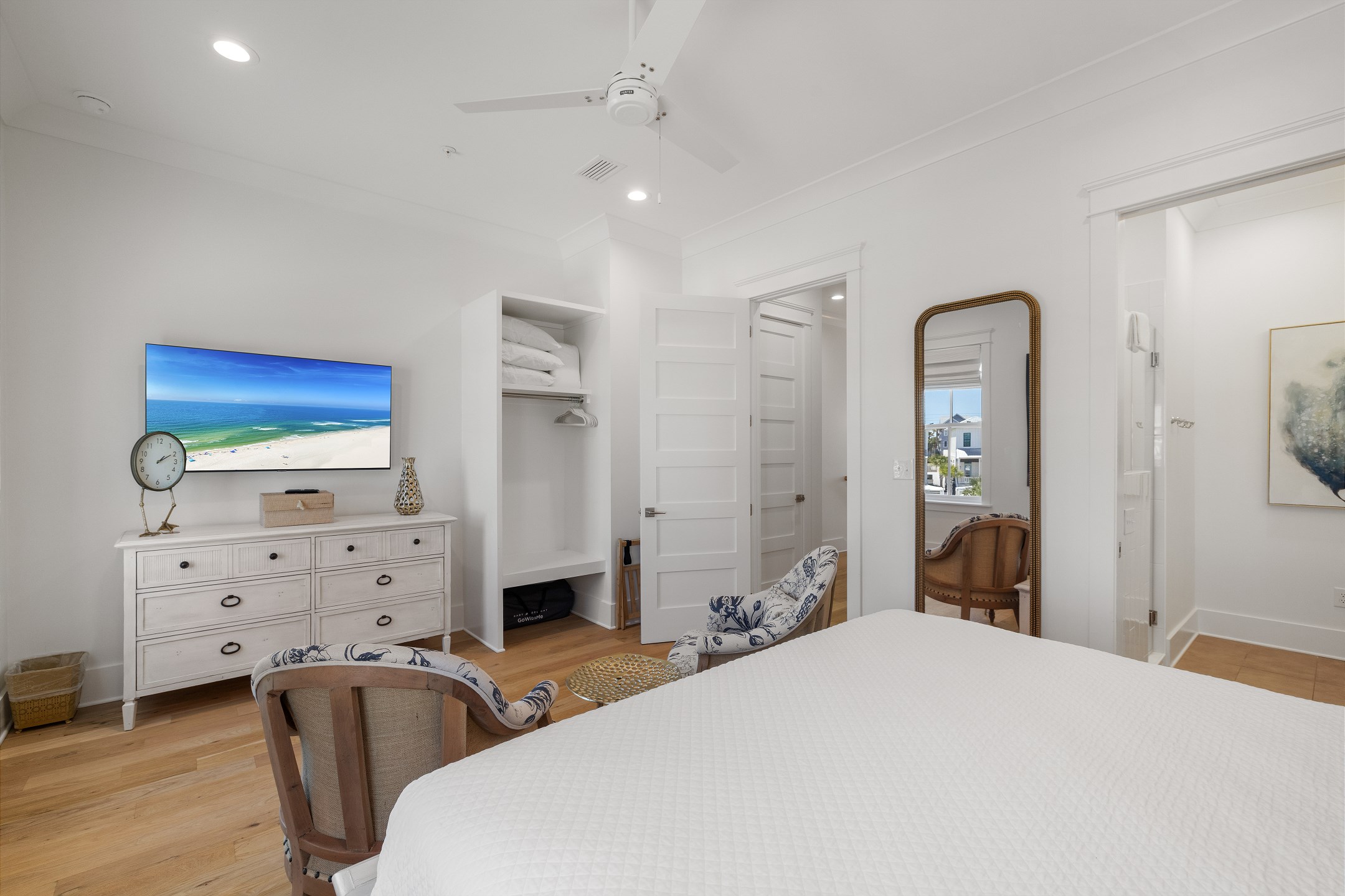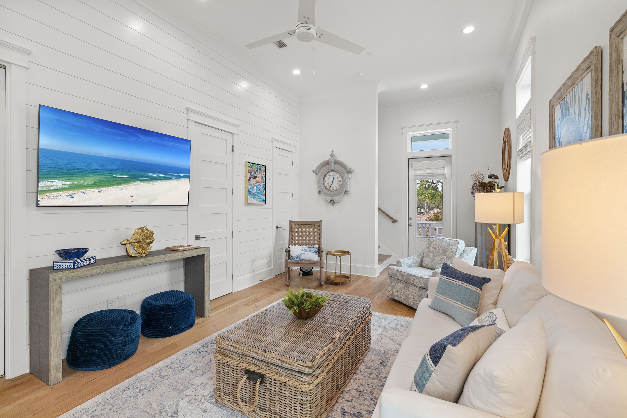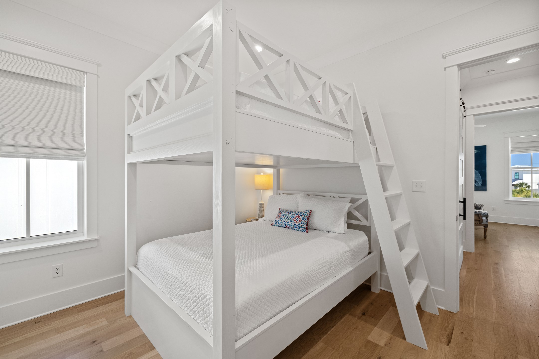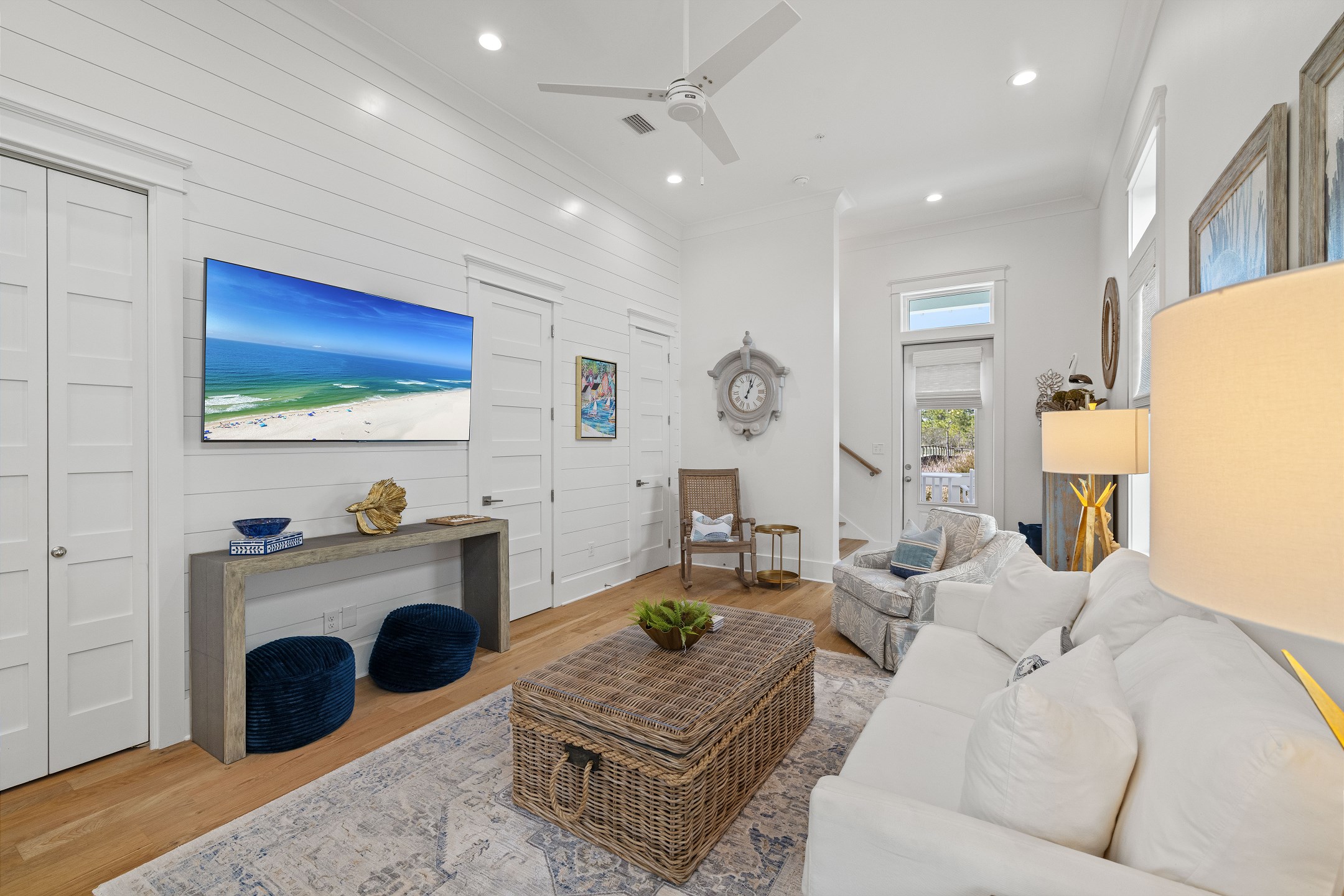 The cottage offers versatile sleeping options—the Primary bedroom with a King bed, the Guest bedroom with a custom built-in Queen-over-Queen bunk bed, and the living room with a custom built-in Twin-over-Twin bunk bed. Each room is equipped with large smart TVs for a high-quality entertainment experience. Guests can log into their streaming accounts for personalized viewing, ensuring a relaxing and enjoyable stay. Book your stay at Wade 'n Sea in Beach Village Resort for a vacation that's extraordinary in every way.