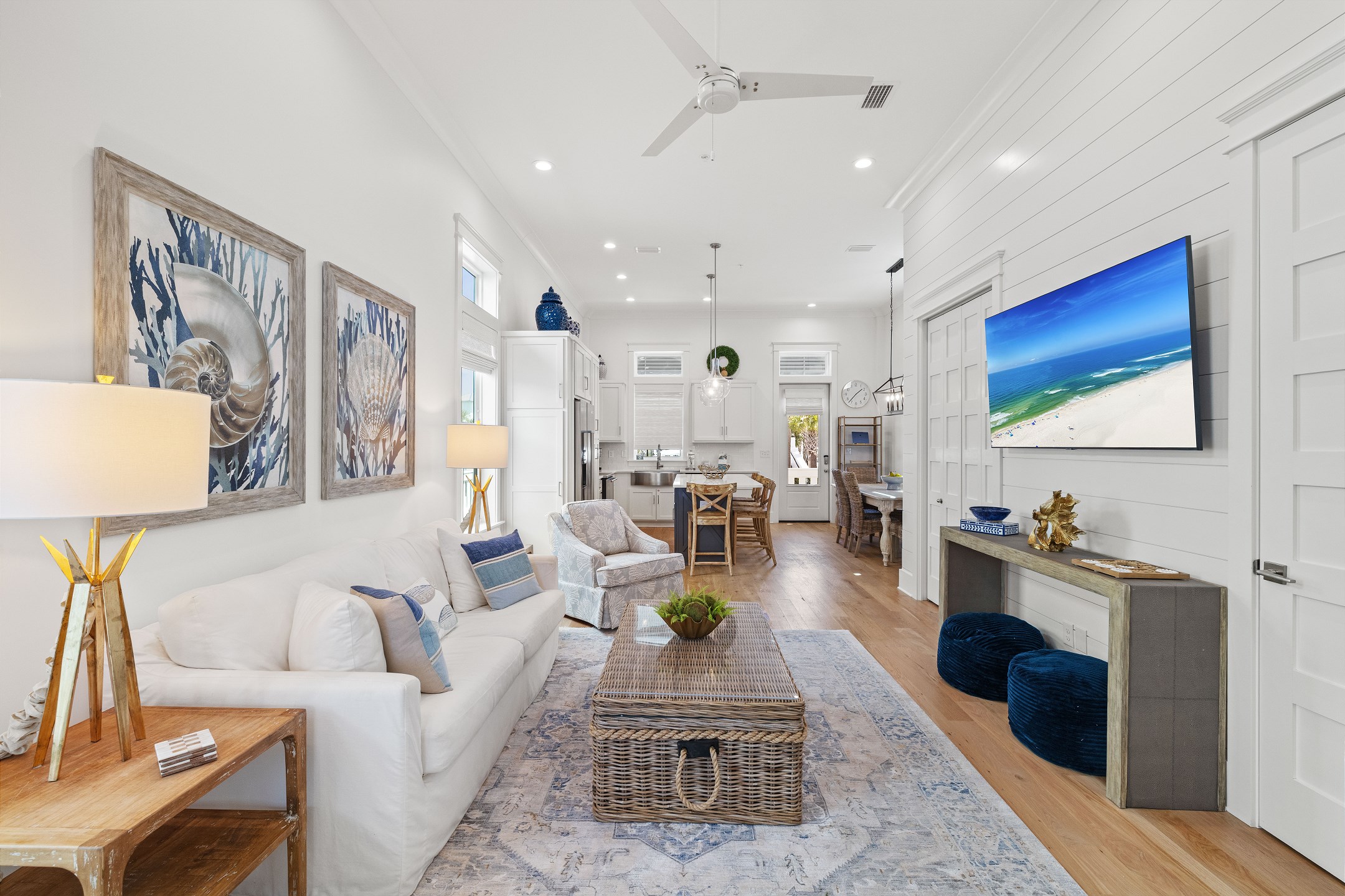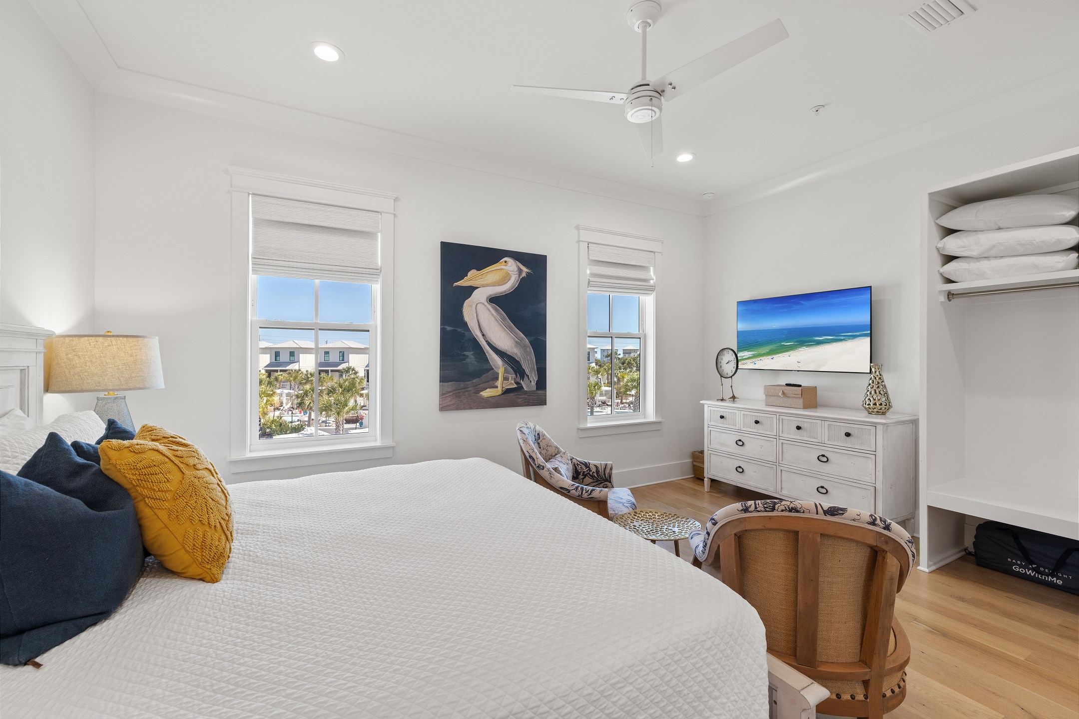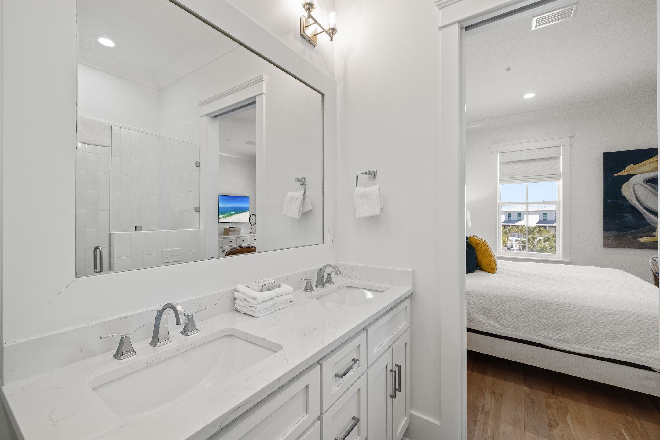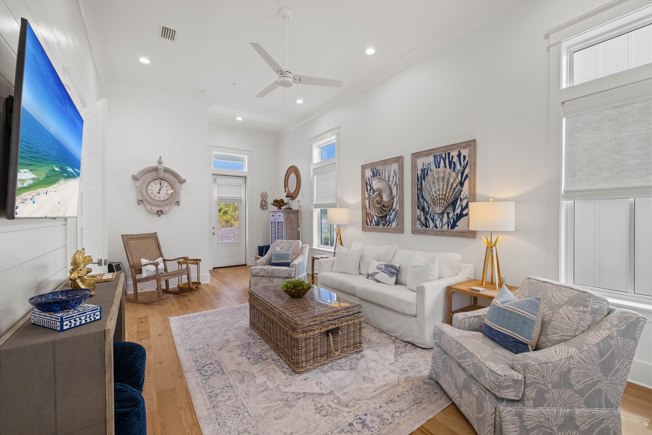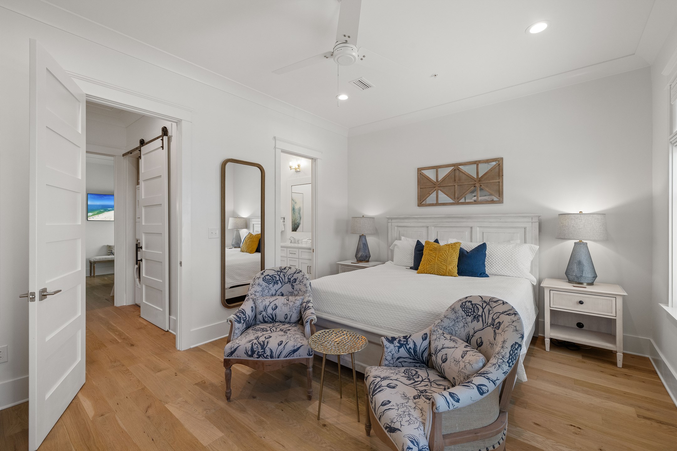 The cottage offers versatile sleeping options—the Primary bedroom with a King bed, the Guest bedroom with a custom built-in Queen-over-Queen bunk bed, and the living room with a custom built-in Twin-over-Twin bunk bed. Each room is equipped with large smart TVs for a high-quality entertainment experience. Guests can log into their streaming accounts for personalized viewing, ensuring a relaxing and enjoyable stay. Book your stay at Wade 'n Sea in Beach Village Resort for a vacation that's extraordinary in every way.