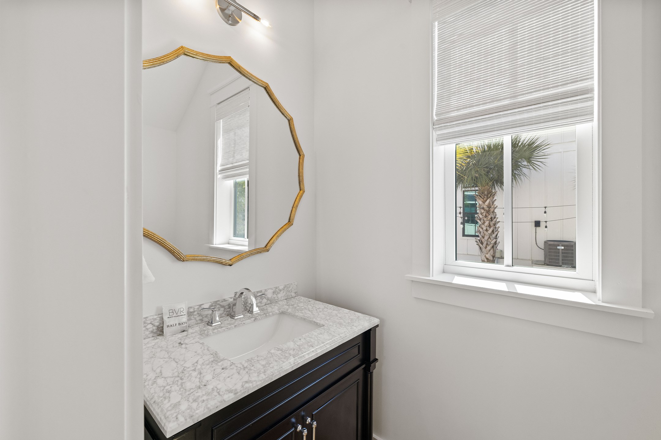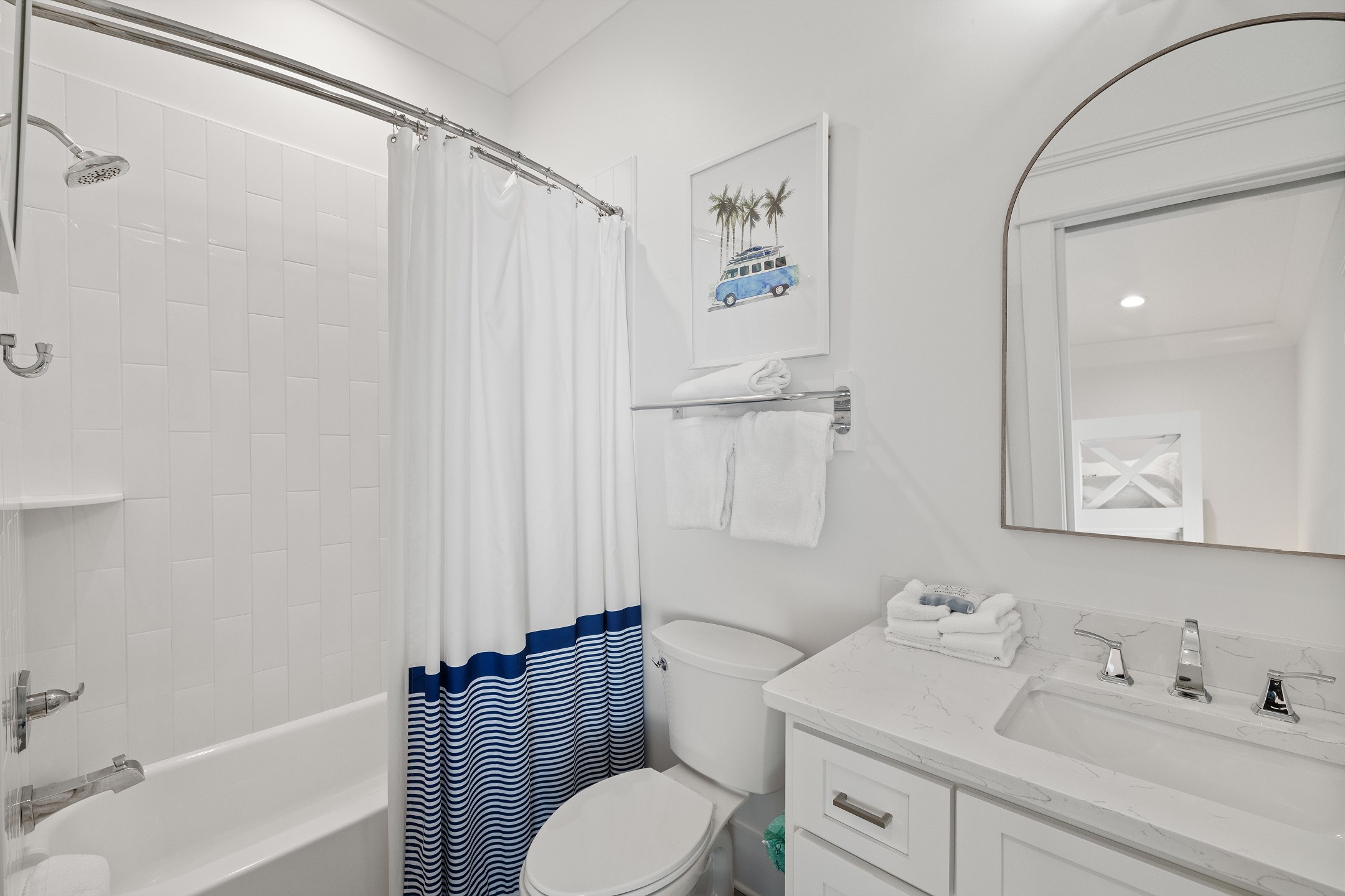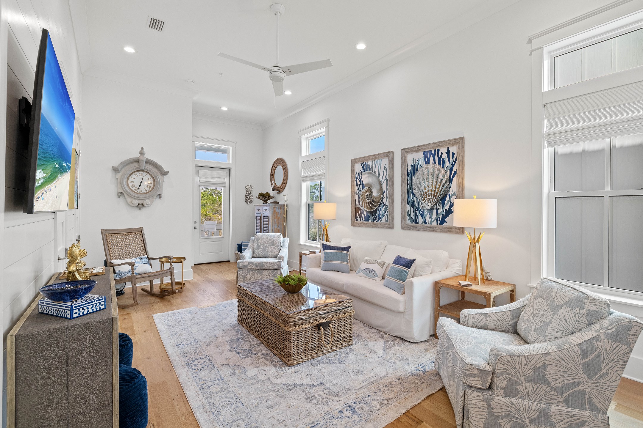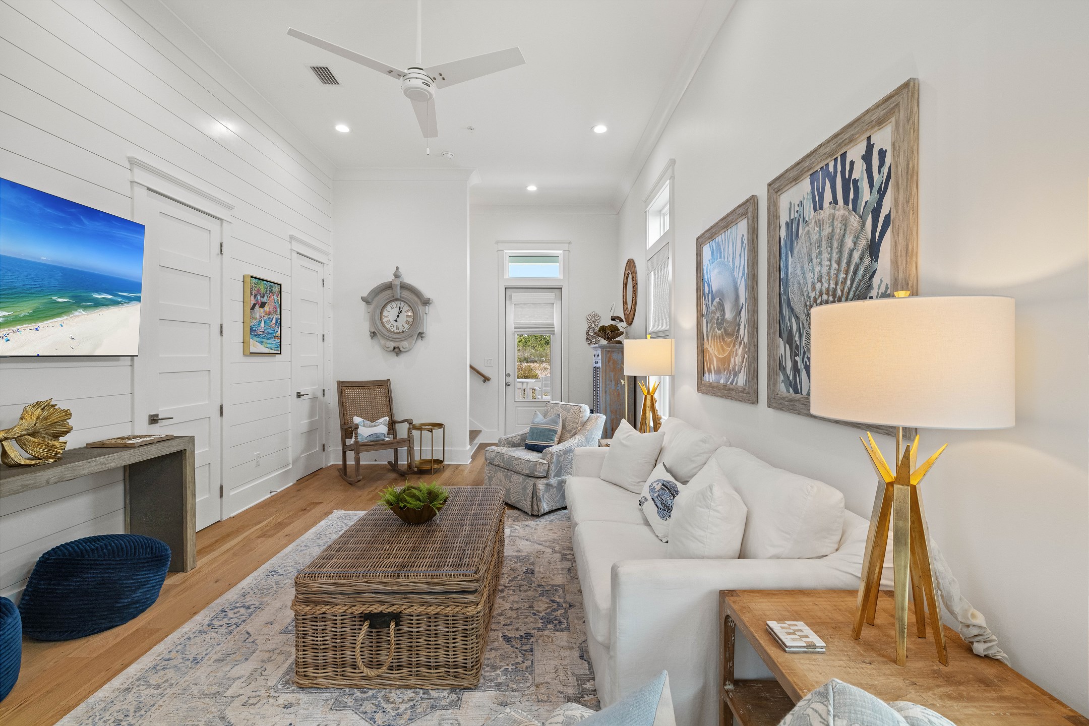 The cottage offers versatile sleeping options—the Primary bedroom with a King bed, the Guest bedroom with a custom built-in Queen-over-Queen bunk bed, and the living room with a custom built-in Twin-over-Twin bunk bed. Each room is equipped with large smart TVs for a high-quality entertainment experience. Guests can log into their streaming accounts for personalized viewing, ensuring a relaxing and enjoyable stay. Book your stay at Wade 'n Sea in Beach Village Resort for a vacation that's extraordinary in every way.