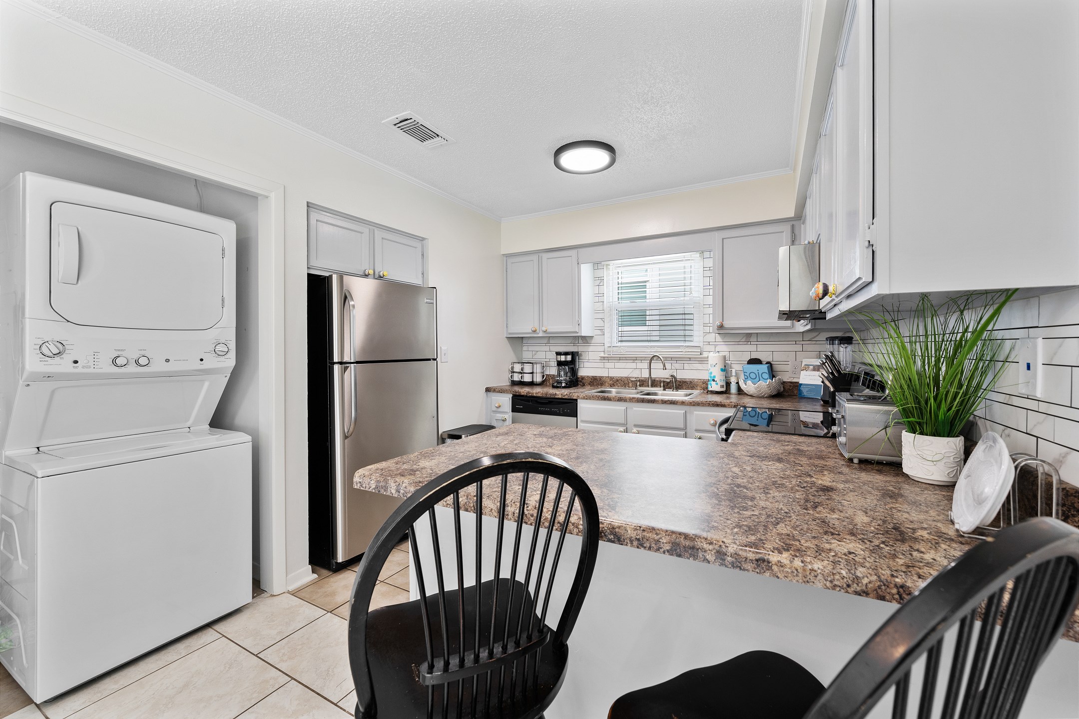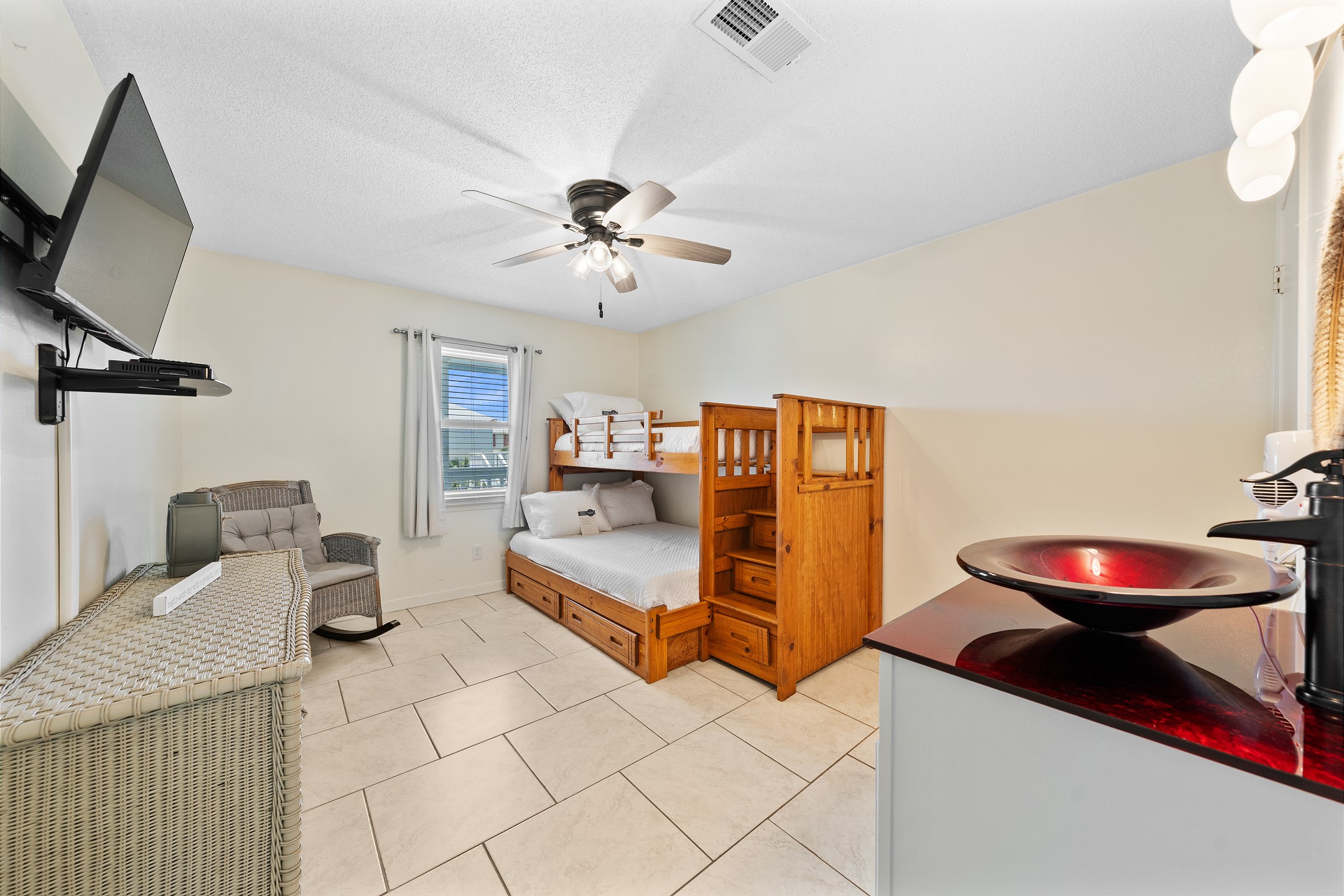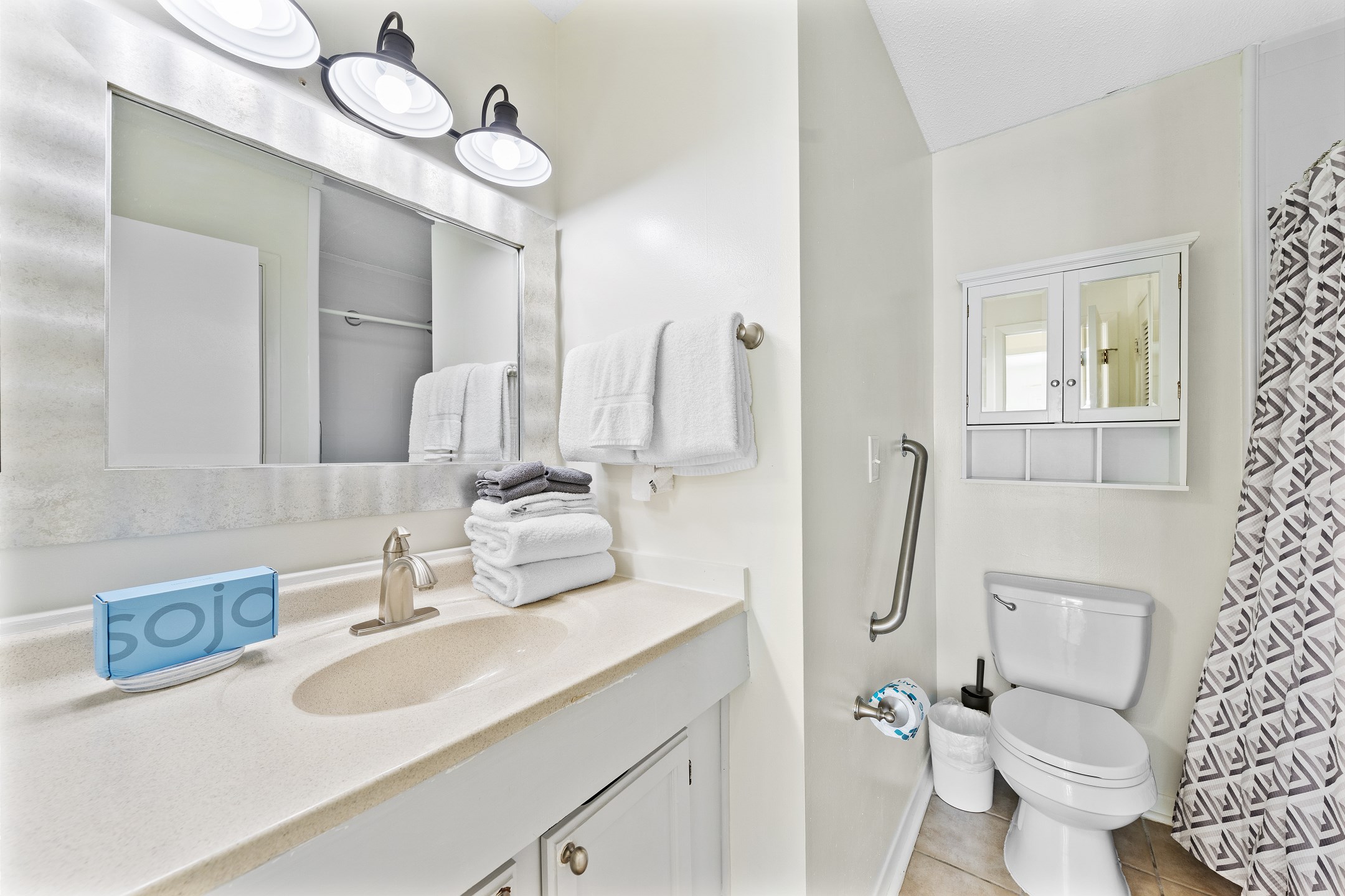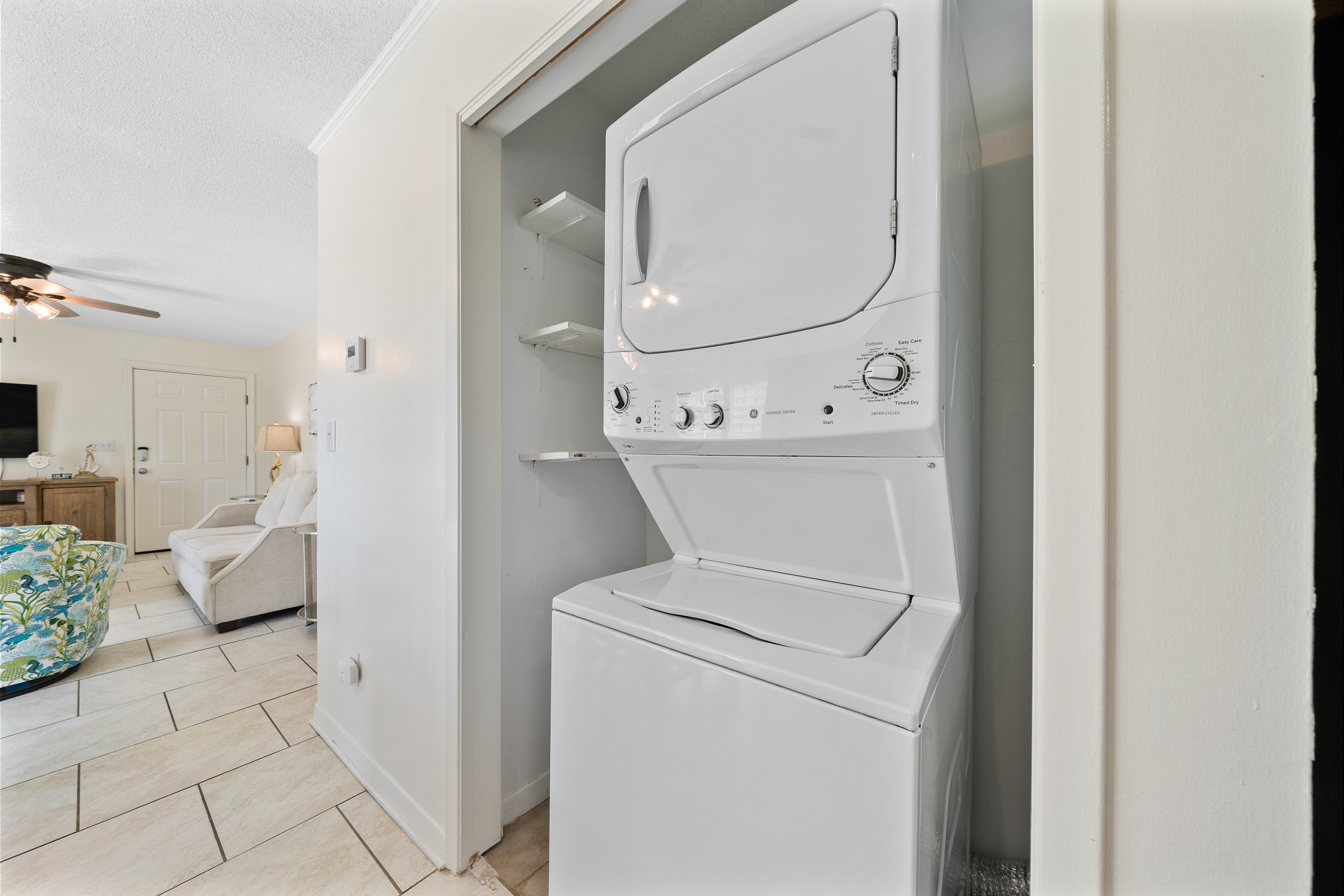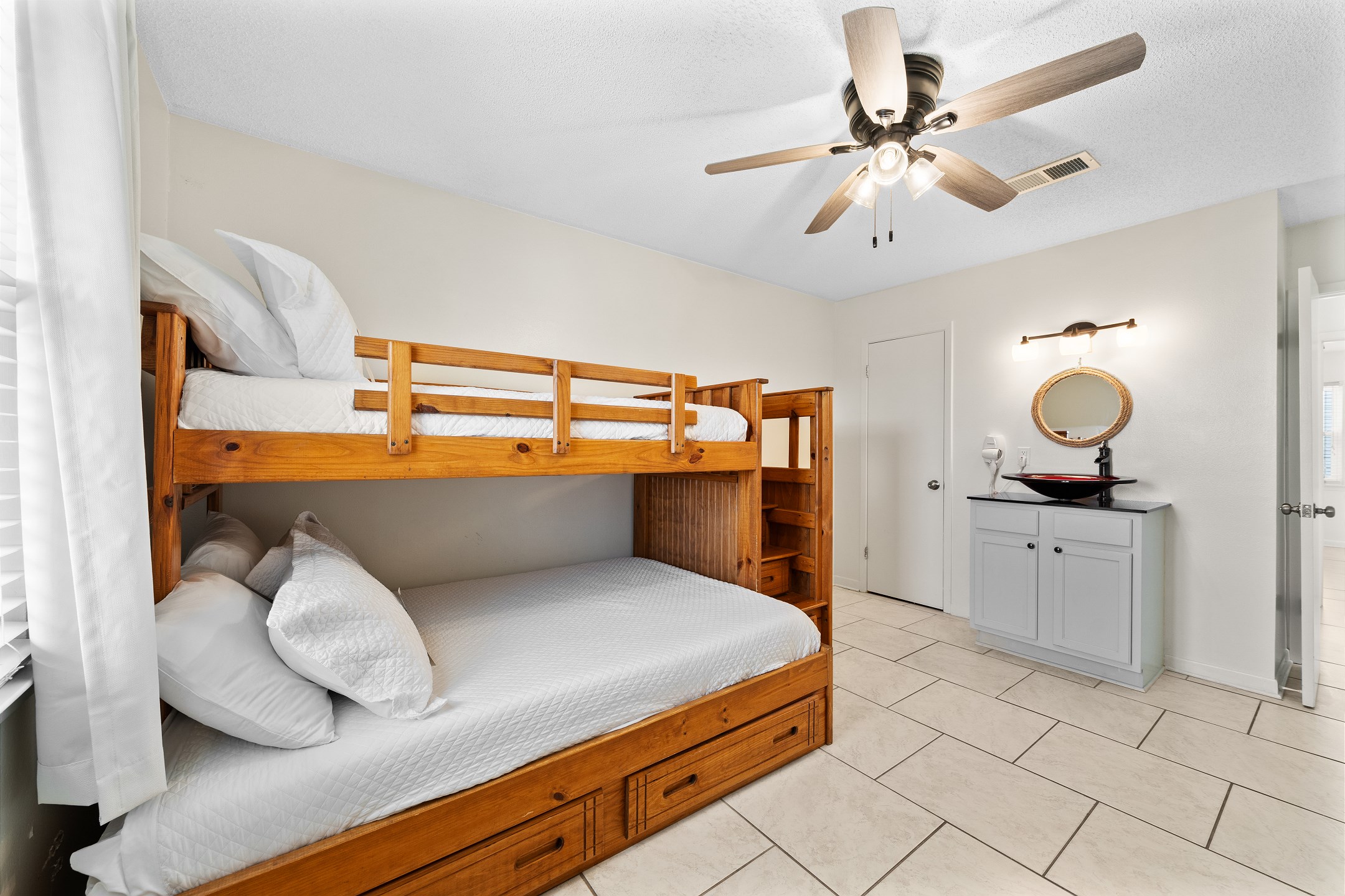 The primary bedroom offers a king bed, while the second bedroom is ideal for kids or additional guests with a twin-over-full bunk bed and a built-in vanity area with a sink. Both bedrooms share a hallway bathroom with a tub/shower combo. A washer and dryer in the unit adds extra convenience during your stay.