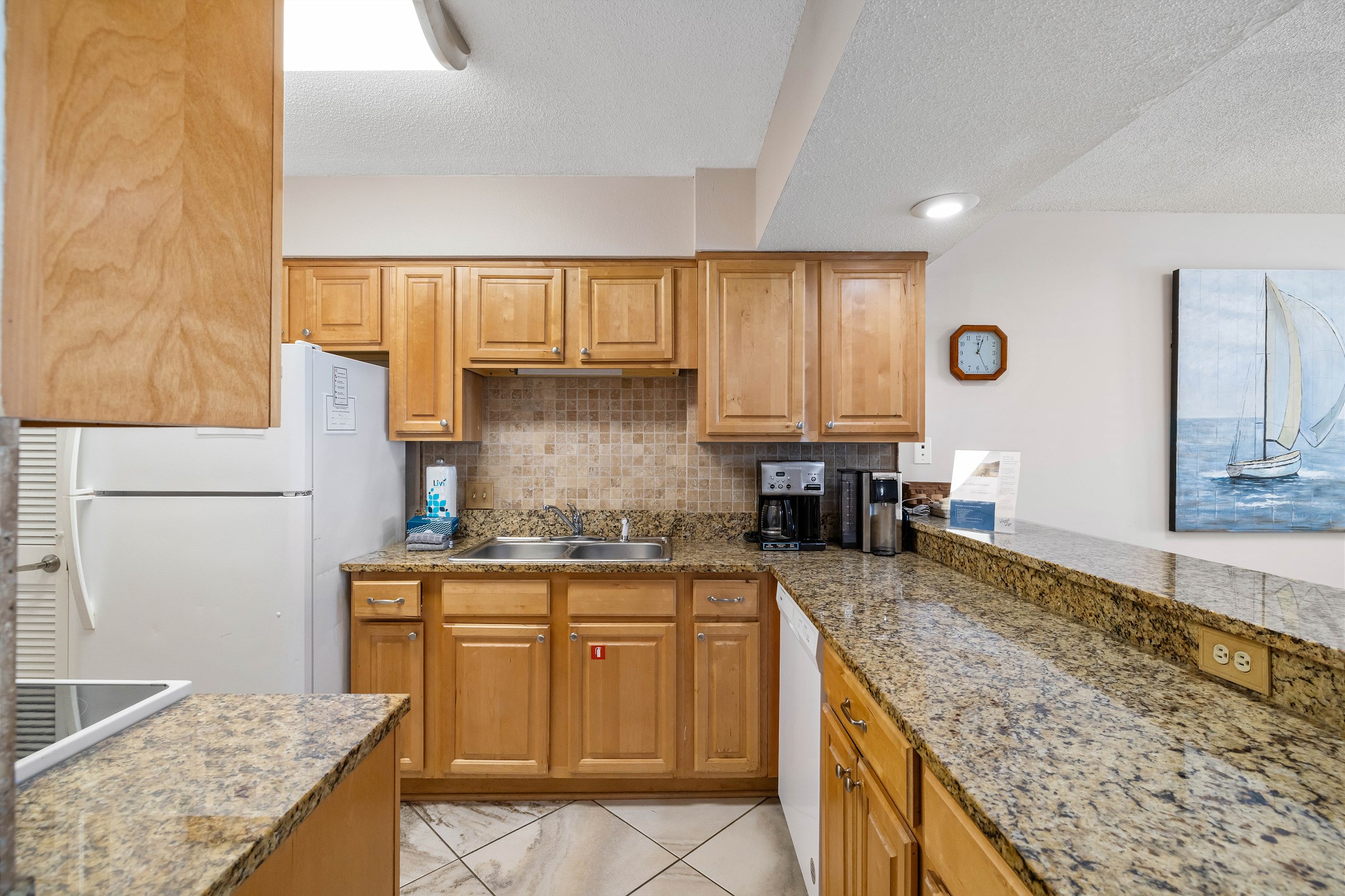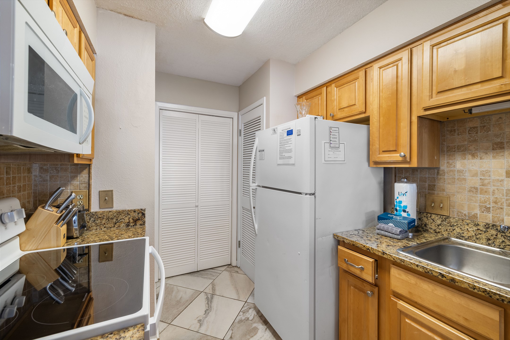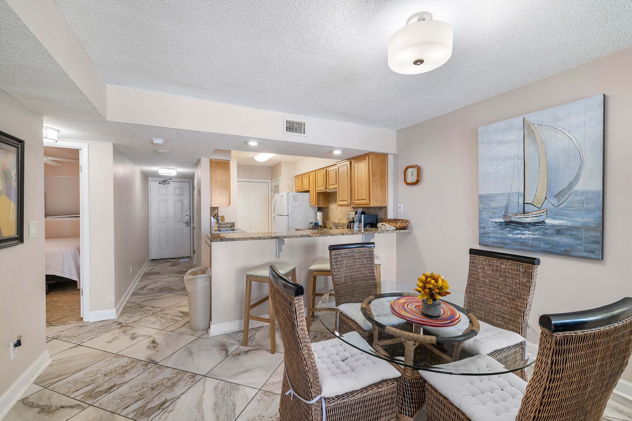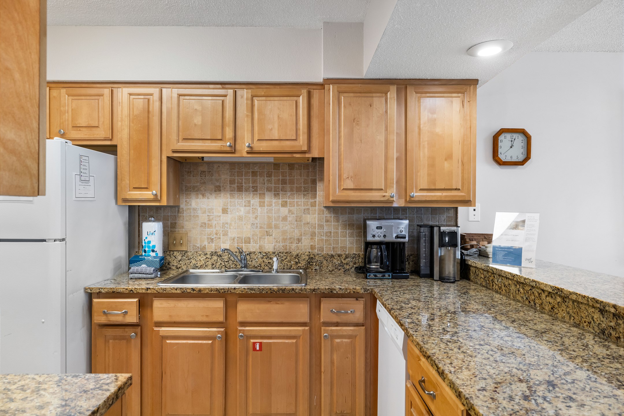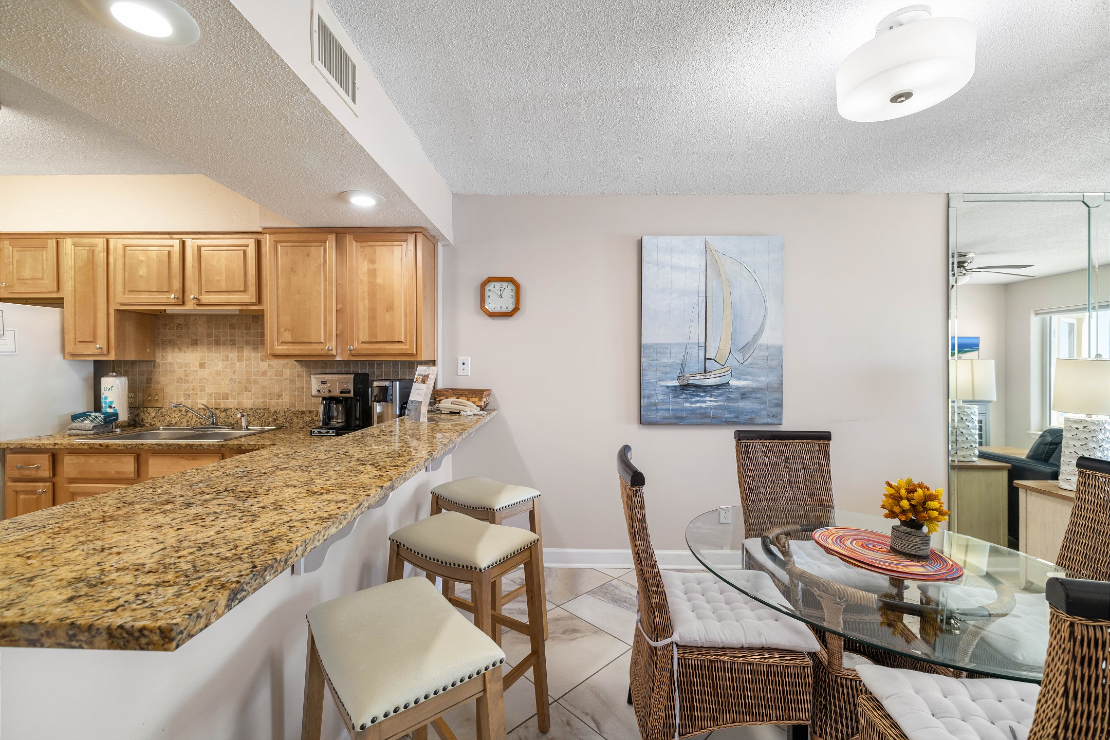The fully equipped kitchen features granite countertops and a dining table, making it easy to enjoy meals together during your stay.