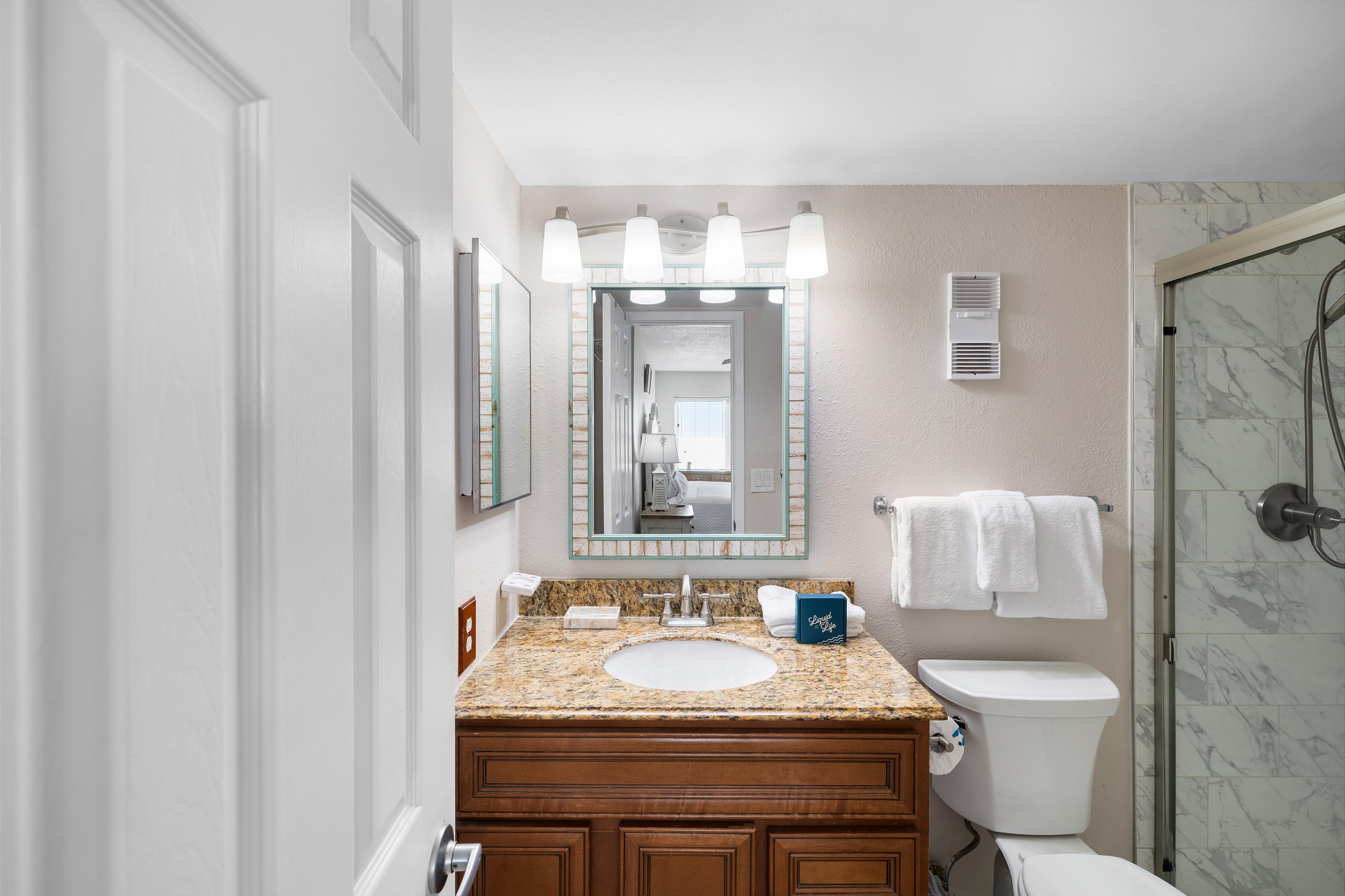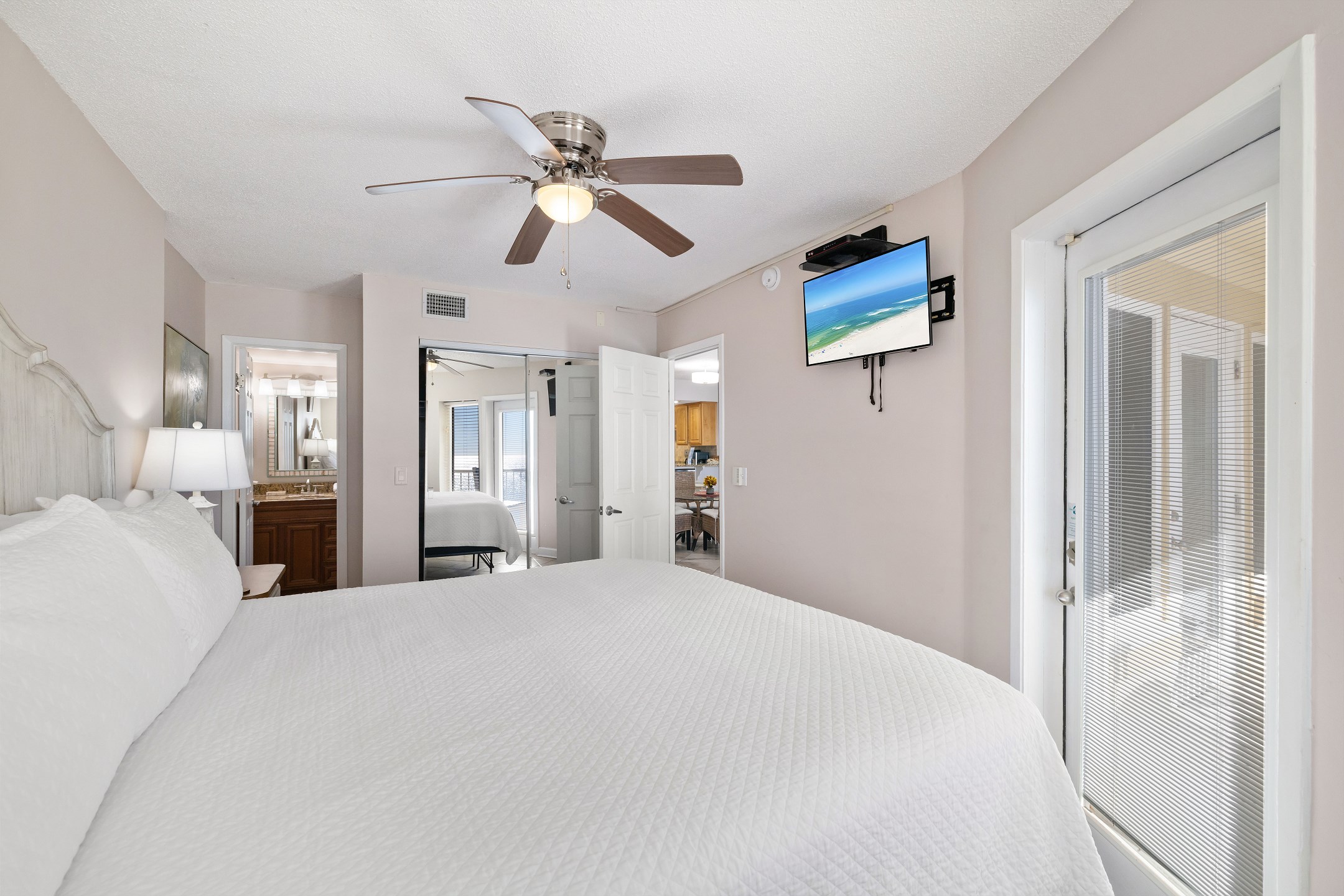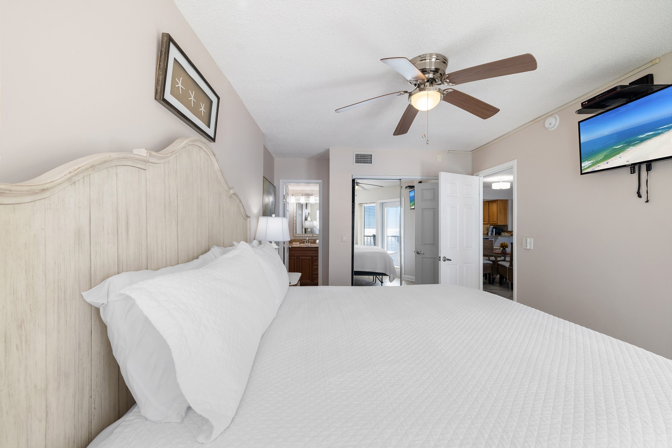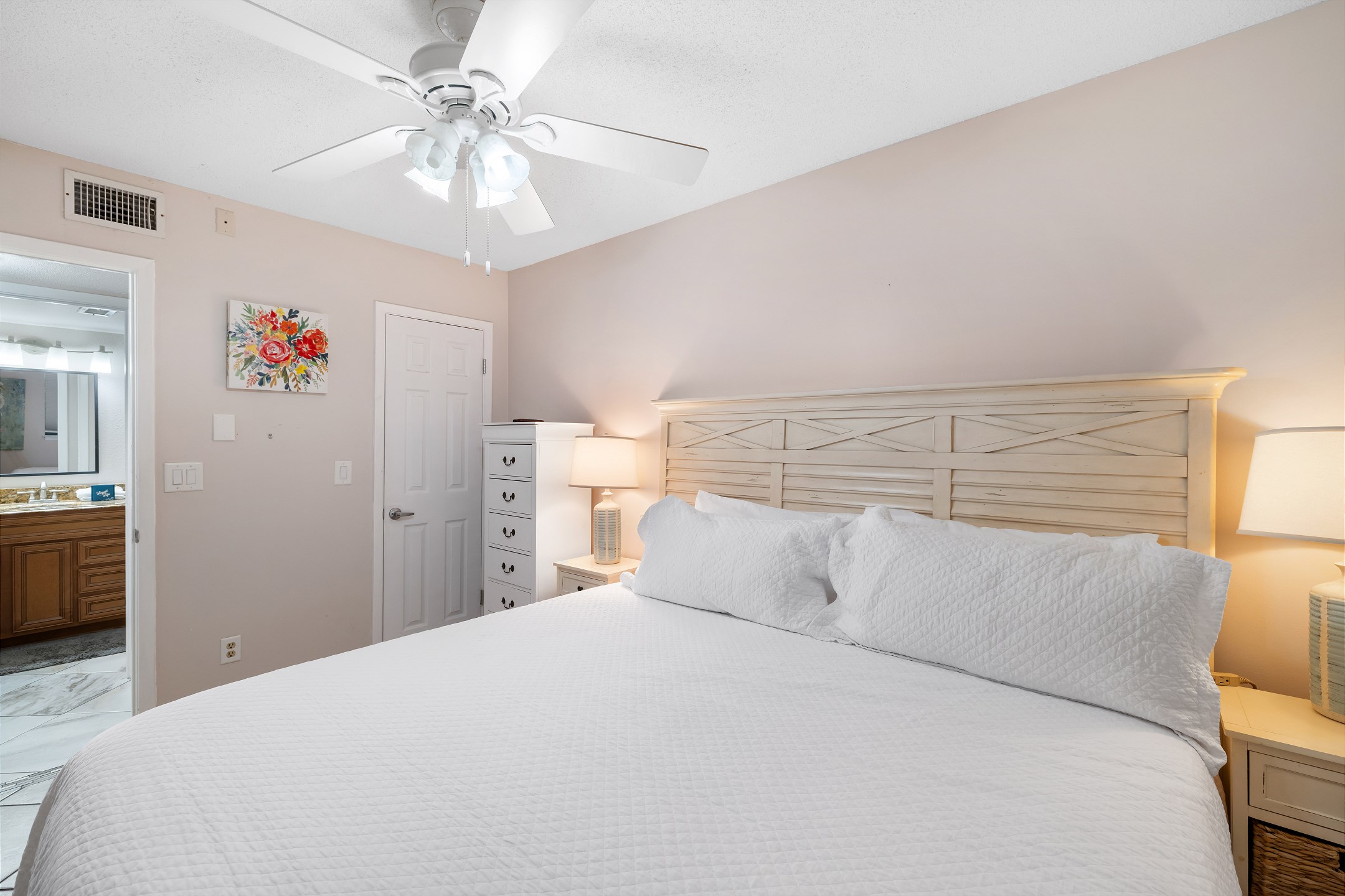 The primary bedroom includes a king bed, private balcony access, and an ensuite bathroom with a beautifully tiled walk in shower. The second bedroom also offers a king size bed and its own ensuite bathroom, providing added comfort and convenience for your group.