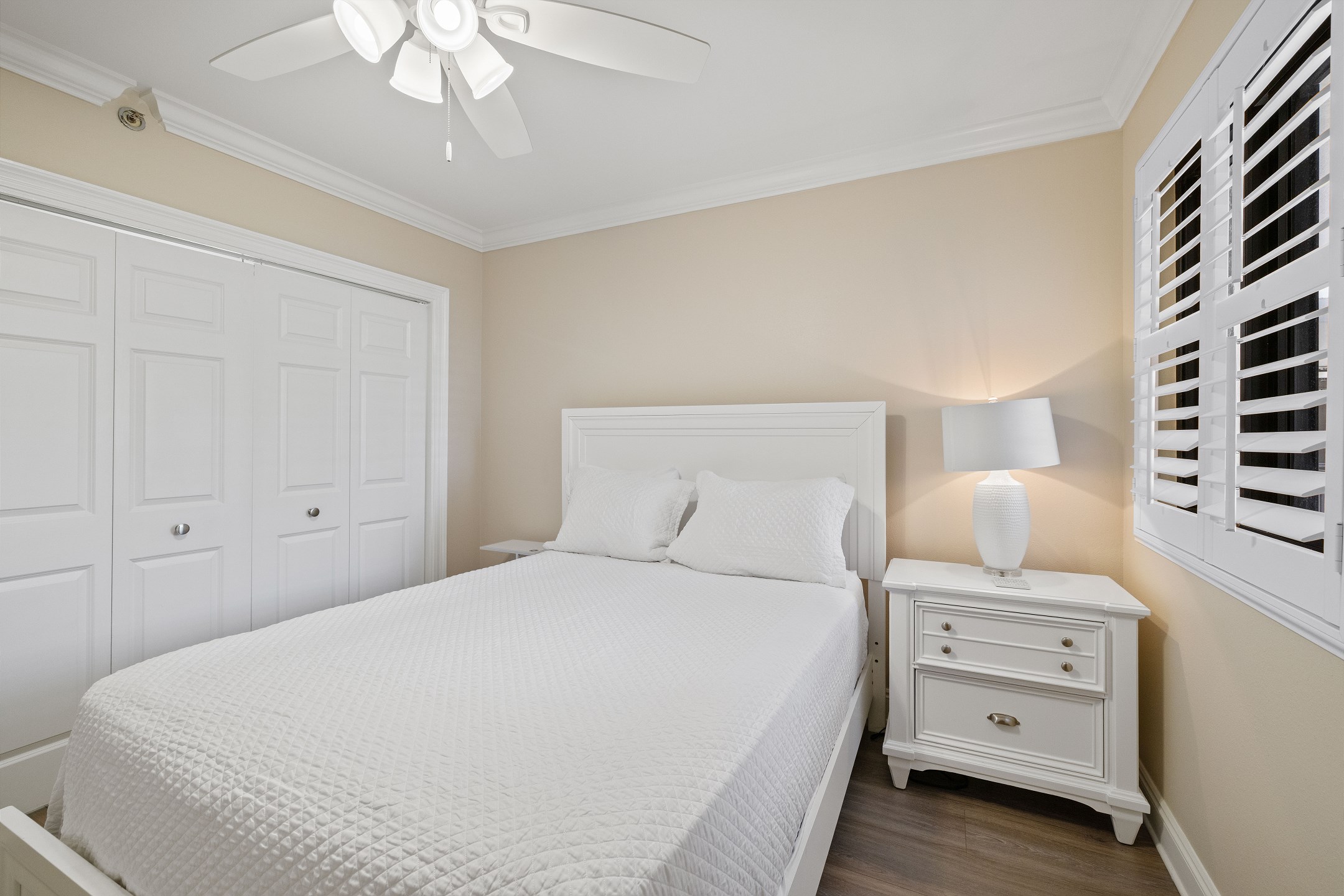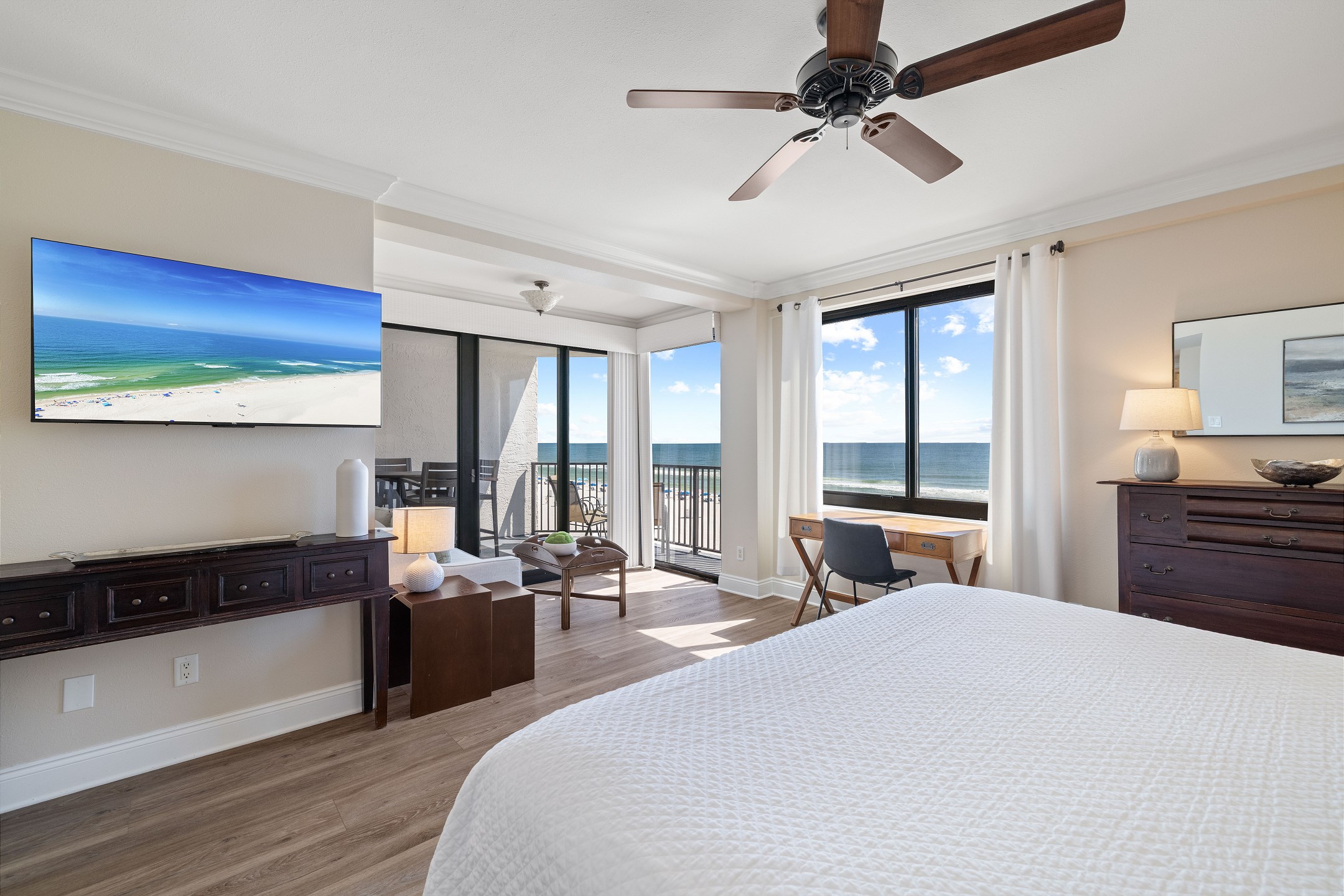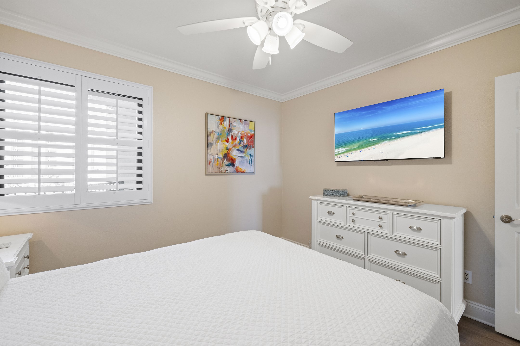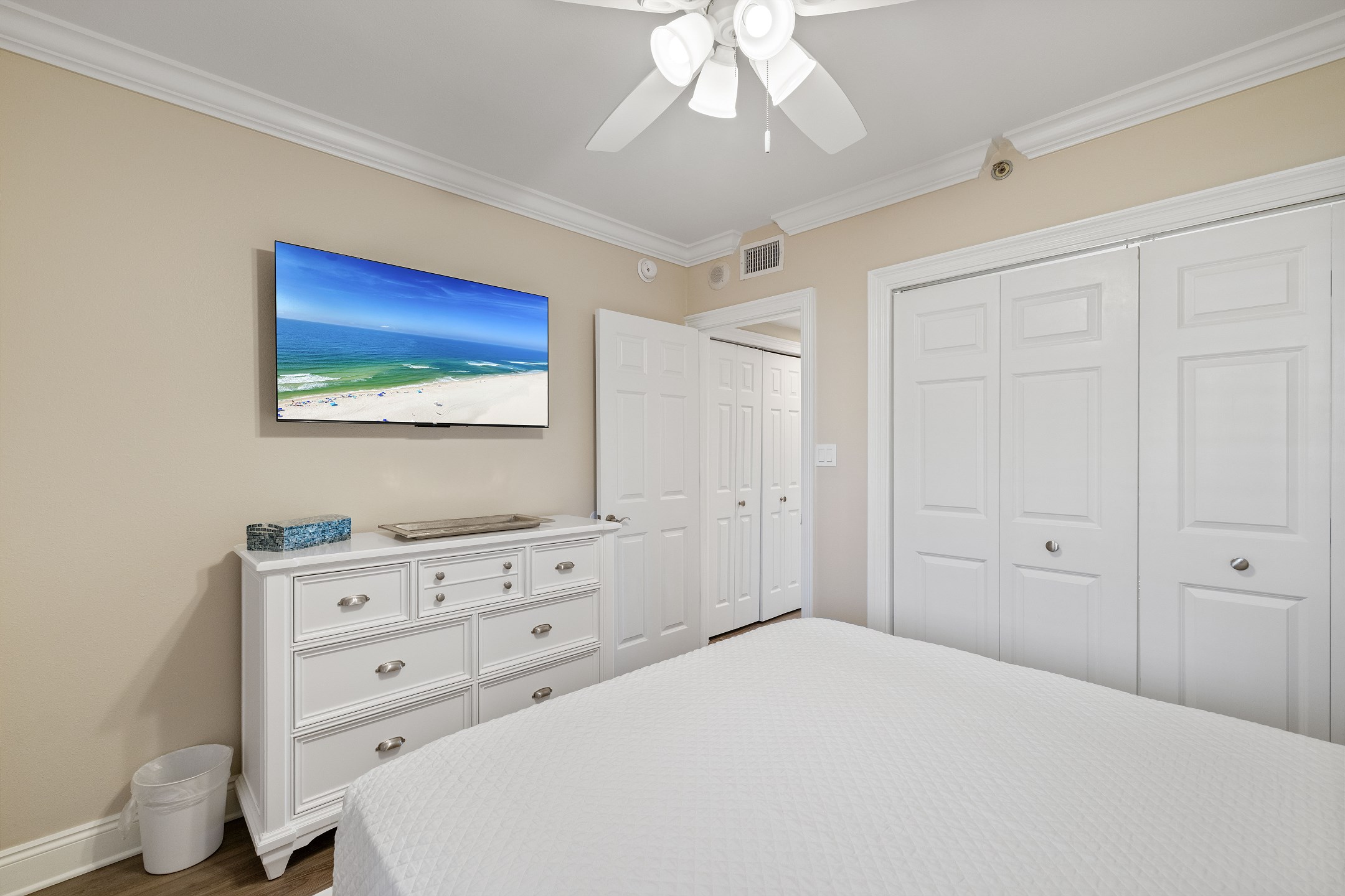 The Primary suite in this Orange Beach condo is a restful retreat, boasting a King bed and a convenient Twin fold-out chair, perfect for additional sleeping space. The suite includes a sitting area, a flat-screen TV with a DVD player, balcony access, and a Primary bath with a walk-in shower. This space is ideal for unwinding in comfort while enjoying the scenic ocean views.