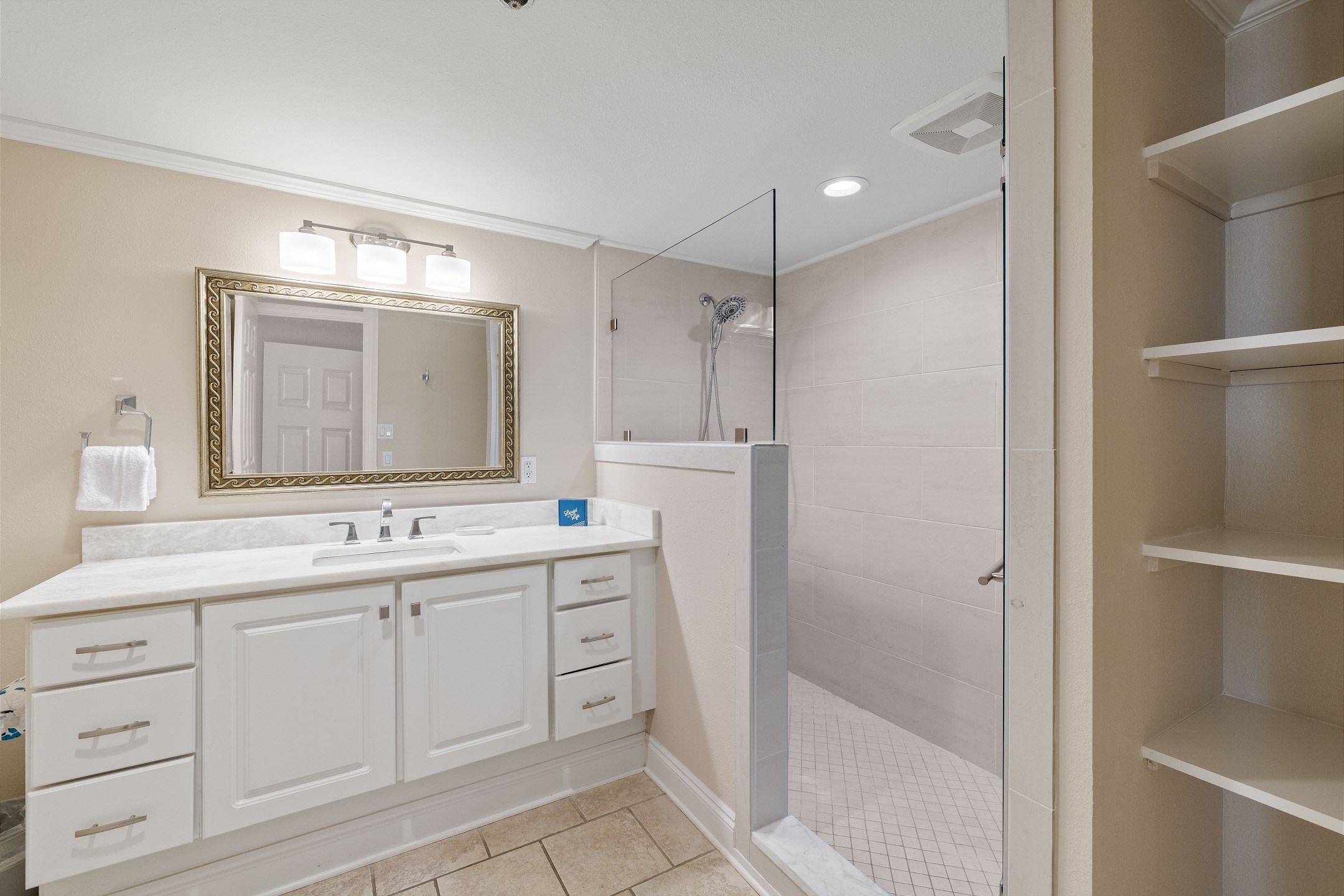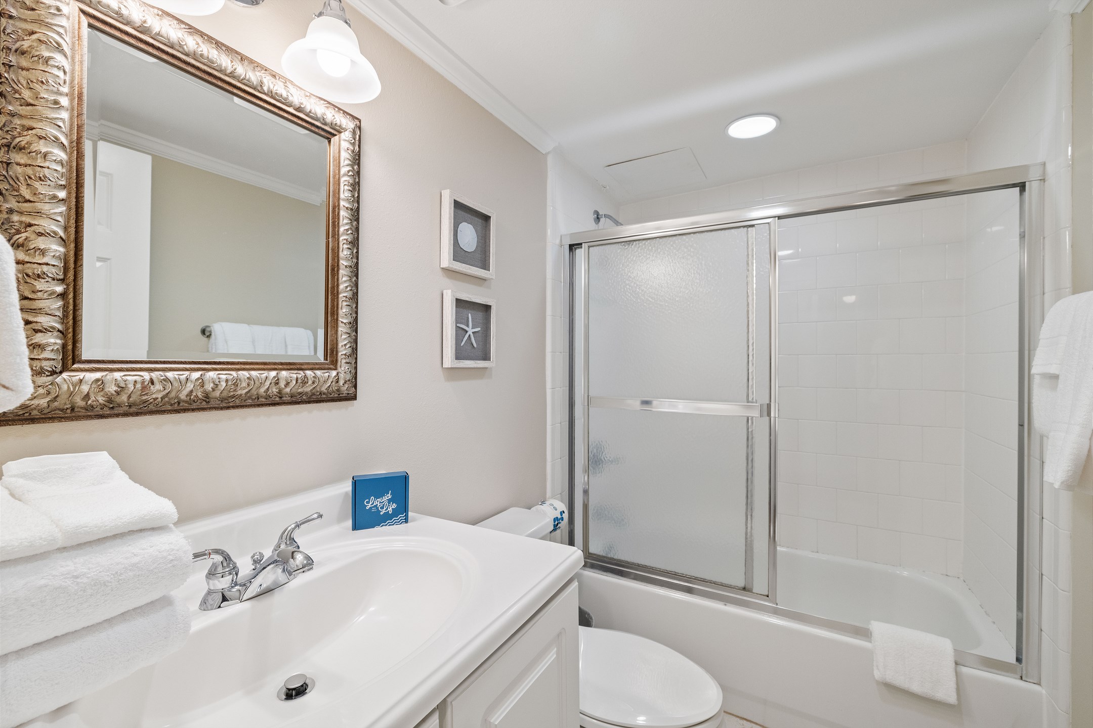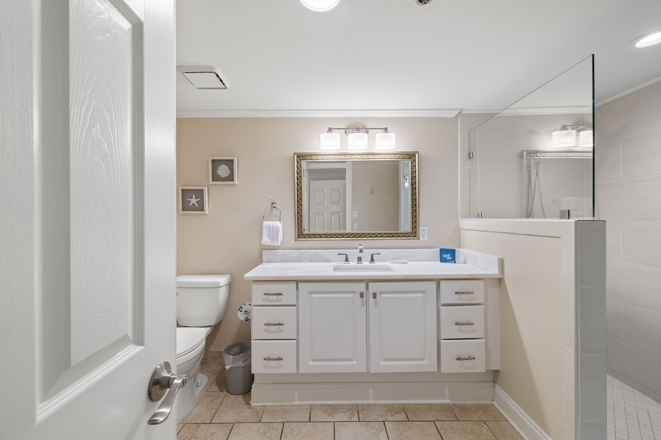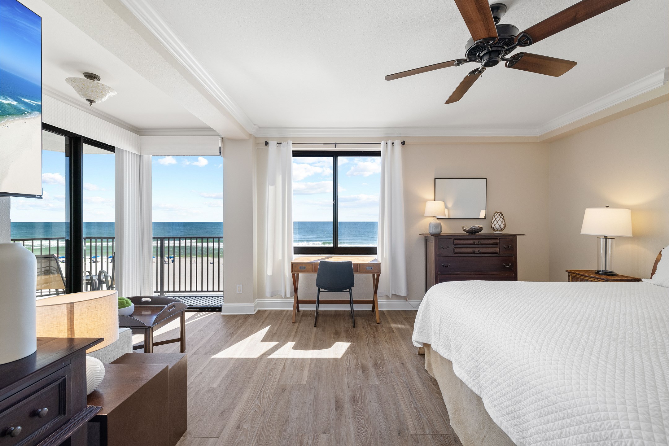 The Primary suite in this Orange Beach condo is a restful retreat, boasting a King bed and a convenient Twin fold-out chair, perfect for additional sleeping space. The suite includes a sitting area, a flat-screen TV with a DVD player, balcony access, and a Primary bath with a walk-in shower. This space is ideal for unwinding in comfort while enjoying the scenic ocean views.