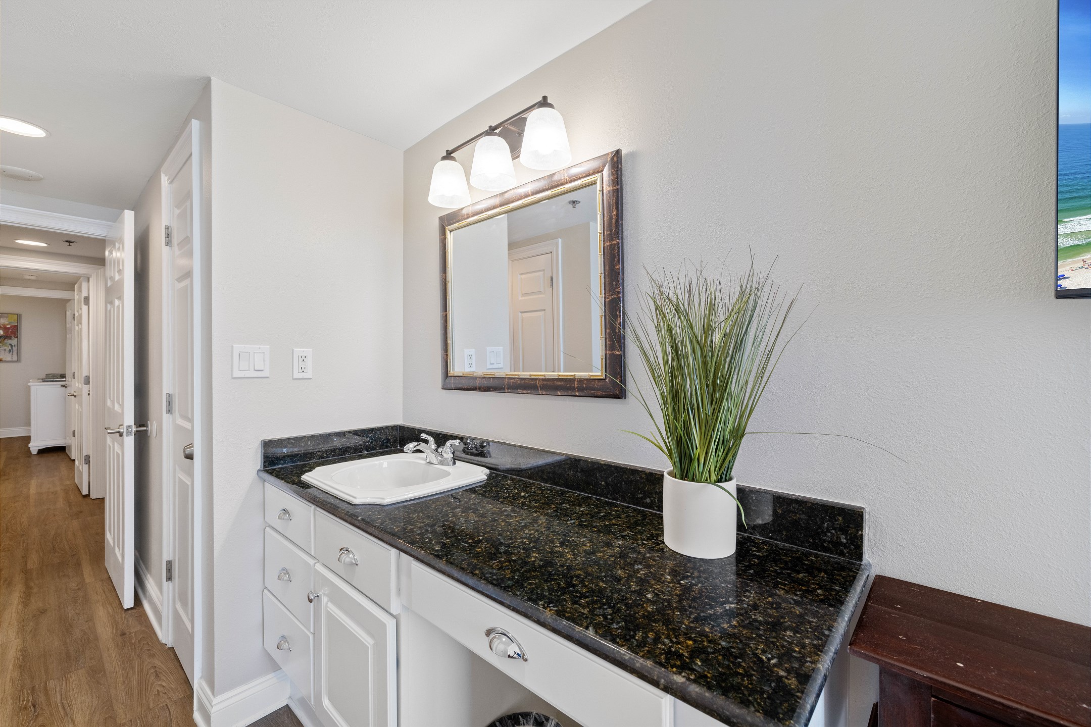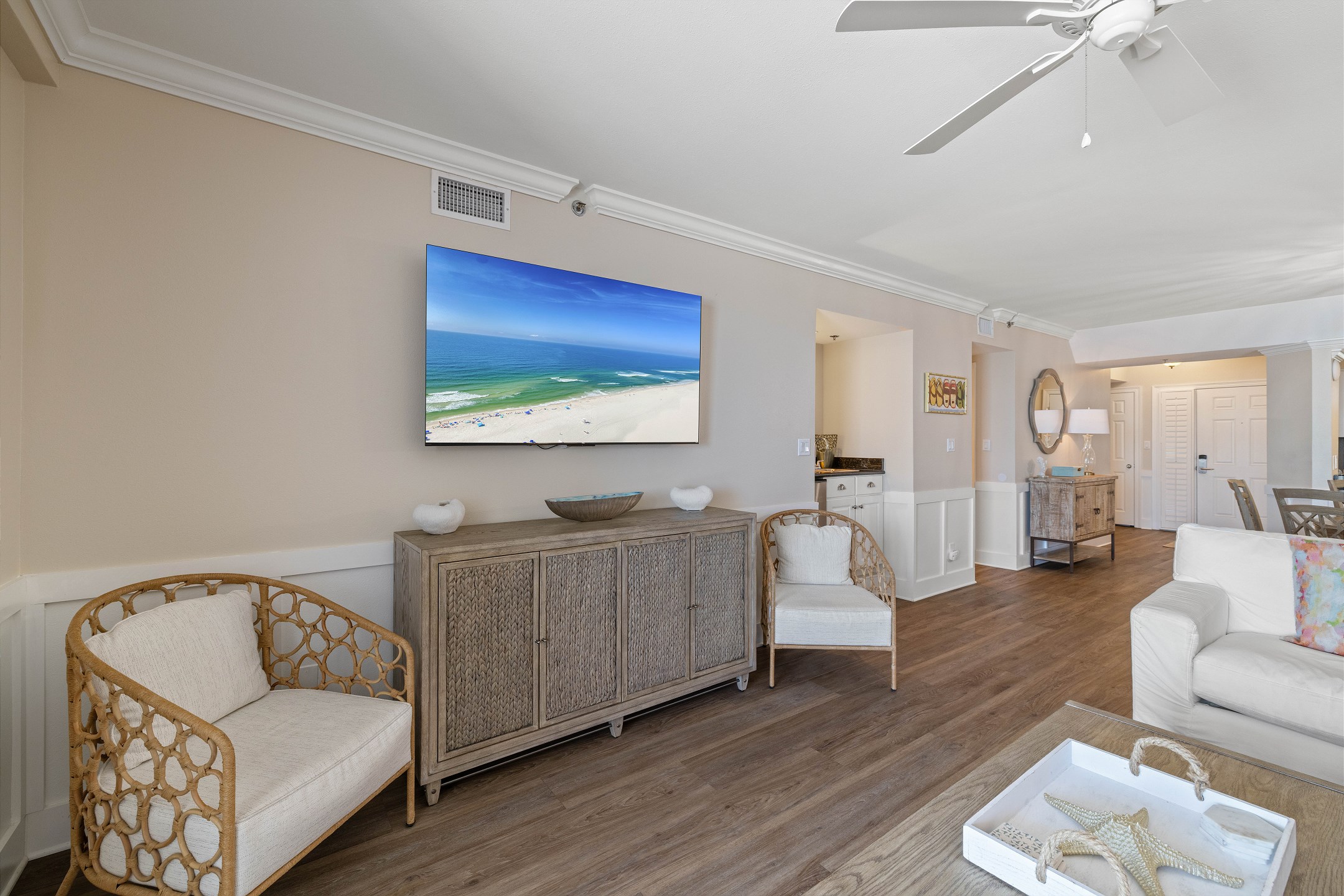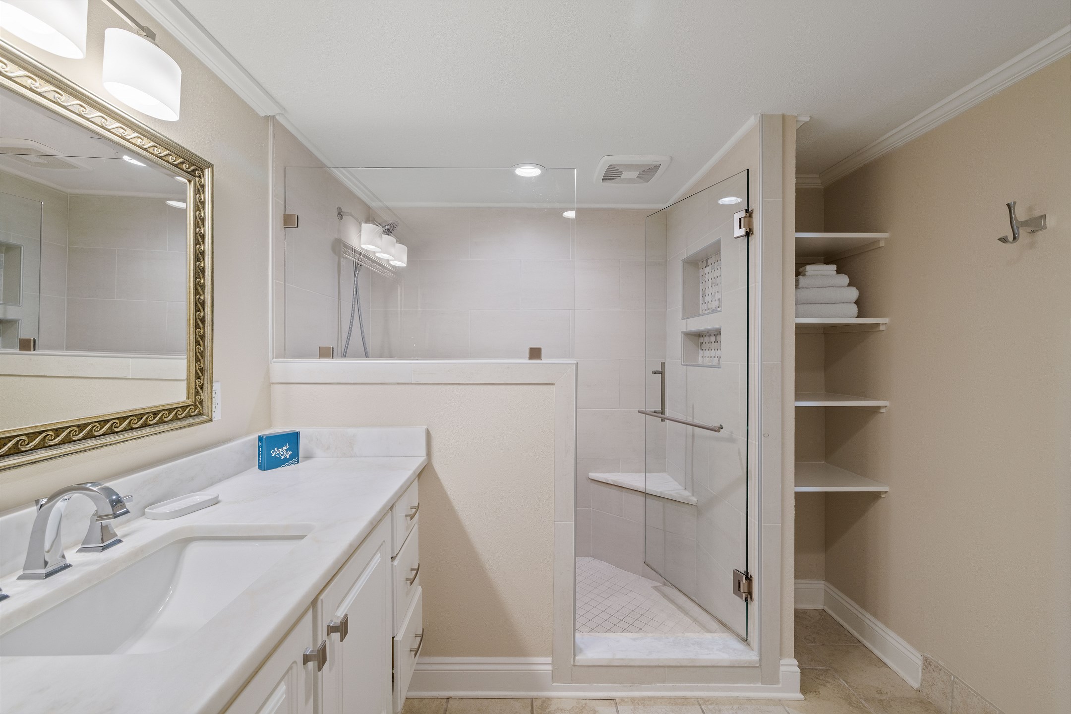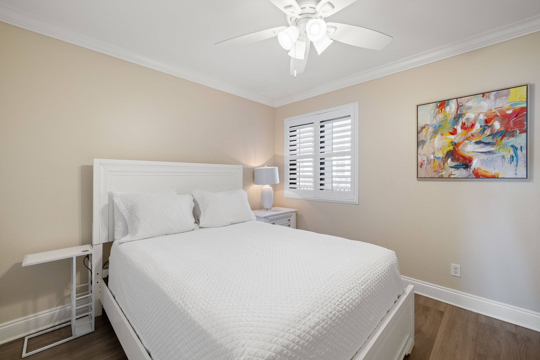 The Primary suite in this Orange Beach condo is a restful retreat, boasting a King bed and a convenient Twin fold-out chair, perfect for additional sleeping space. The suite includes a sitting area, a flat-screen TV with a DVD player, balcony access, and a Primary bath with a walk-in shower. This space is ideal for unwinding in comfort while enjoying the scenic ocean views.