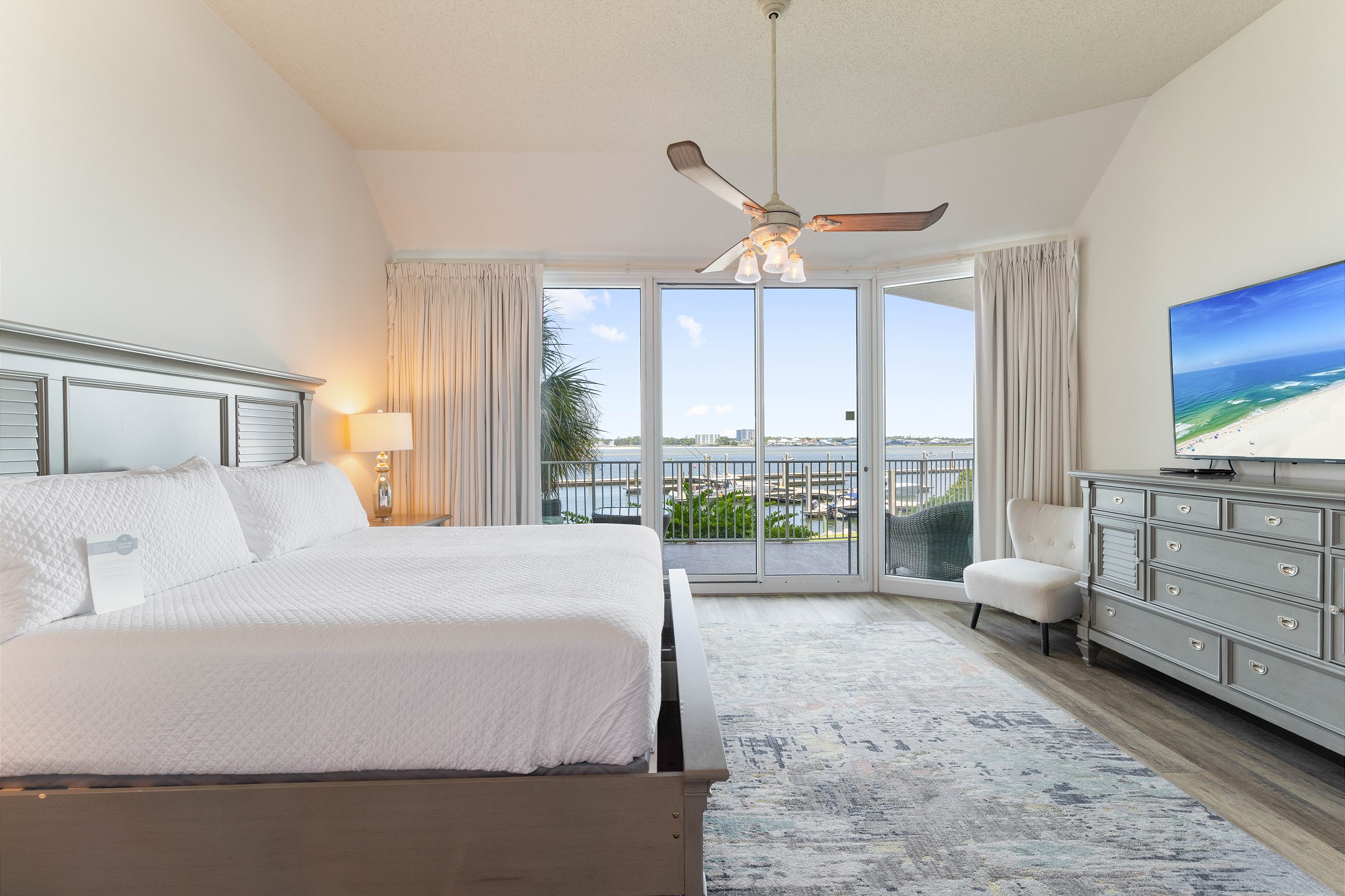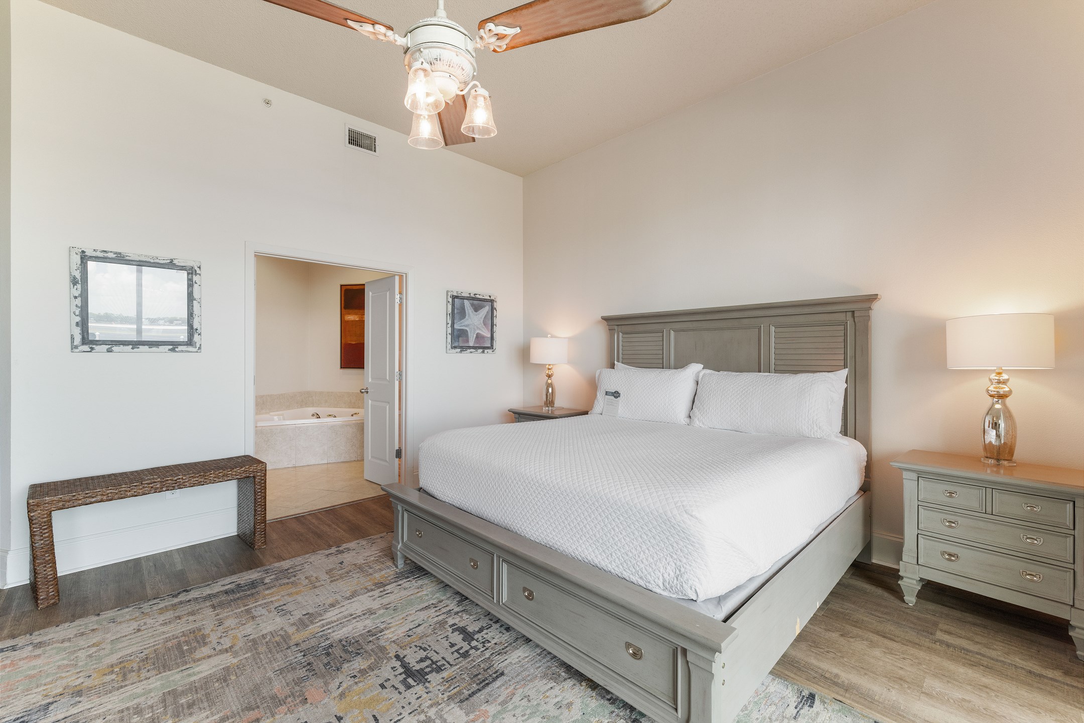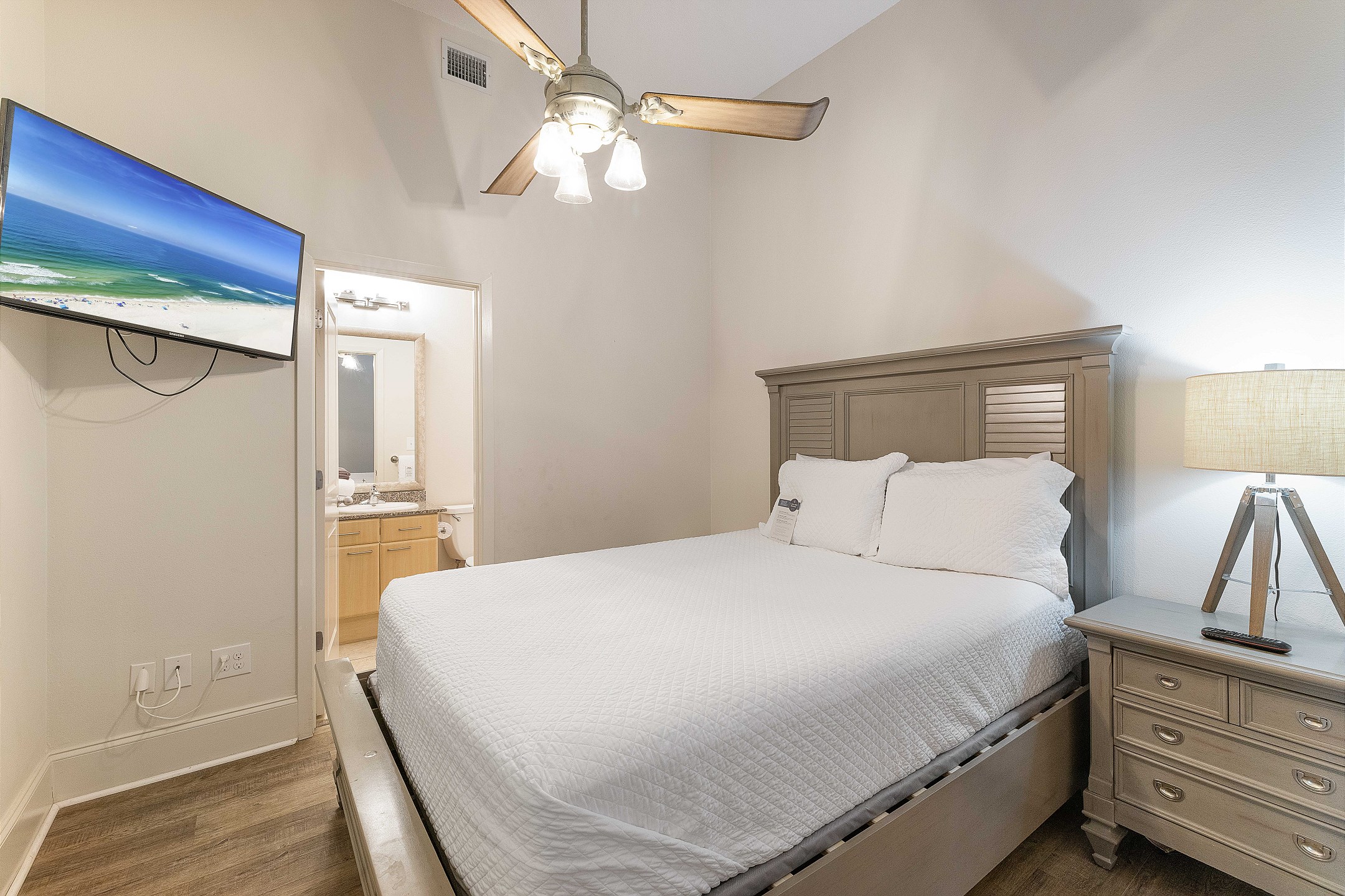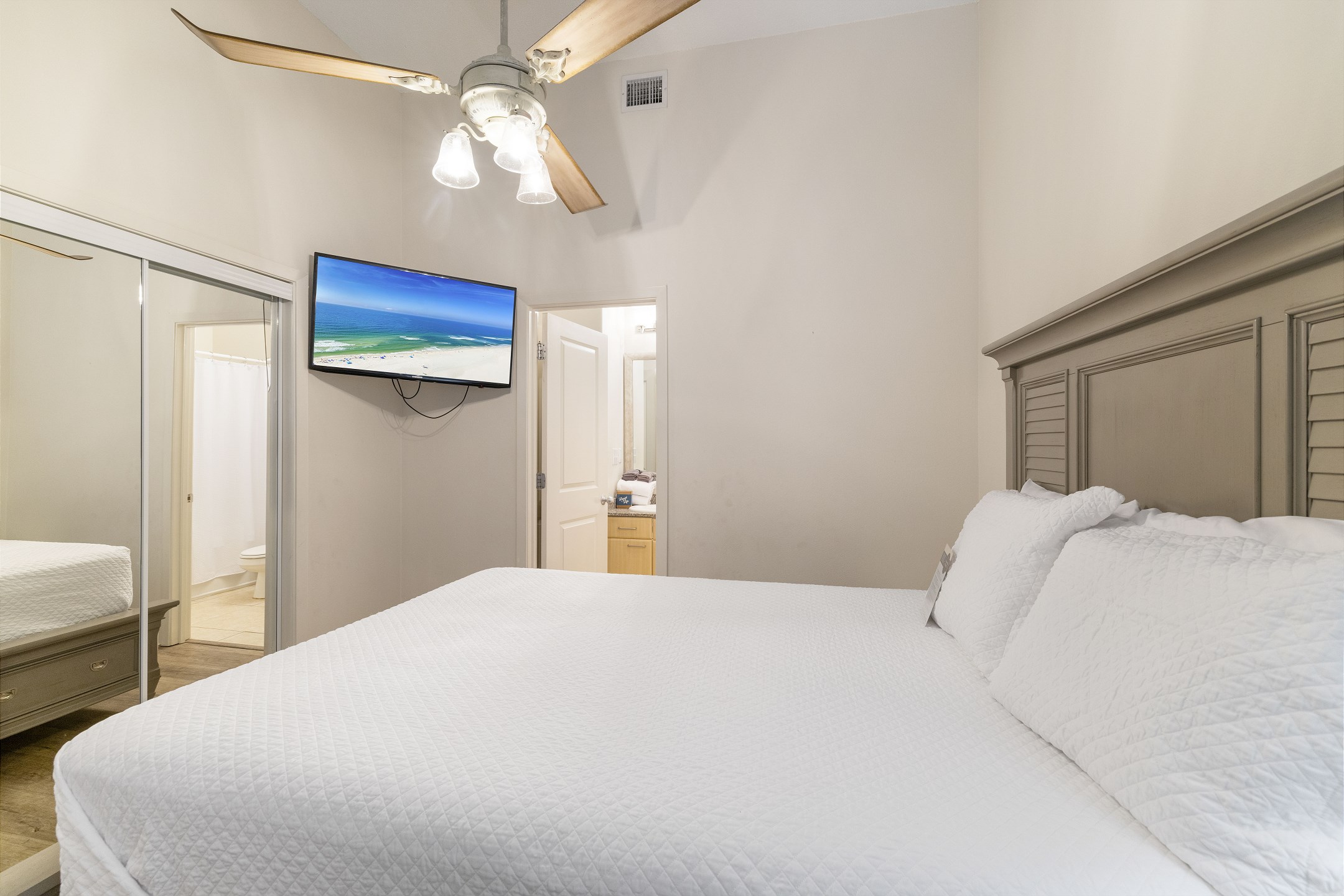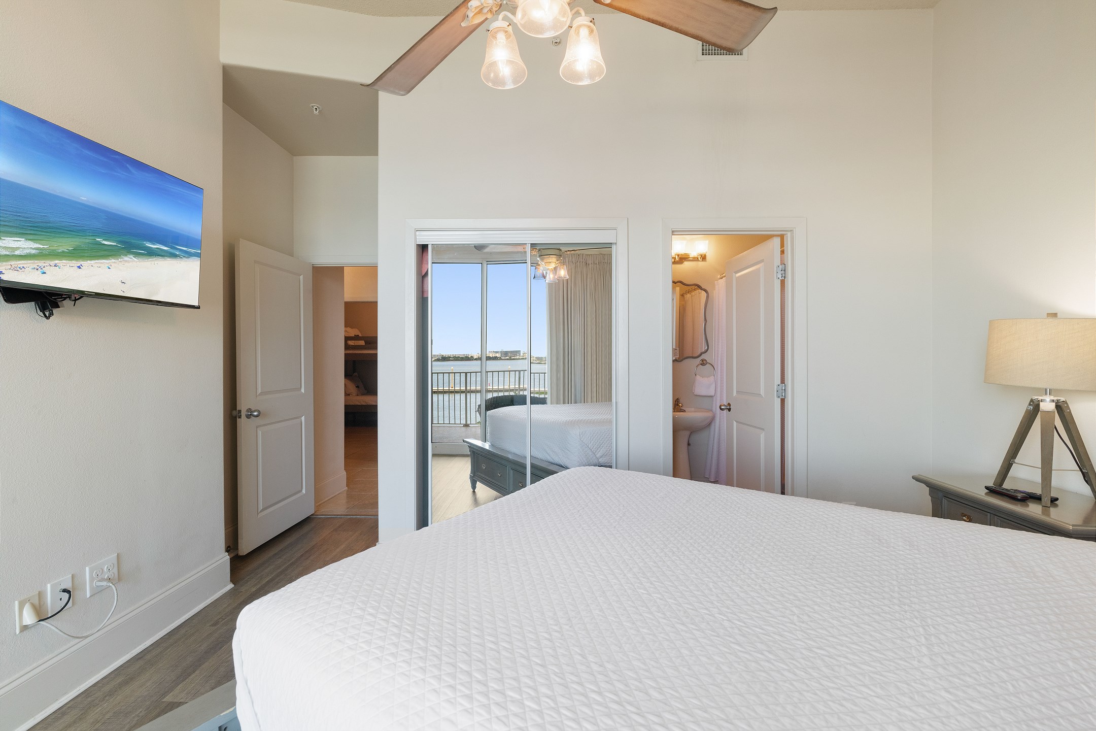 The primary bedroom features a king bed, private balcony access, and an ensuite bathroom complete with a jacuzzi tub and a walk-in shower. The second and third bedrooms each have a queen bed, ensuring a restful stay for all guests.