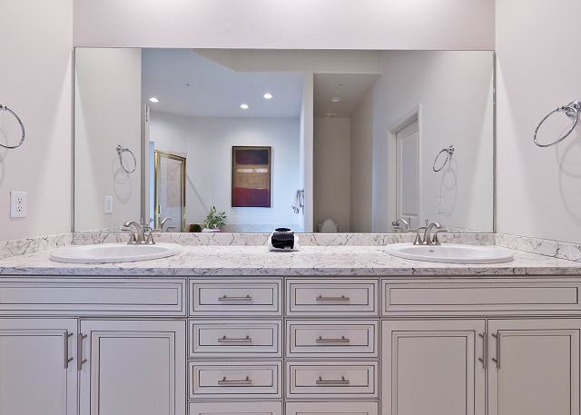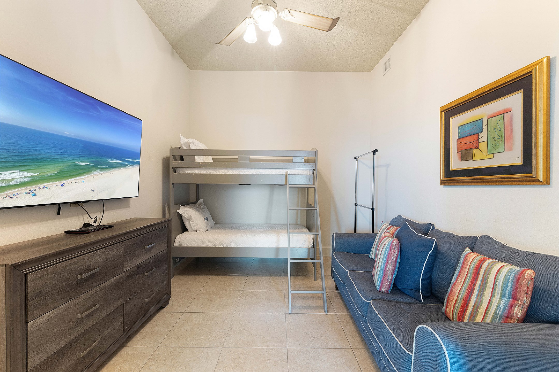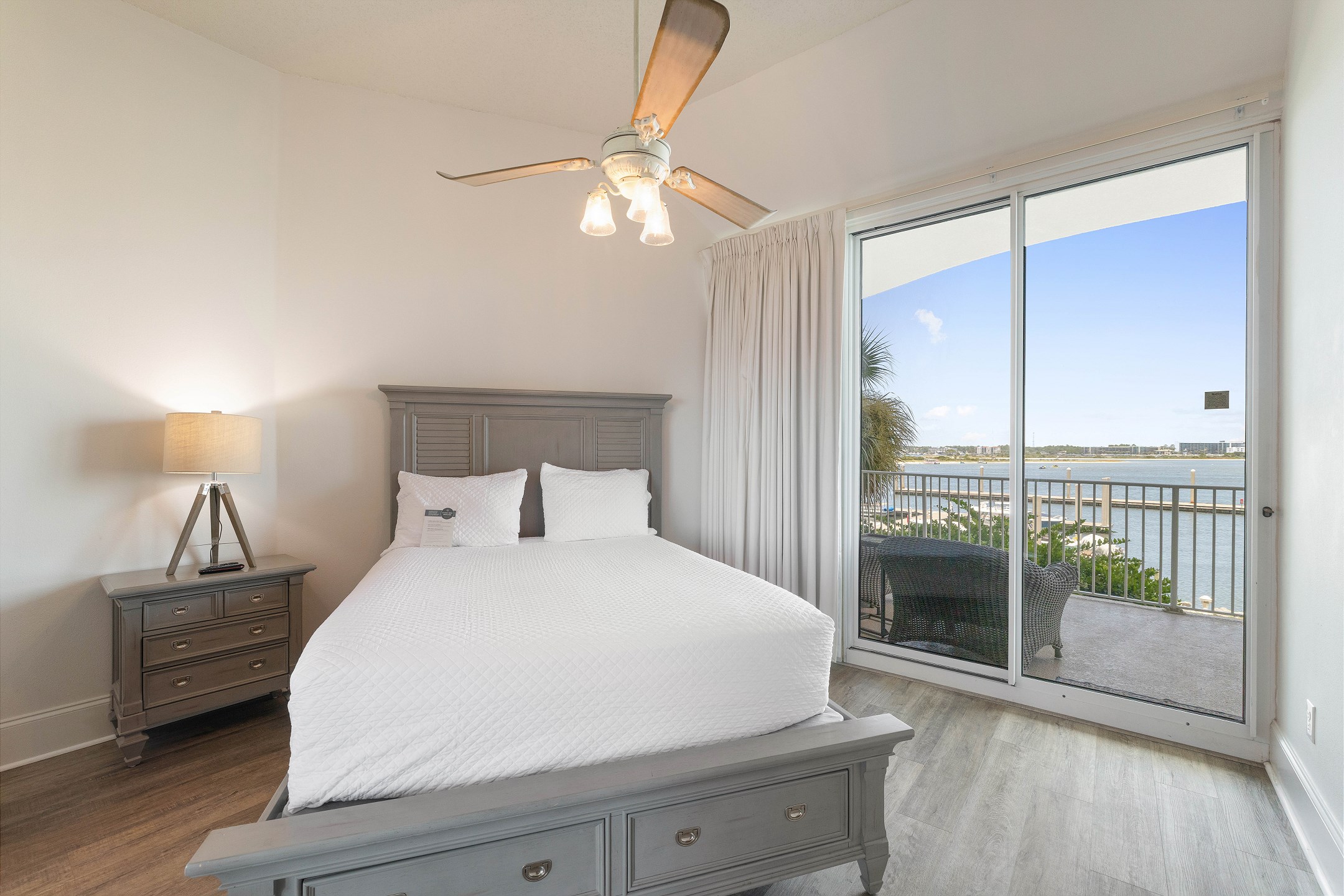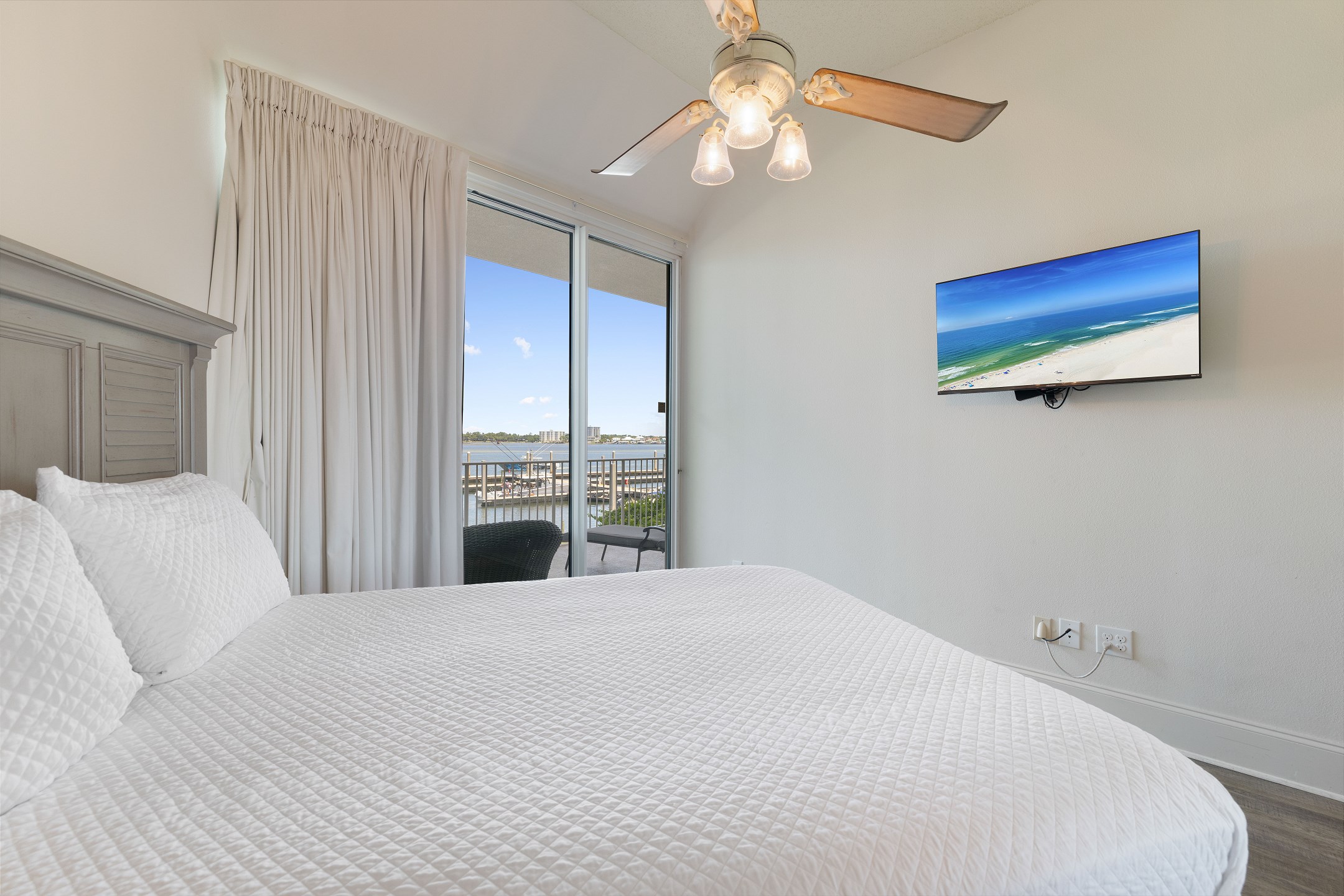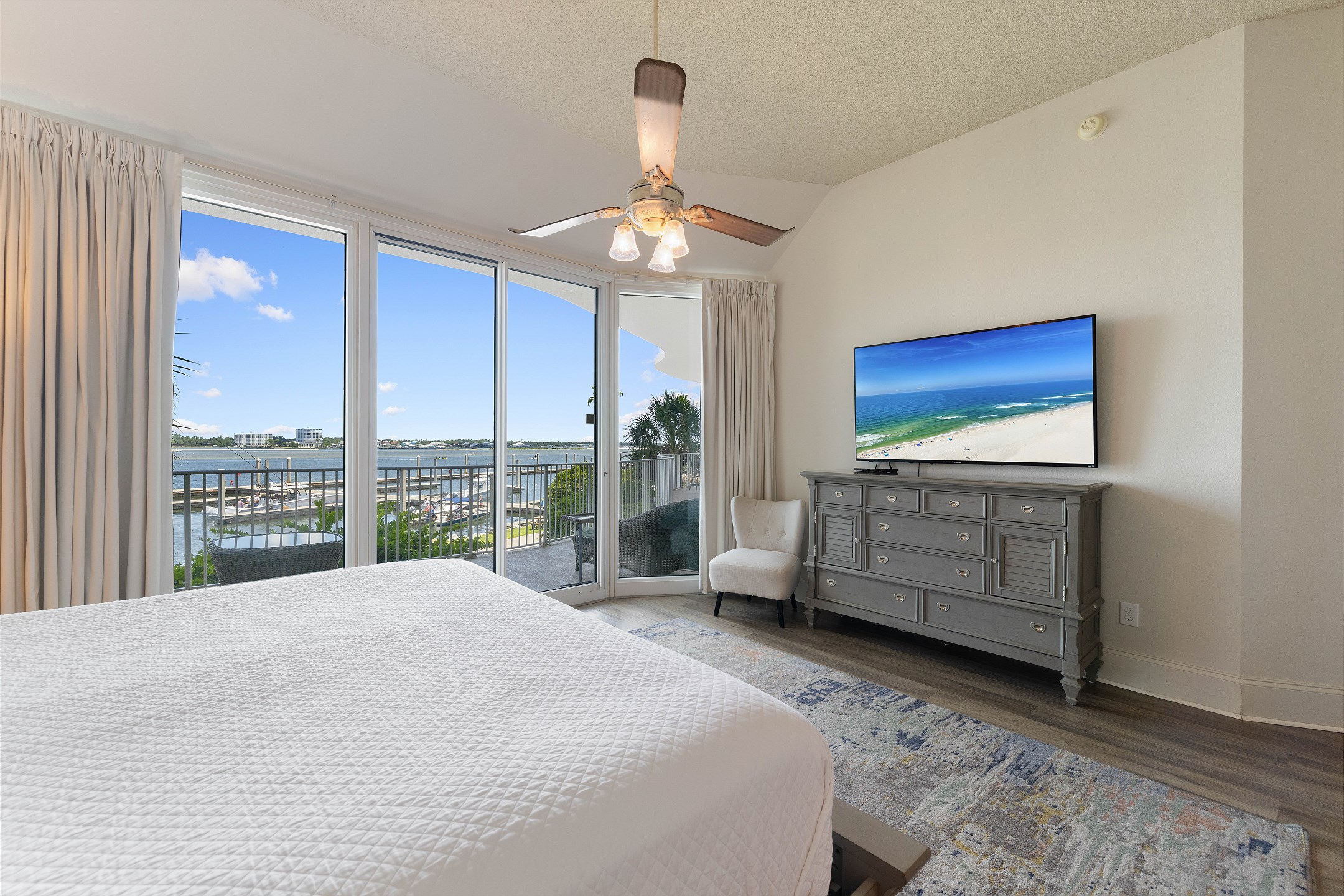 The primary bedroom features a king bed, private balcony access, and an ensuite bathroom complete with a jacuzzi tub and a walk-in shower. The second and third bedrooms each have a queen bed, ensuring a restful stay for all guests.