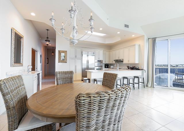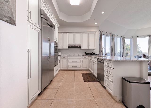 The living room offers breathtaking panoramic views with a floor-to-ceiling wall of windows leading to a private balcony, perfect for enjoying the coastal scenery. The kitchen is fully equipped with stainless steel appliances, making meal preparation a breeze.