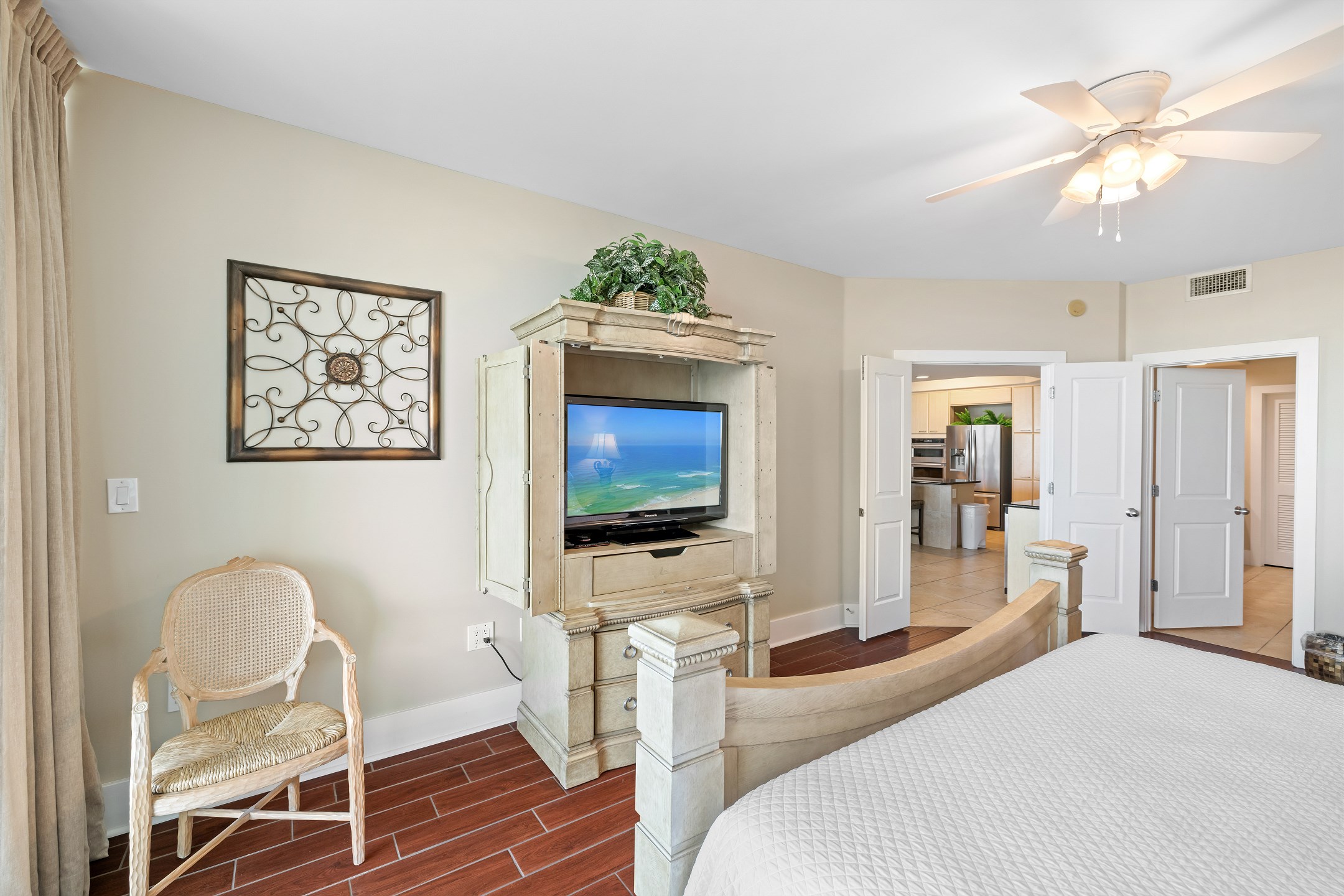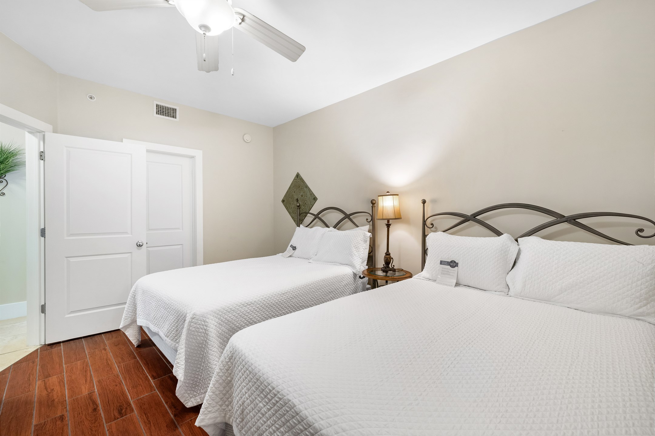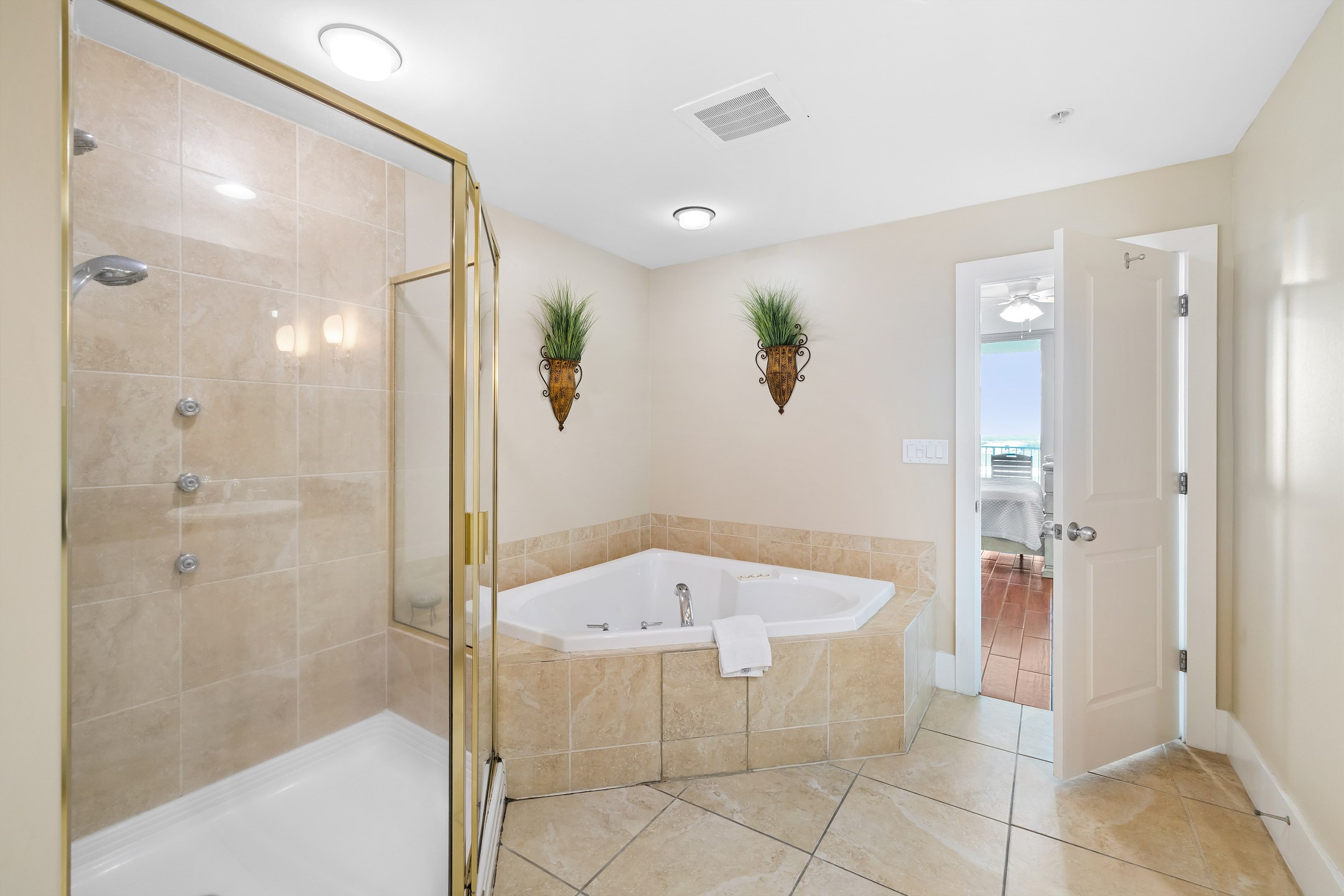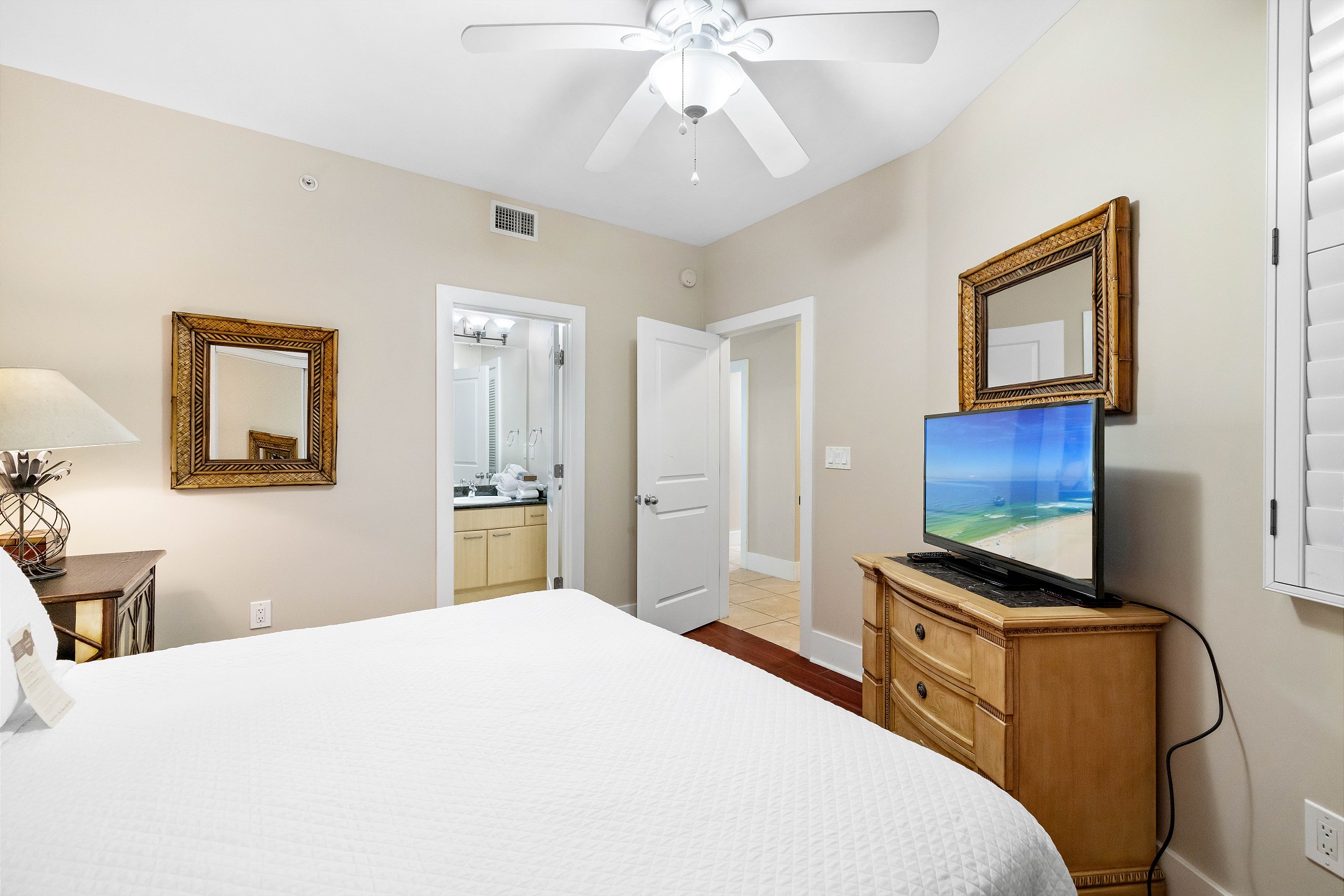 The primary bedroom is a serene retreat with a king bed, balcony access, and a spa-inspired ensuite bathroom featuring a double vanity, walk-in shower, and jacuzzi tub. The second bedroom also includes a king bed and ensuite bathroom for added comfort and privacy. The third bedroom is perfect for larger groups or families, offering two queen beds and another ensuite bathroom.