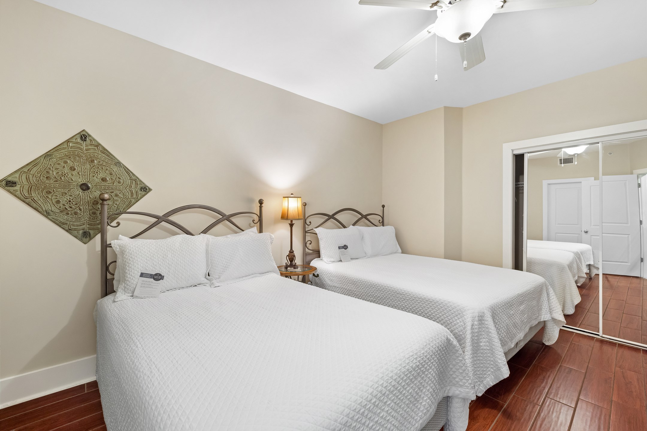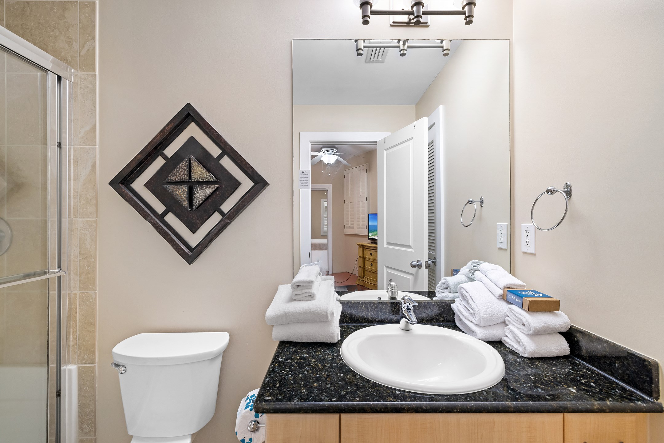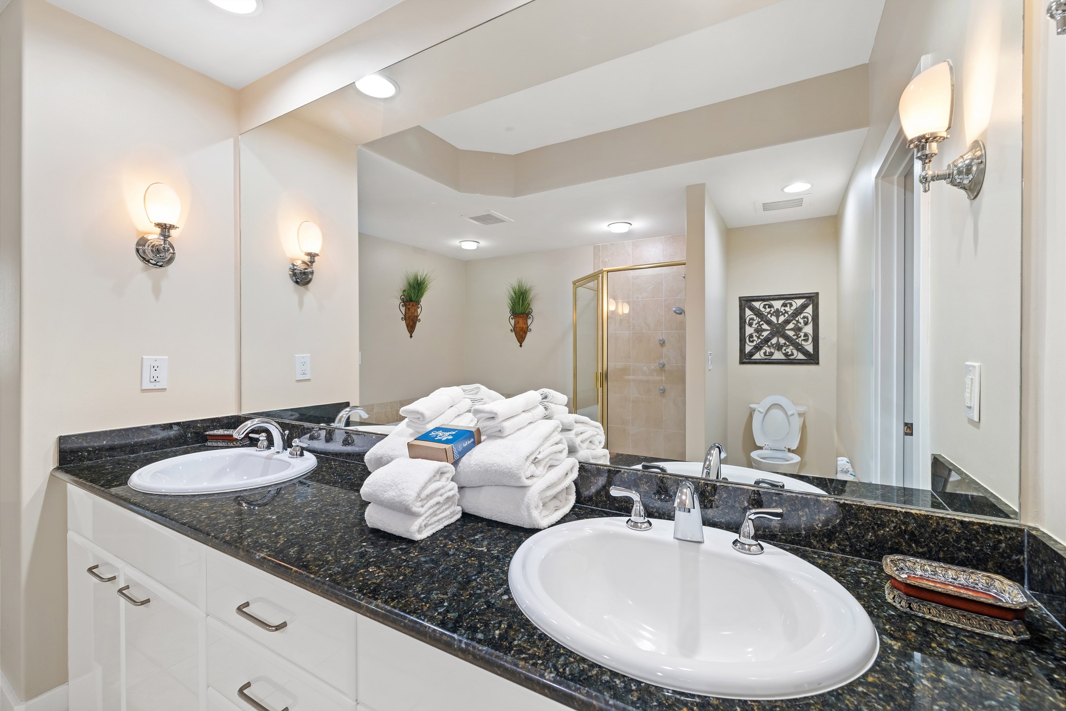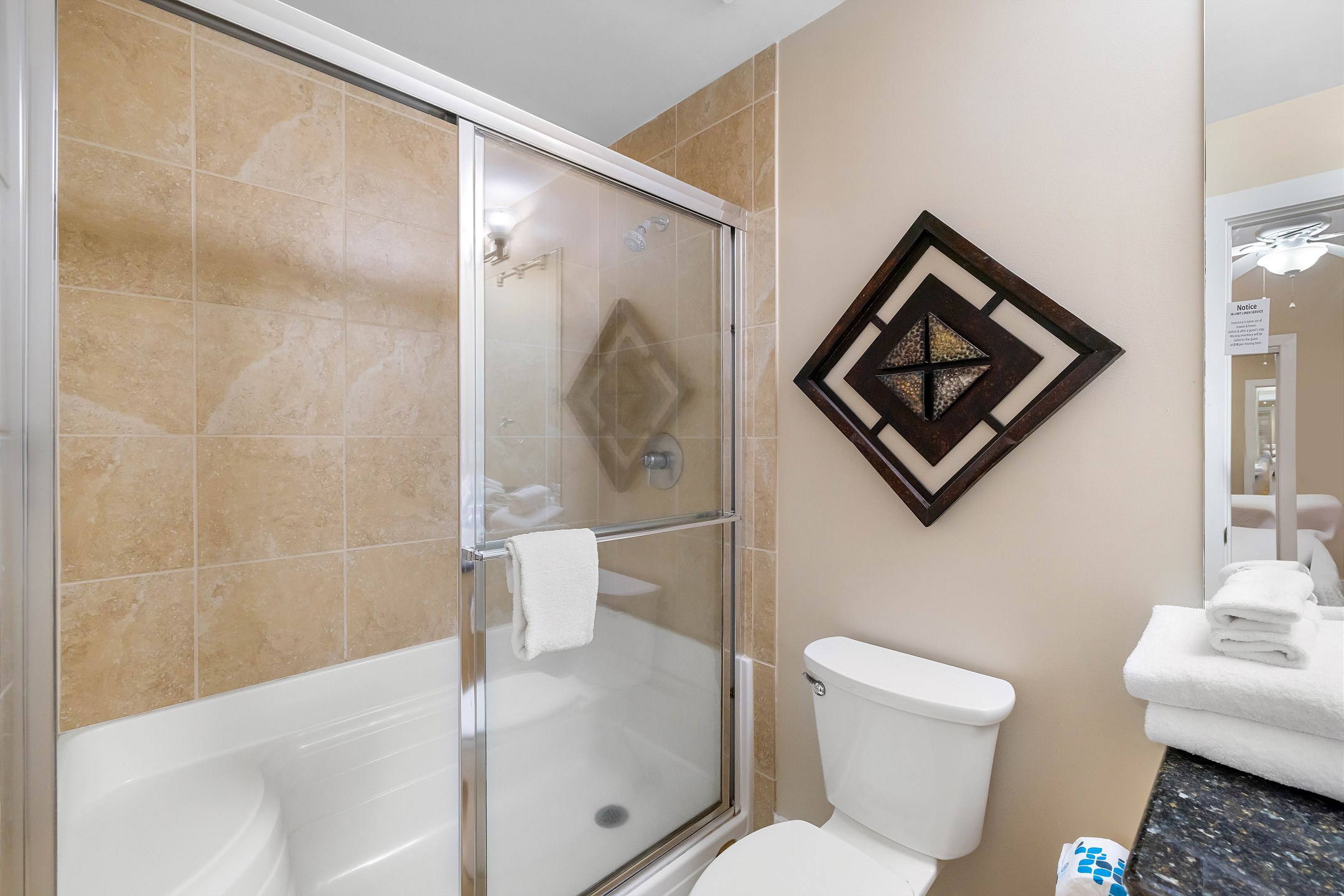 The primary bedroom is a serene retreat with a king bed, balcony access, and a spa-inspired ensuite bathroom featuring a double vanity, walk-in shower, and jacuzzi tub. The second bedroom also includes a king bed and ensuite bathroom for added comfort and privacy. The third bedroom is perfect for larger groups or families, offering two queen beds and another ensuite bathroom.