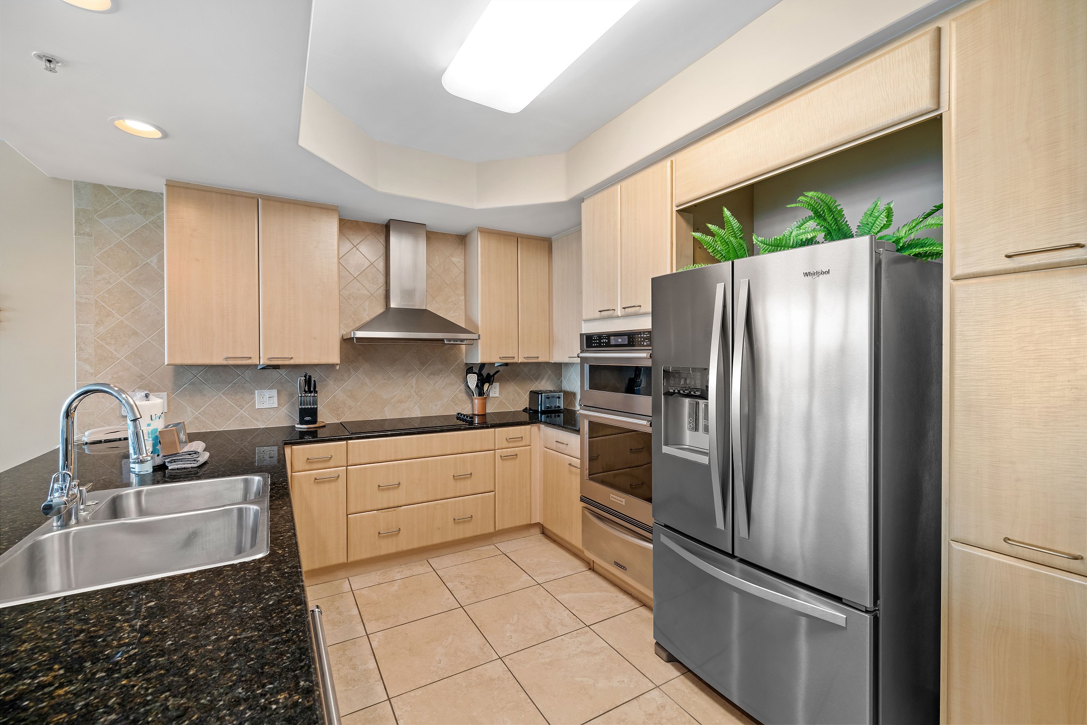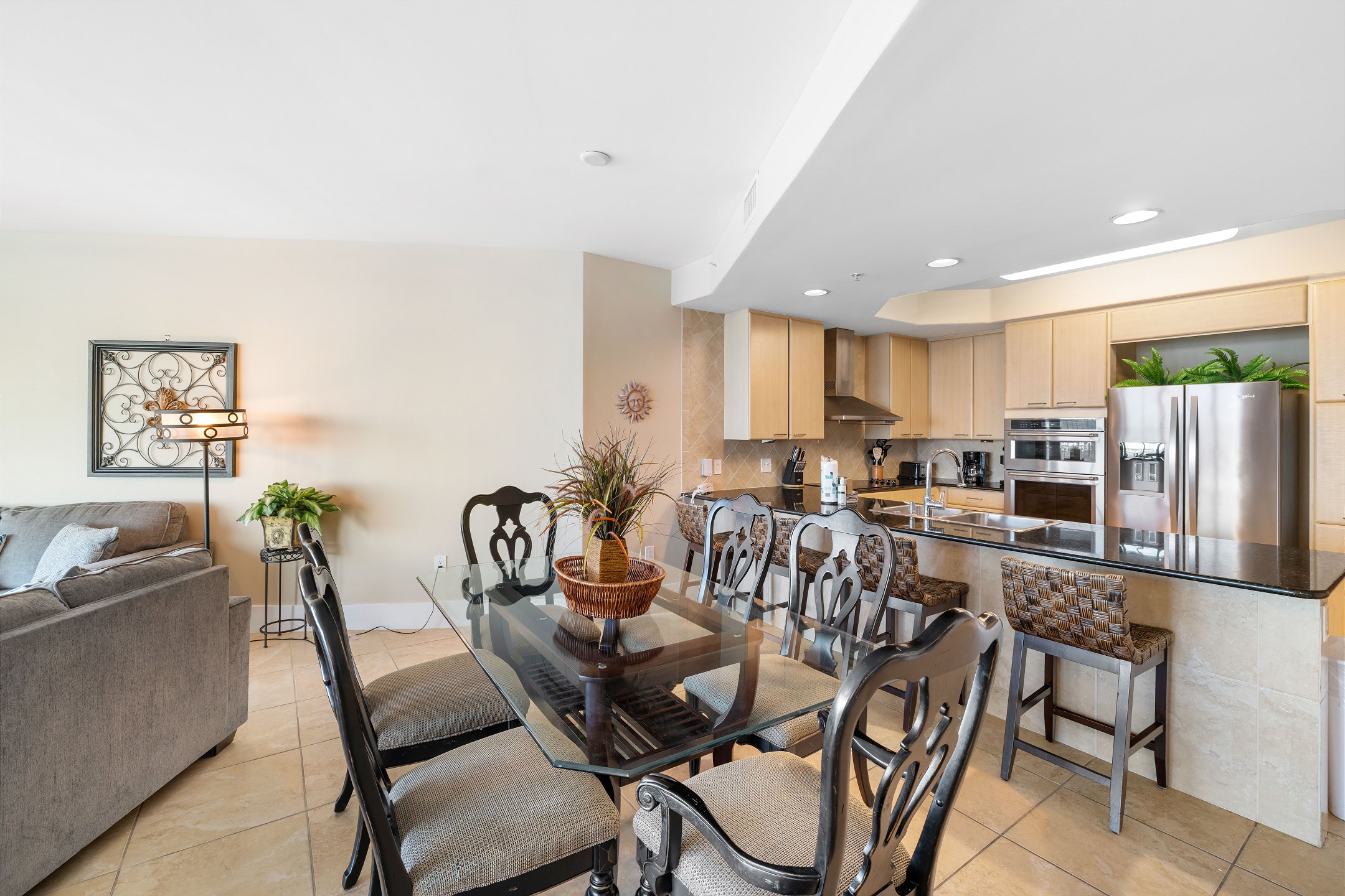 The fully equipped kitchen includes stainless steel appliances and a dining table, making it easy to enjoy meals together during your stay.