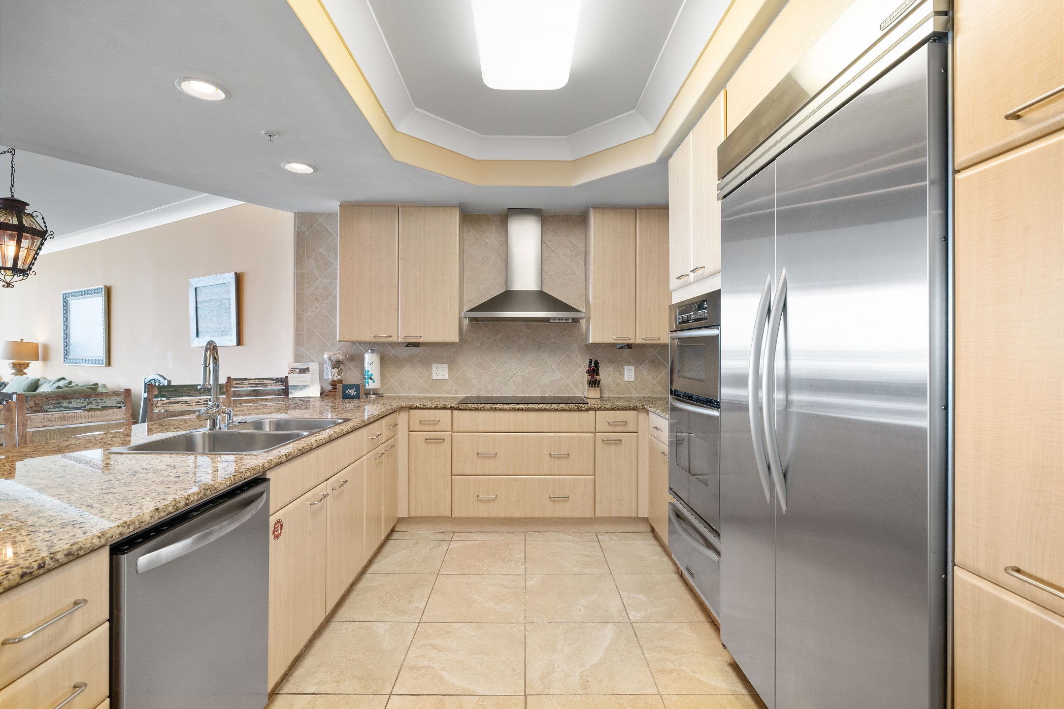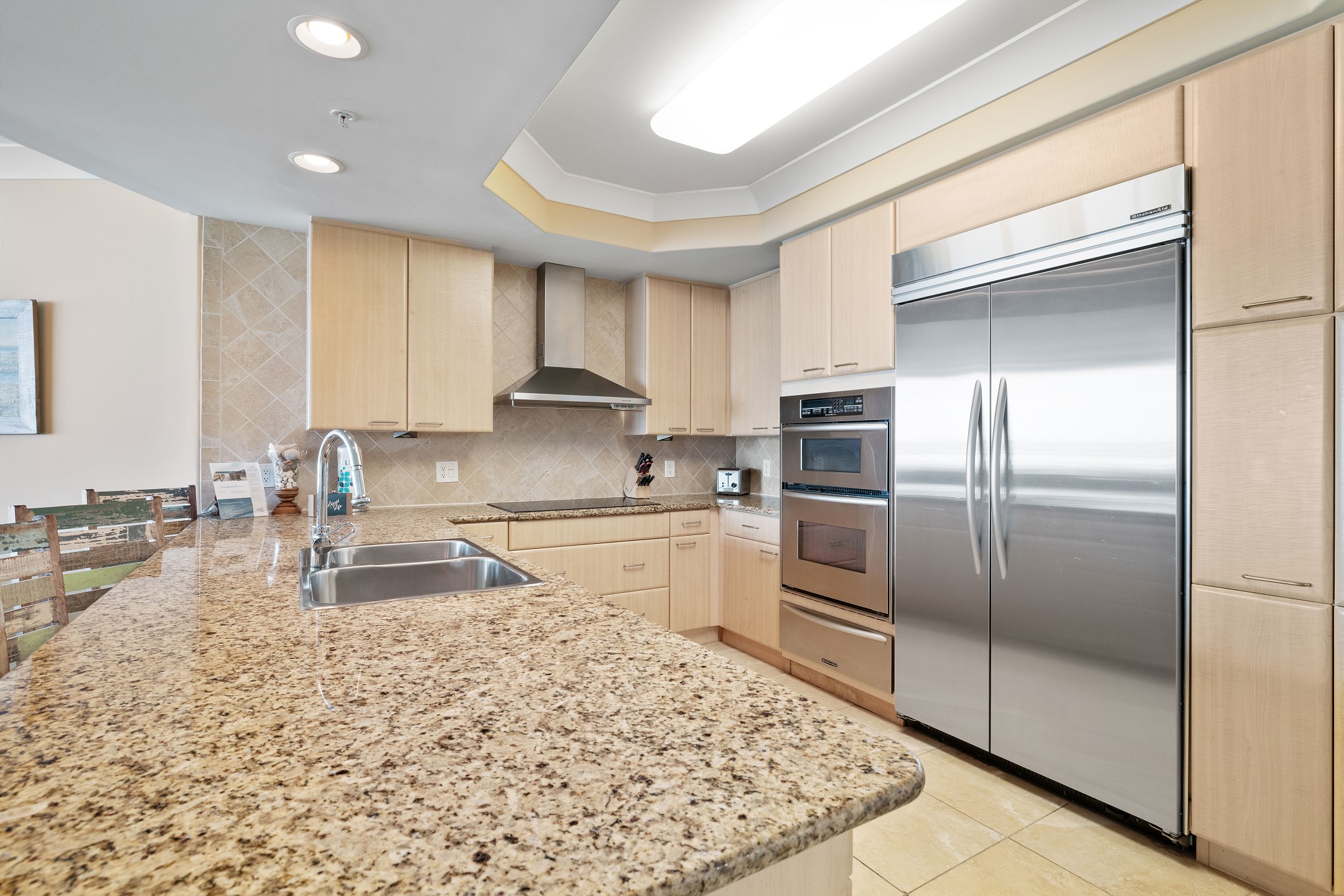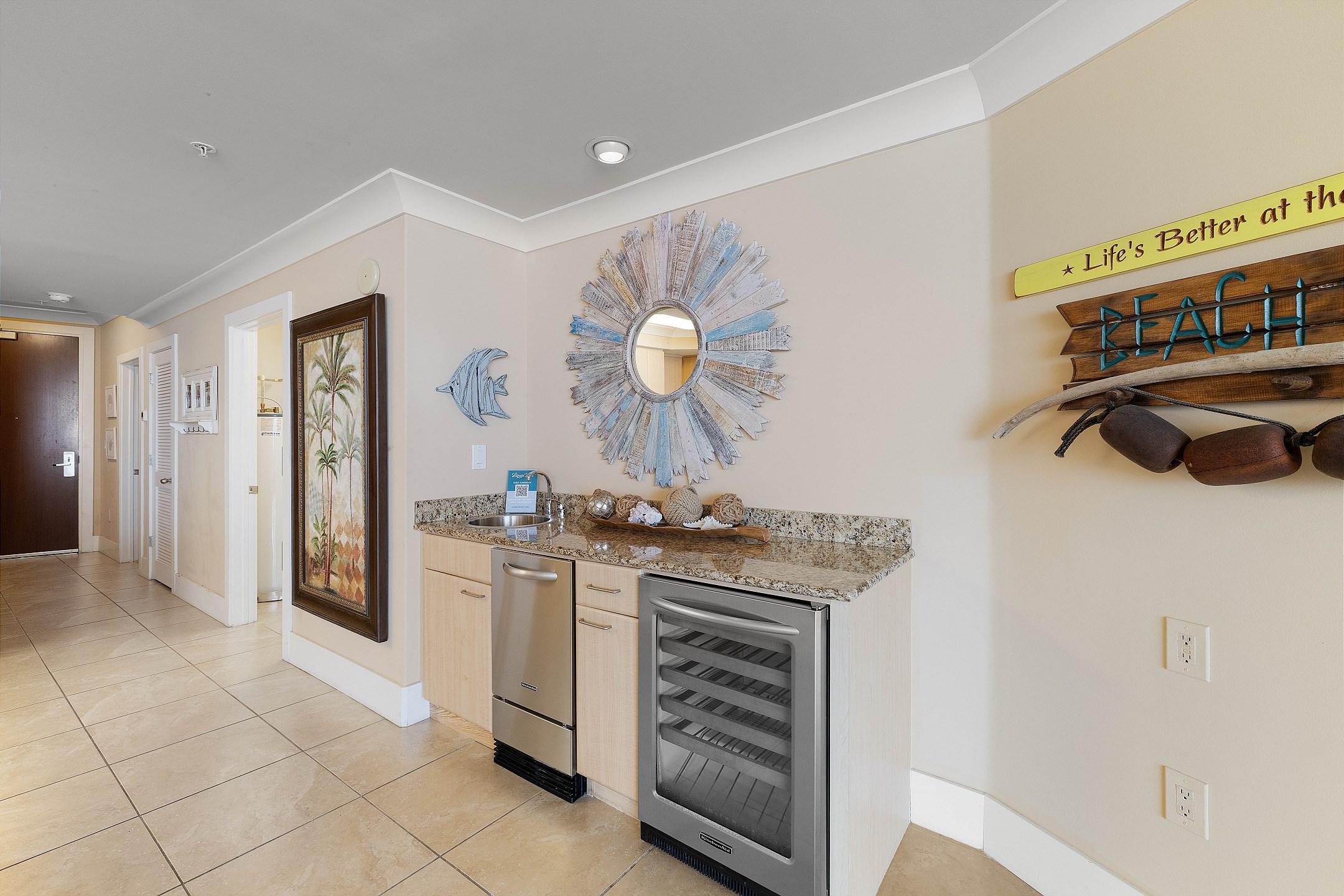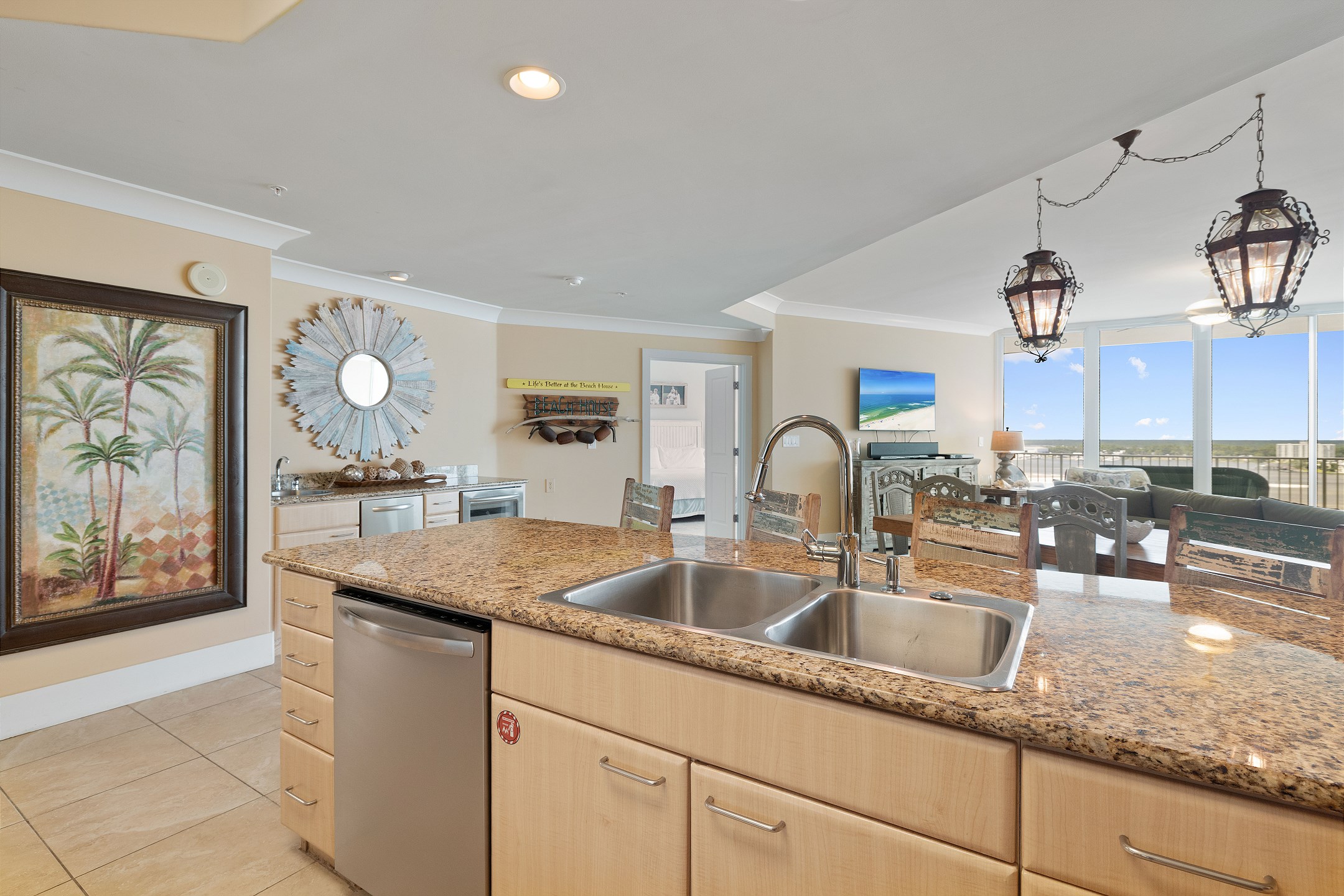 The fully equipped kitchen boasts stainless steel appliances, granite countertops, and a wet bar with a separate ice maker and wine chiller. A full-sized washer and dryer add extra convenience to your stay.