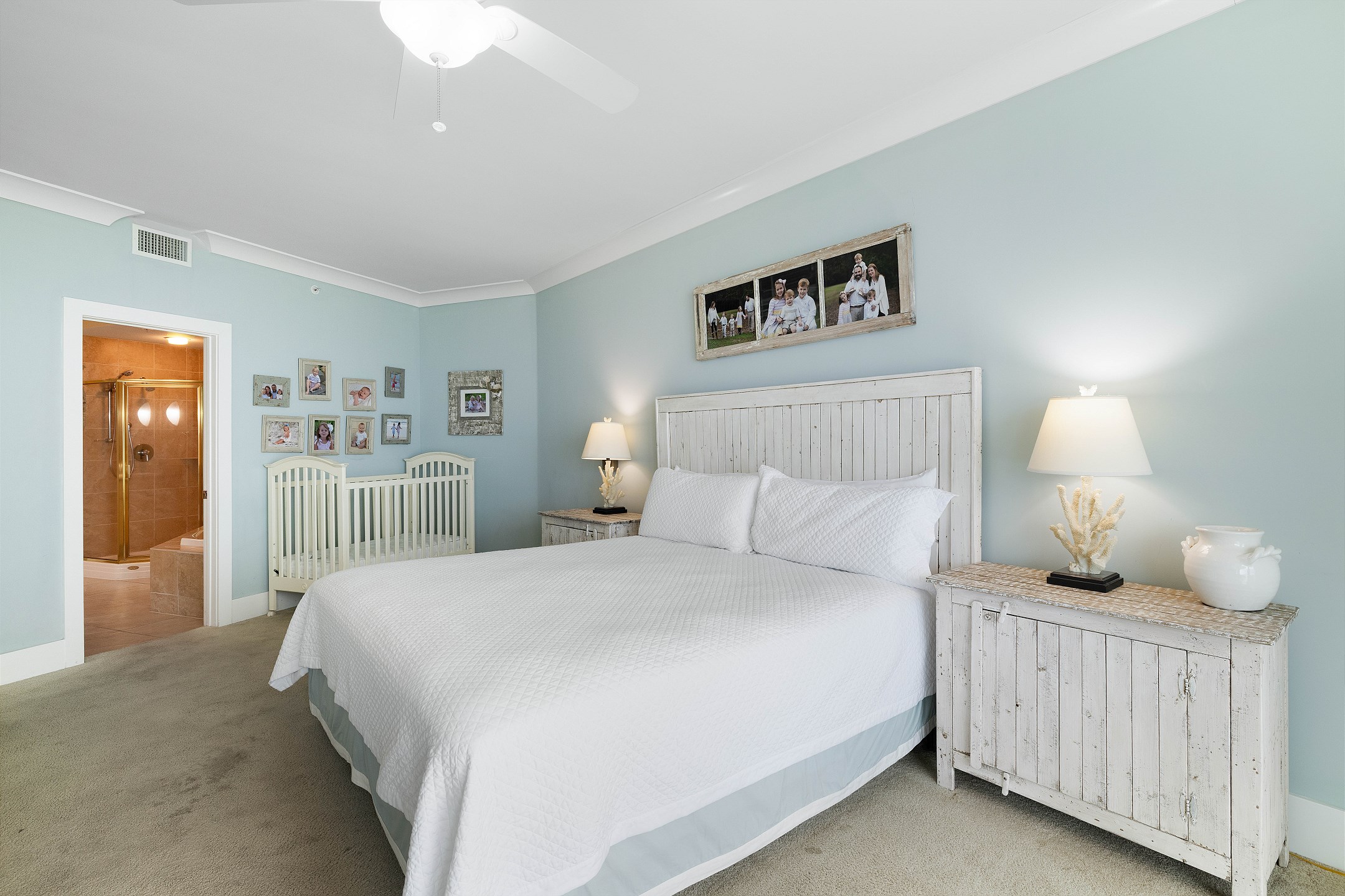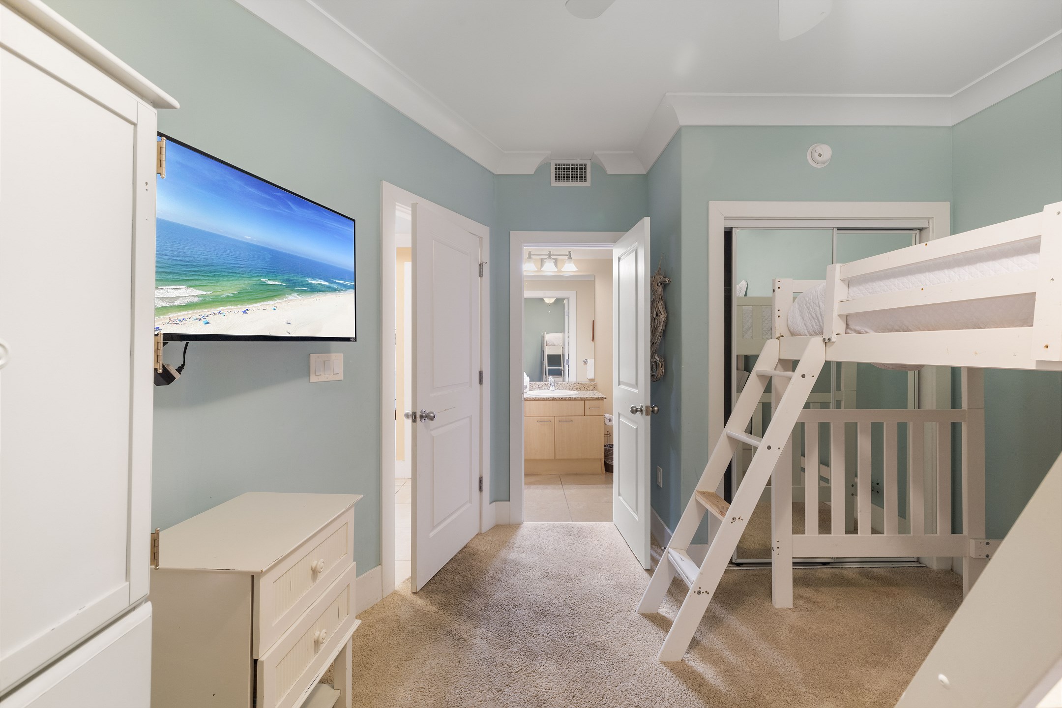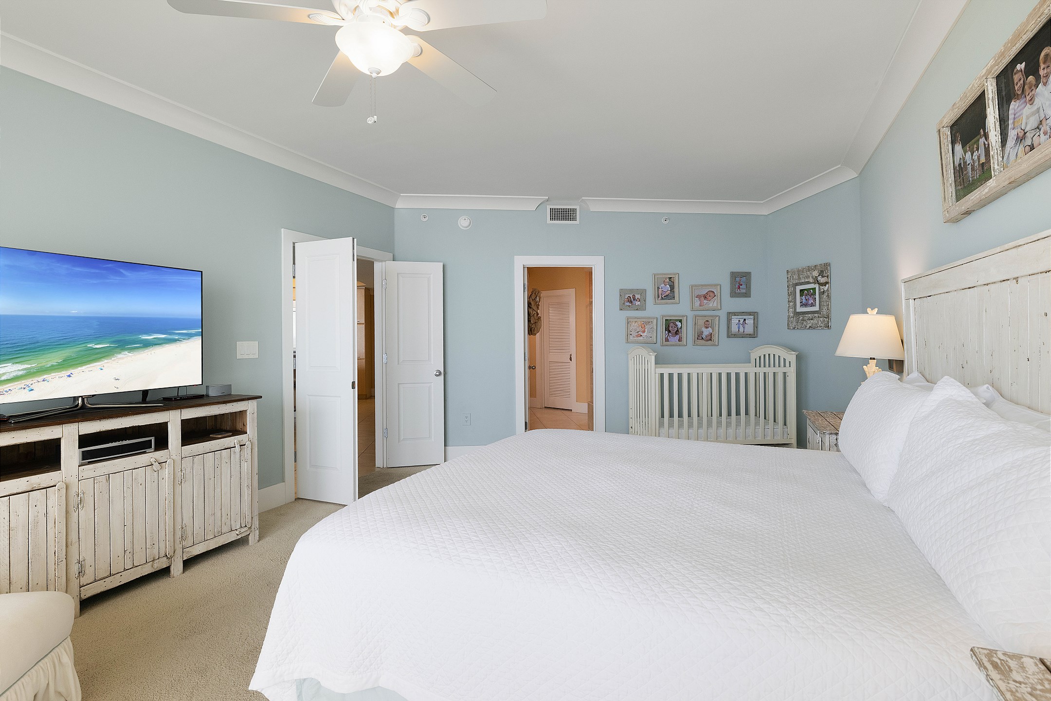 The primary suite features a king bed, a flat-screen TV, a DVD player, and private balcony access. It also includes a baby crib (sheets not provided) for little ones and an ensuite bathroom with a garden tub and a separate walk-in shower. The second bedroom offers a king bed, a flat-screen TV, and convenient access to the hall bath. The third bedroom is perfect for families, with two twin top bunks over a full bed on the bottom. For additional sleeping space, the living room includes a sofa sleeper, allowing the unit to accommodate up to 10 guests.