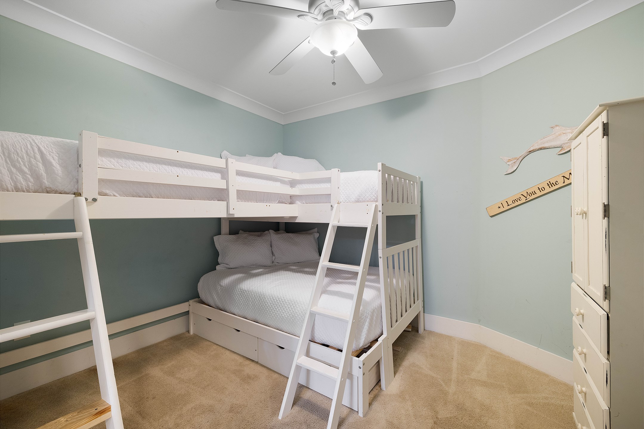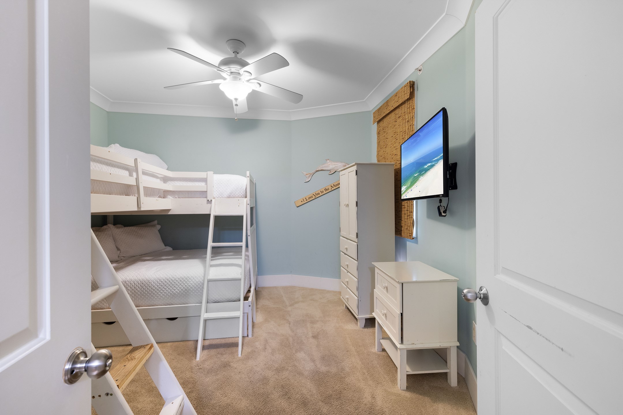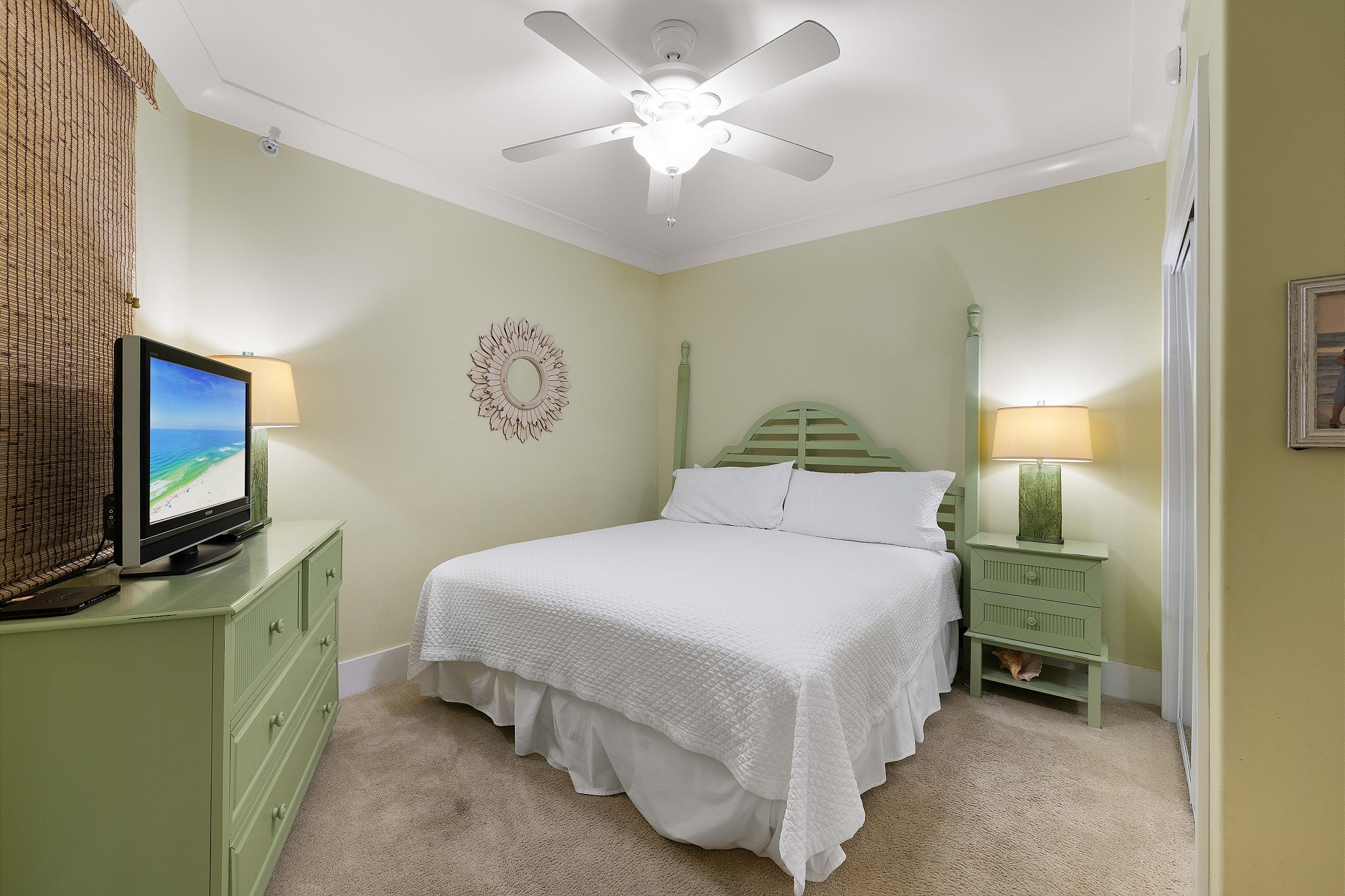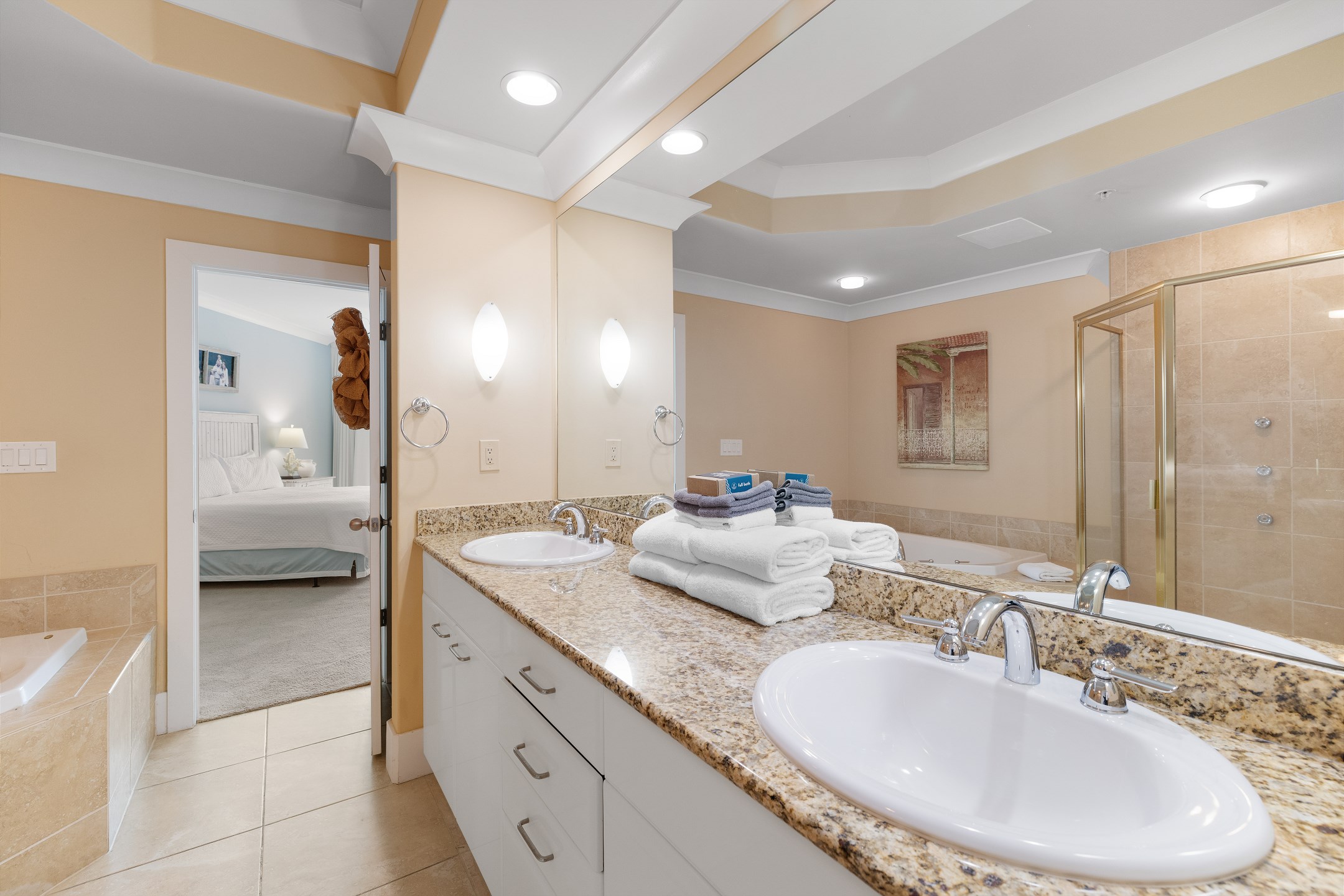 The primary suite features a king bed, a flat-screen TV, a DVD player, and private balcony access. It also includes a baby crib (sheets not provided) for little ones and an ensuite bathroom with a garden tub and a separate walk-in shower. The second bedroom offers a king bed, a flat-screen TV, and convenient access to the hall bath. The third bedroom is perfect for families, with two twin top bunks over a full bed on the bottom. For additional sleeping space, the living room includes a sofa sleeper, allowing the unit to accommodate up to 10 guests.