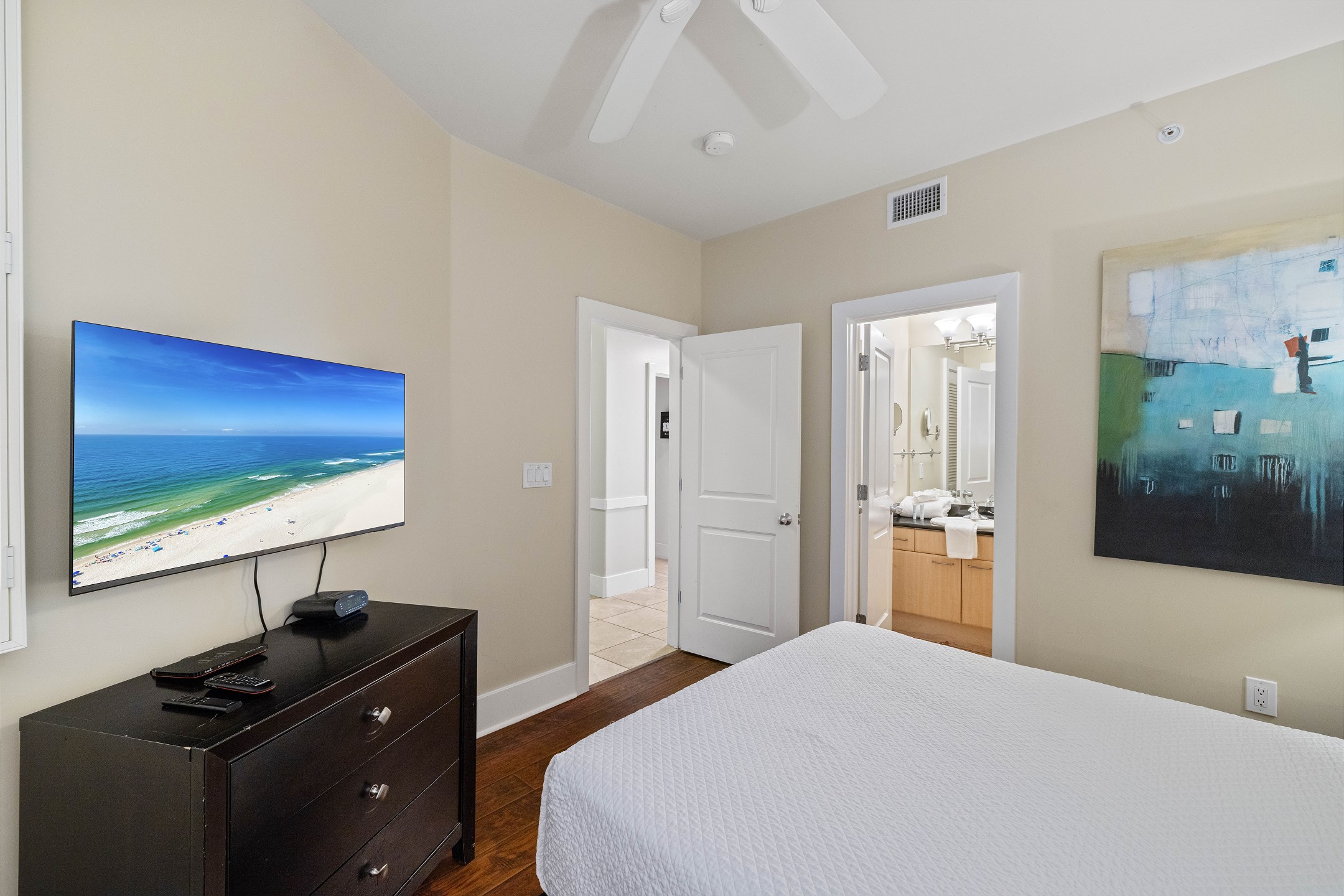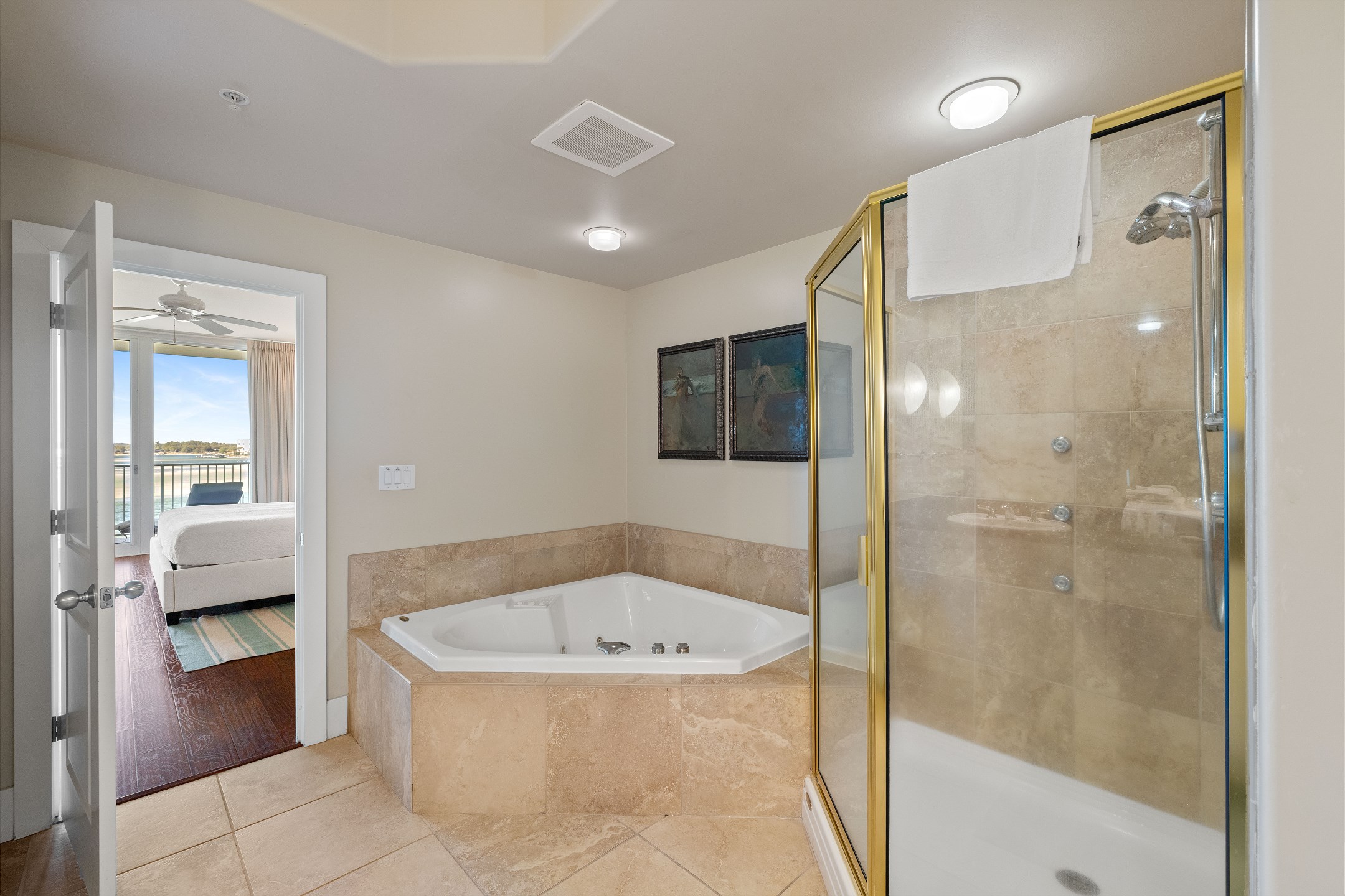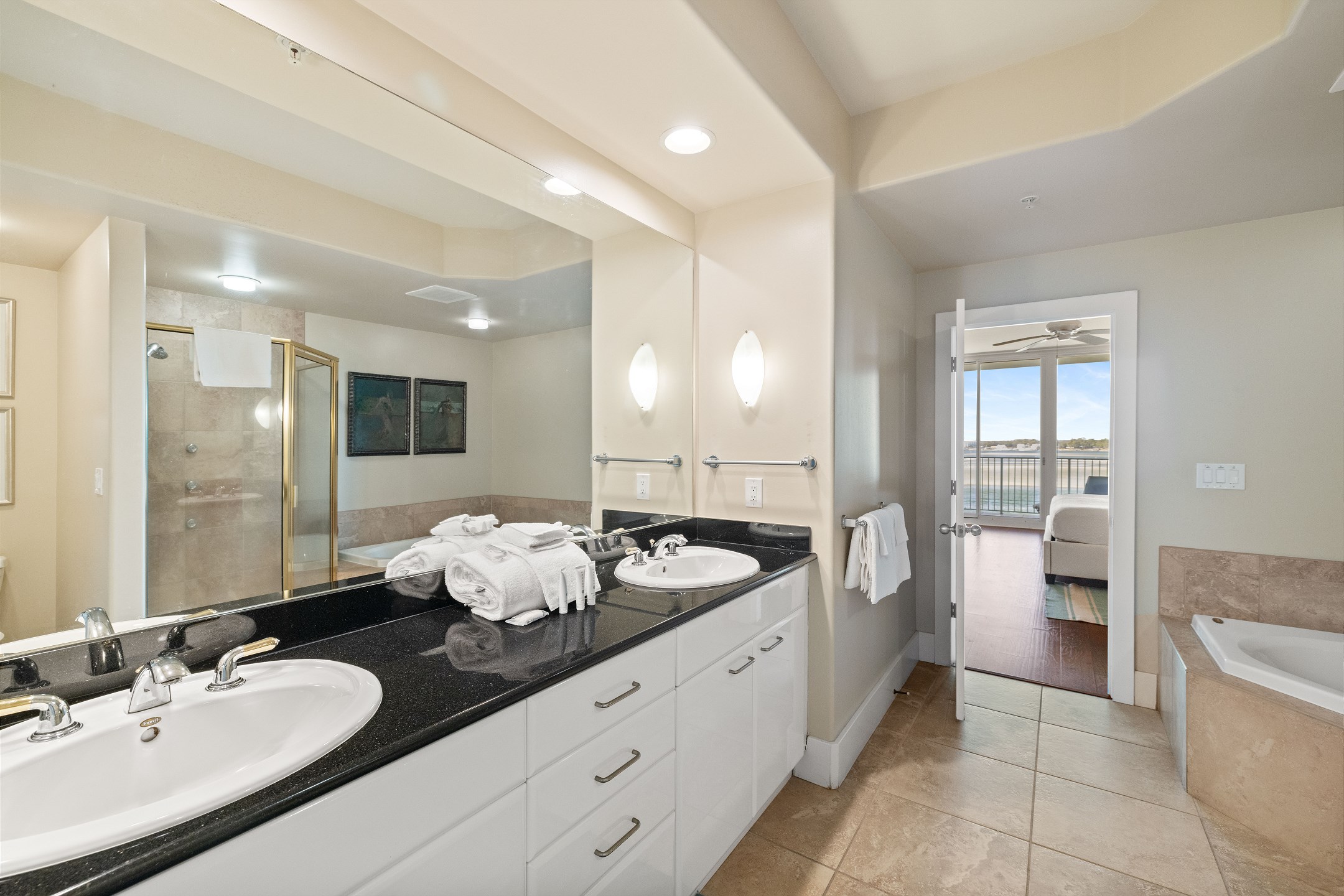 The primary bedroom features a king-size bed along with a fold-out full-size bed, a flat screen TV, and floor to ceiling windows with balcony access overlooking the bay. The ensuite bathroom includes a dual sink vanity, a jetted tub, and a walk in shower. The second bedroom offers a queen bed, TV, and a private ensuite bathroom with a jetted shower and tub combination. The third bedroom also has a queen bed, TV, and access to a bathroom shared with the hallway, featuring a walk in shower.