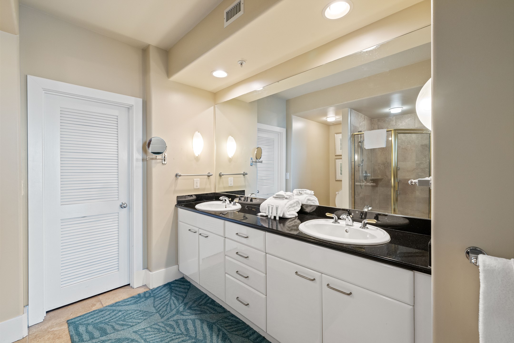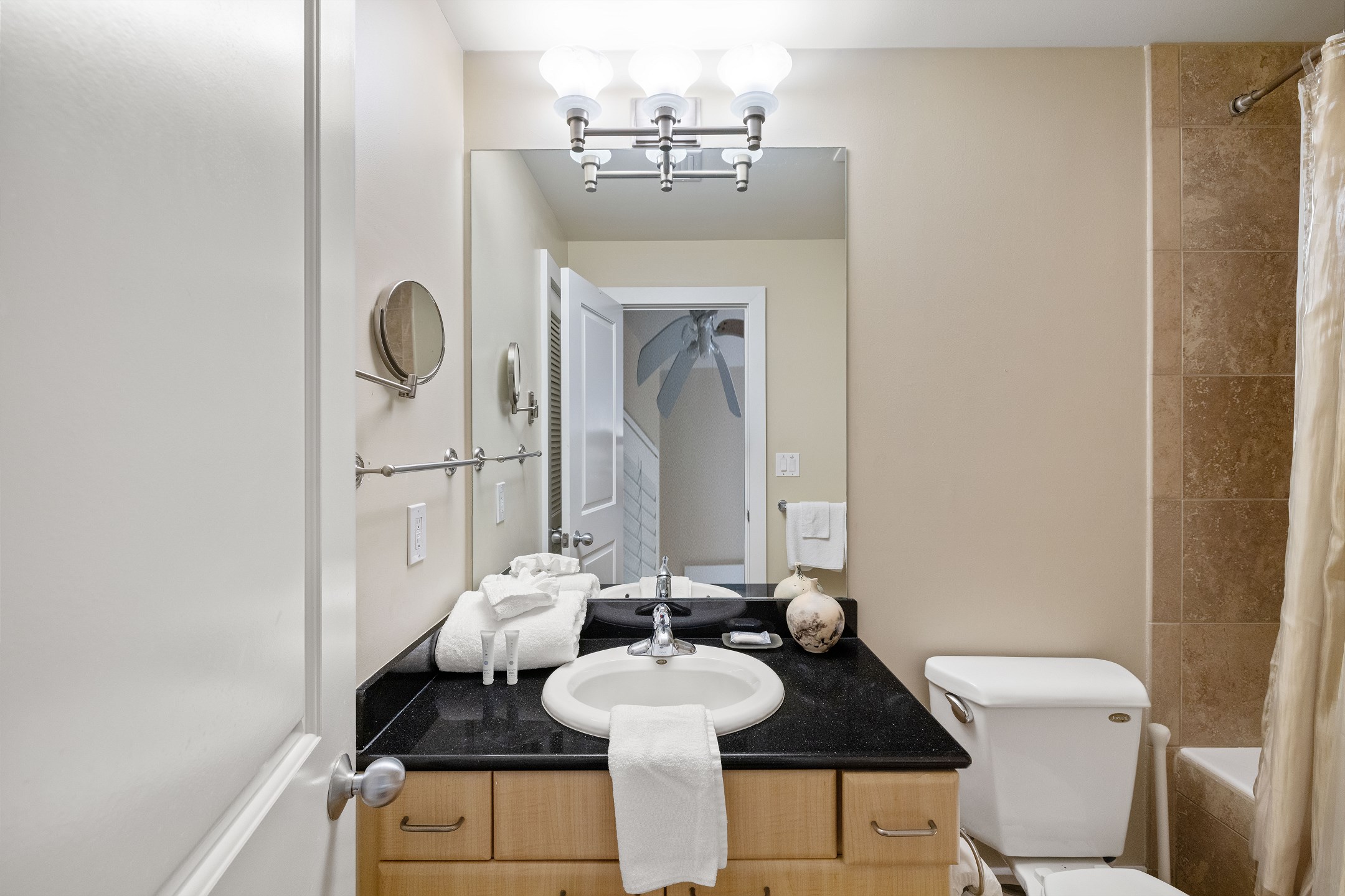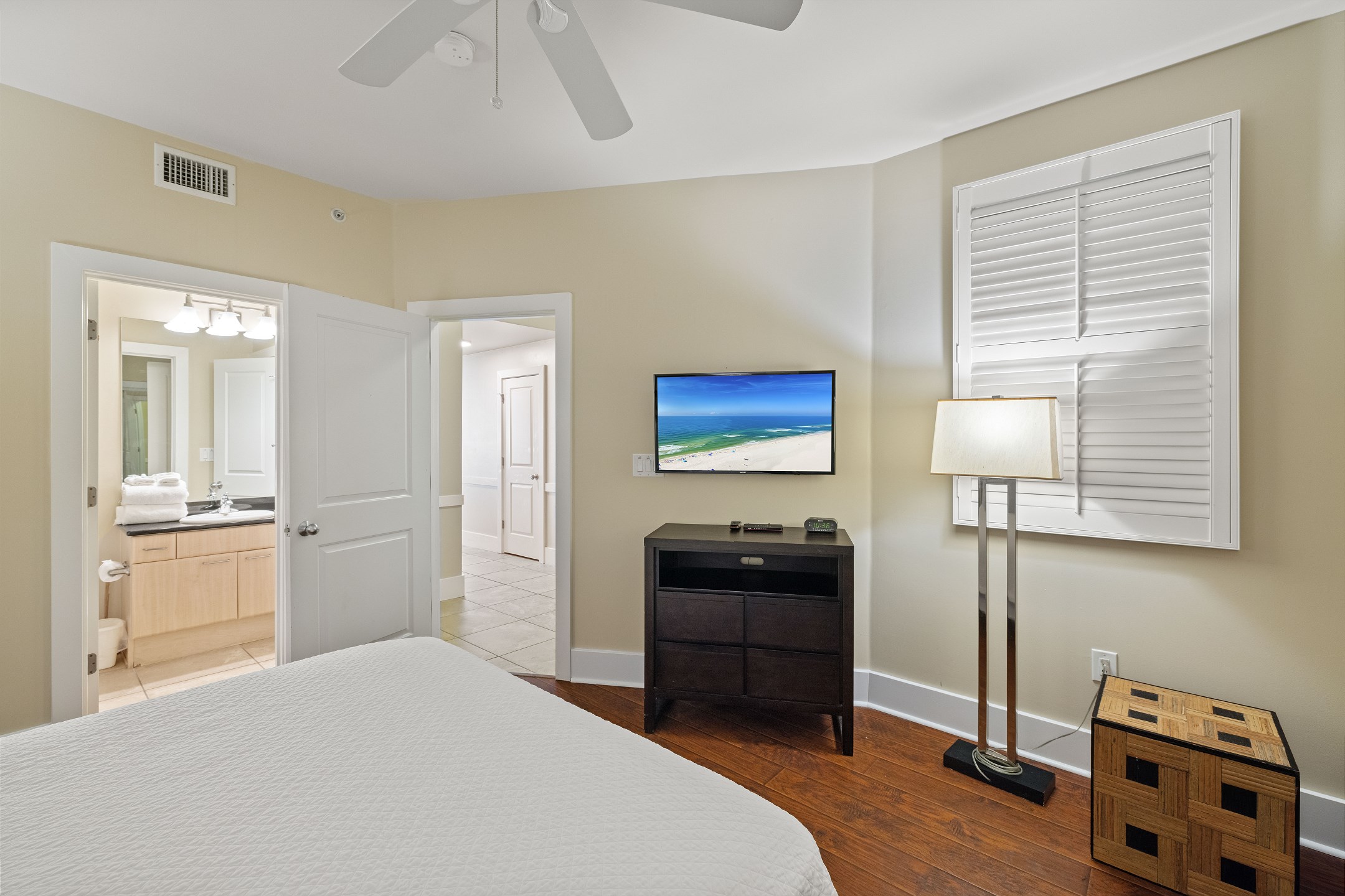The primary bedroom features a king-size bed along with a fold-out full-size bed, a flat screen TV, and floor to ceiling windows with balcony access overlooking the bay. The ensuite bathroom includes a dual sink vanity, a jetted tub, and a walk in shower. The second bedroom offers a queen bed, TV, and a private ensuite bathroom with a jetted shower and tub combination. The third bedroom also has a queen bed, TV, and access to a bathroom shared with the hallway, featuring a walk in shower.