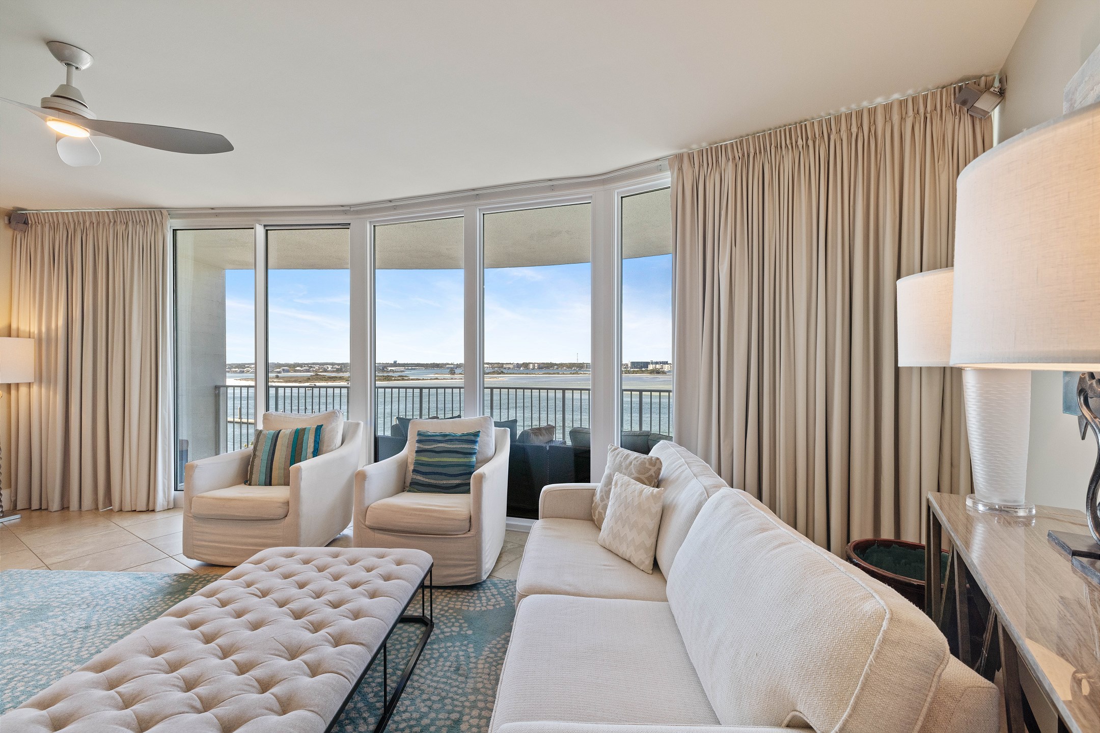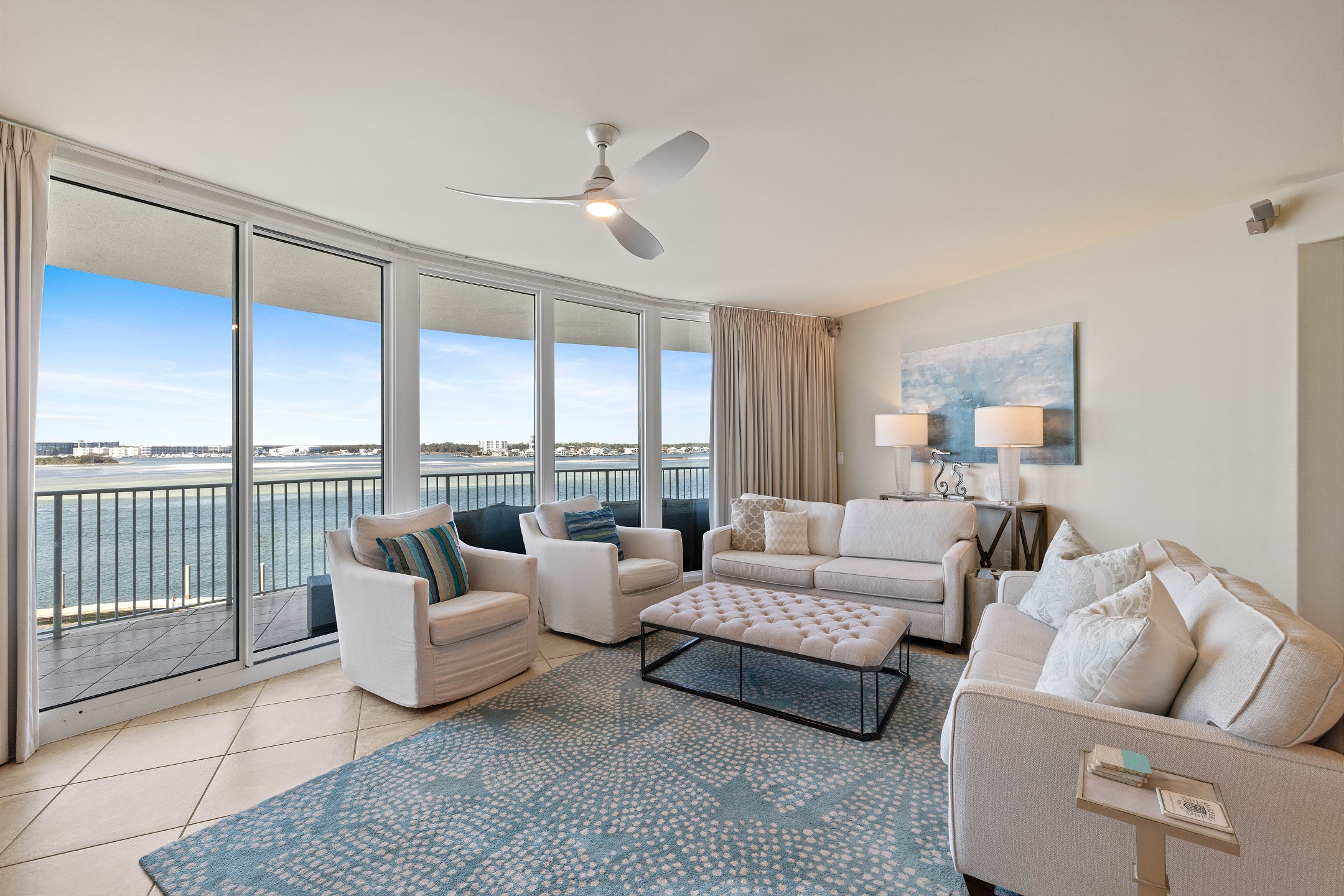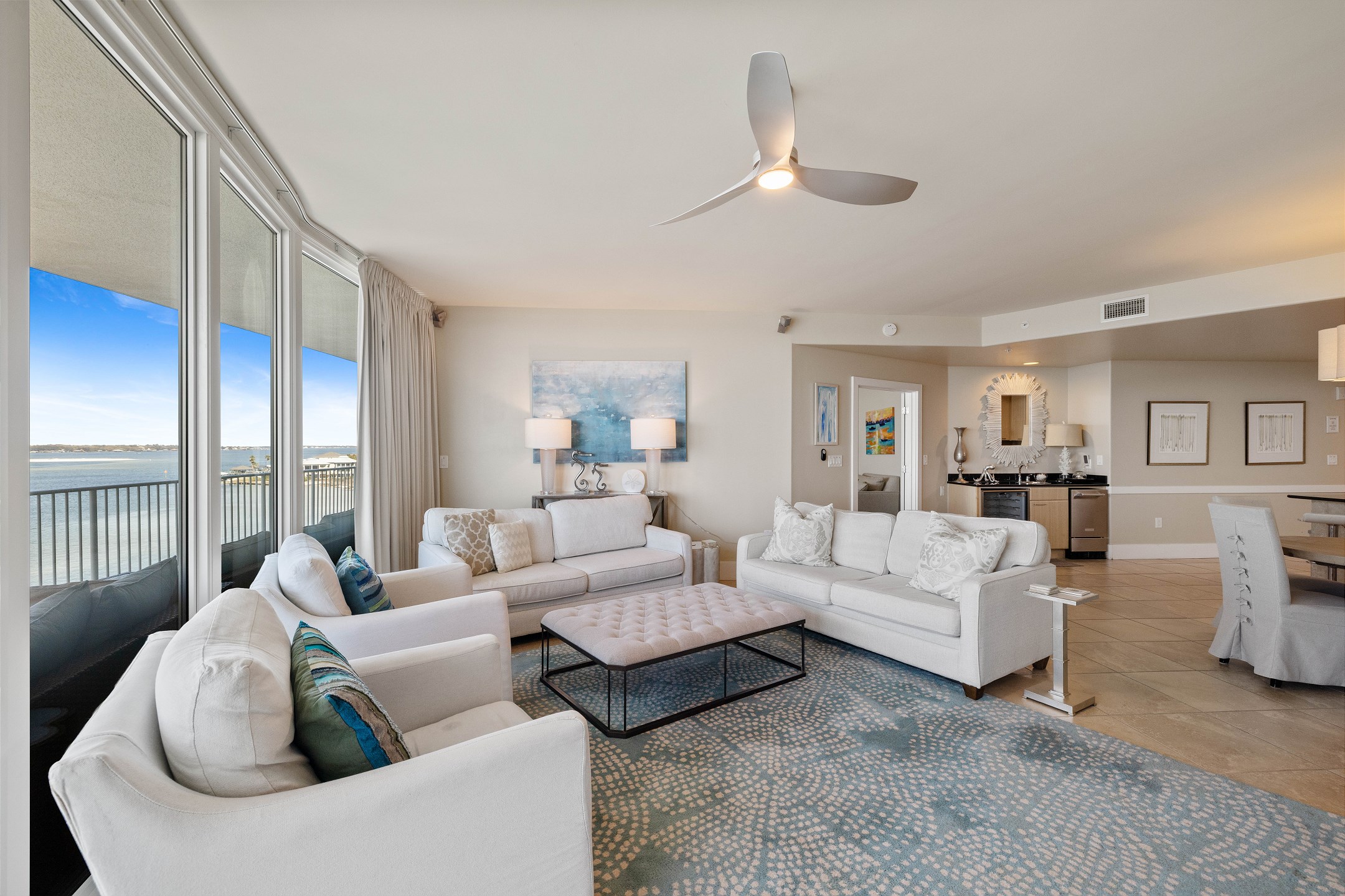 The living room offers plenty of comfortable seating, a flat screen TV, and a wall of floor to ceiling windows showcasing stunning views of the bay with direct access to the private balcony. The balcony features ample seating, including a cozy lounge couch, making it the perfect spot to relax and enjoy the scenery.