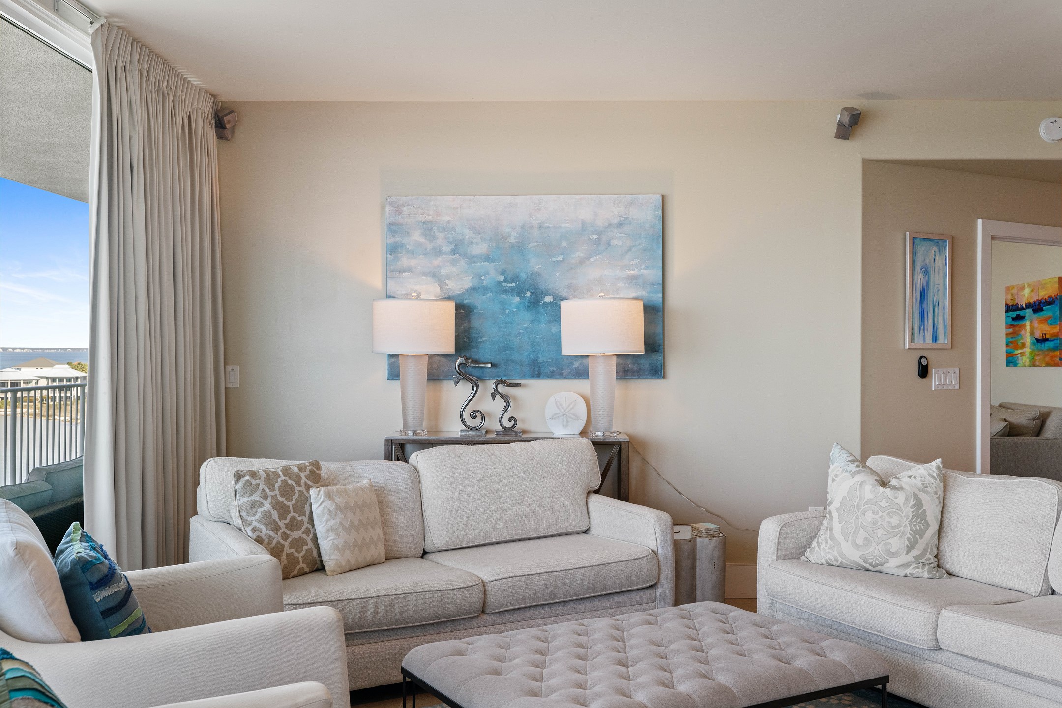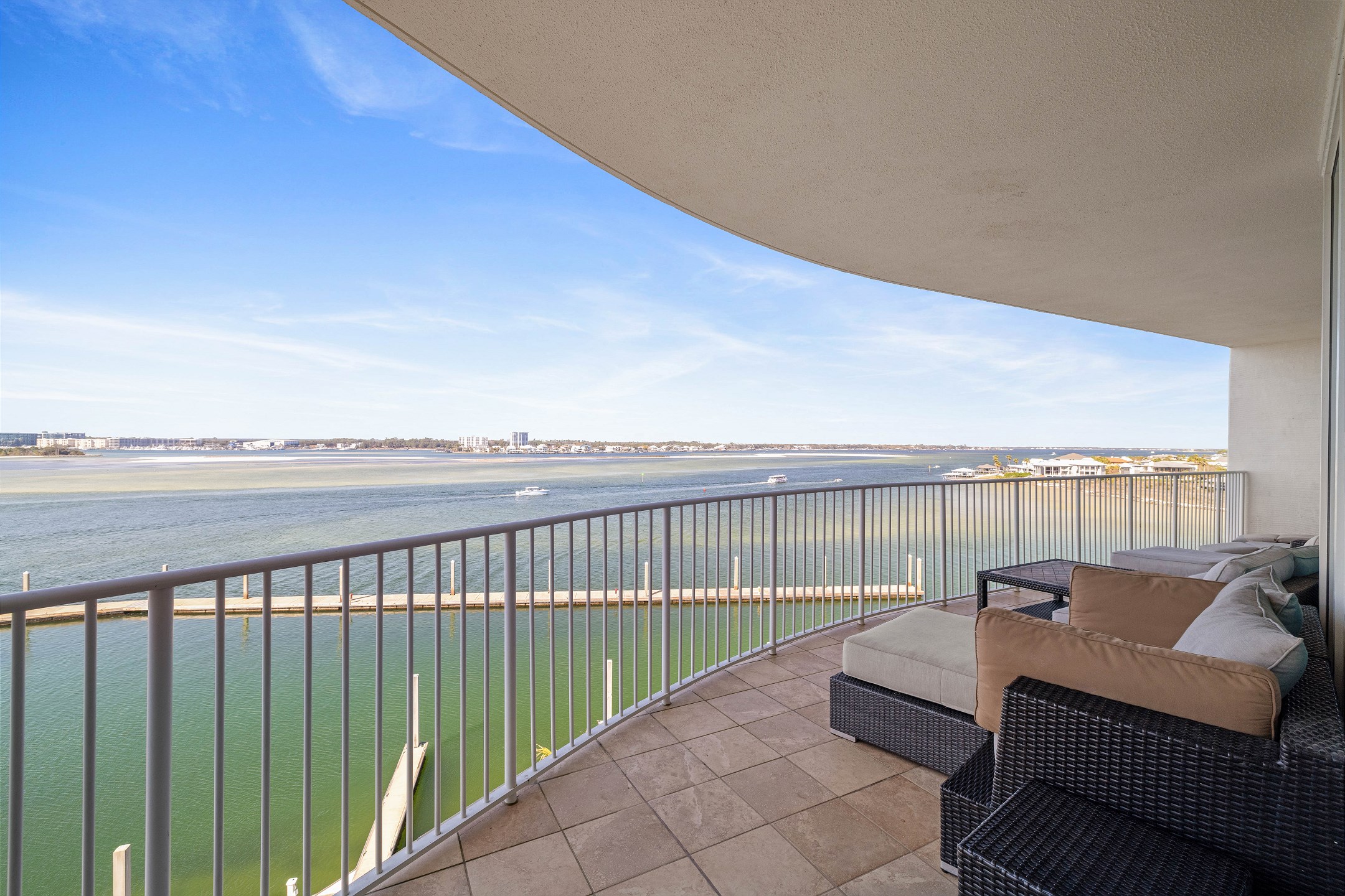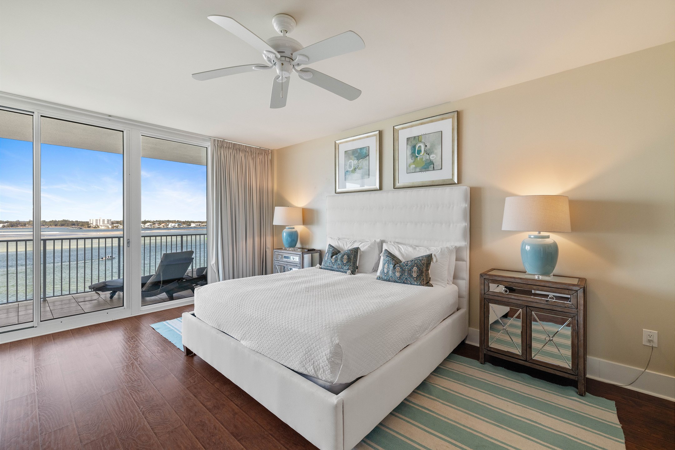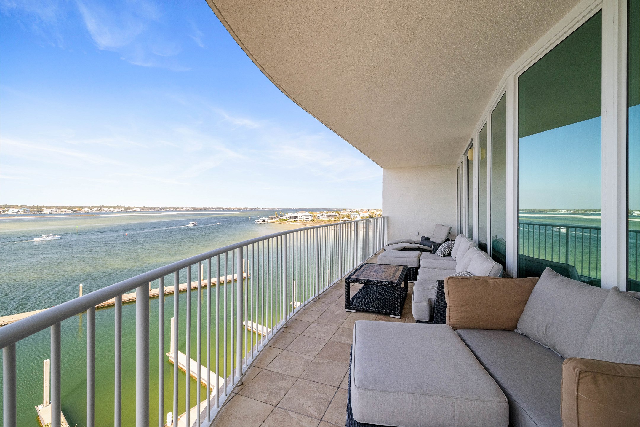 The living room offers plenty of comfortable seating, a flat screen TV, and a wall of floor to ceiling windows showcasing stunning views of the bay with direct access to the private balcony. The balcony features ample seating, including a cozy lounge couch, making it the perfect spot to relax and enjoy the scenery.