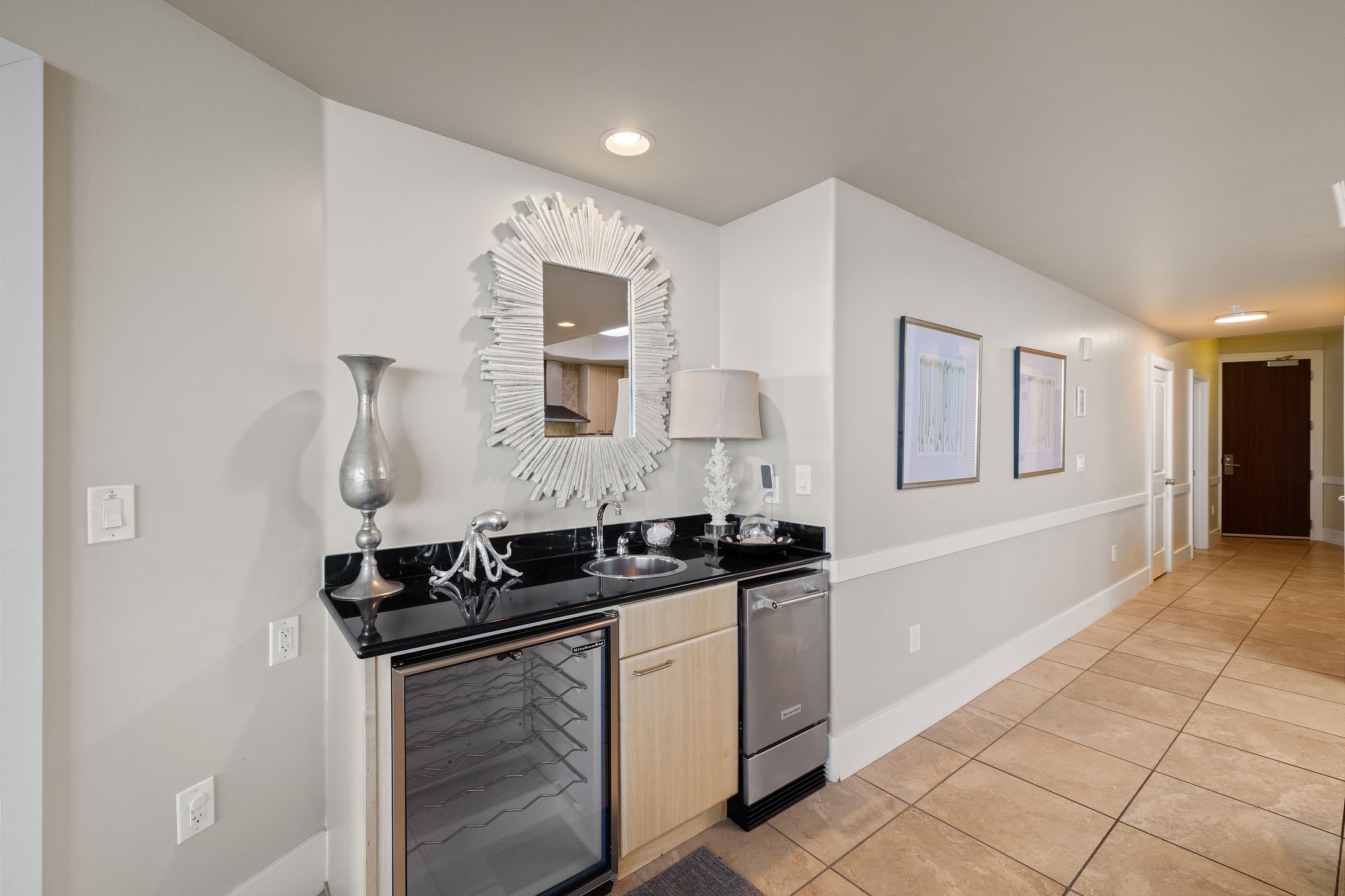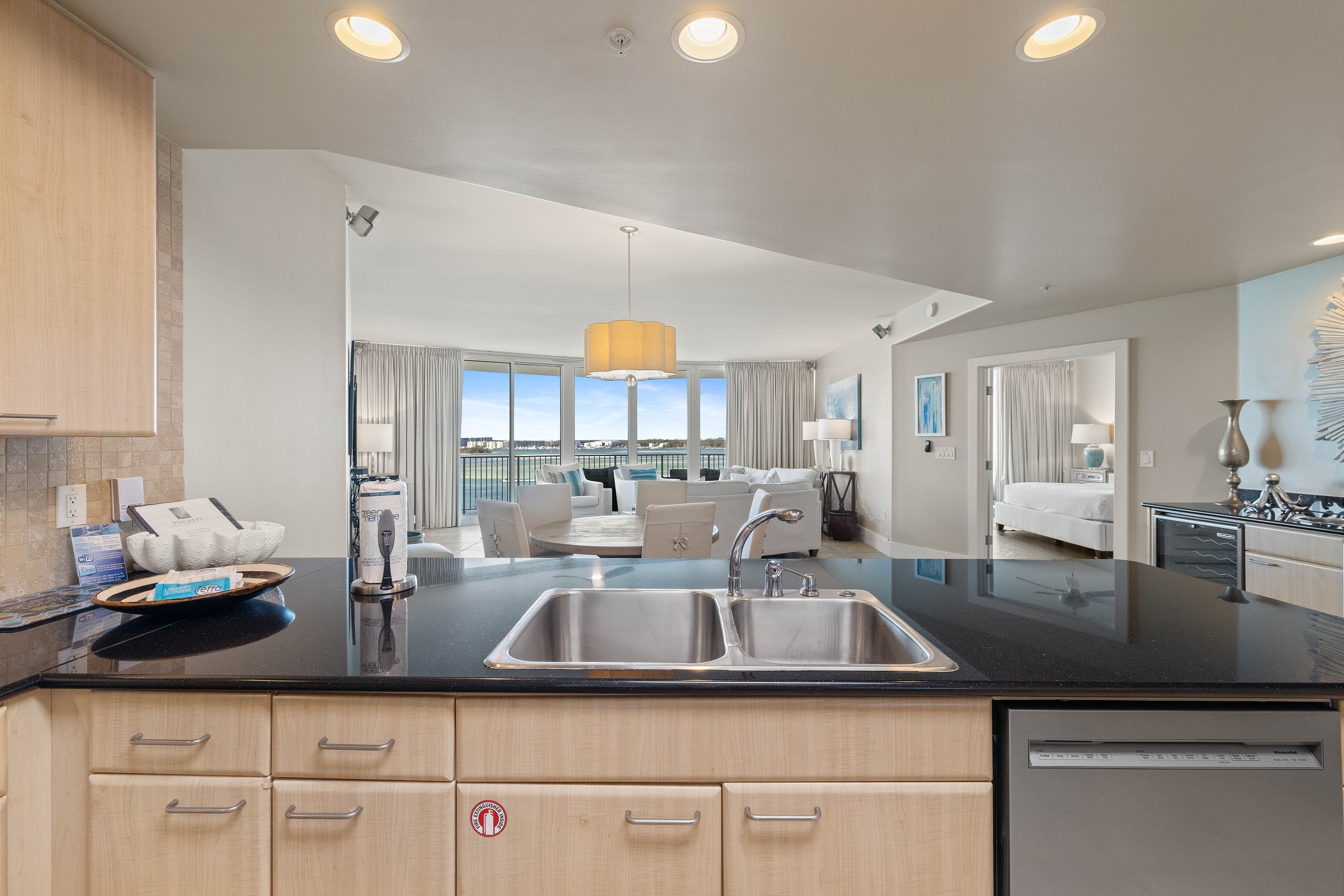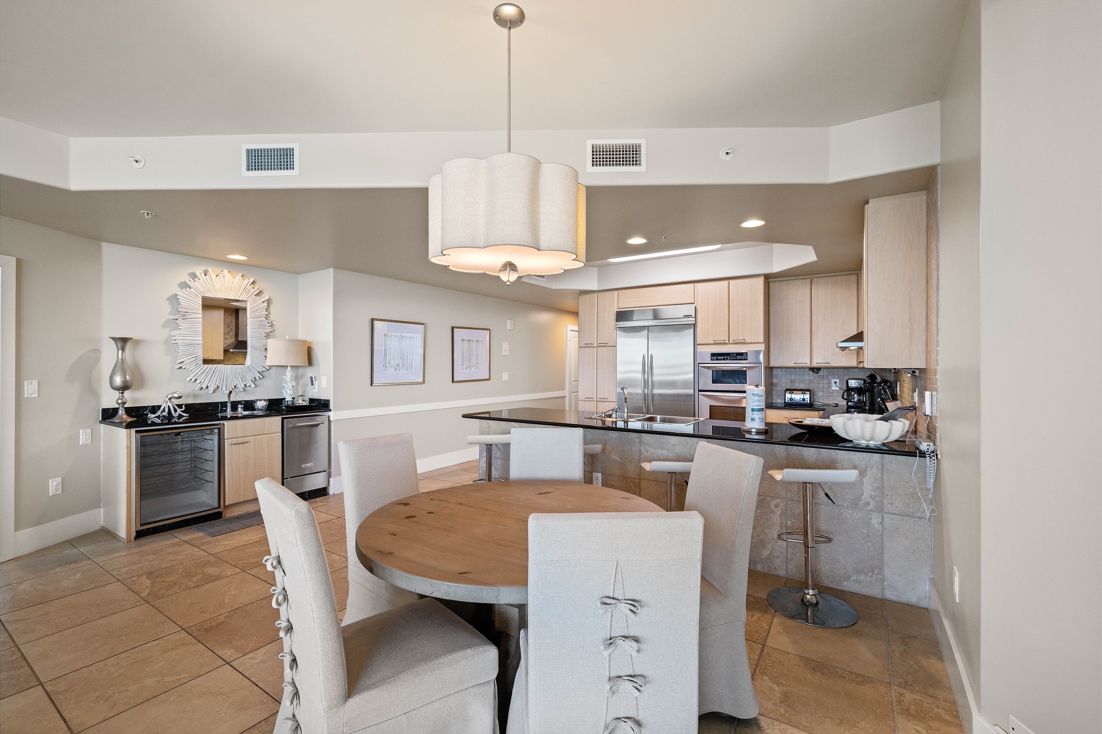 The fully equipped kitchen includes stainless steel appliances, a dining table, and a wet bar with a beverage cooler and ice maker, ideal for entertaining and gathering together.