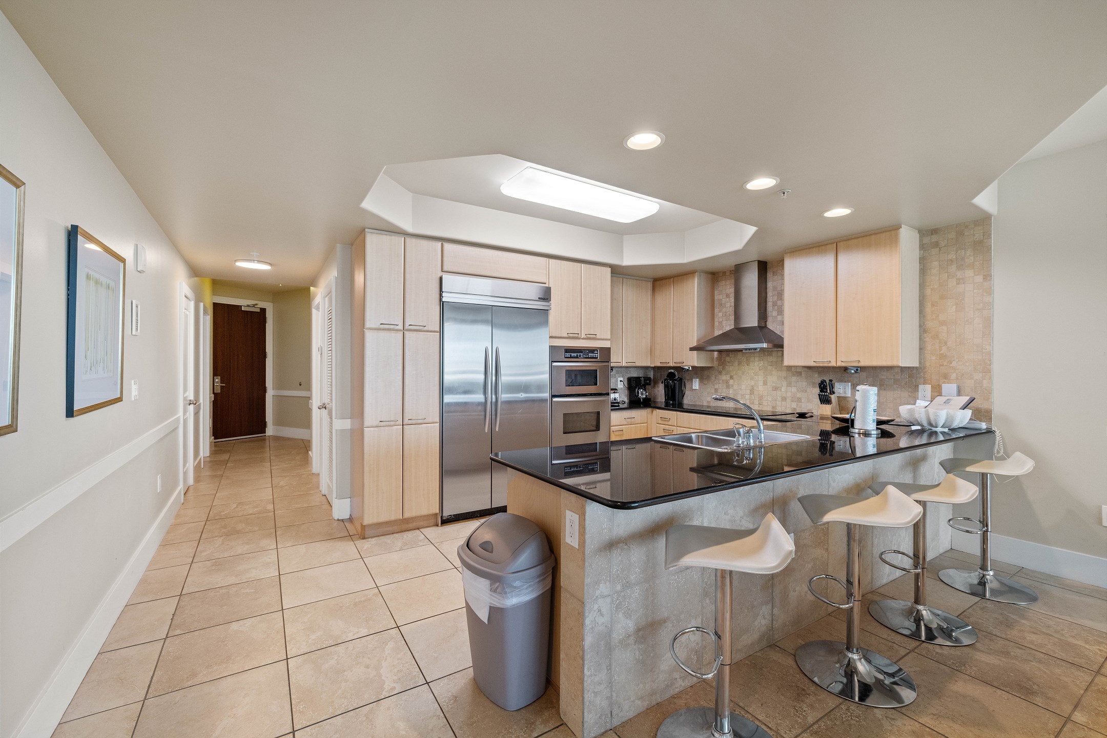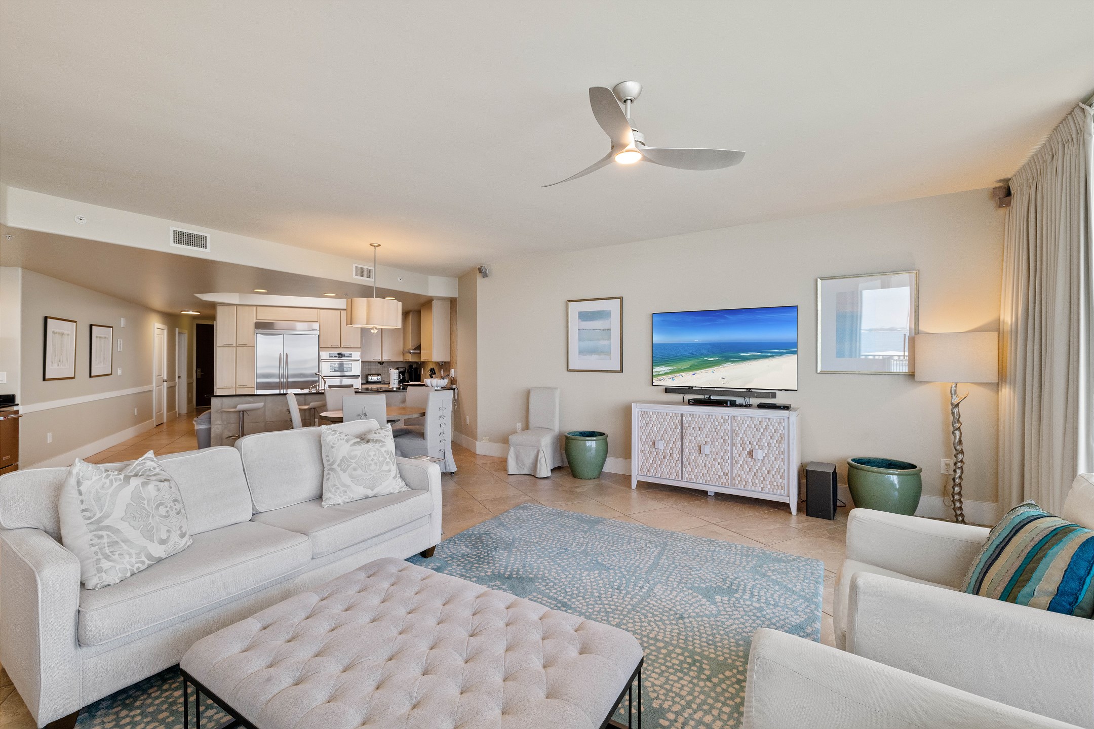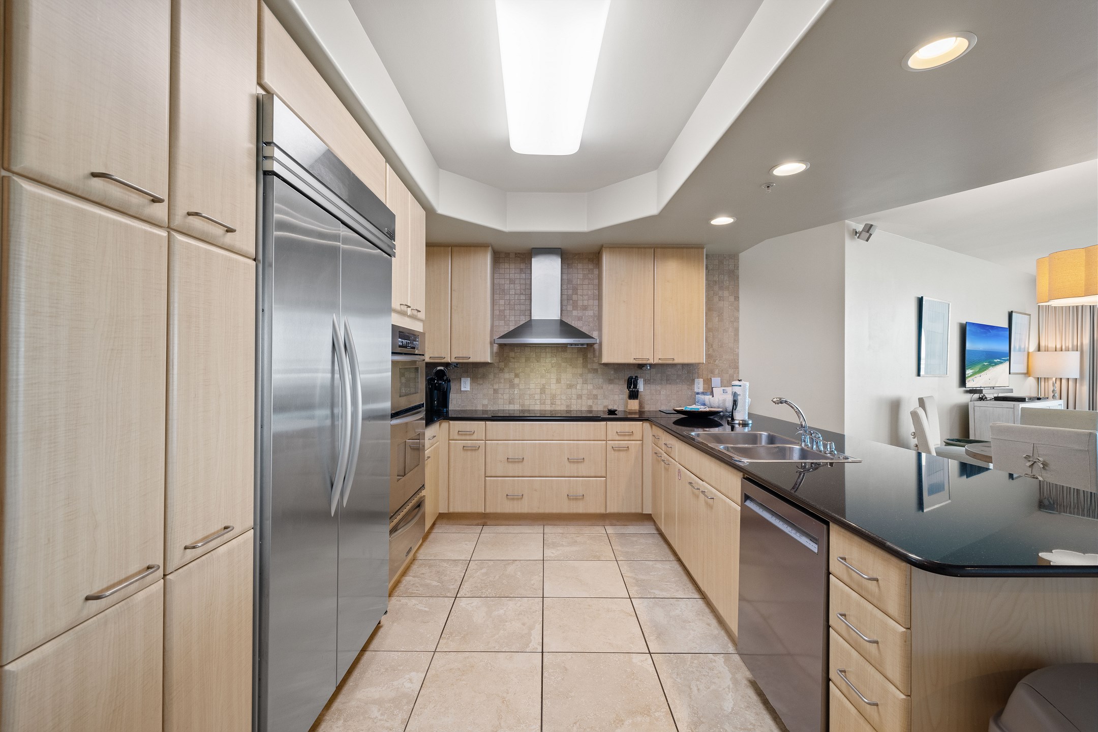 The fully equipped kitchen includes stainless steel appliances, a dining table, and a wet bar with a beverage cooler and ice maker, ideal for entertaining and gathering together.