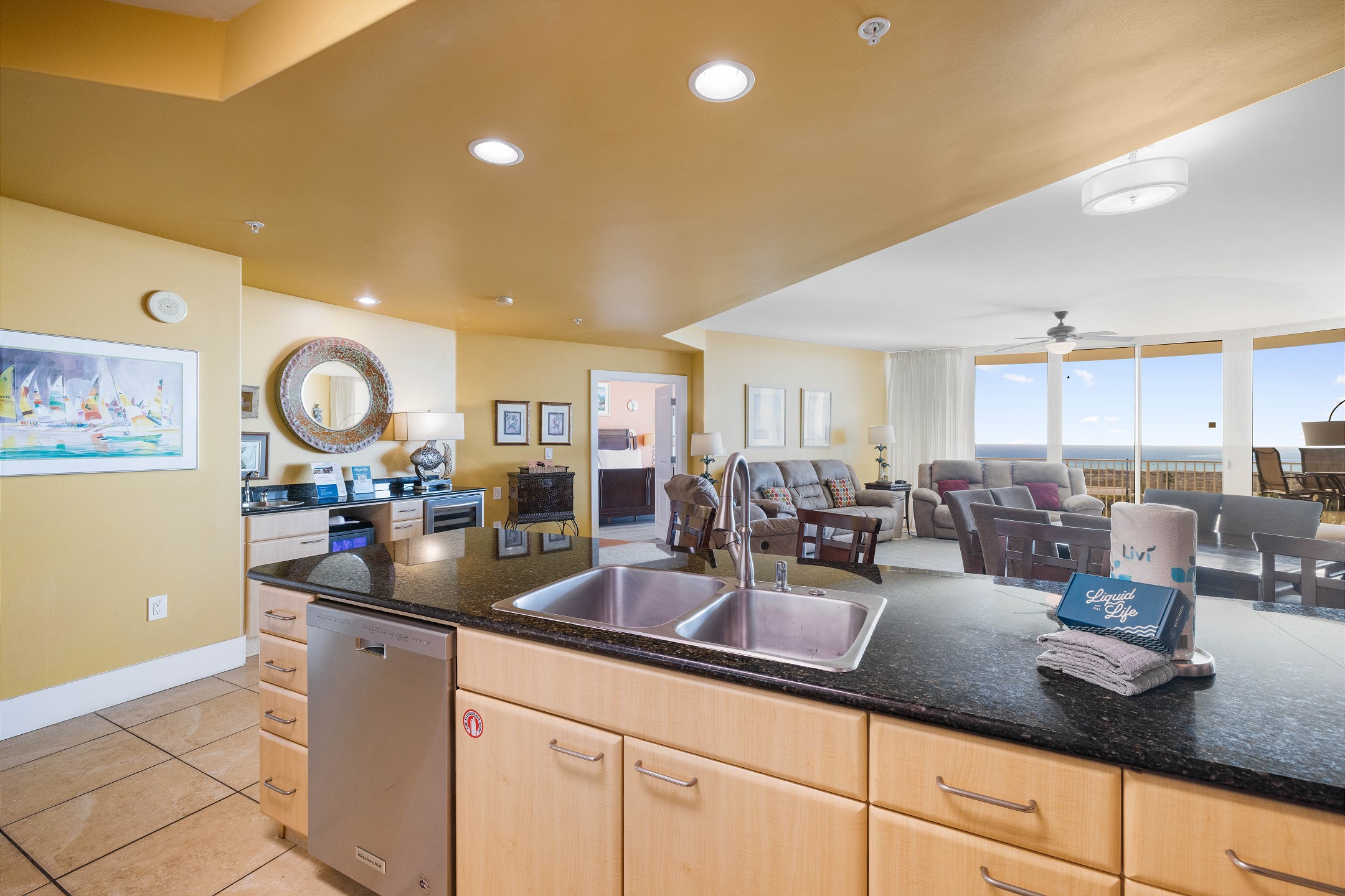 The fully equipped kitchen features stainless steel appliances, granite countertops, and an adjacent dining table. A wet bar with an ice maker and beverage cooler adds convenience for entertaining. The primary bedroom includes a king bed, floor-to-ceiling windows with balcony access, and a luxurious ensuite bathroom with a jacuzzi tub and walk-in shower. The second bedroom also offers a king bed and a private bathroom with a tiled shower and tub combo. The third bedroom has two full beds and its own ensuite bathroom.