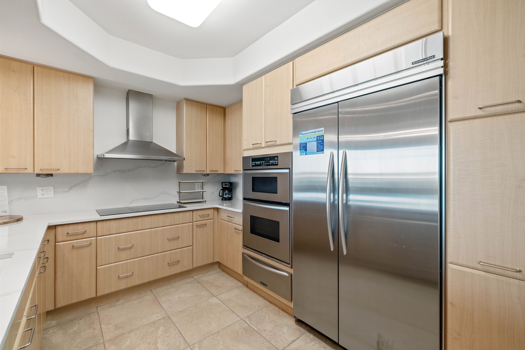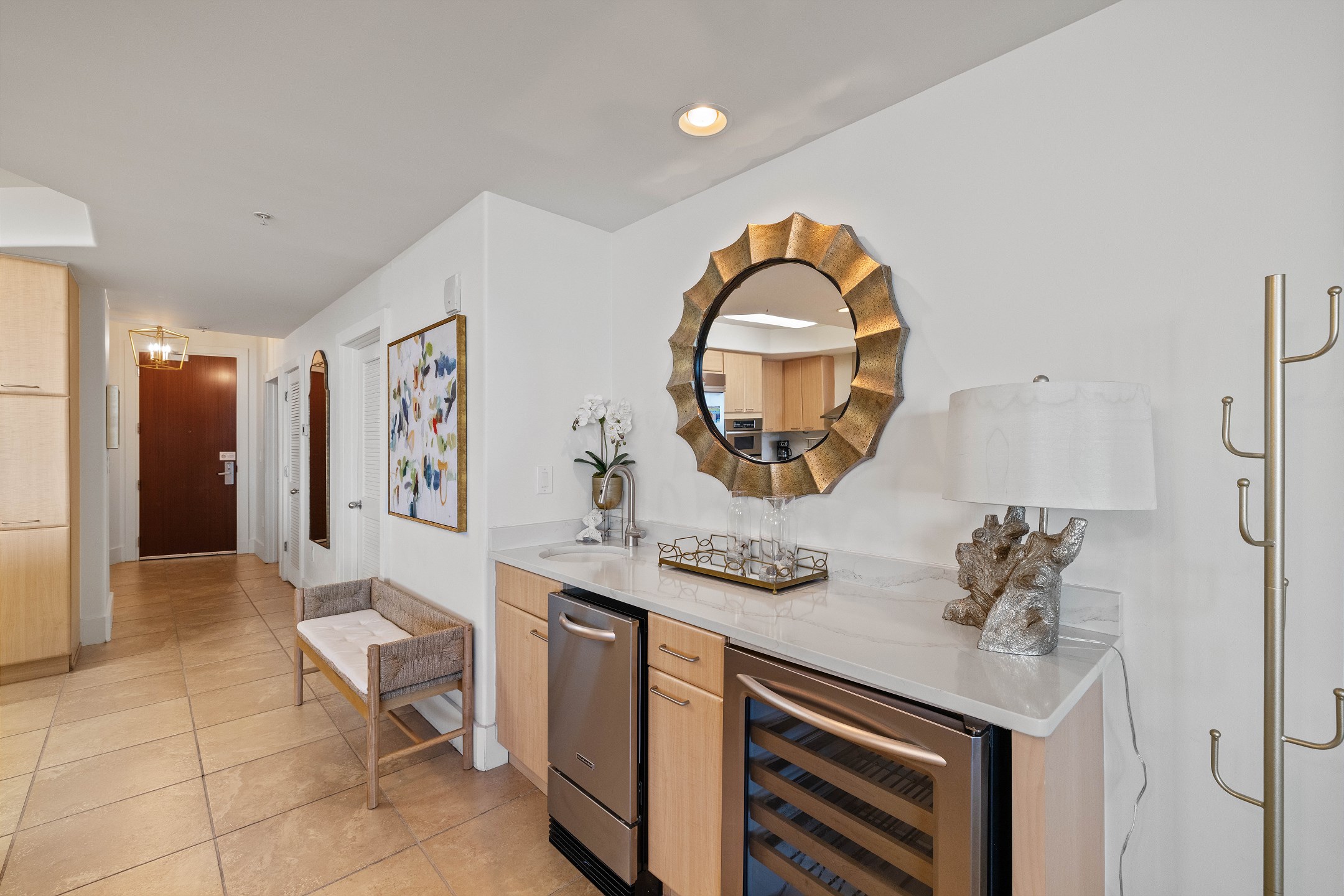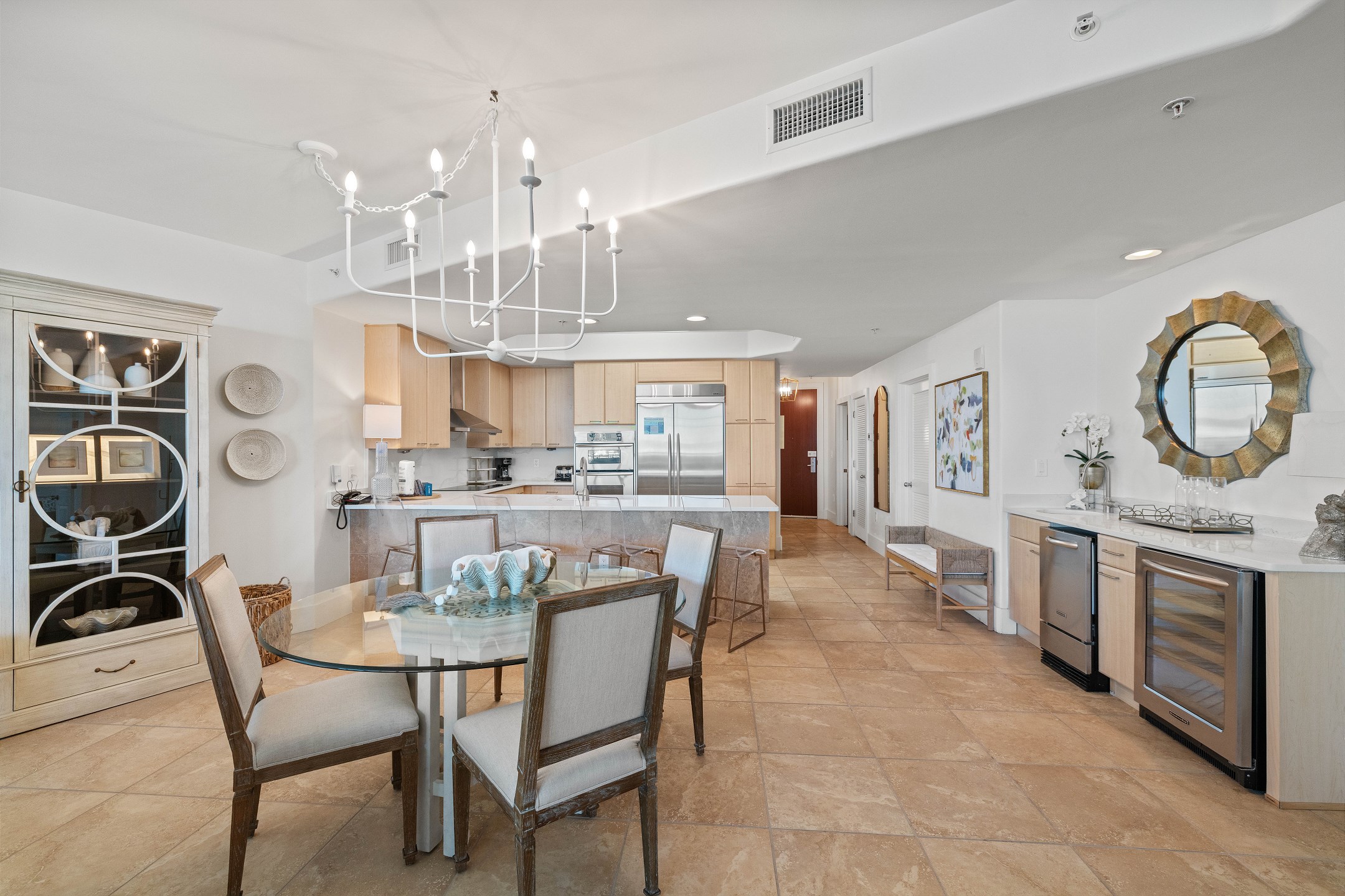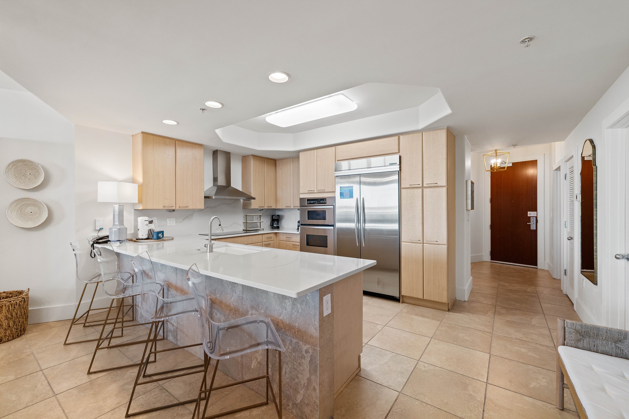 The condo also boasts a wet bar with an ice maker, complementing the fully equipped kitchen. Granite counters and stainless-steel Kitchen-Aid appliances, including a built-in double oven, make cooking and entertaining a delight.