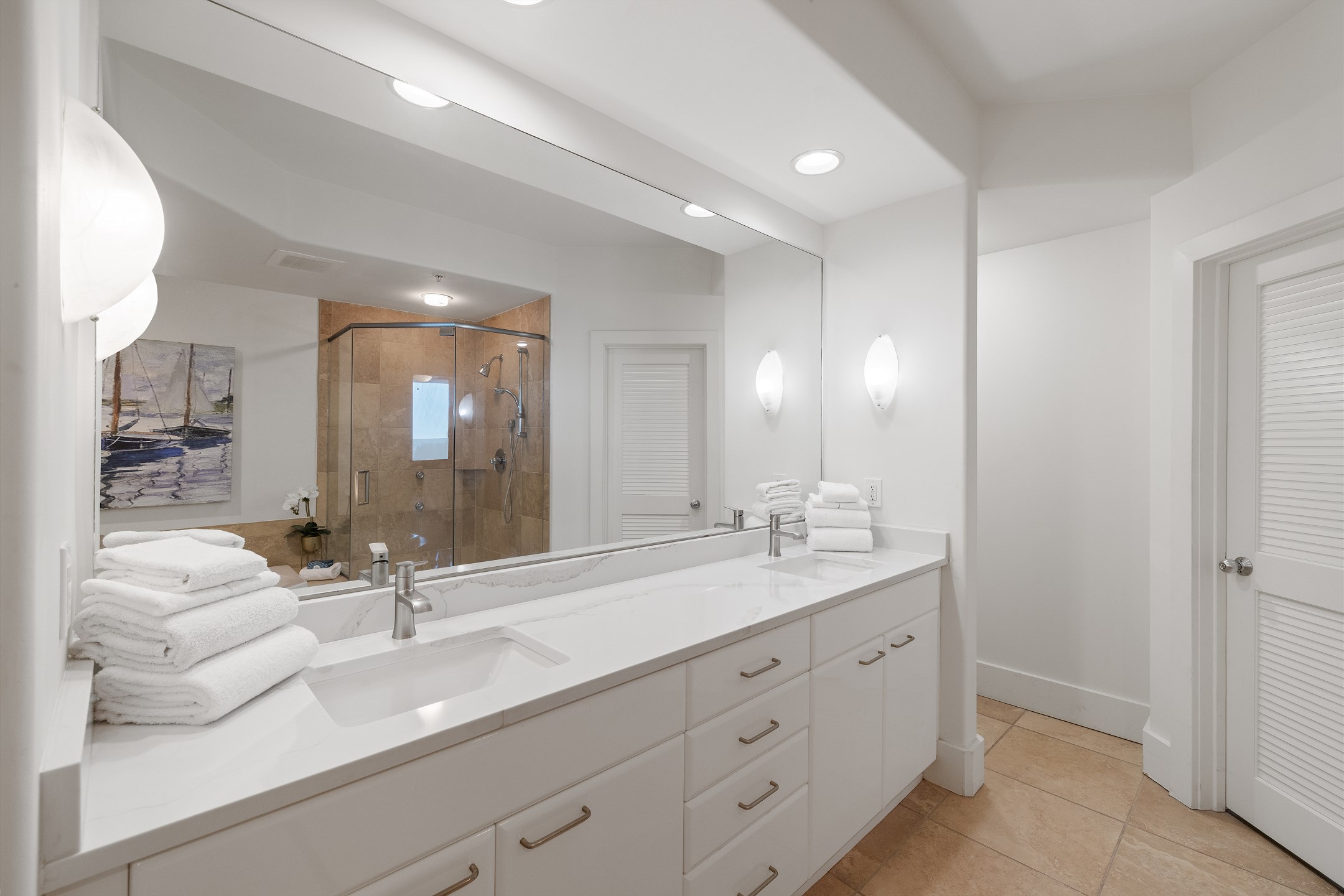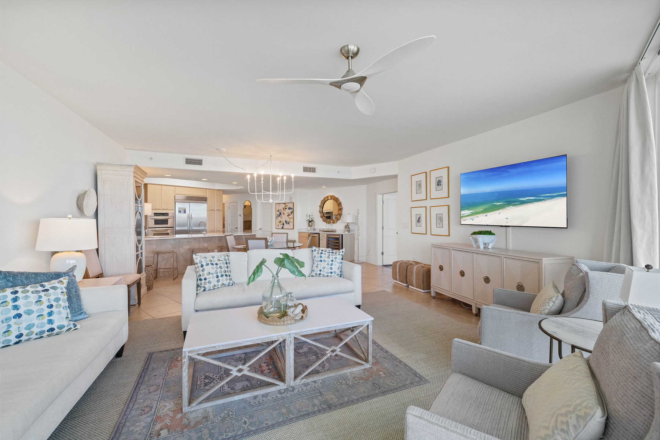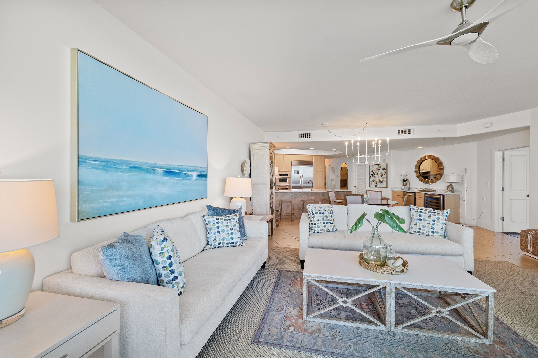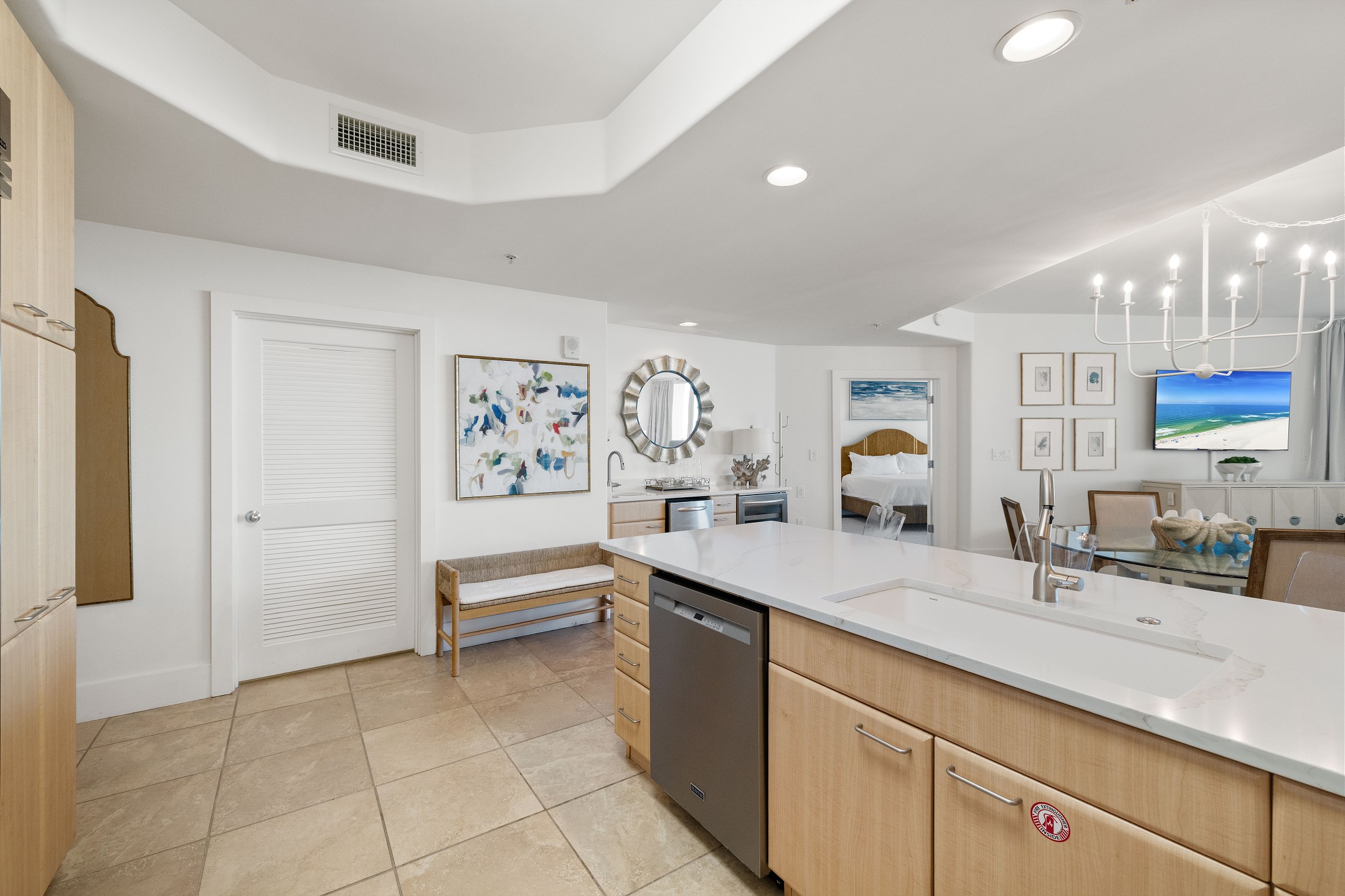 The condo also boasts a wet bar with an ice maker, complementing the fully equipped kitchen. Granite counters and stainless-steel Kitchen-Aid appliances, including a built-in double oven, make cooking and entertaining a delight.