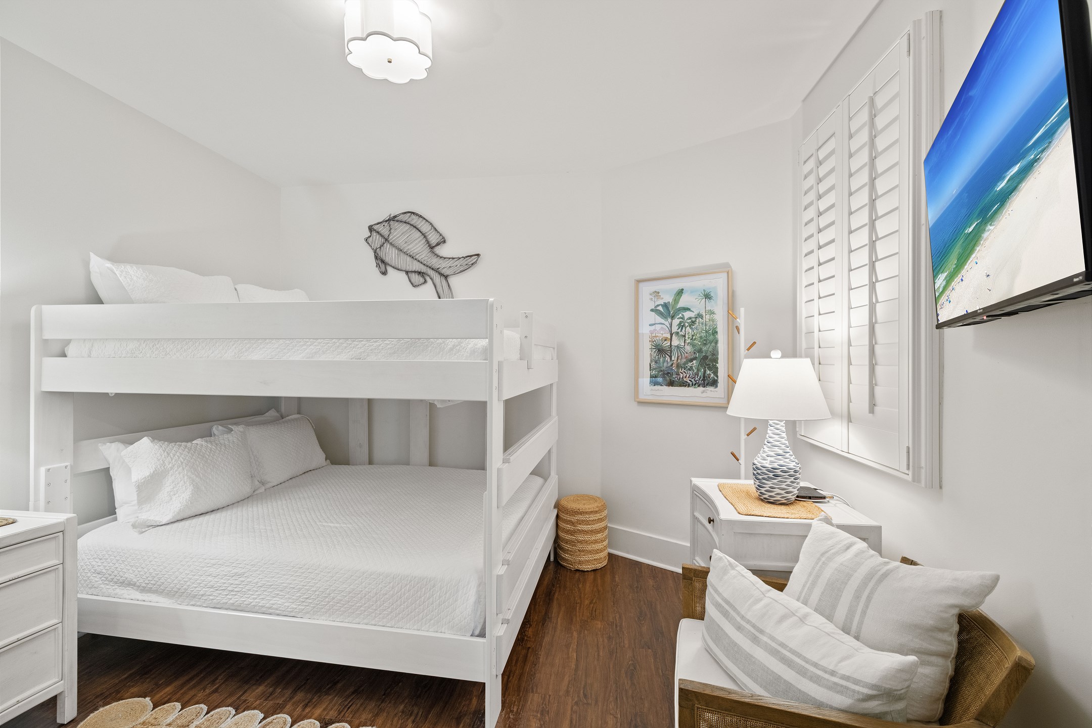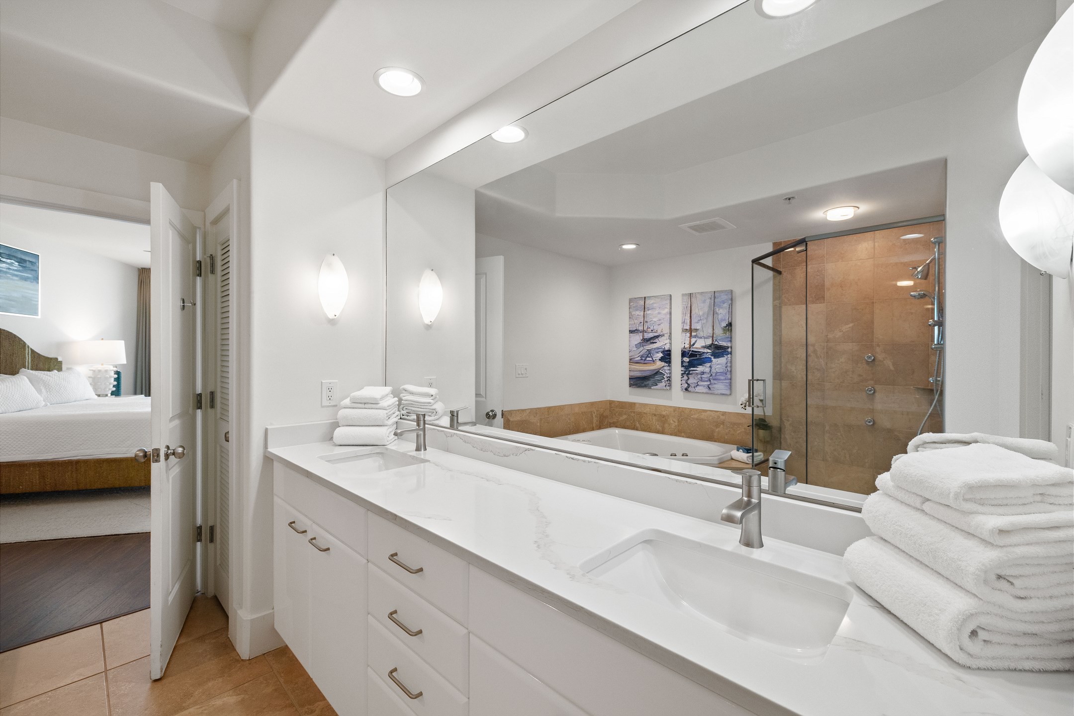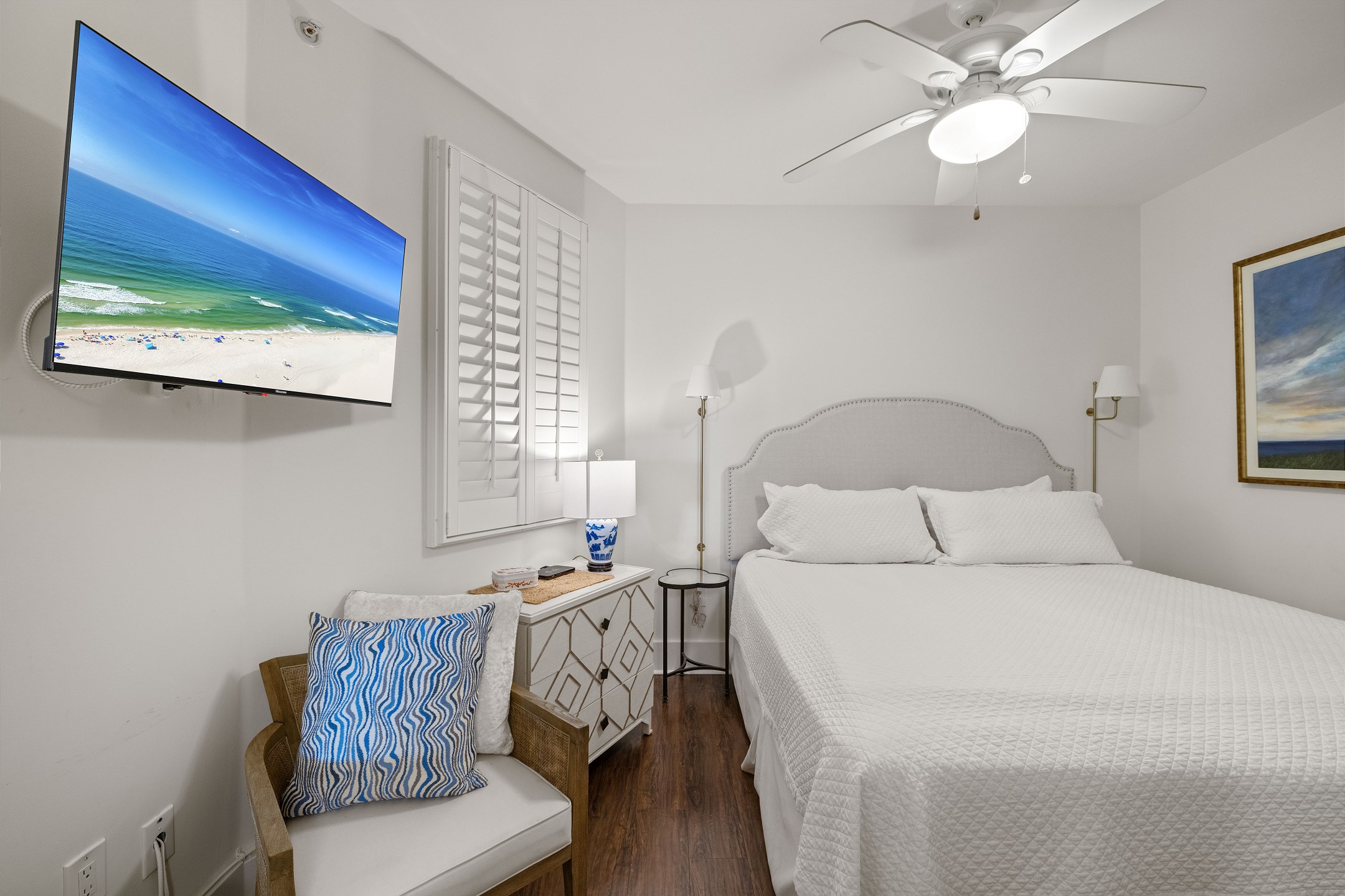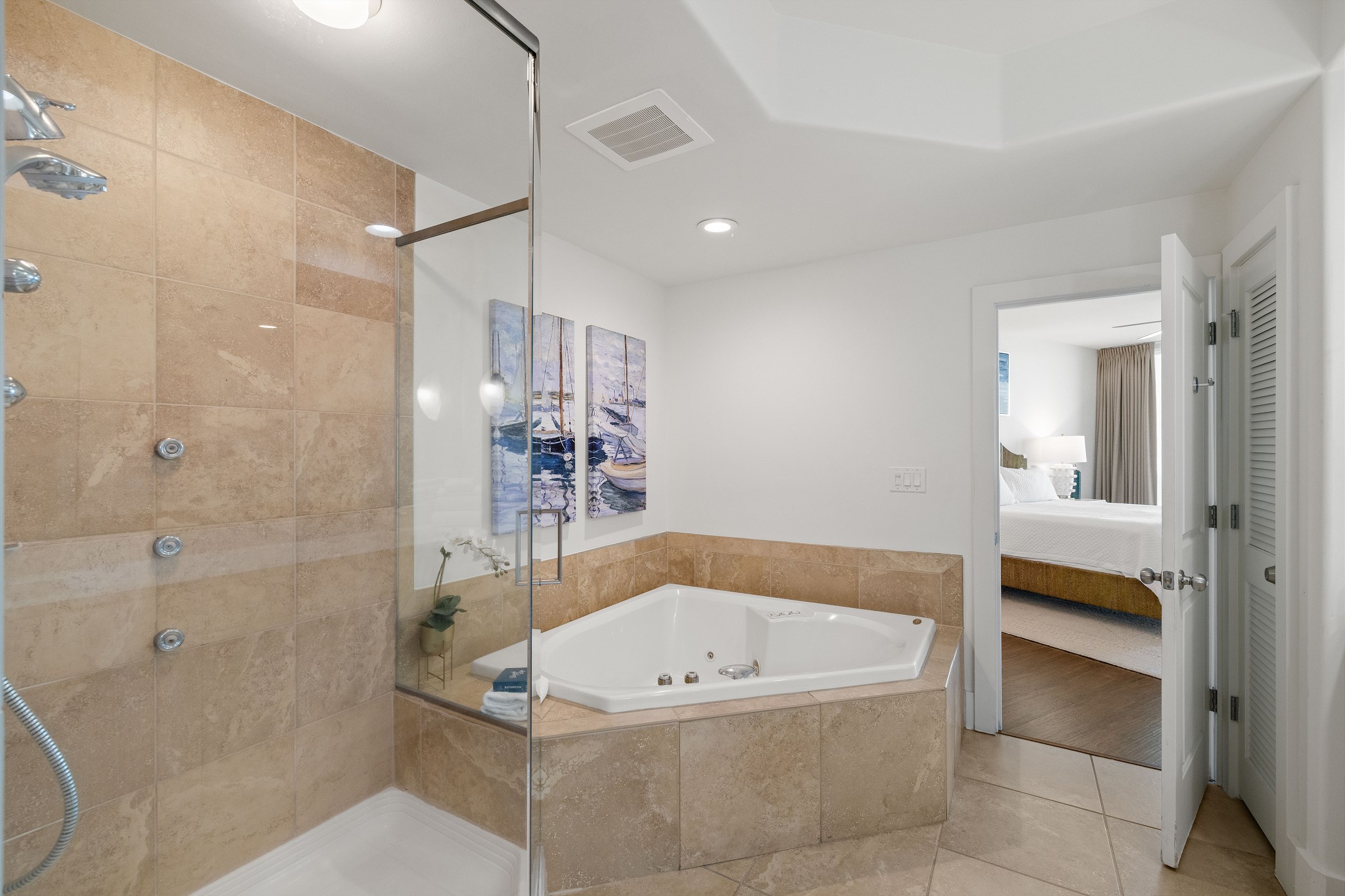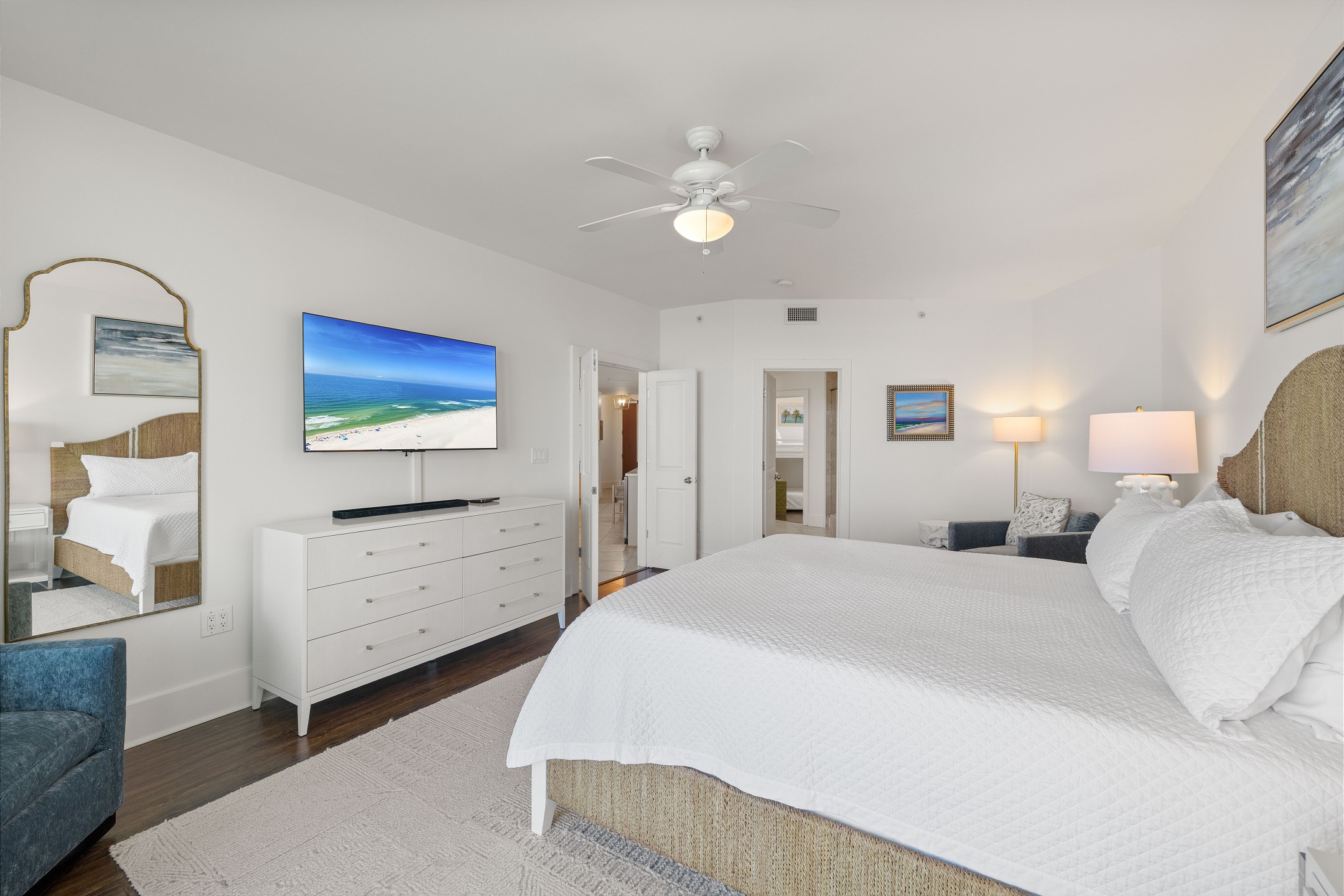 The Primary suite is a haven of luxury, featuring a King bed, a flatscreen TV, and direct balcony access. The suite's private bath includes a Jacuzzi tub, walk-in shower, and a large walk-in closet, adding an extra touch of comfort to your stay. The second bedroom offers a King bed, a flatscreen TV, and easy access to the hall bath with a walk-in shower. The third bedroom, ideal for accommodating additional guests or children, features a Queen bed, a full-size bed, and a flat-screen TV. With accommodations for up to 8 people, this unit is ideal for family vacations or group getaways.