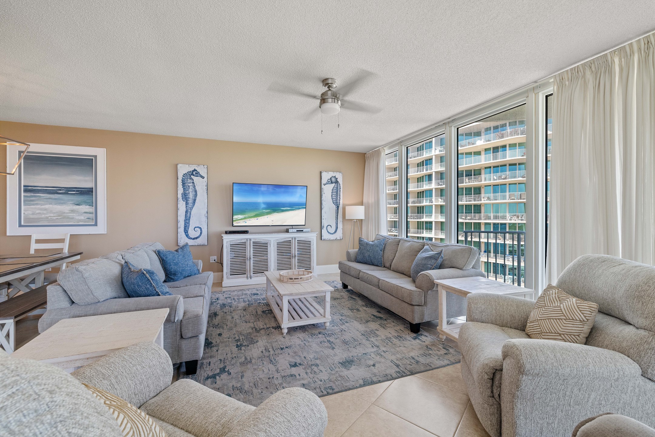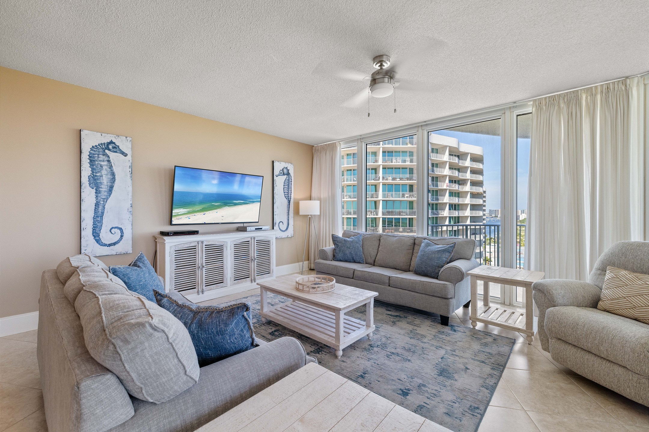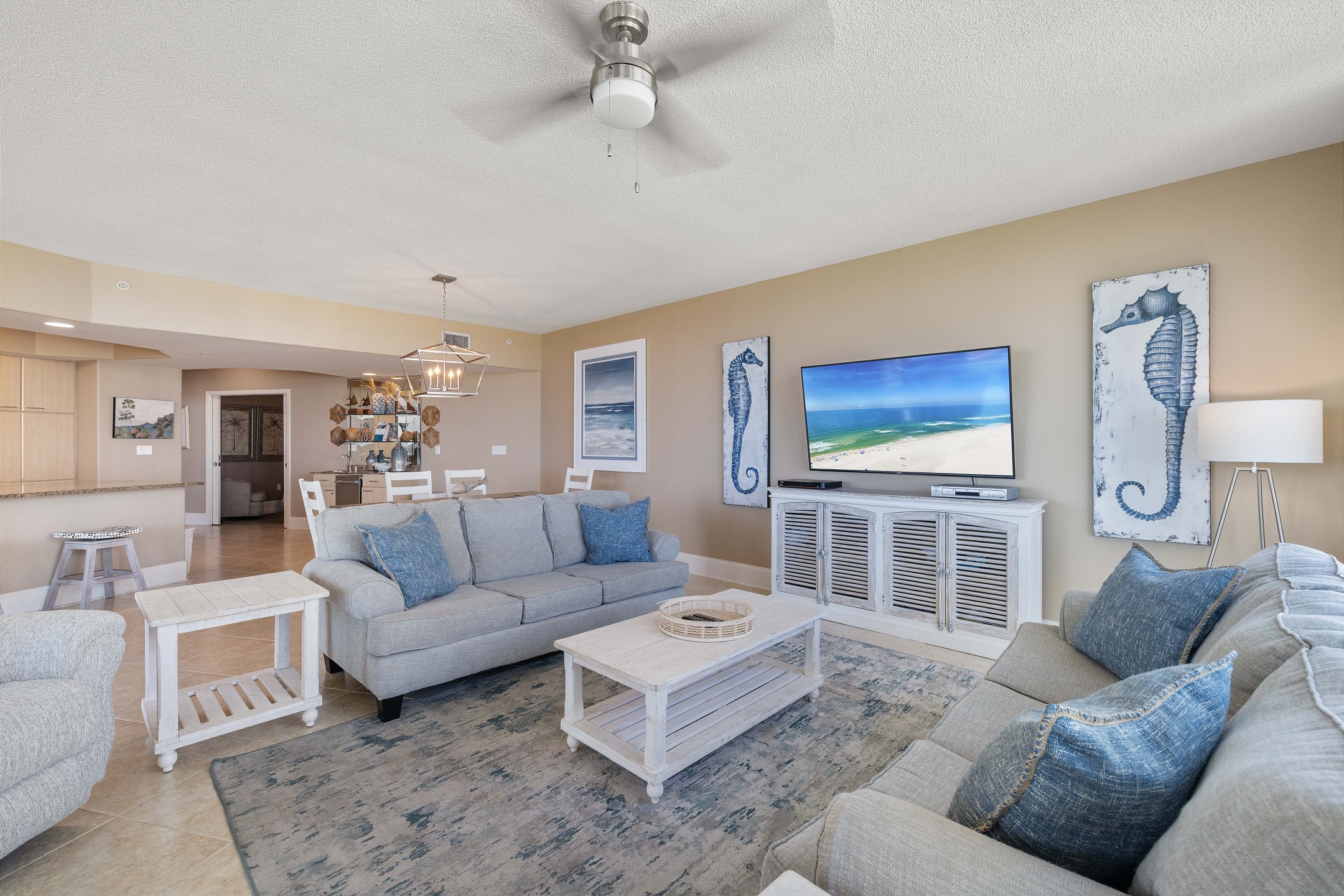 The condo's centerpiece is its expansive wrap-around balcony and floor-to-ceiling windows, perfect for soaking in the picturesque landscape. The Primary suite is a haven of relaxation with a King bed, a flat-screen TV, balcony access, and a private bath featuring a jacuzzi tub, a walk-in shower, and a spacious walk-in closet. The second bedroom is equally comfortable with a King bed and a flat-screen TV. The third bedroom, ideal for younger guests or additional family members, includes a Twin-over-Full bunk and a flat-screen TV, while the fourth bedroom offers two cozy Twin beds and a flat-screen TV. Additional accommodation is provided by two sofa sleepers in the living room, allowing up to 12 people to enjoy this beautiful space comfortably.