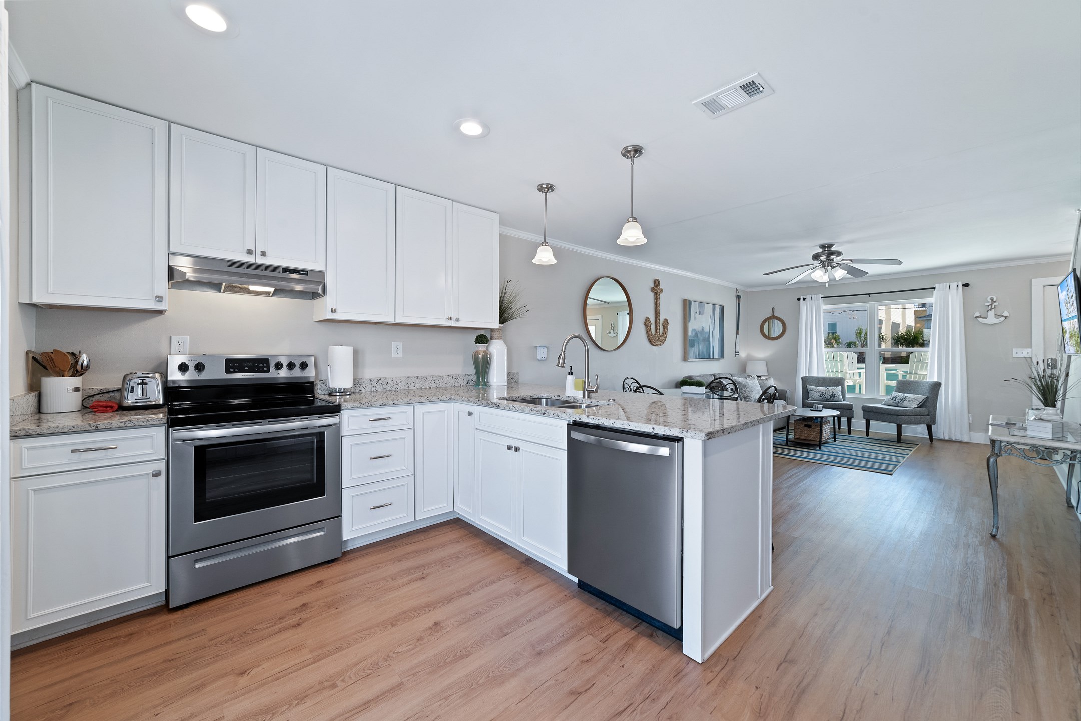Each side of the duplex features an open living room with a sofa sleeper and a fully equipped kitchen with stainless steel appliances, granite countertops, and a dining table. The layout makes it easy to cook, dine, and relax together.