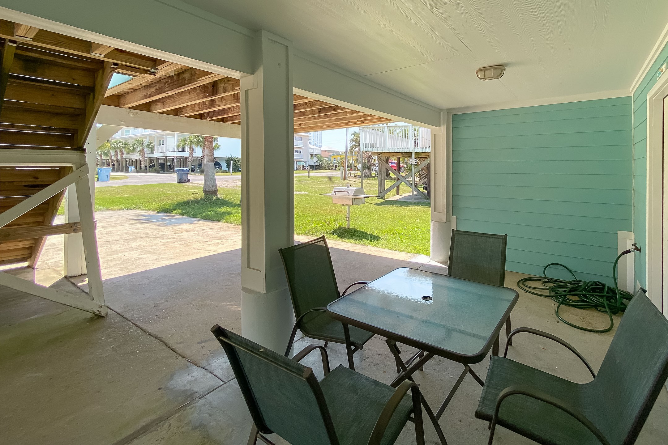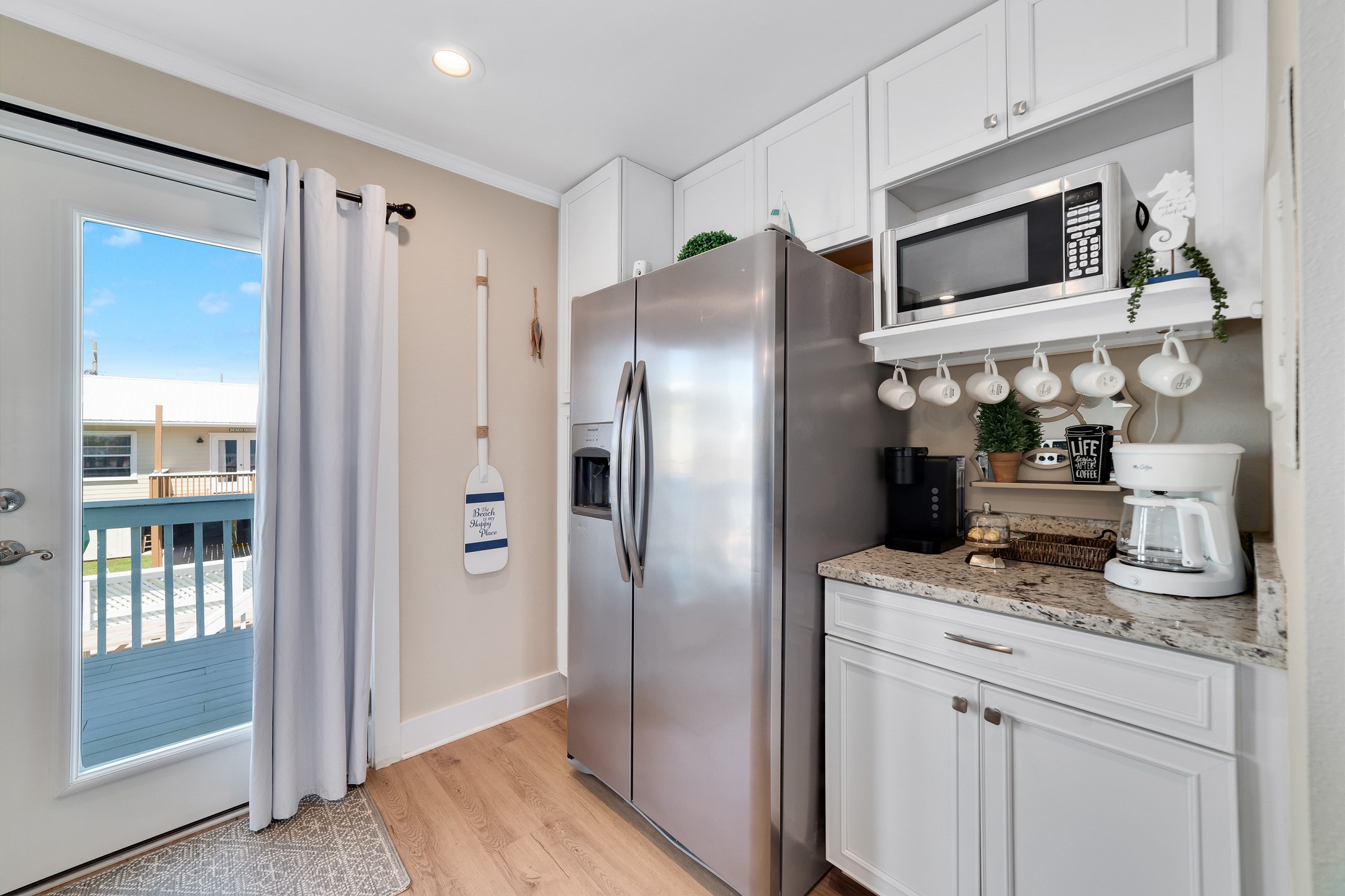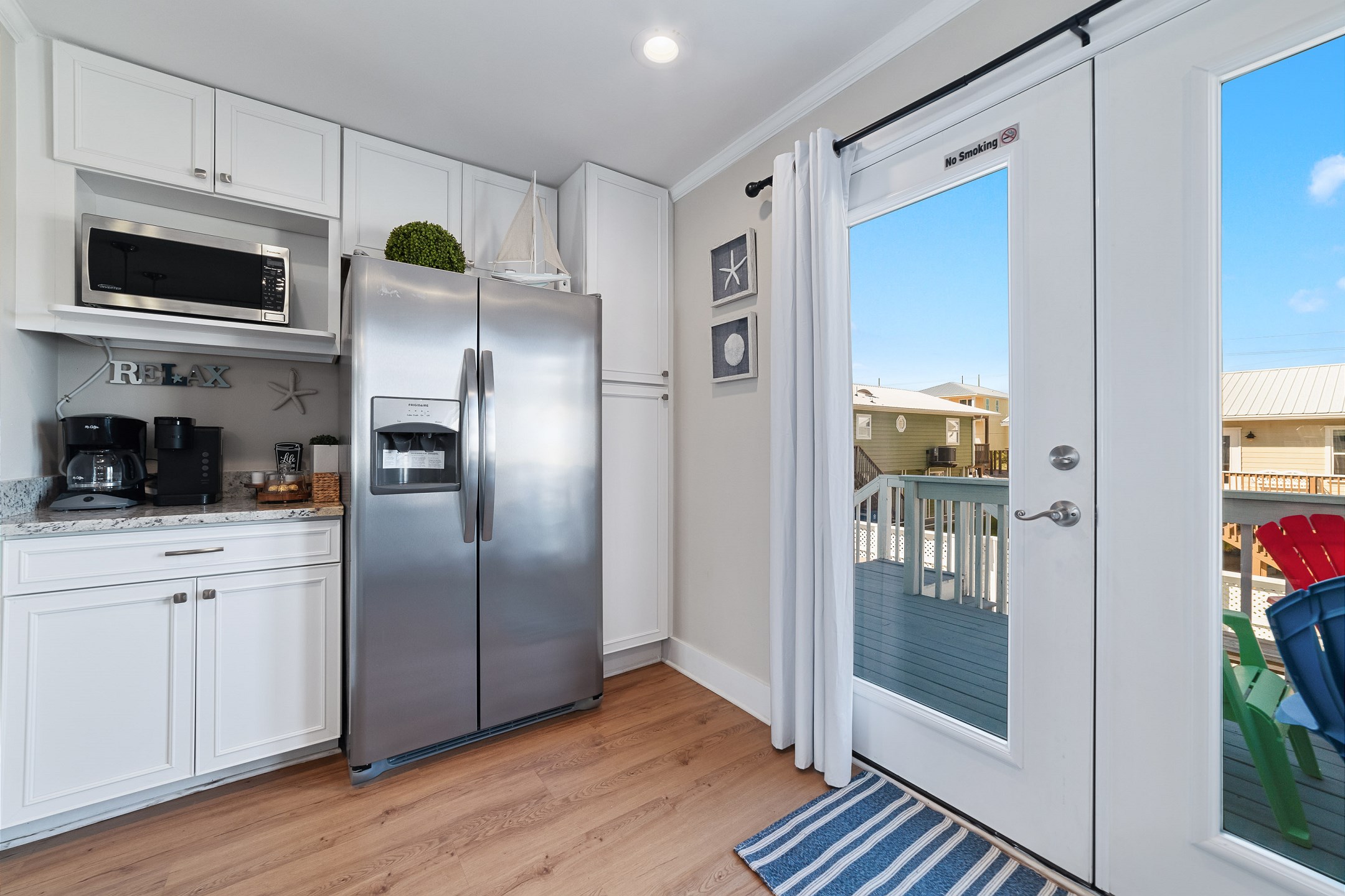 Outside, both sides come together on a large shared deck with outdoor seating, perfect for enjoying the fresh coastal breeze. Each unit also includes a private washer and dryer for added convenience.