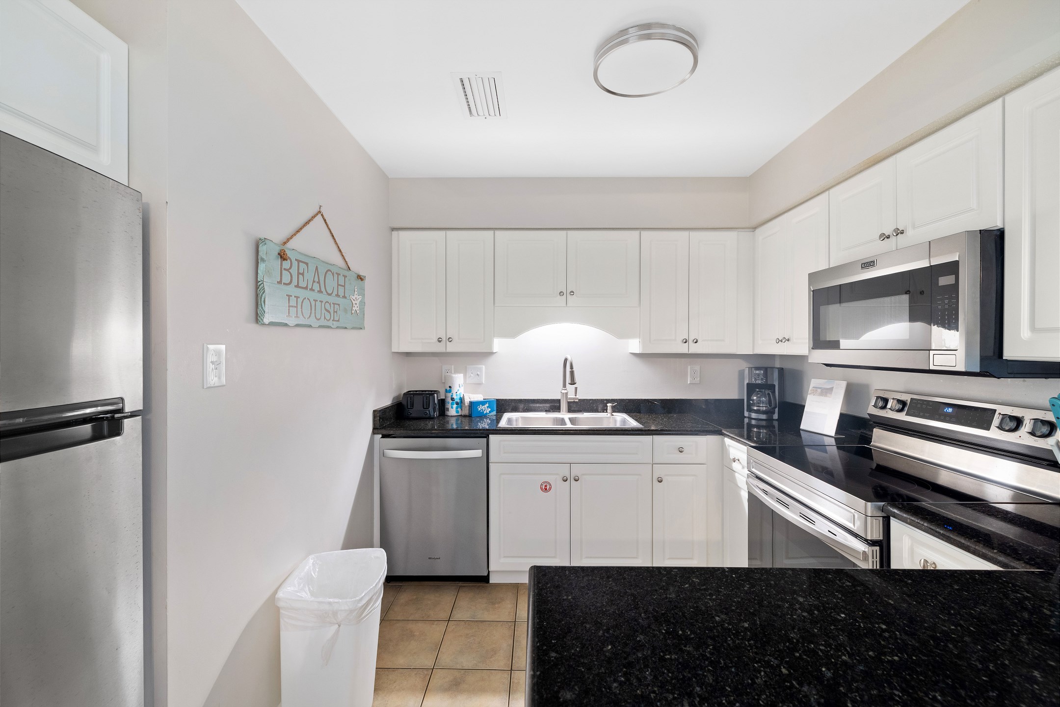 The living room features comfortable seating, a flat screen TV, and direct access to a private balcony, creating a great space to unwind after a day at the beach. The fully equipped kitchen includes granite countertops, stainless steel appliances, and a large dining table, making it easy to prepare and enjoy meals together.