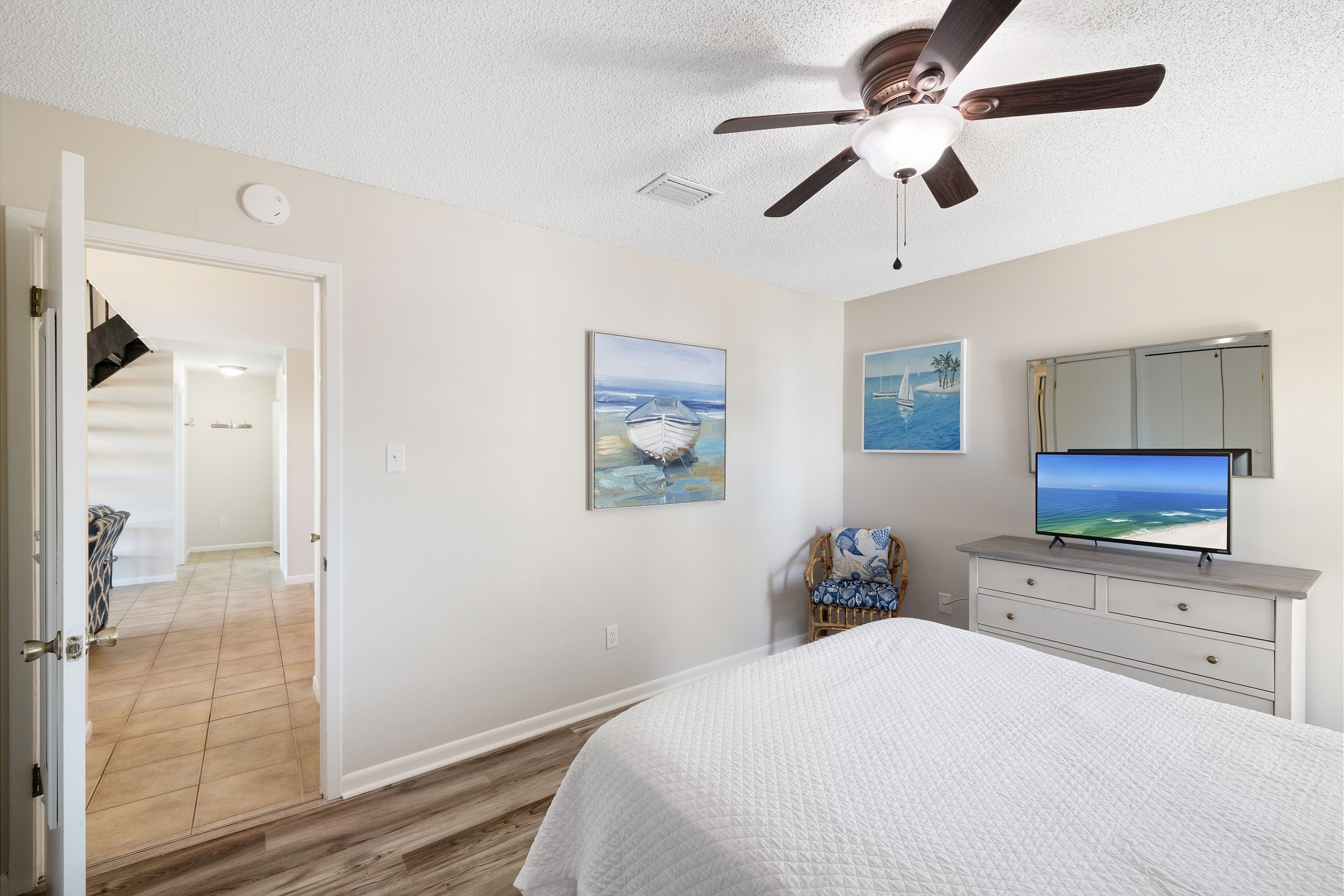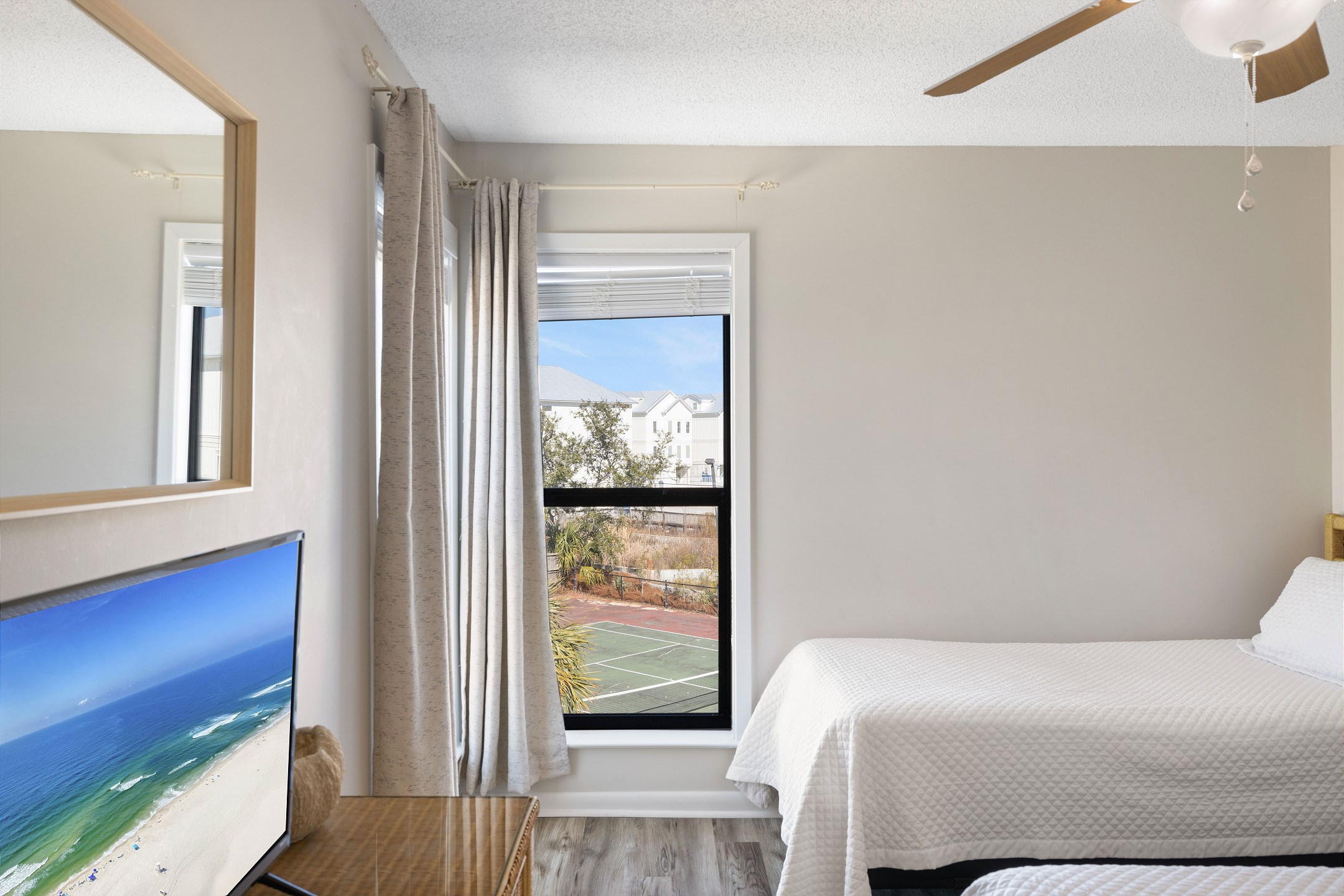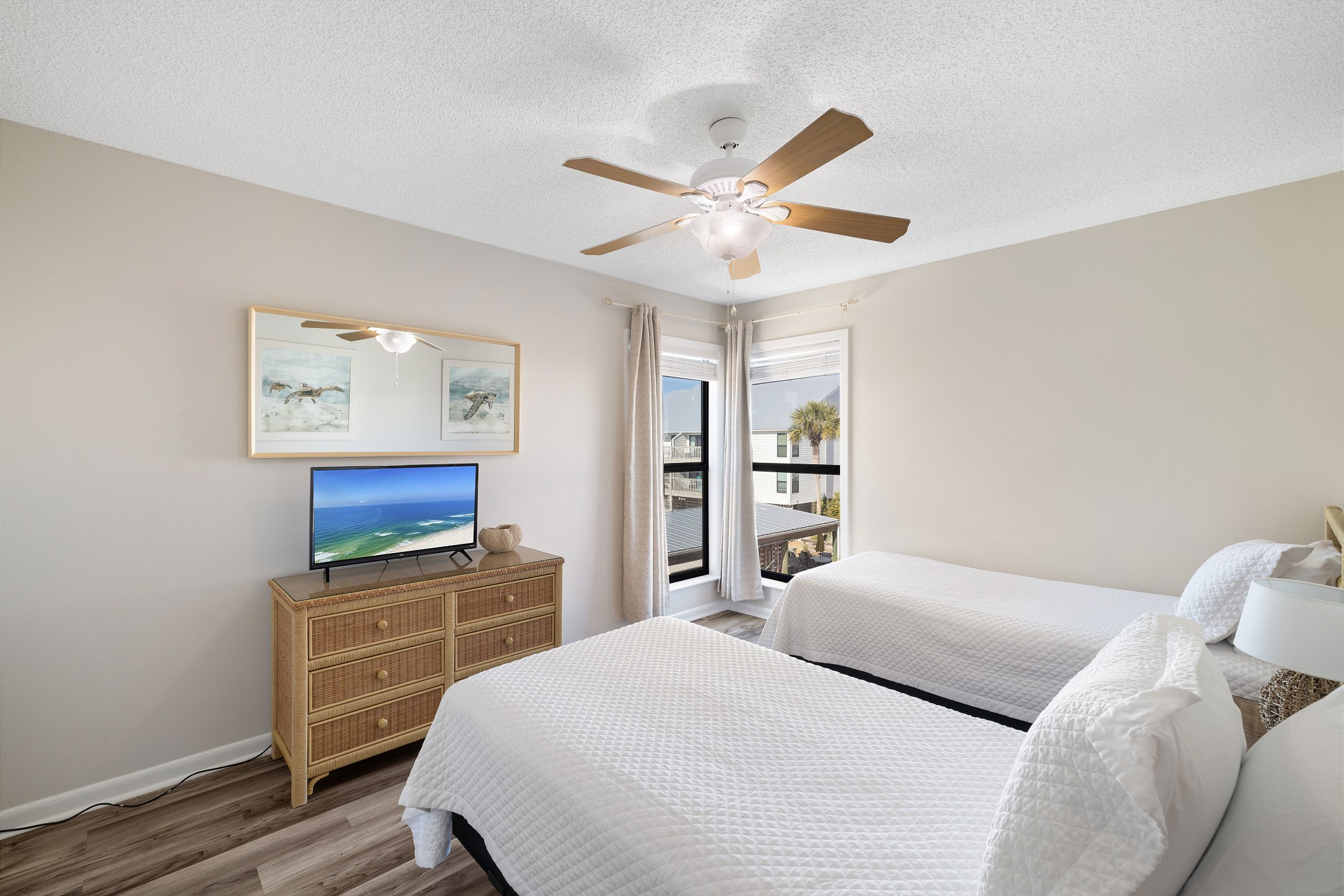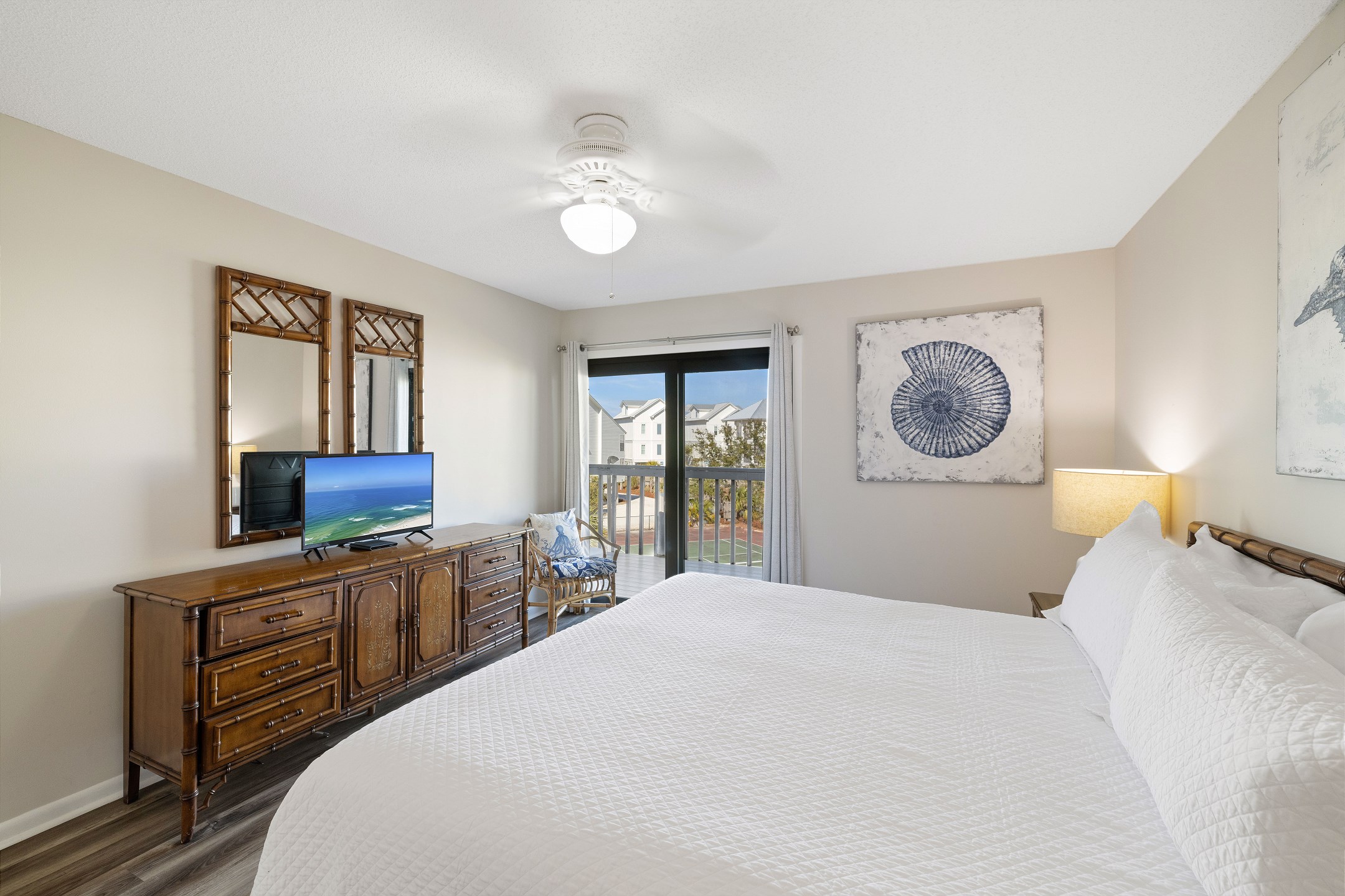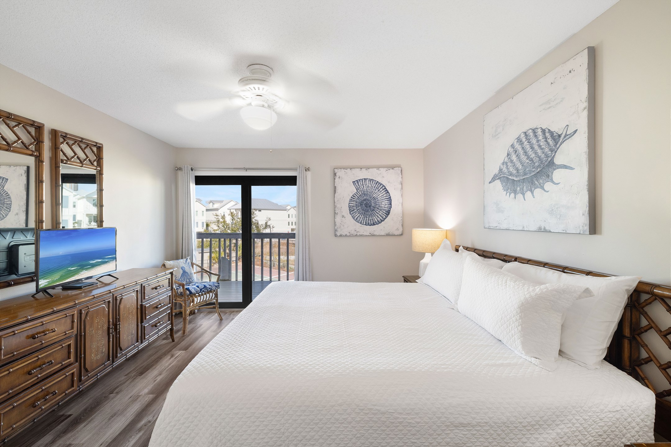 The primary bedroom offers a king bed, balcony access, a flat screen TV, and a private ensuite bathroom with a shower and tub combination. The first guest bedroom features a queen bed, while the second guest bedroom includes two twin beds. These guest rooms share a full hallway bathroom with a shower and tub combination.