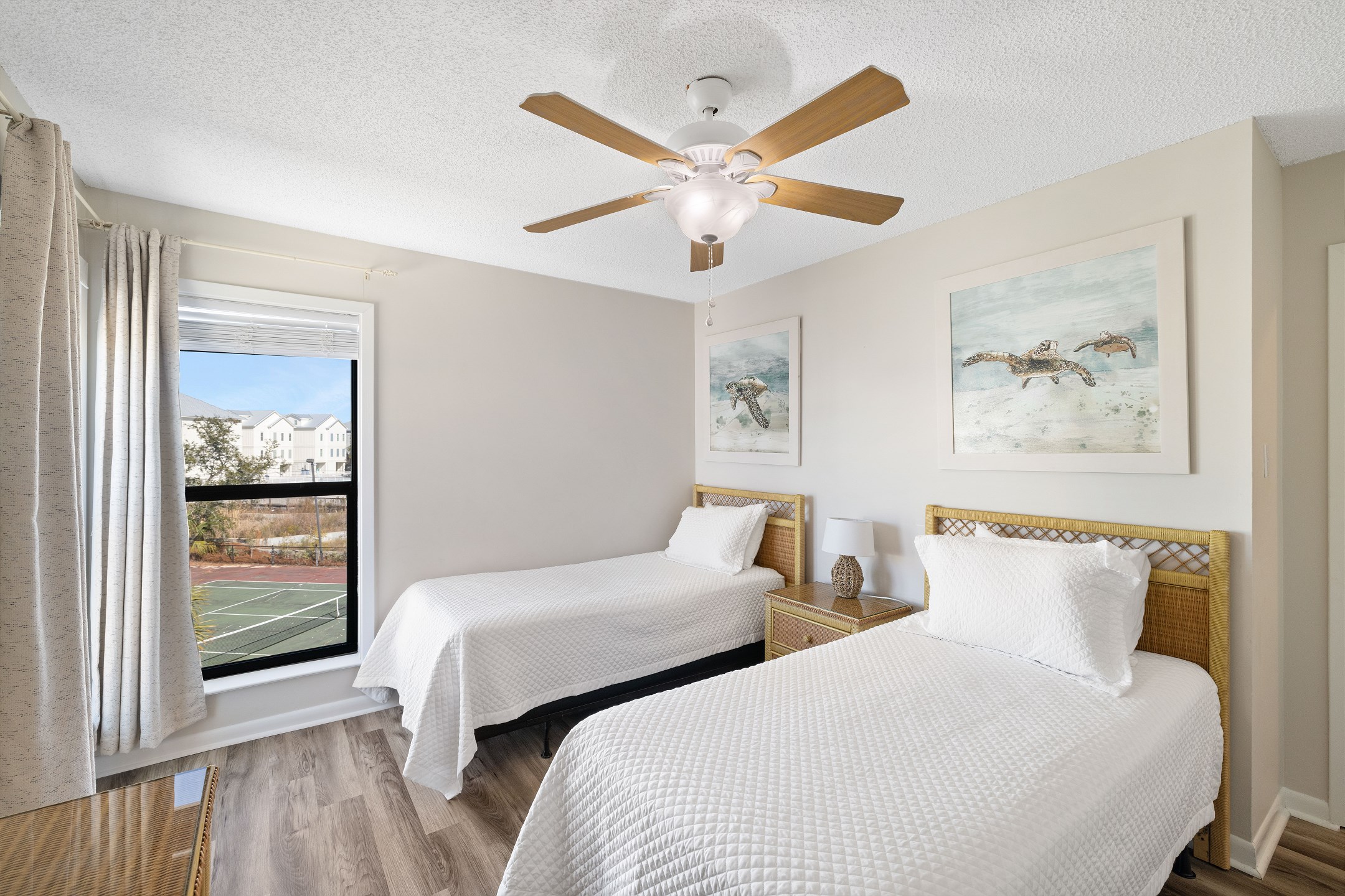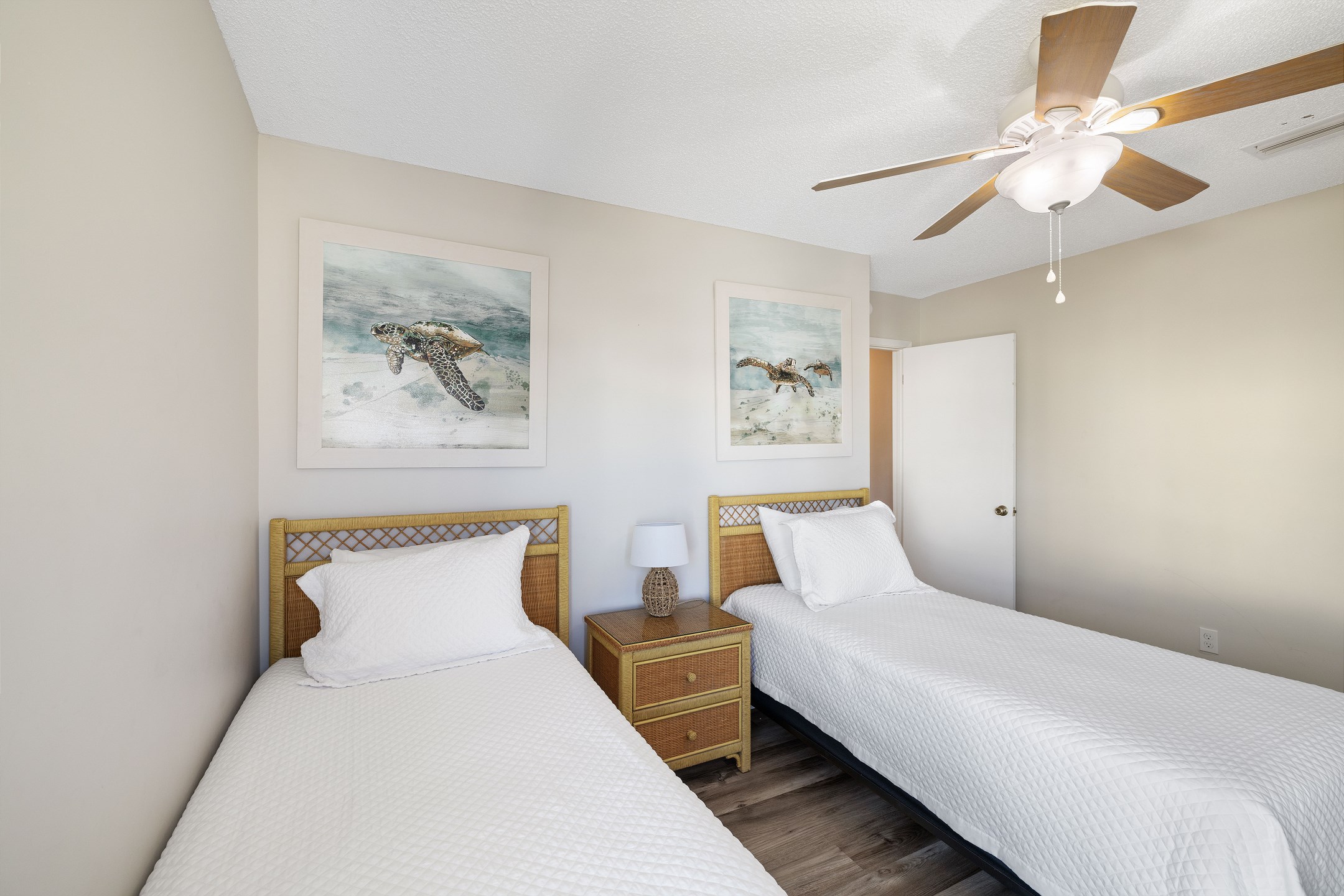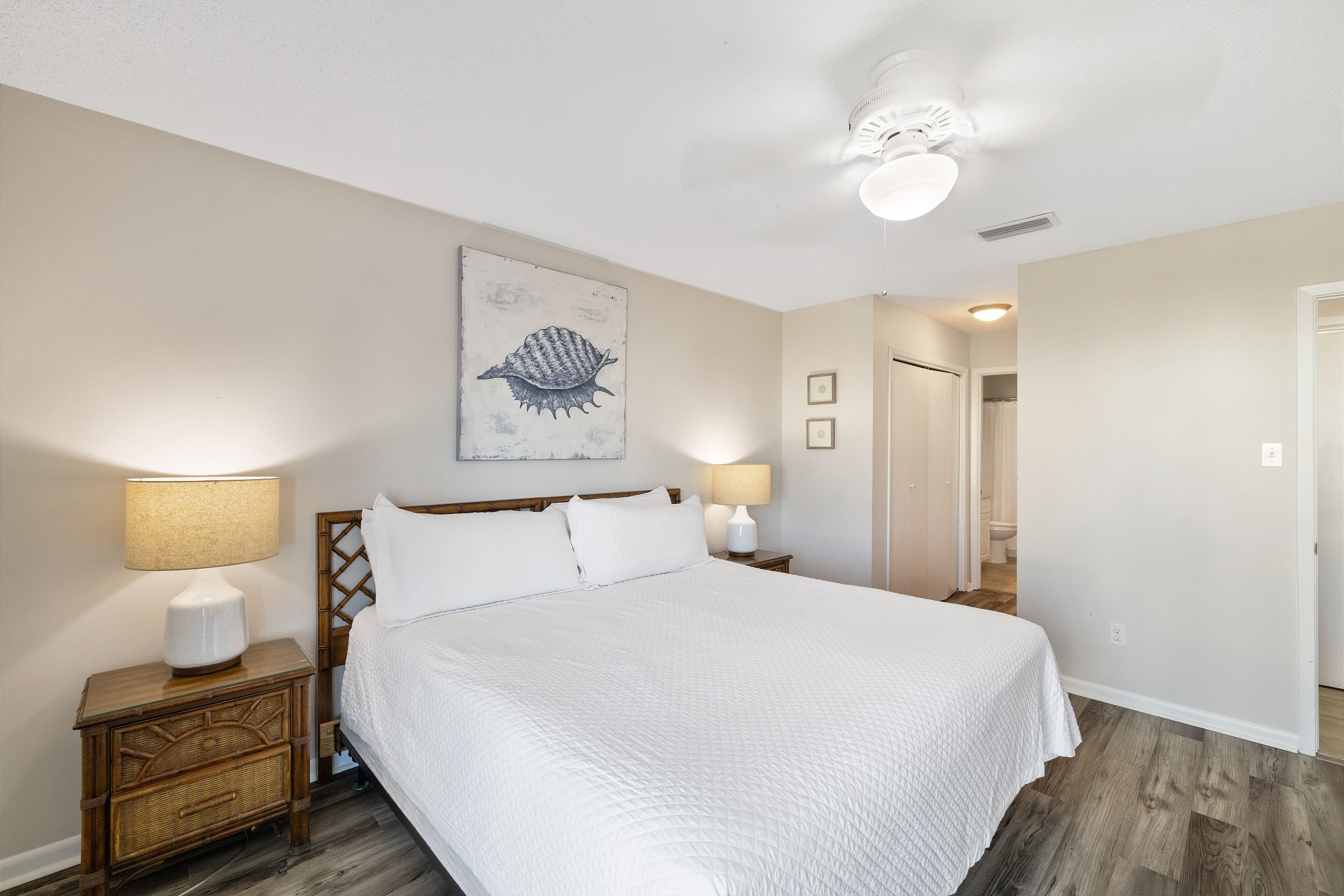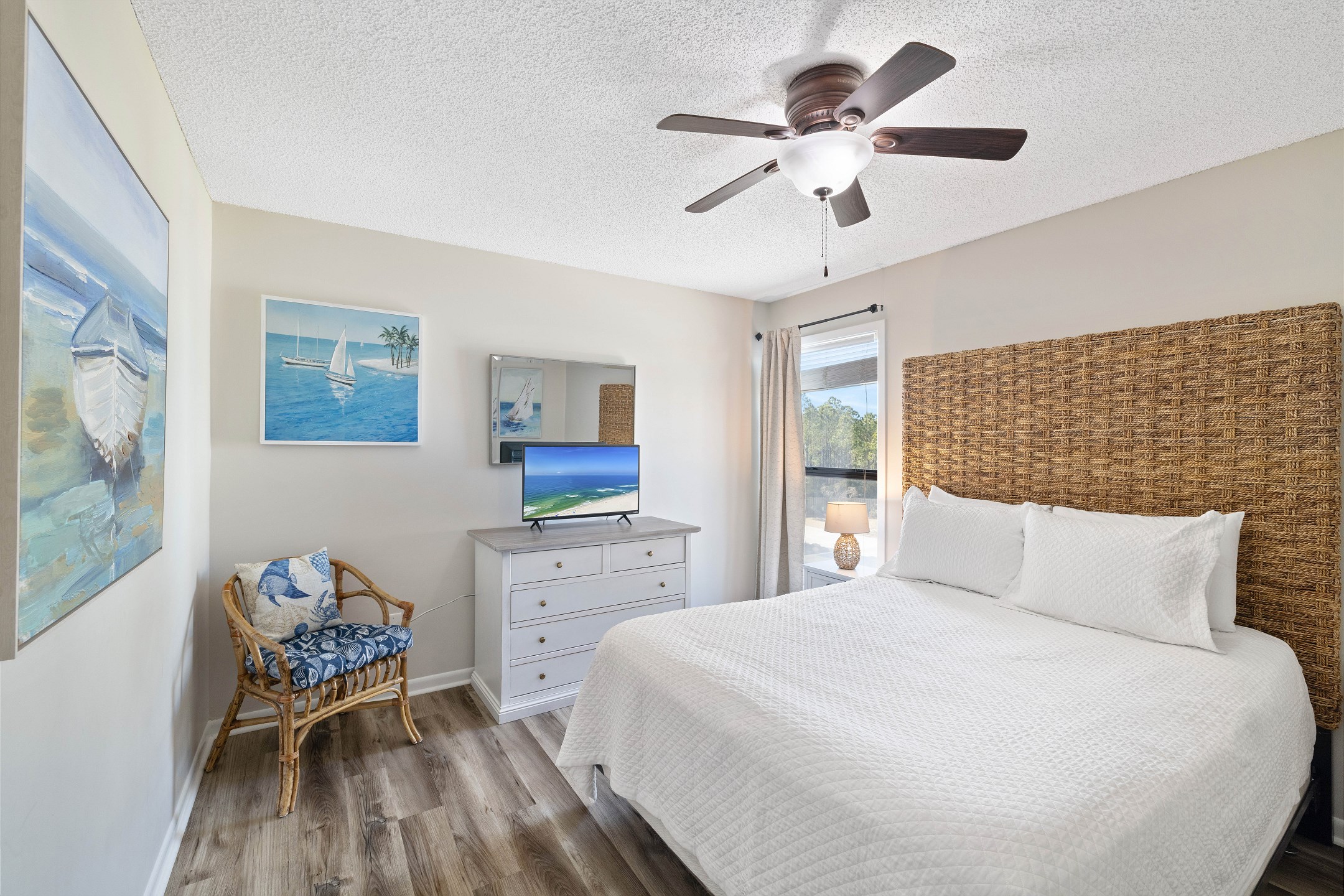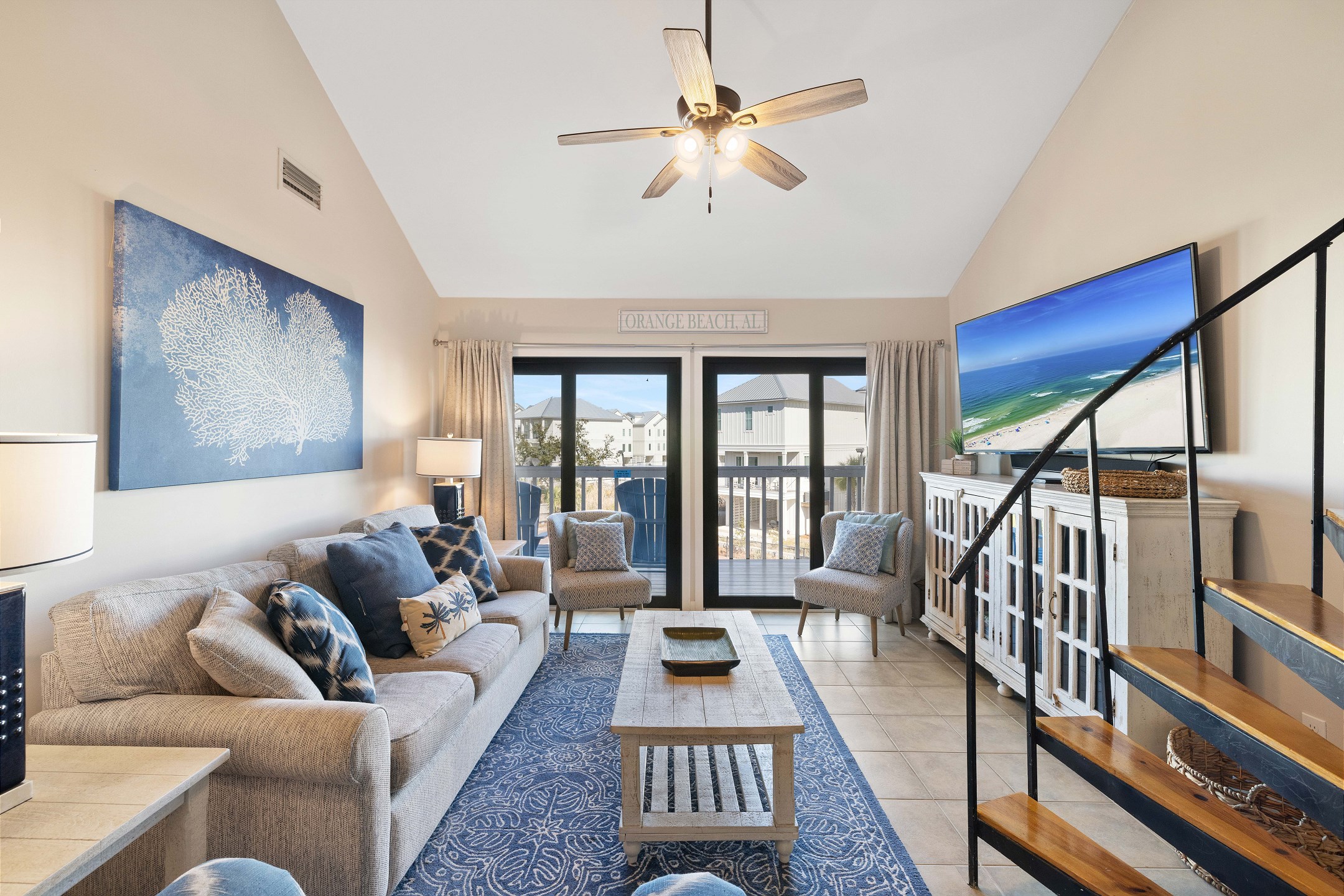 The primary bedroom offers a king bed, balcony access, a flat screen TV, and a private ensuite bathroom with a shower and tub combination. The first guest bedroom features a queen bed, while the second guest bedroom includes two twin beds. These guest rooms share a full hallway bathroom with a shower and tub combination.