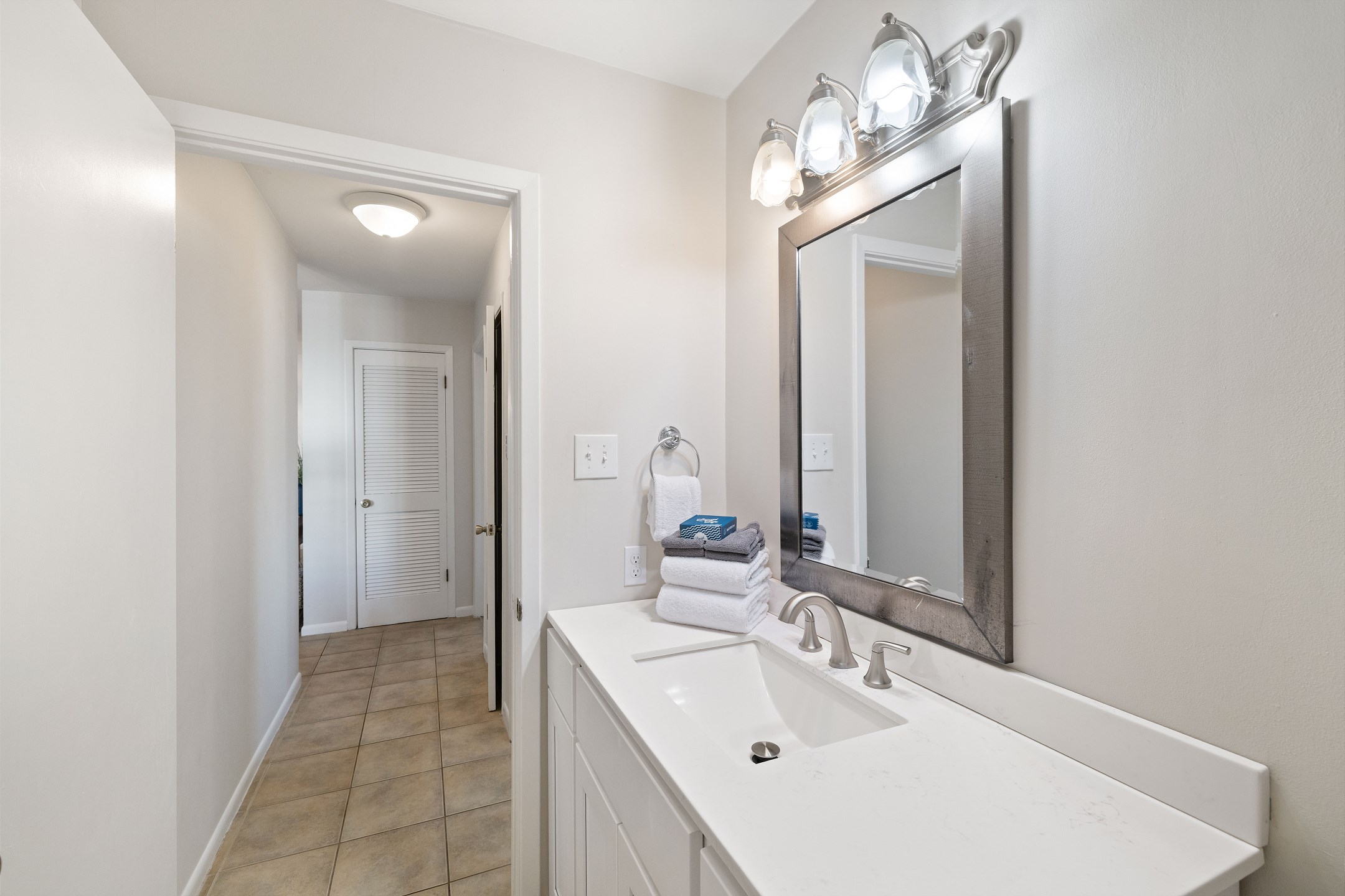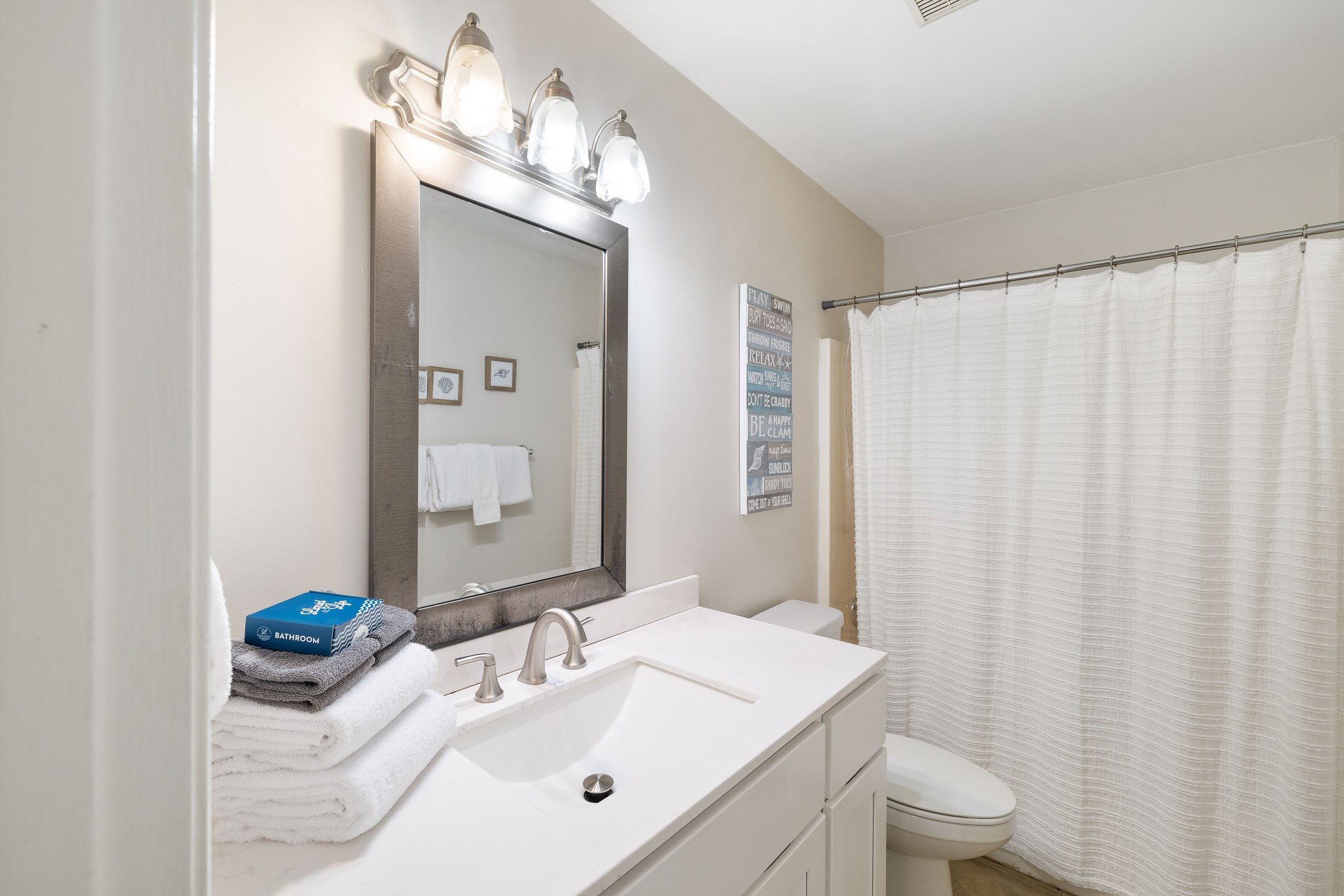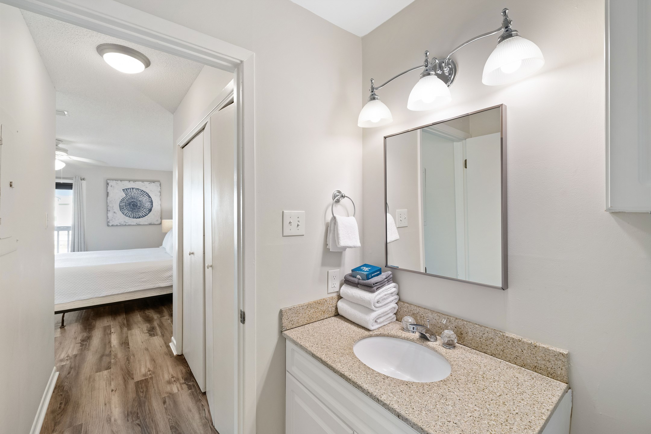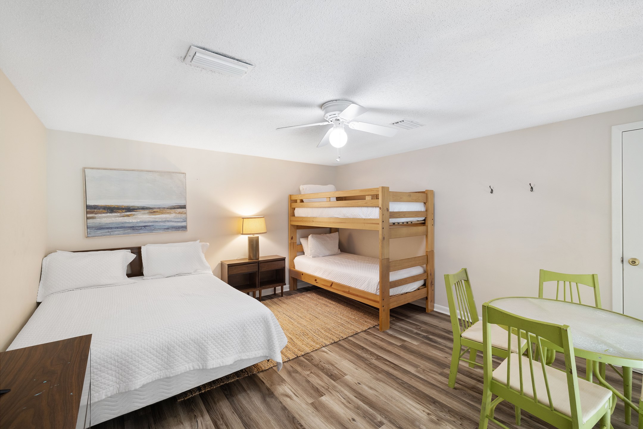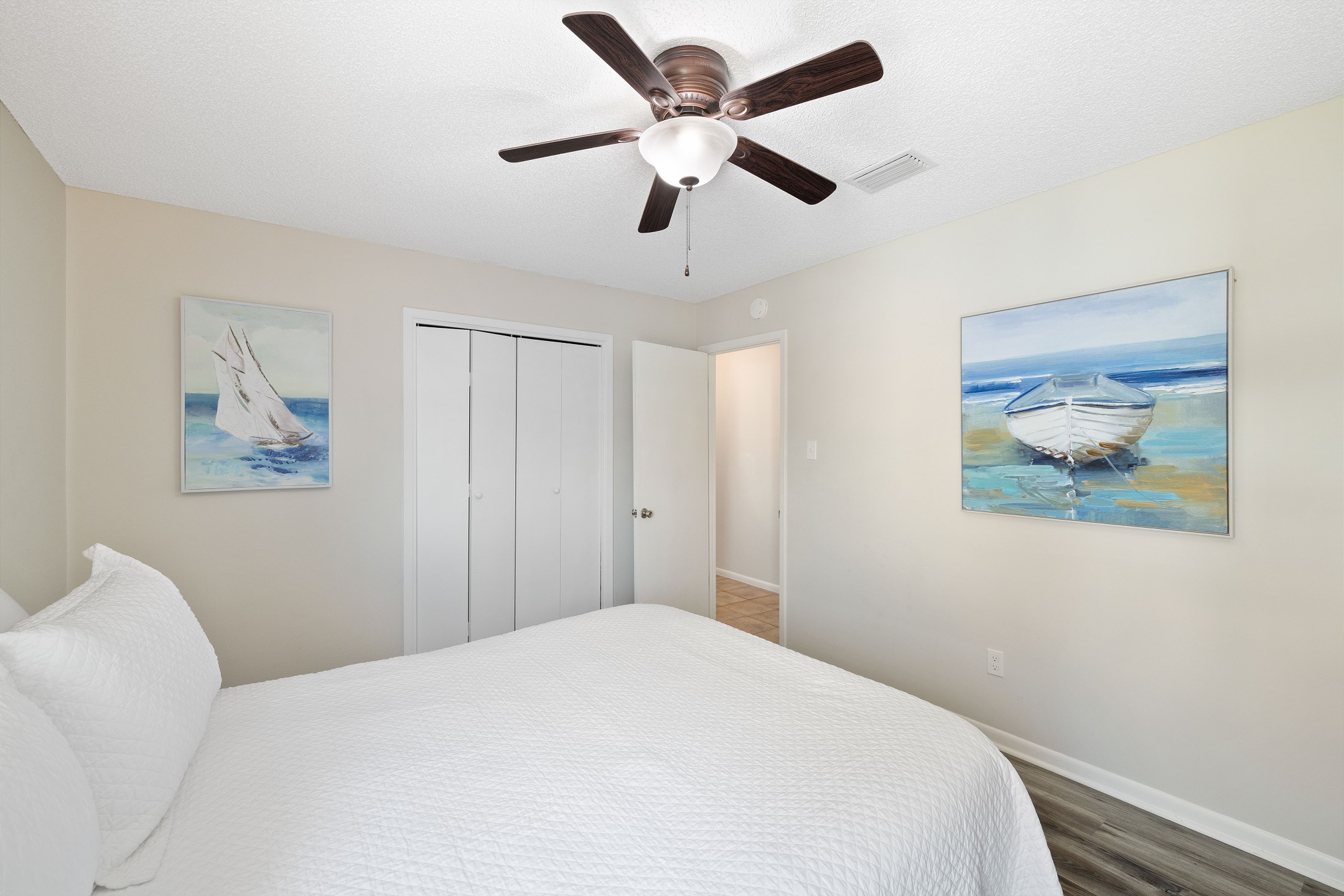 The primary bedroom offers a king bed, balcony access, a flat screen TV, and a private ensuite bathroom with a shower and tub combination. The first guest bedroom features a queen bed, while the second guest bedroom includes two twin beds. These guest rooms share a full hallway bathroom with a shower and tub combination.