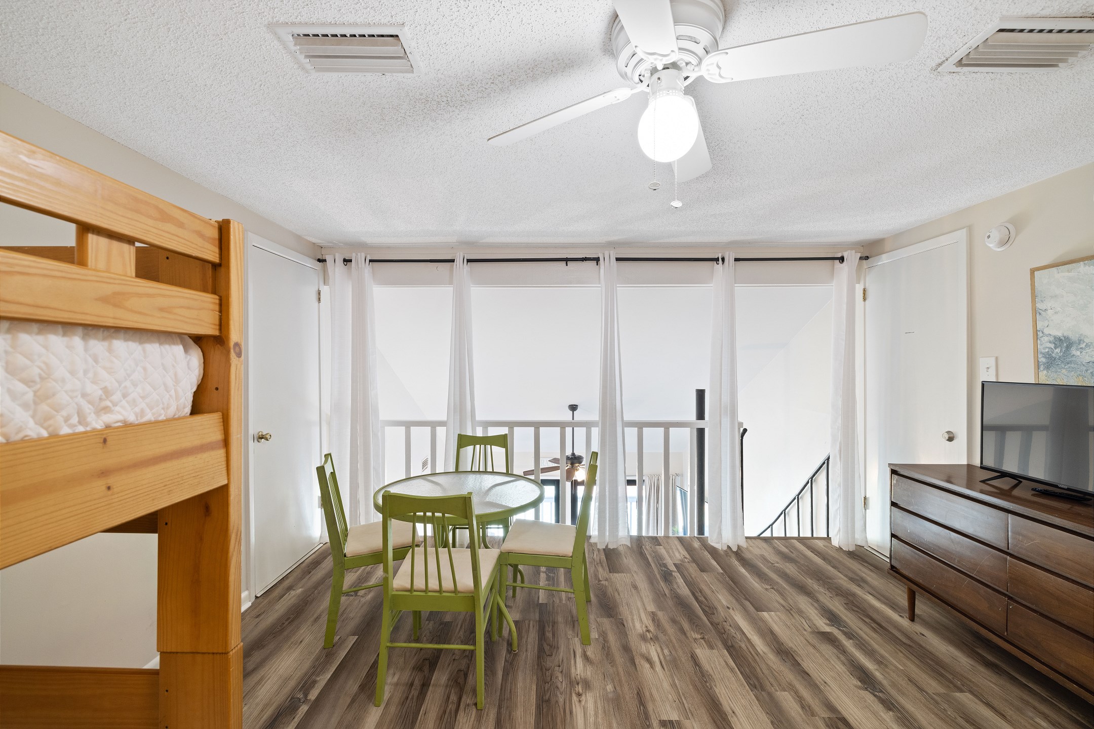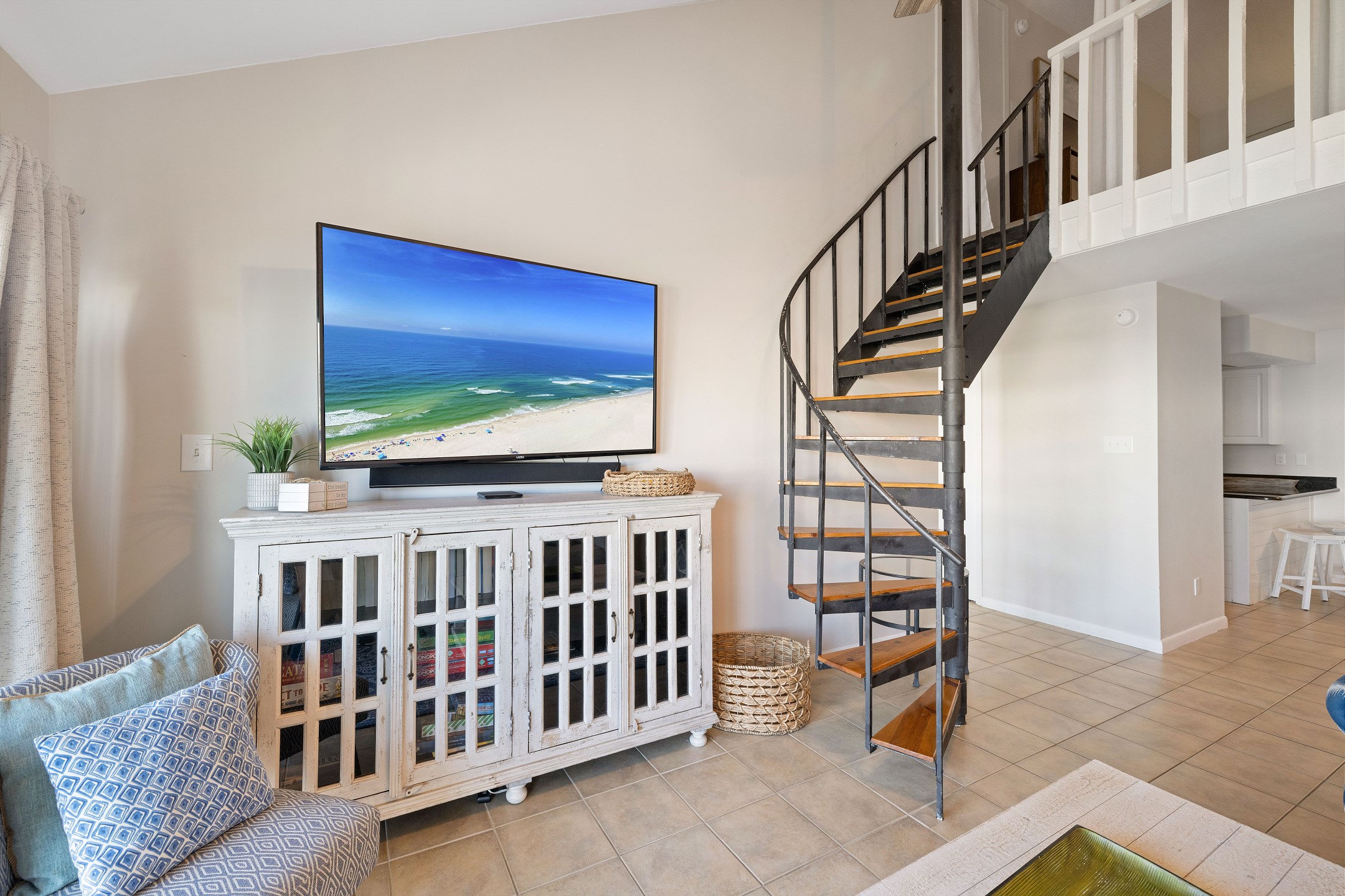 The loft, accessible by a spiral staircase from the living area, adds even more sleeping and hangout space with a full size bed, a twin over twin bunk bed, a table, and a flat screen TV.
