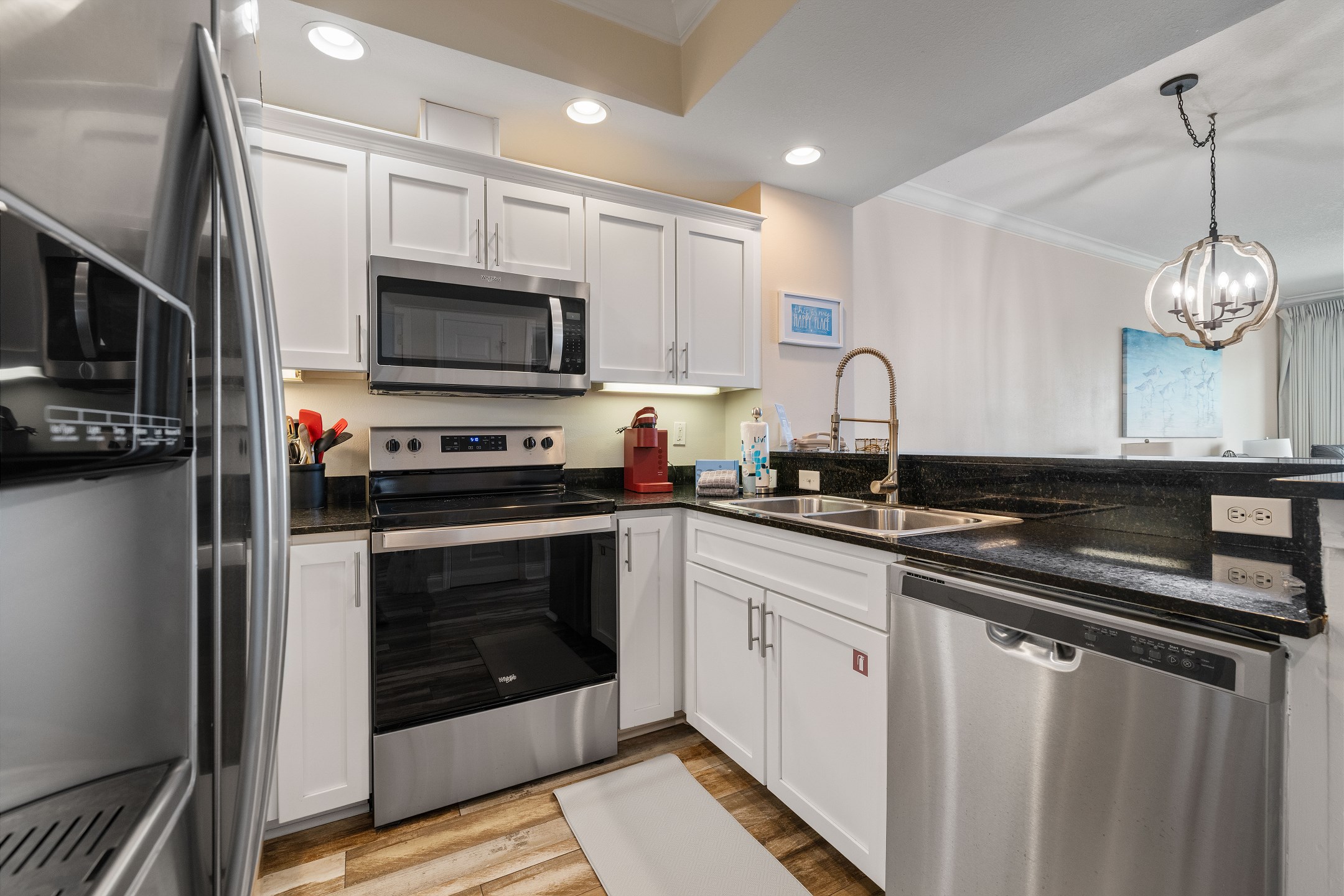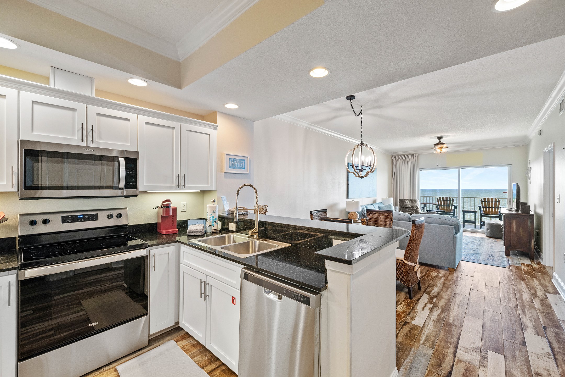One of the highlights of Crystal Shores 702 is its fully equipped kitchen, complete with stainless appliances and granite counters. Whether you're whipping up a quick snack or a full meal, this kitchen has everything you need for your culinary adventures.