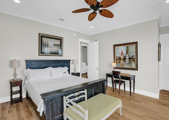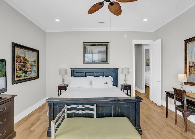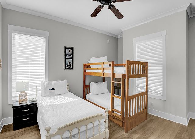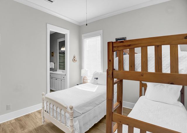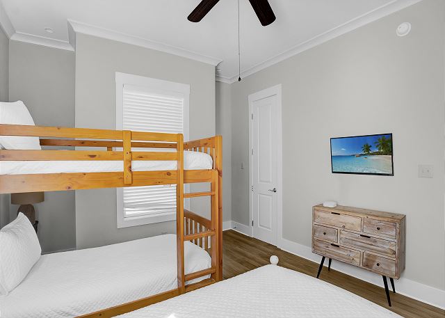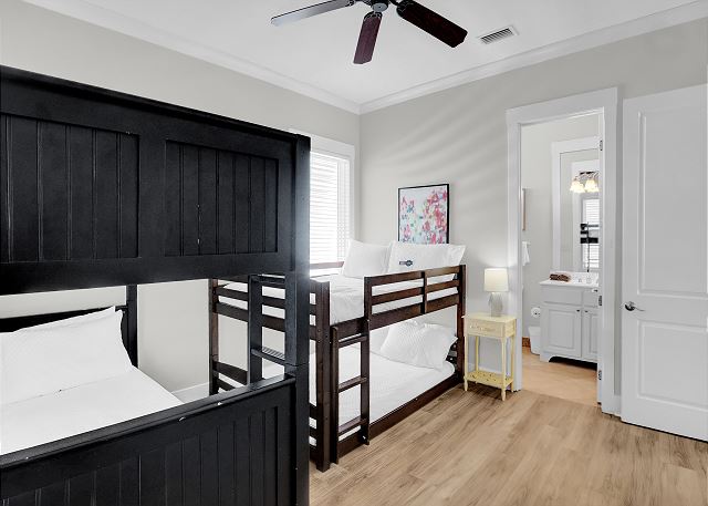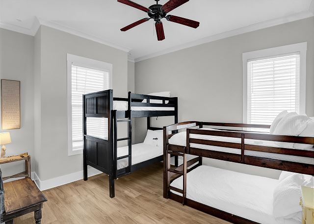 This 4,000 sq. ft. home offers seven bedrooms and six bathrooms, providing ample space for large families or groups. The main floor features two bedrooms, each with a private bath, making it perfect for guests who prefer not to venture upstairs. The second floor offers five additional bedrooms, including a luxurious primary suite with a private bath, plus another king bedroom with its own en-suite bathroom. One of the bedrooms has bunk beds, making it ideal for kids or extra guests.