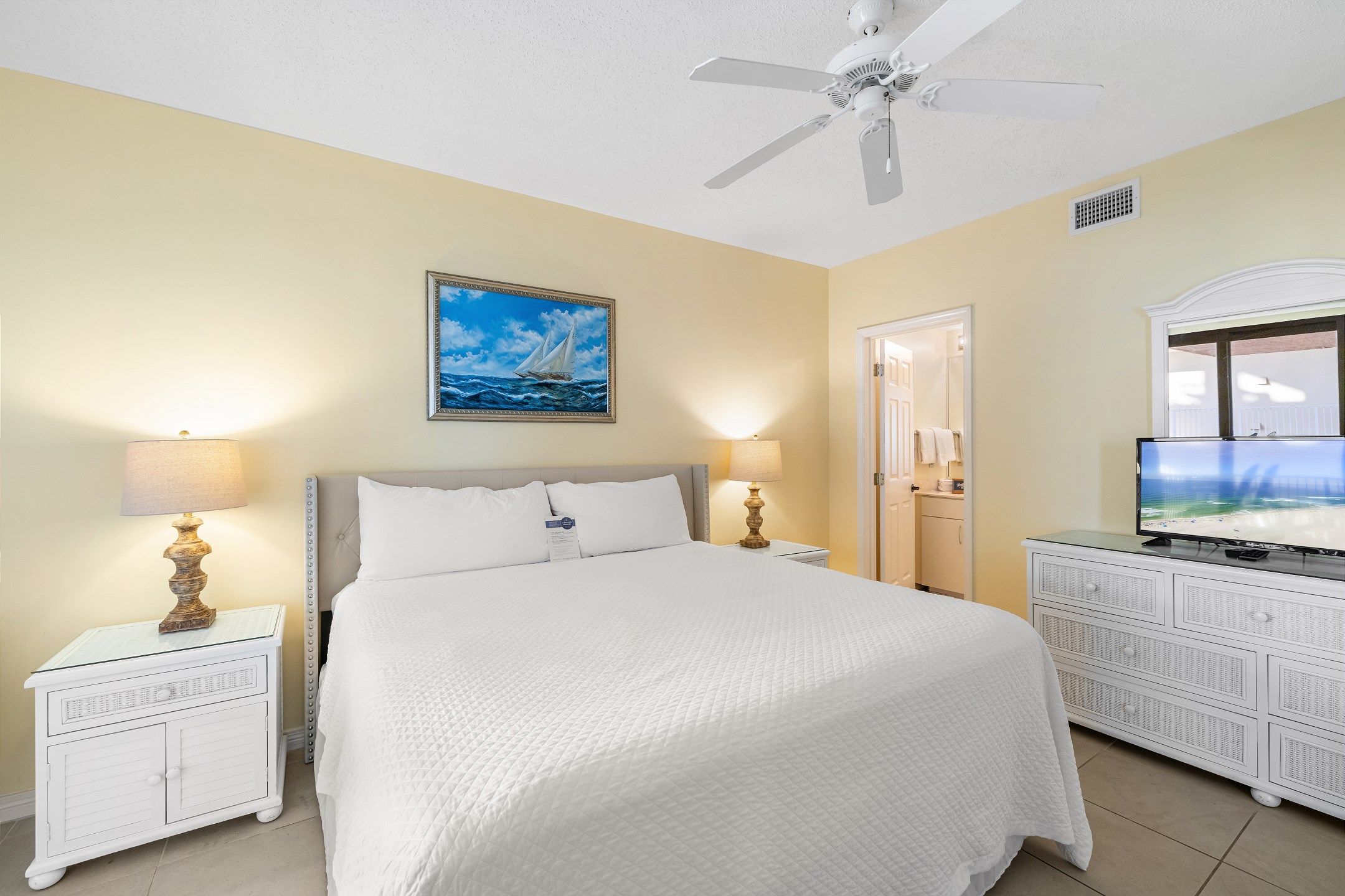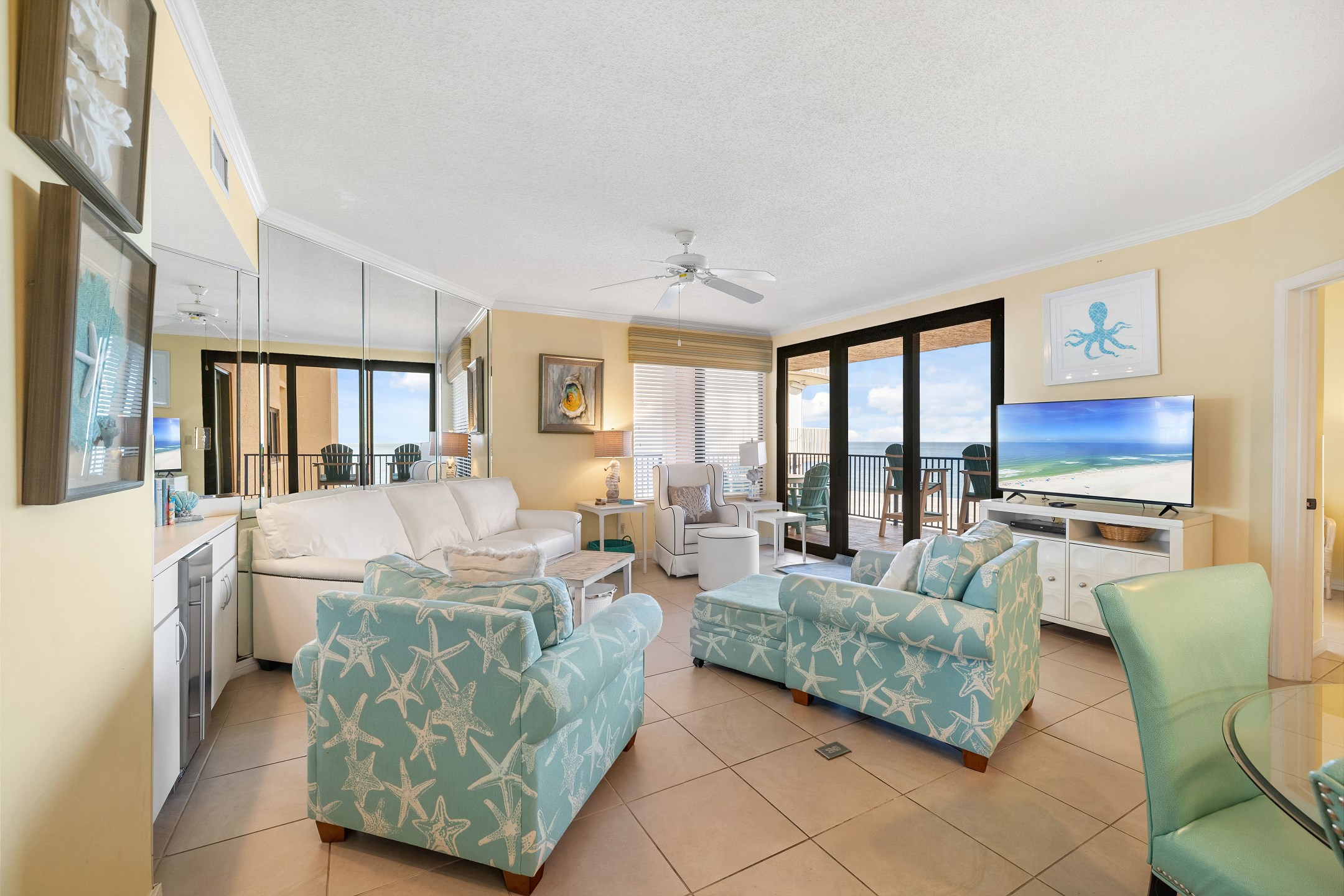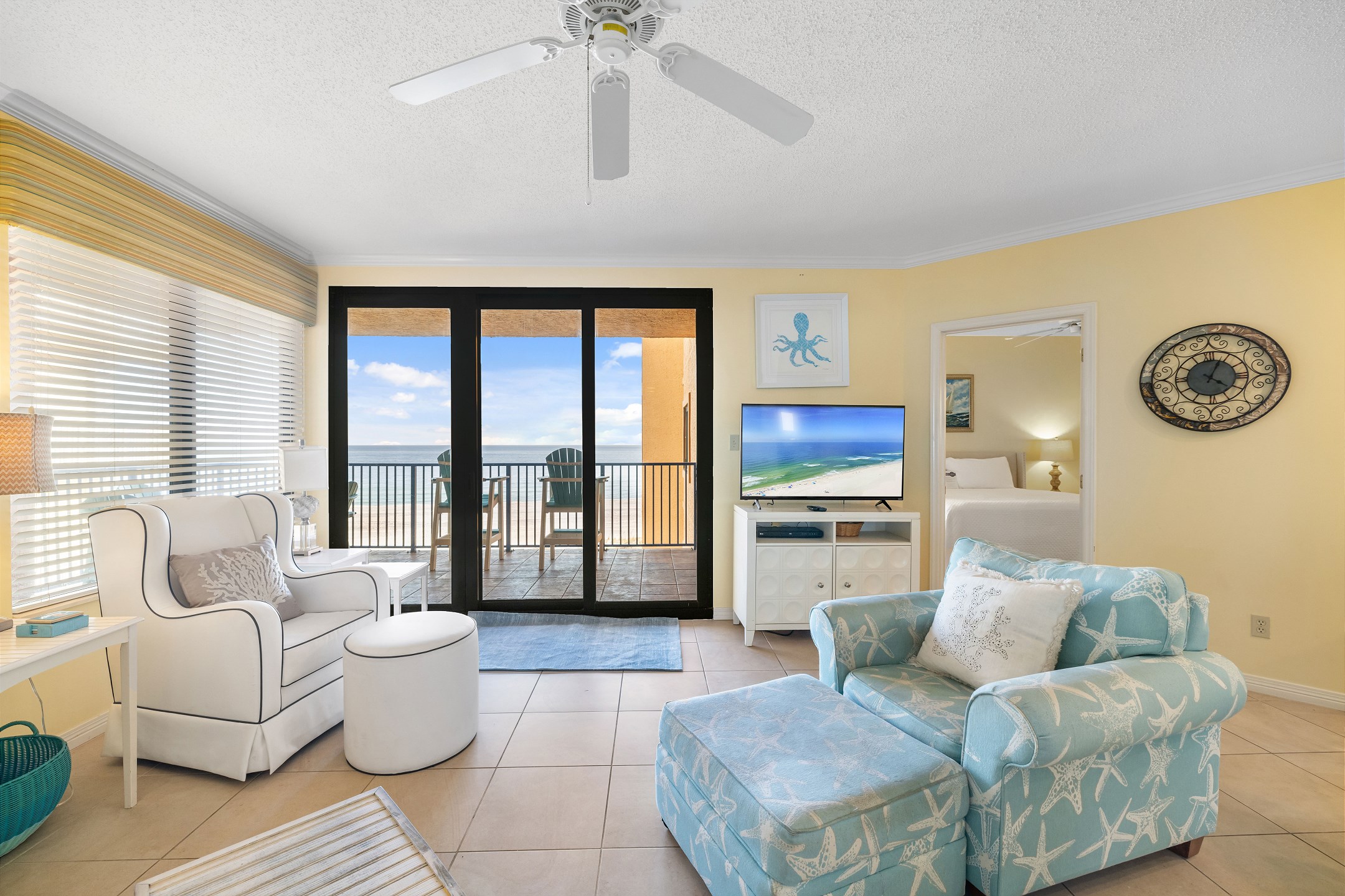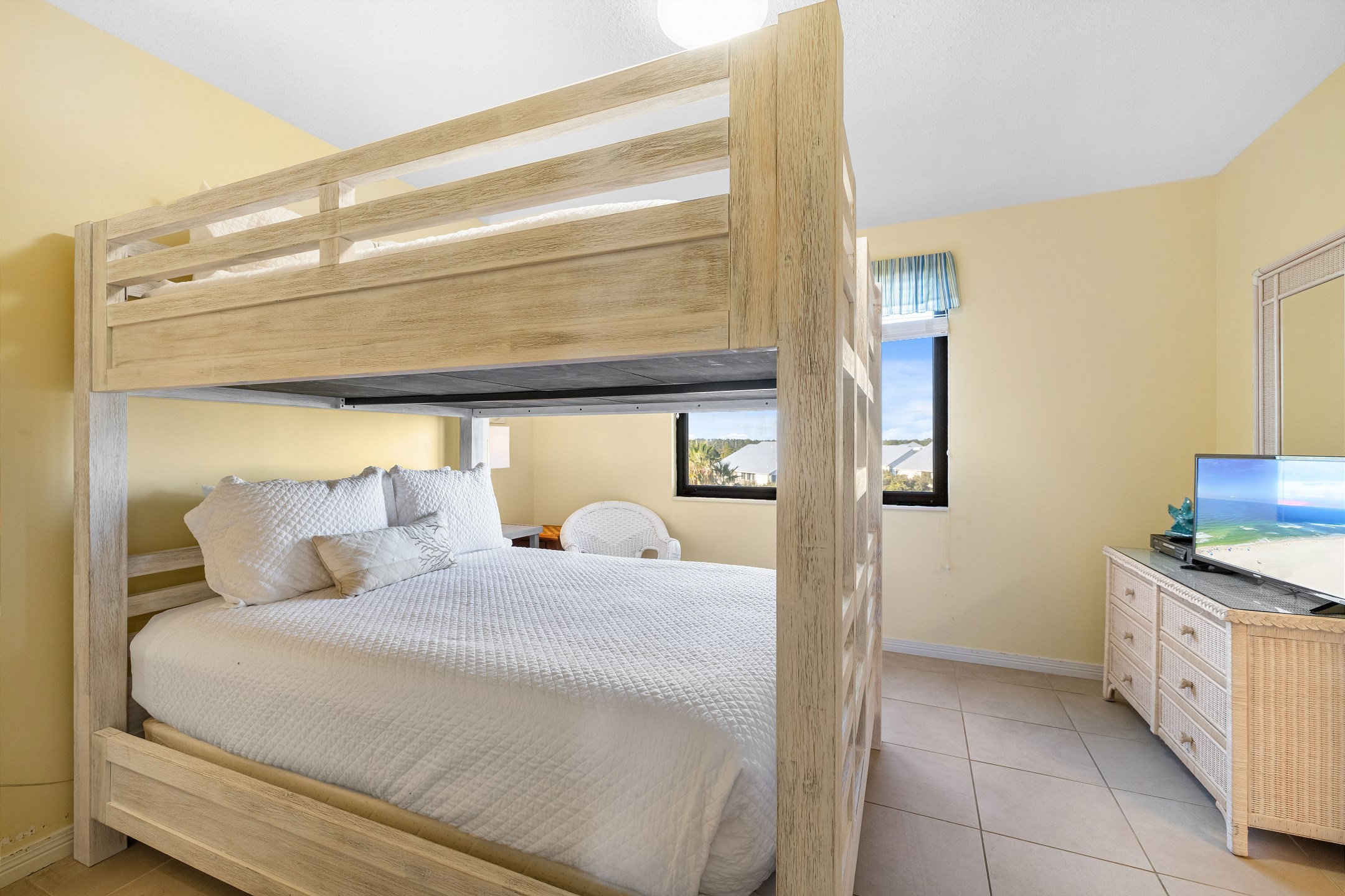The Primary suite in this beachfront haven boasts a luxurious King bed, direct balcony access for those stunning Gulf views, a flat-screen TV, and a private bath complete with dual vanities, a relaxing Jacuzzi tub, and a walk-in shower. The second suite is equally appealing with its own balcony access, a cozy King bed, flat-screen TV, and a private bath, providing a perfect blend of comfort and privacy. The third bedroom is charmingly furnished with Queen over Queen bunk bed alongside a flat-screen TV, making it an ideal spot for additional guests or children, with easy access to the hall bathroom.