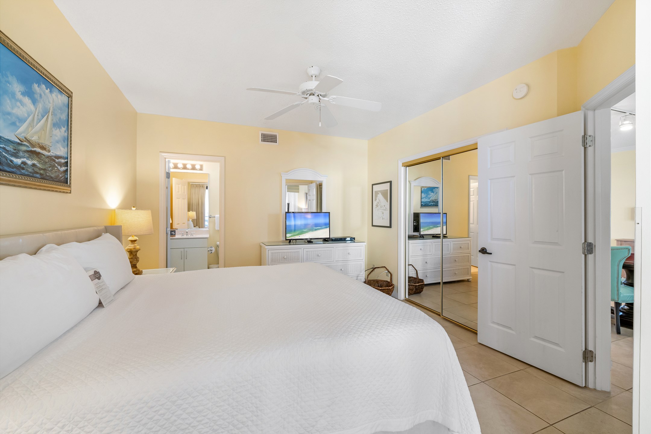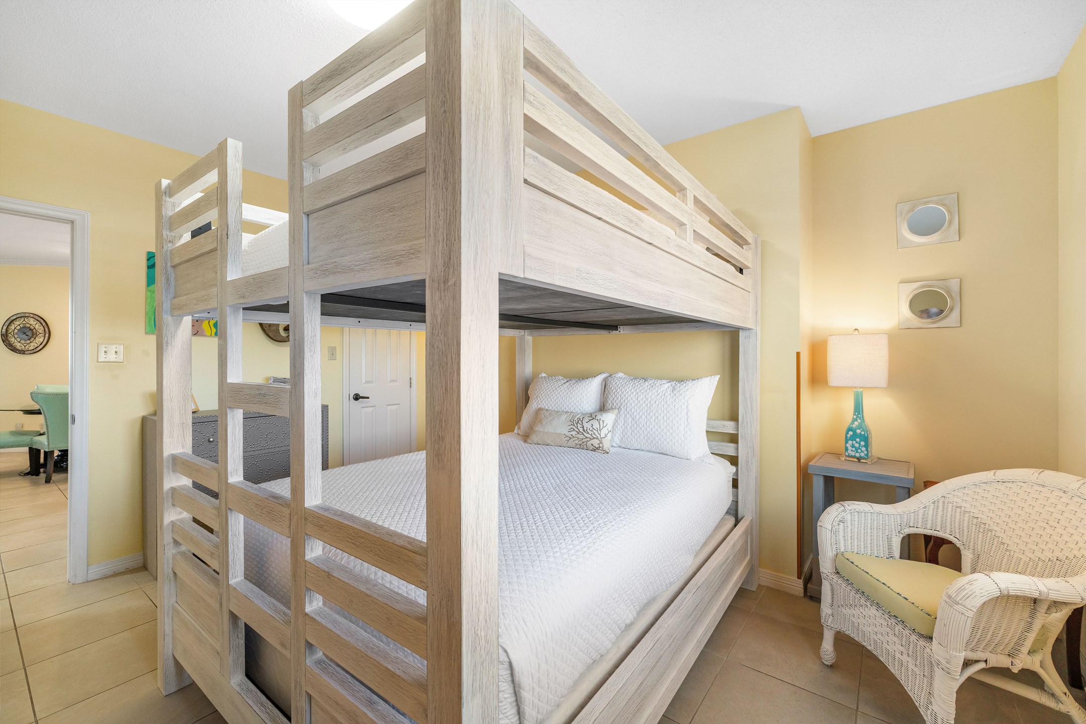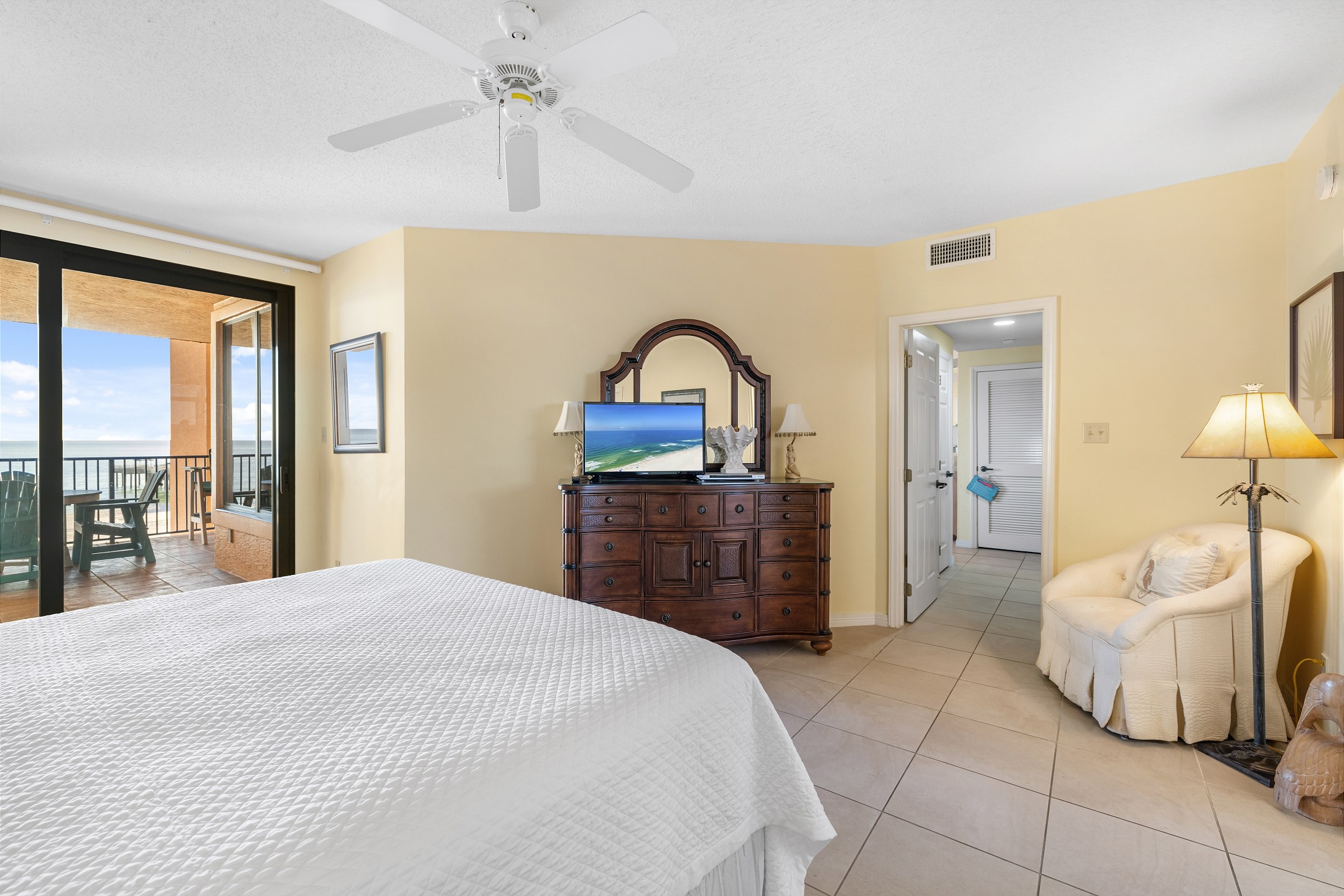 The Primary suite in this beachfront haven boasts a luxurious King bed, direct balcony access for those stunning Gulf views, a flat-screen TV, and a private bath complete with dual vanities, a relaxing Jacuzzi tub, and a walk-in shower. The second suite is equally appealing with its own balcony access, a cozy King bed, flat-screen TV, and a private bath, providing a perfect blend of comfort and privacy. The third bedroom is charmingly furnished with Queen over Queen bunk bed alongside a flat-screen TV, making it an ideal spot for additional guests or children, with easy access to the hall bathroom.