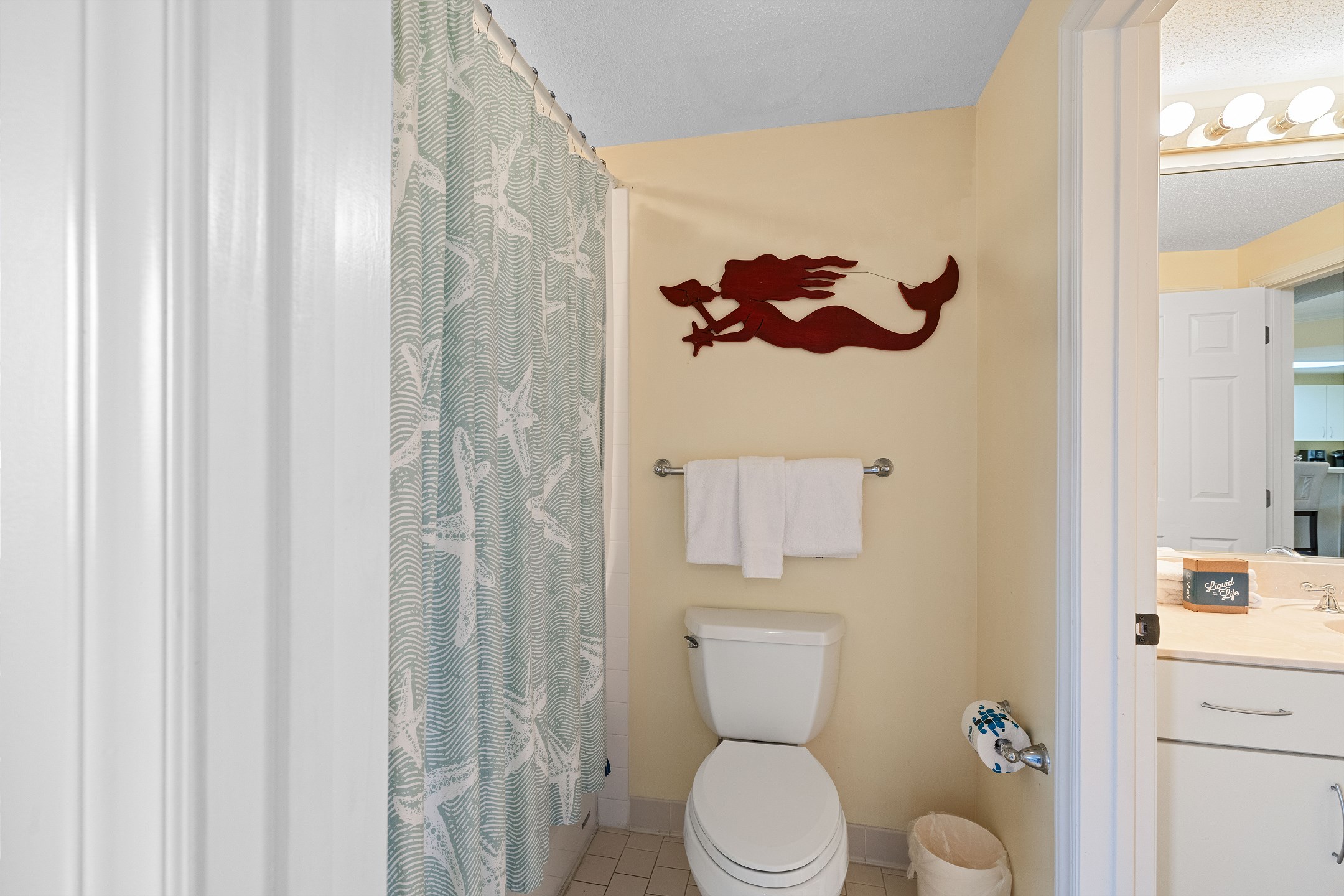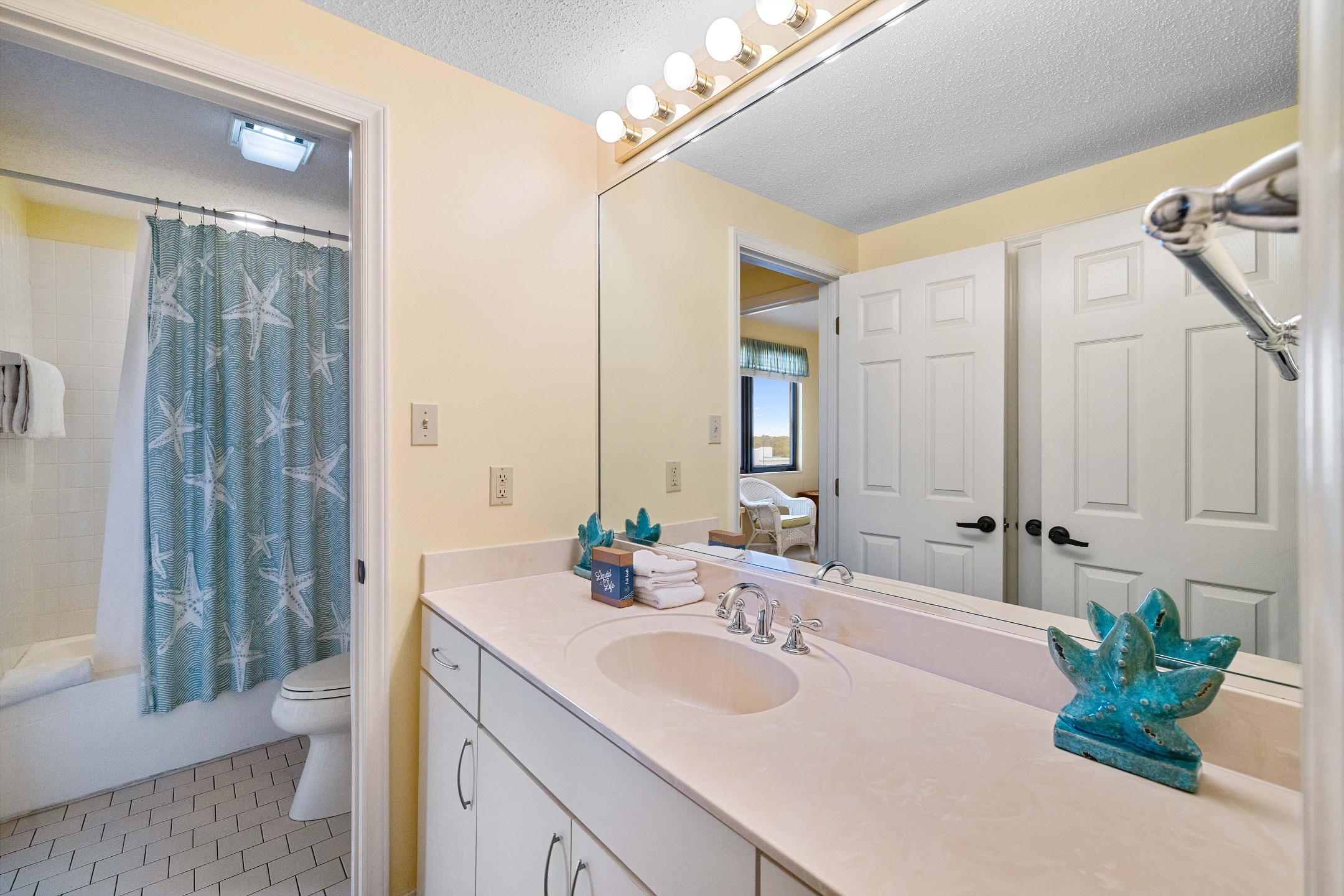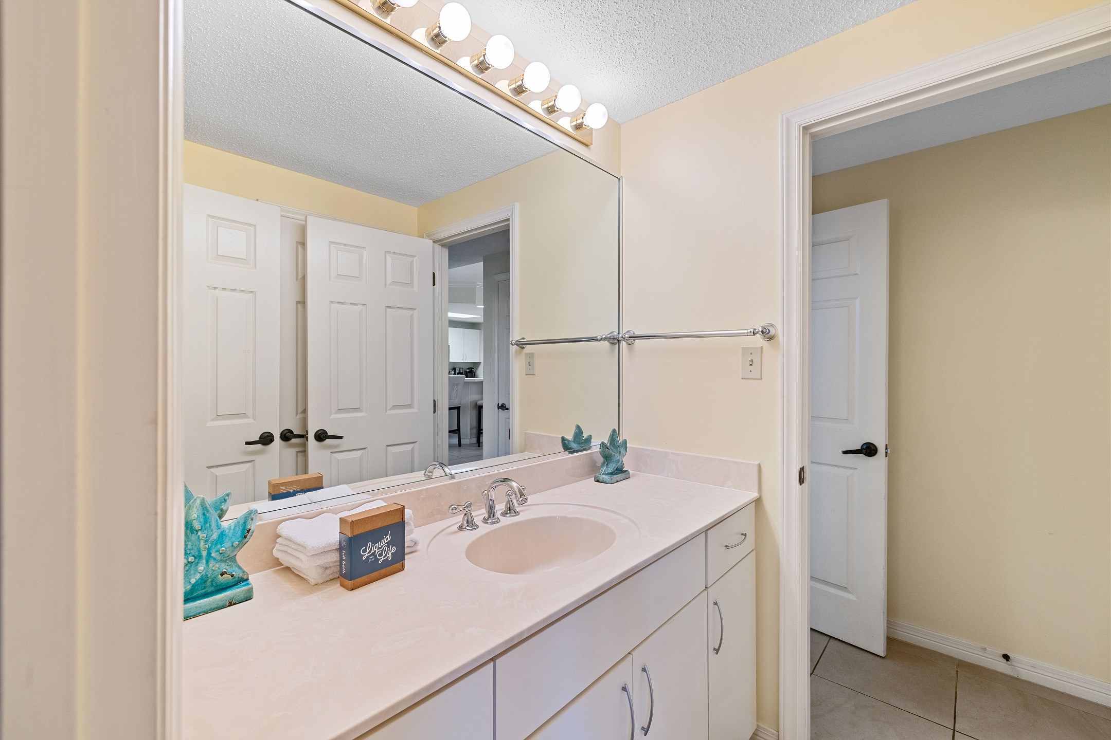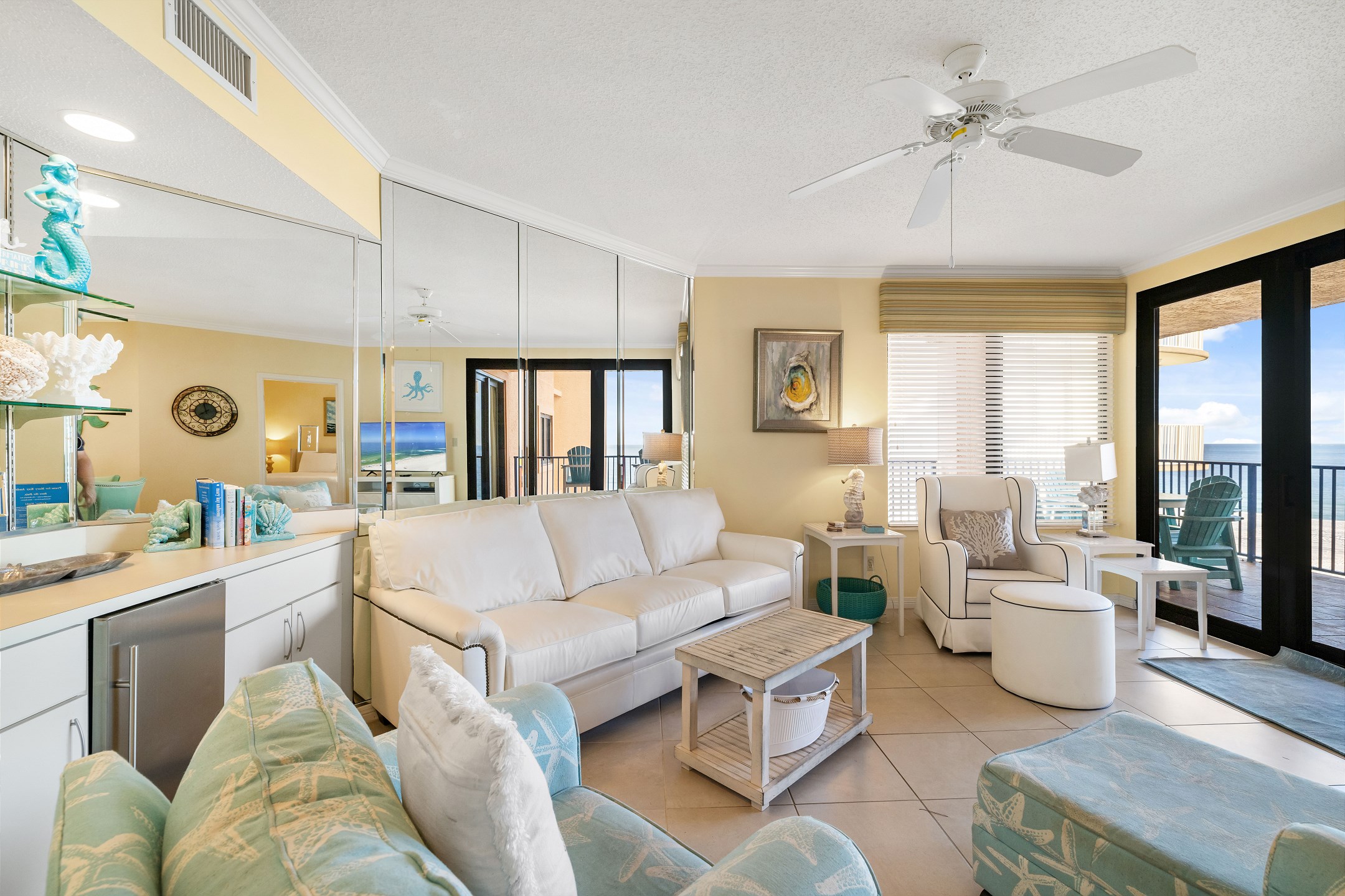 The Primary suite in this beachfront haven boasts a luxurious King bed, direct balcony access for those stunning Gulf views, a flat-screen TV, and a private bath complete with dual vanities, a relaxing Jacuzzi tub, and a walk-in shower. The second suite is equally appealing with its own balcony access, a cozy King bed, flat-screen TV, and a private bath, providing a perfect blend of comfort and privacy. The third bedroom is charmingly furnished with Queen over Queen bunk bed alongside a flat-screen TV, making it an ideal spot for additional guests or children, with easy access to the hall bathroom.