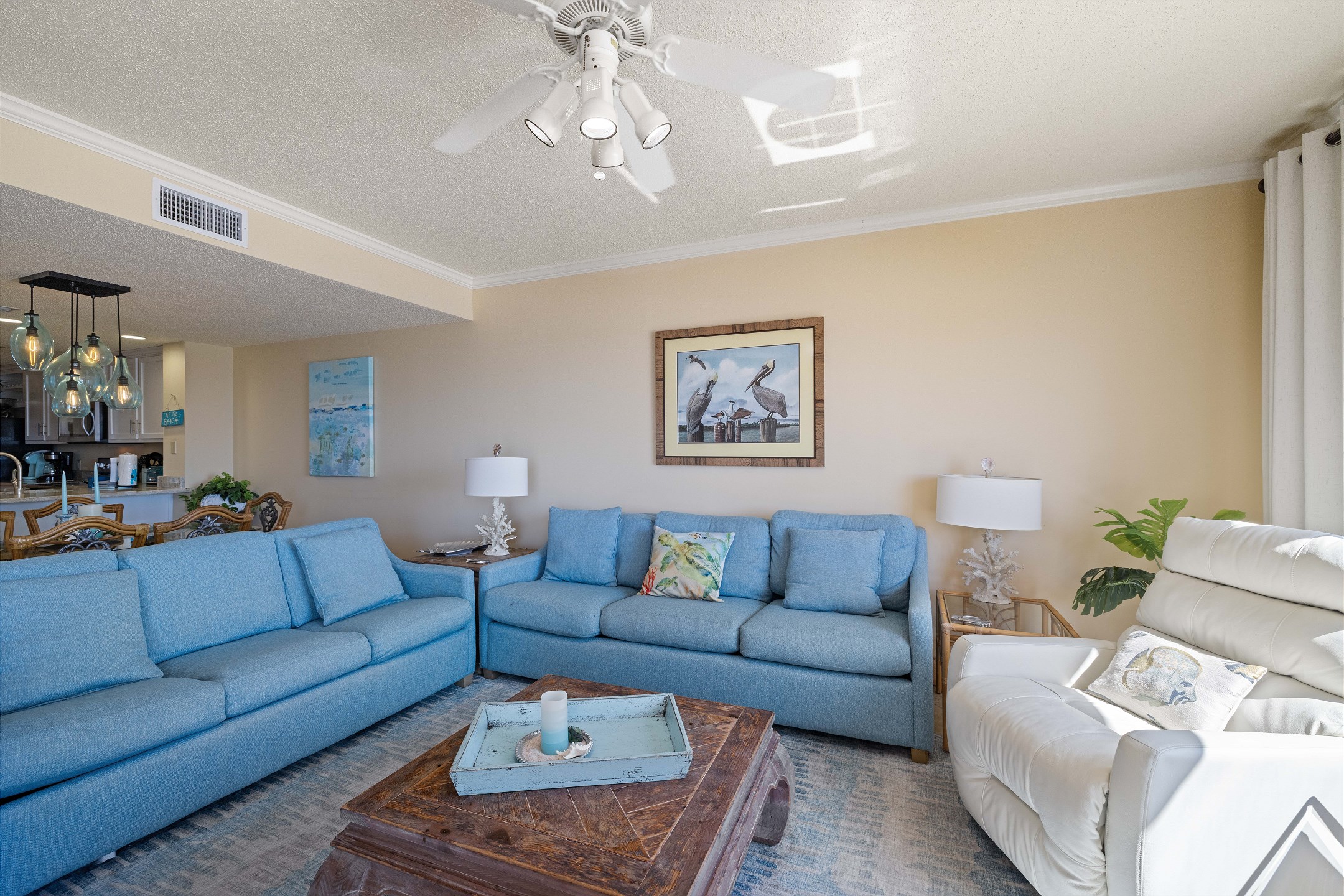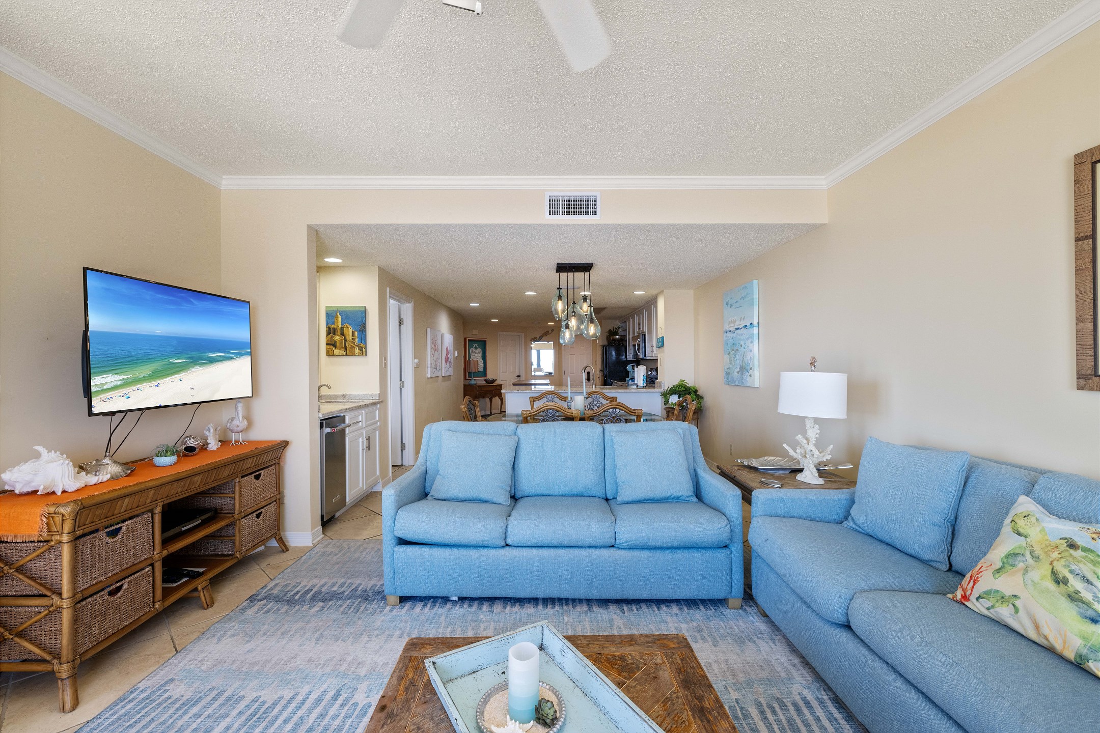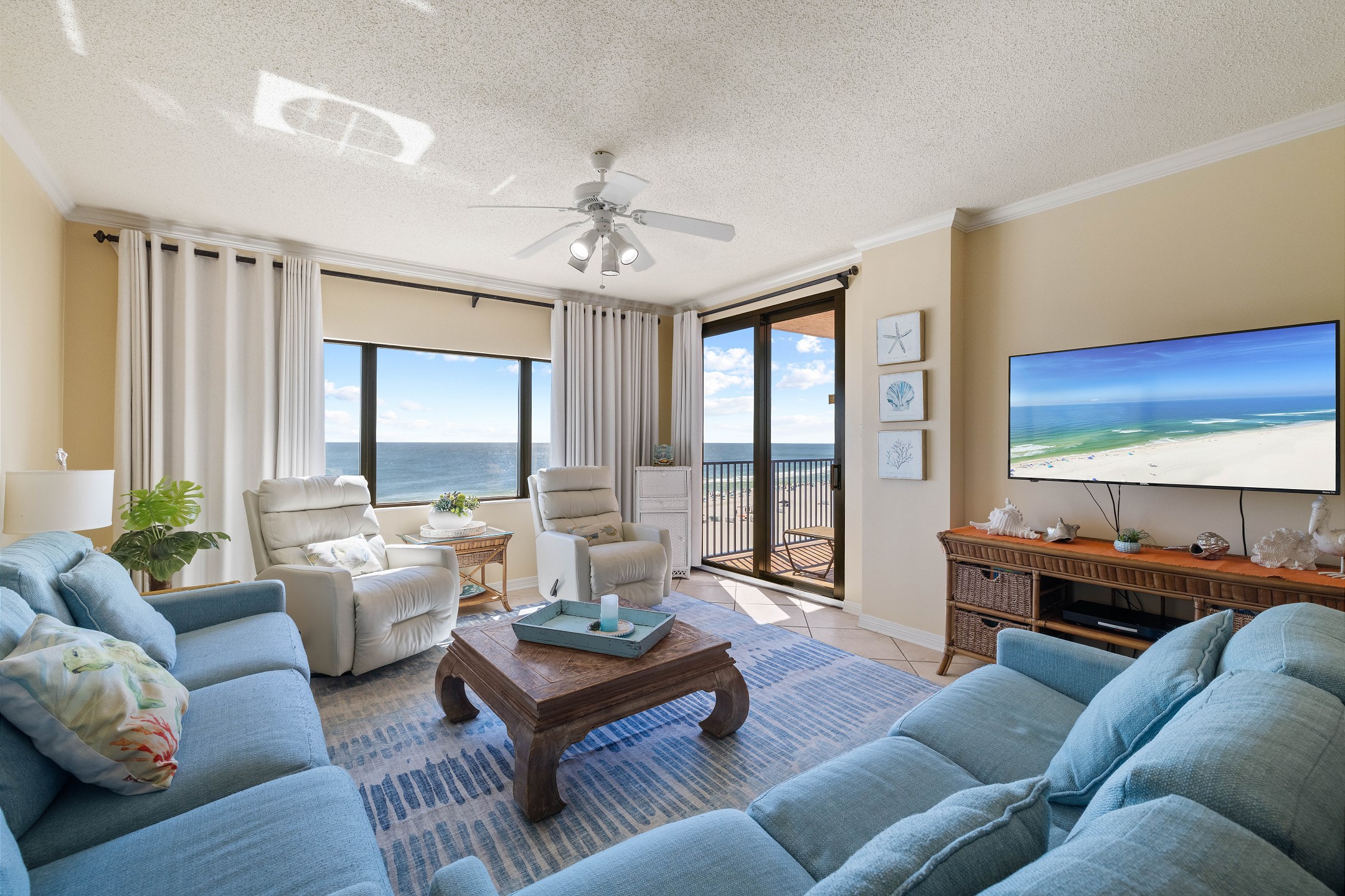 Embark on a journey of ultimate comfort in the Primary suite, featuring a luxurious King bed, two separate closets for ample storage, and balcony access for those serene morning views. An HD flat-screen TV and a spacious private bath with a large walk-in shower complete this tranquil retreat. The second suite, equally lavish, presents a cozy Queen bed, a flat-screen TV, its own balcony access, and a private bath for a personal oasis. For additional guests, the third bedroom boasts a unique Queen-over-Queen bunk bed, a flat-screen TV, and easy access to the hall bathroom.