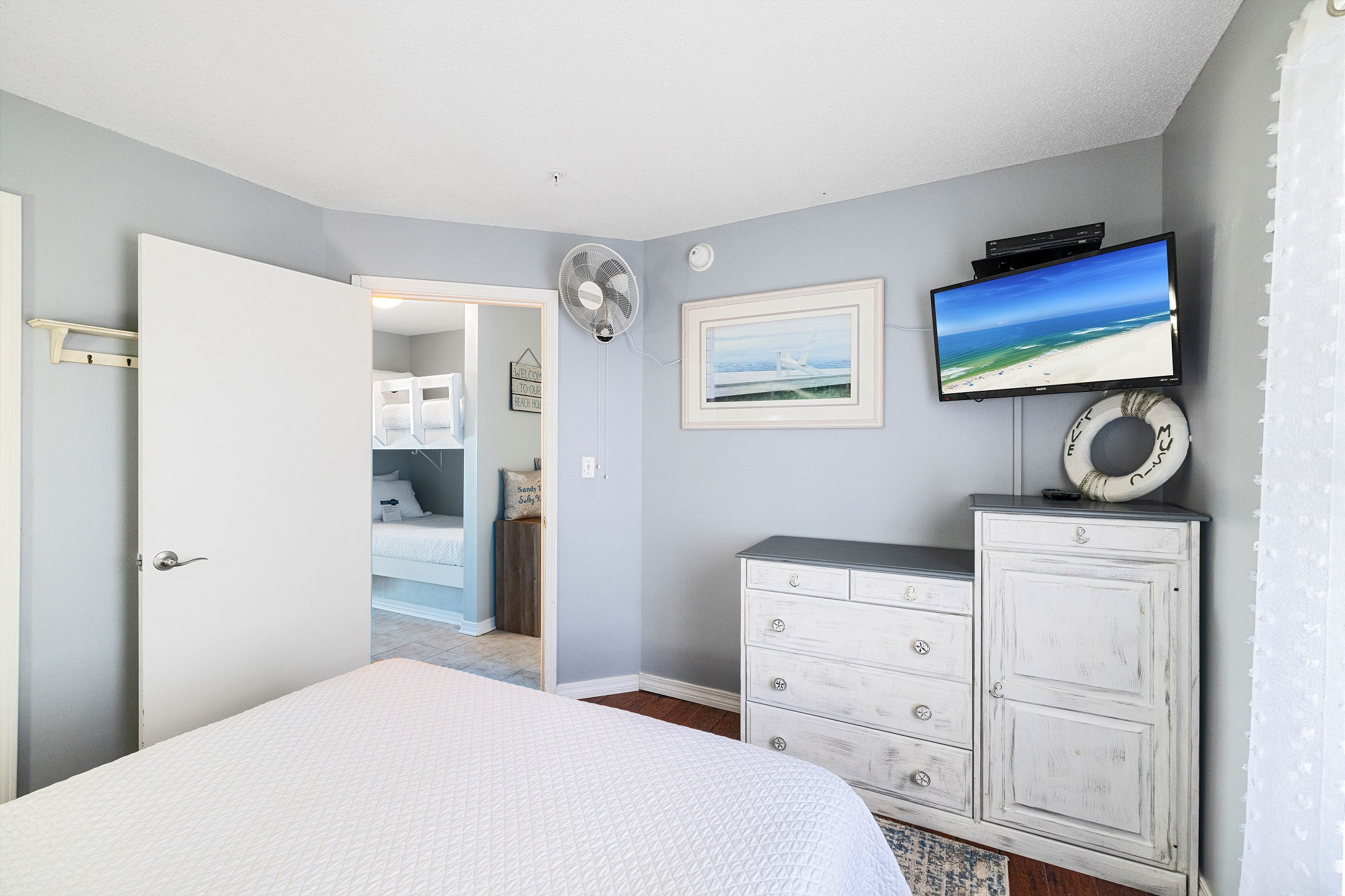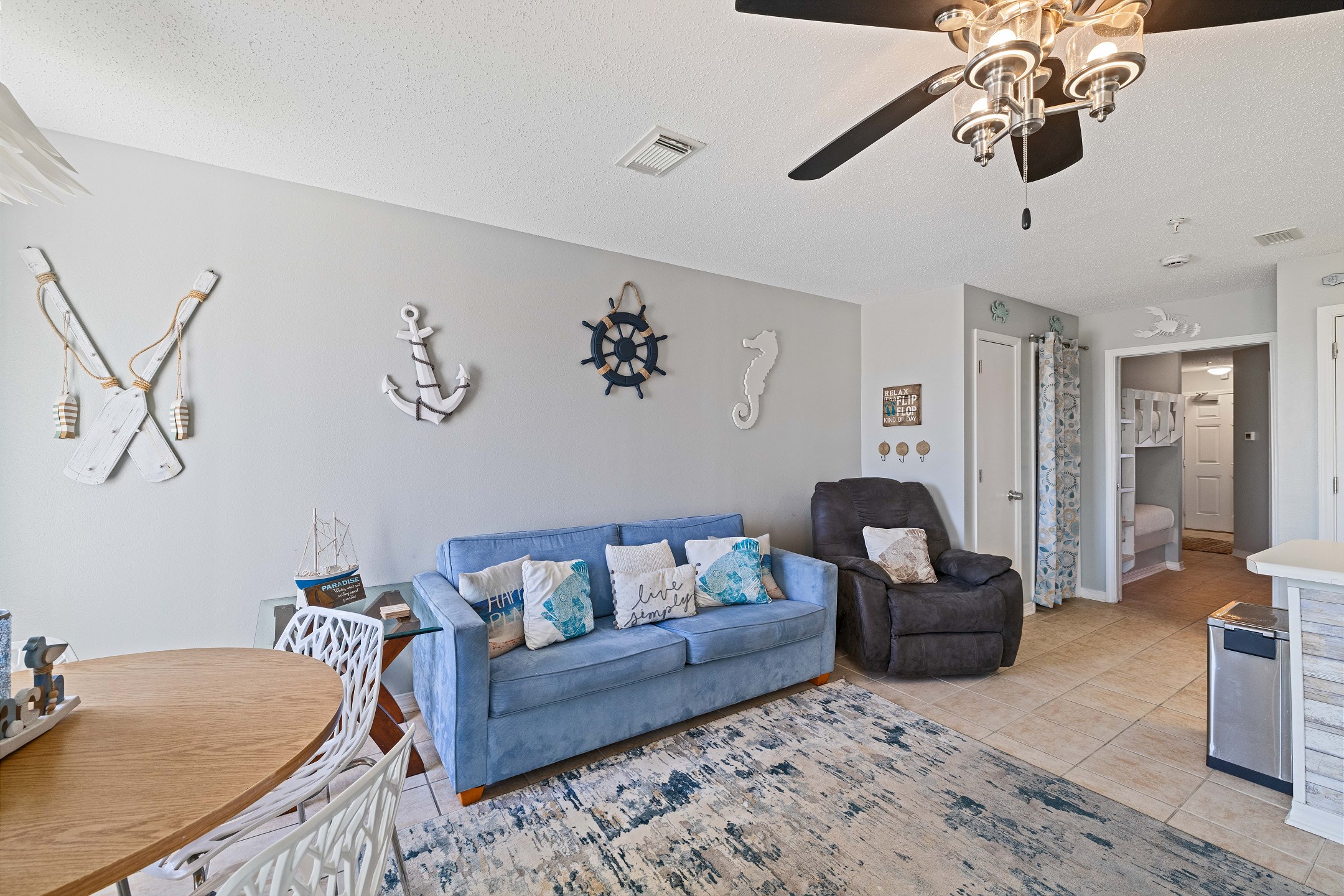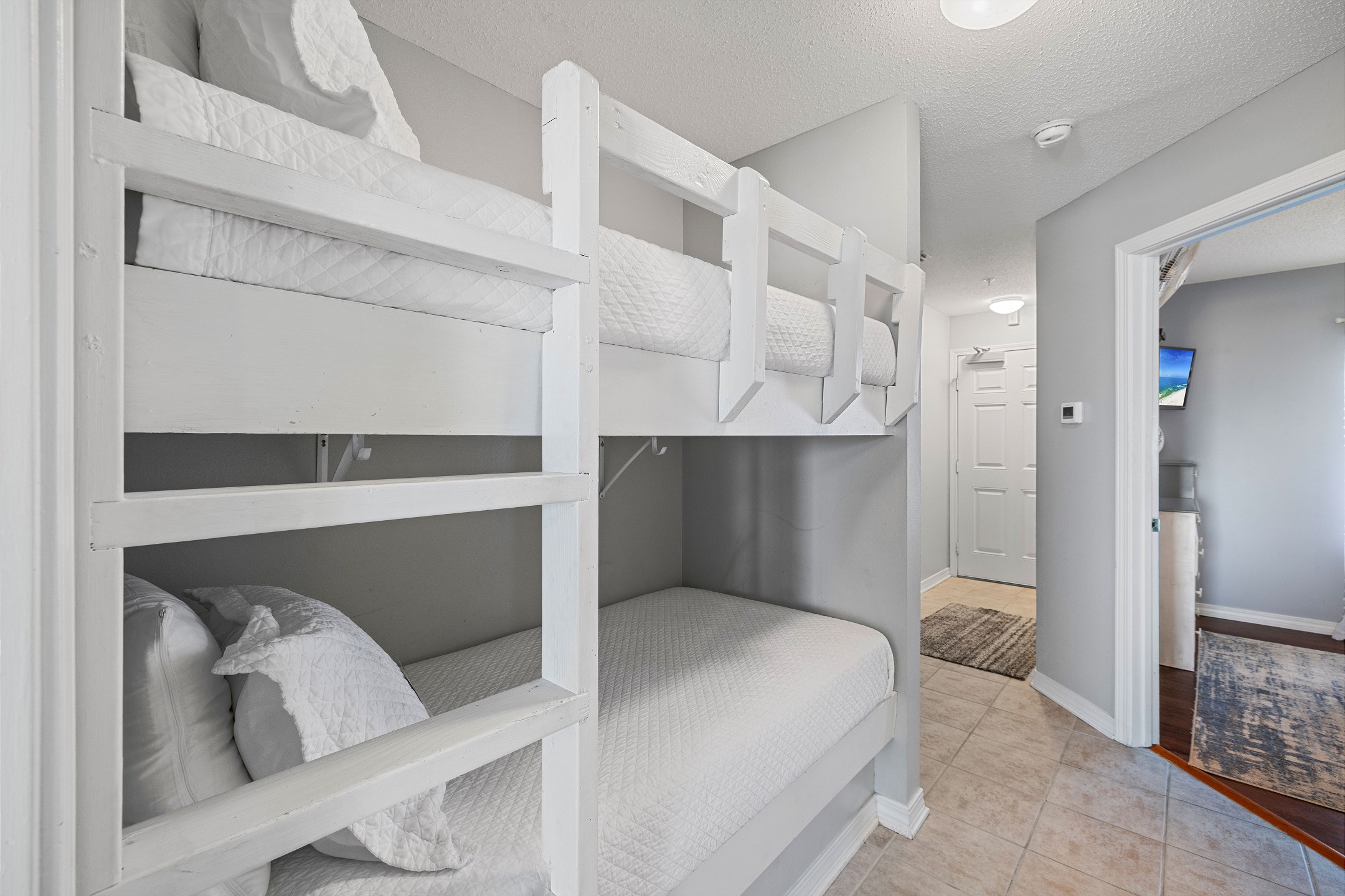 The primary bedroom offers a queen bed, while the hallway features built-in twin-over-twin bunks that kids will love. A sofa sleeper in the living room provides additional sleeping space. For added convenience, the unit includes a washer and dryer.