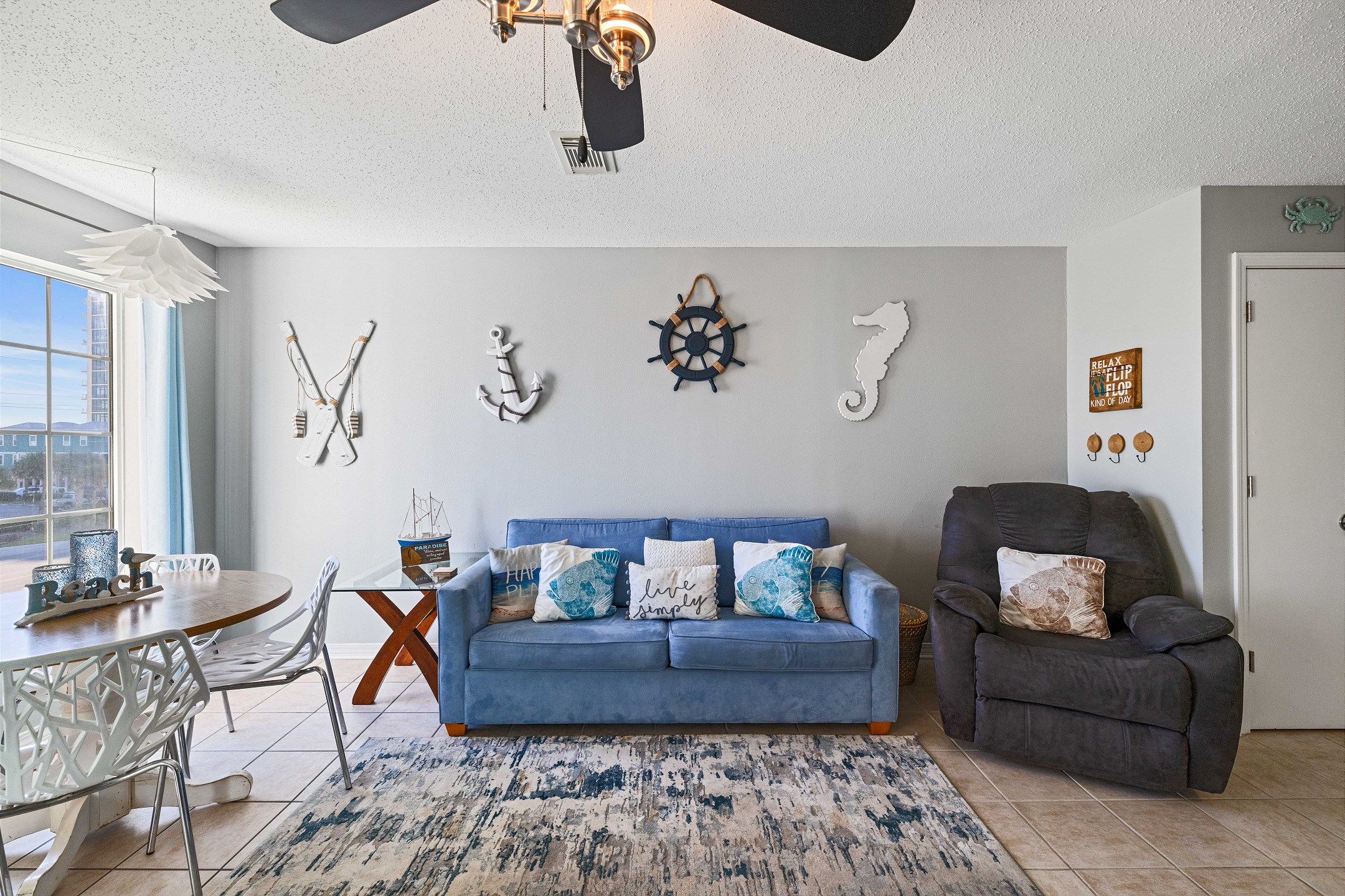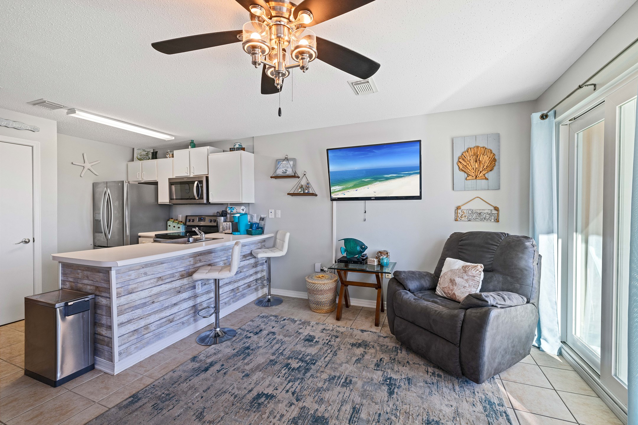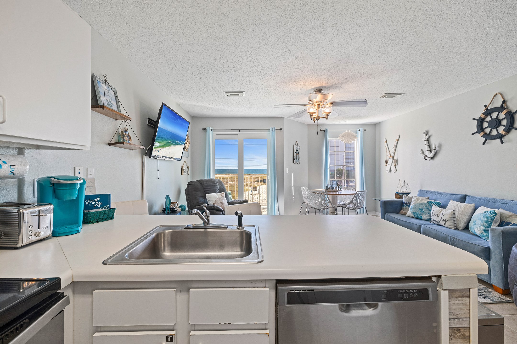 The living room features comfortable seating, a flat-screen TV, and access to a private balcony with stunning views of the Gulf. The fully equipped kitchen includes stainless steel appliances and everything you need to prepare meals during your stay, along with a dining area for gathering together.