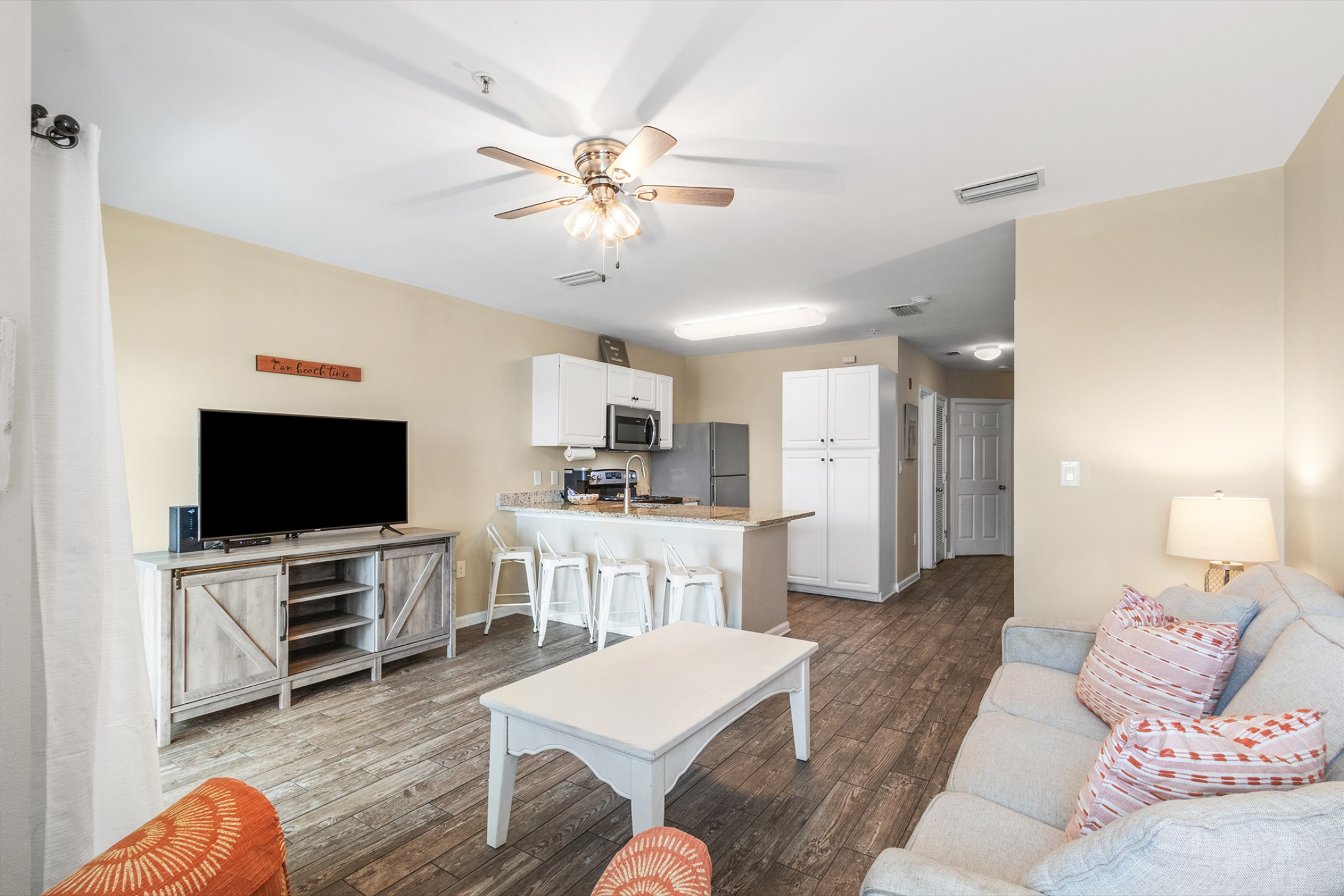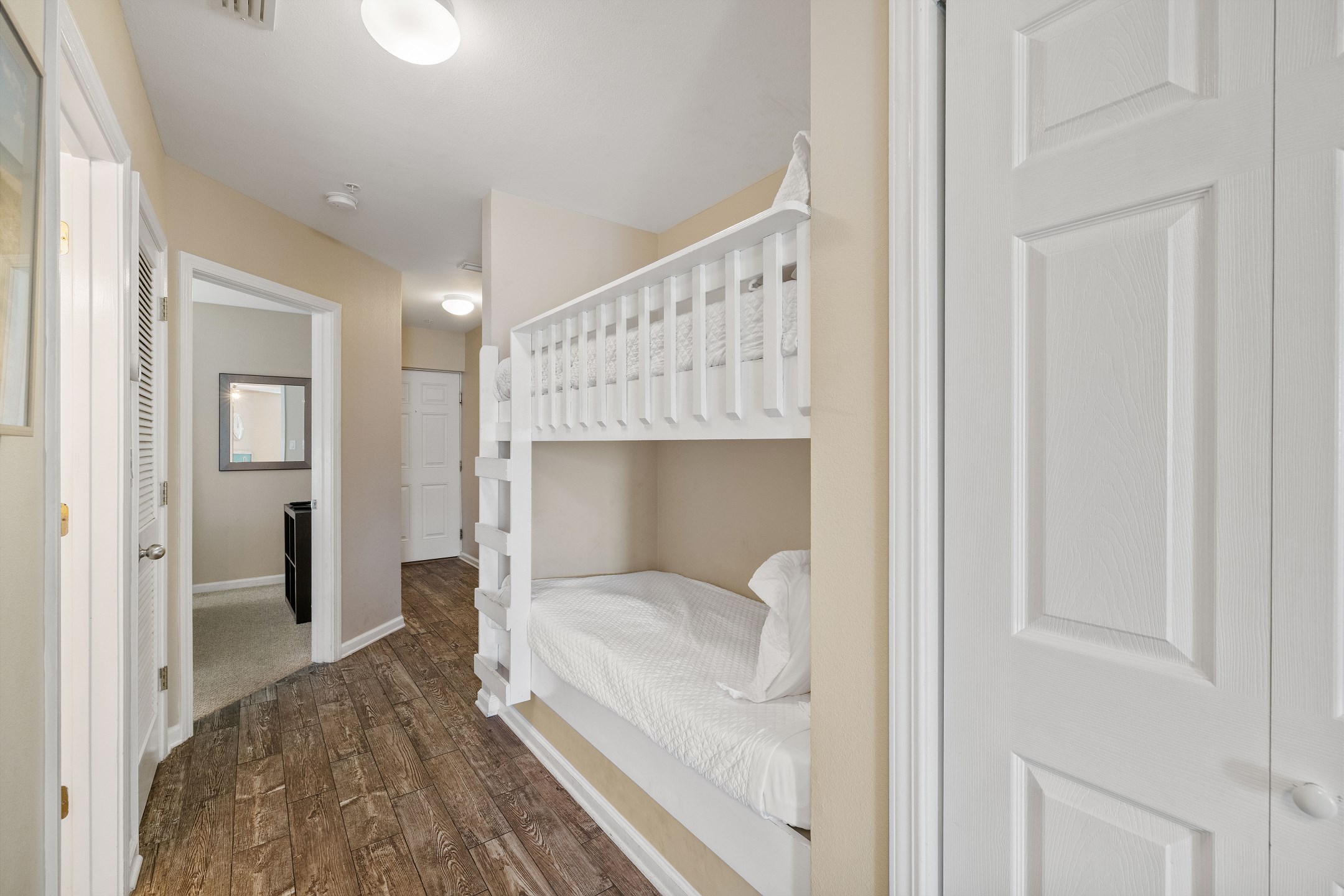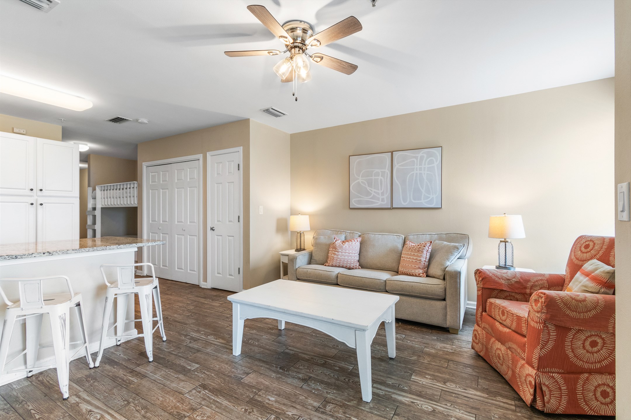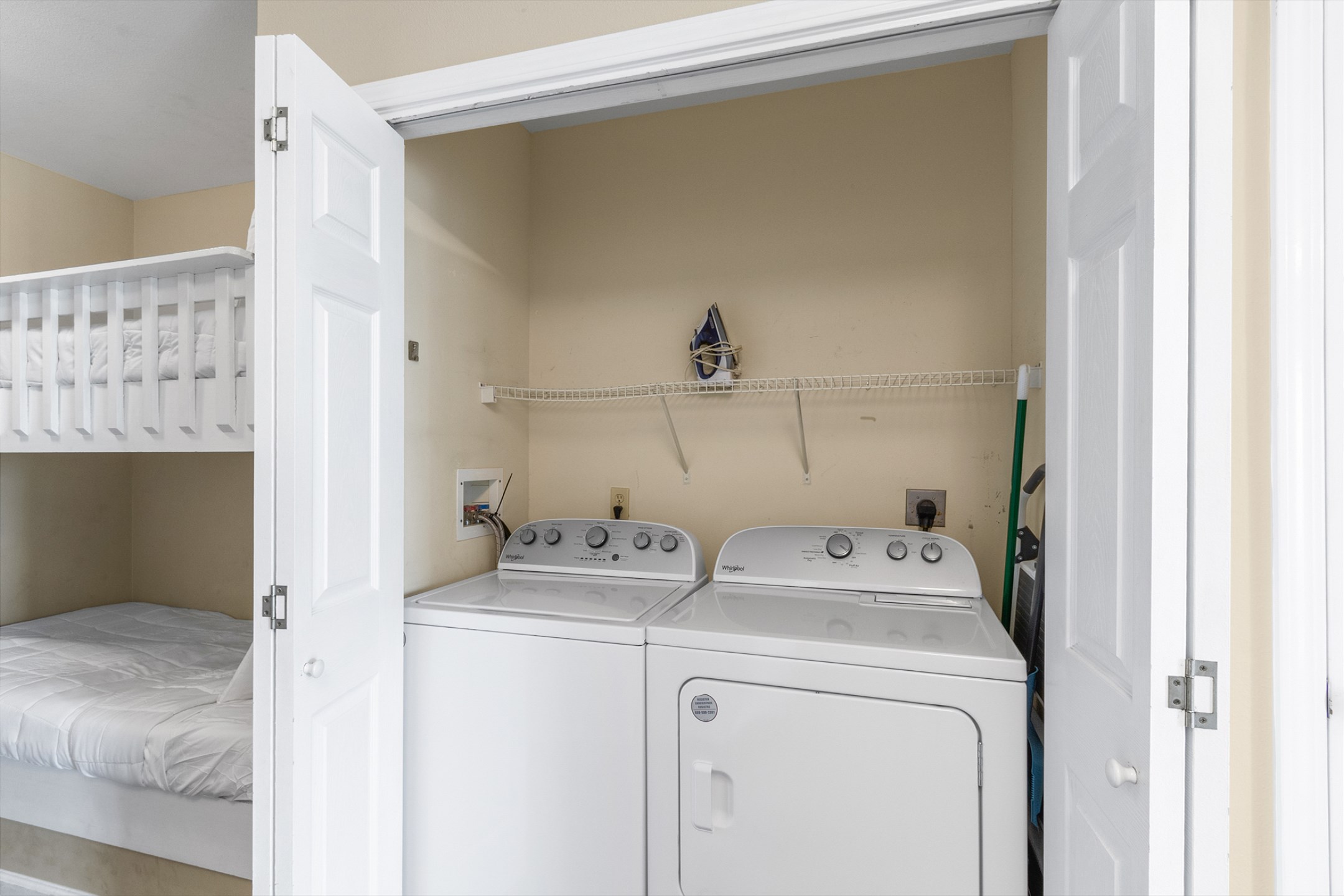 The primary bedroom features a cozy queen bed, while built-in twin-over-twin bunks in the hallway are perfect for kids or extra guests. A sleeper sofa in the living room offers additional sleeping accommodations. For added convenience, the unit includes a washer and dryer, so you can pack light and refresh with ease.