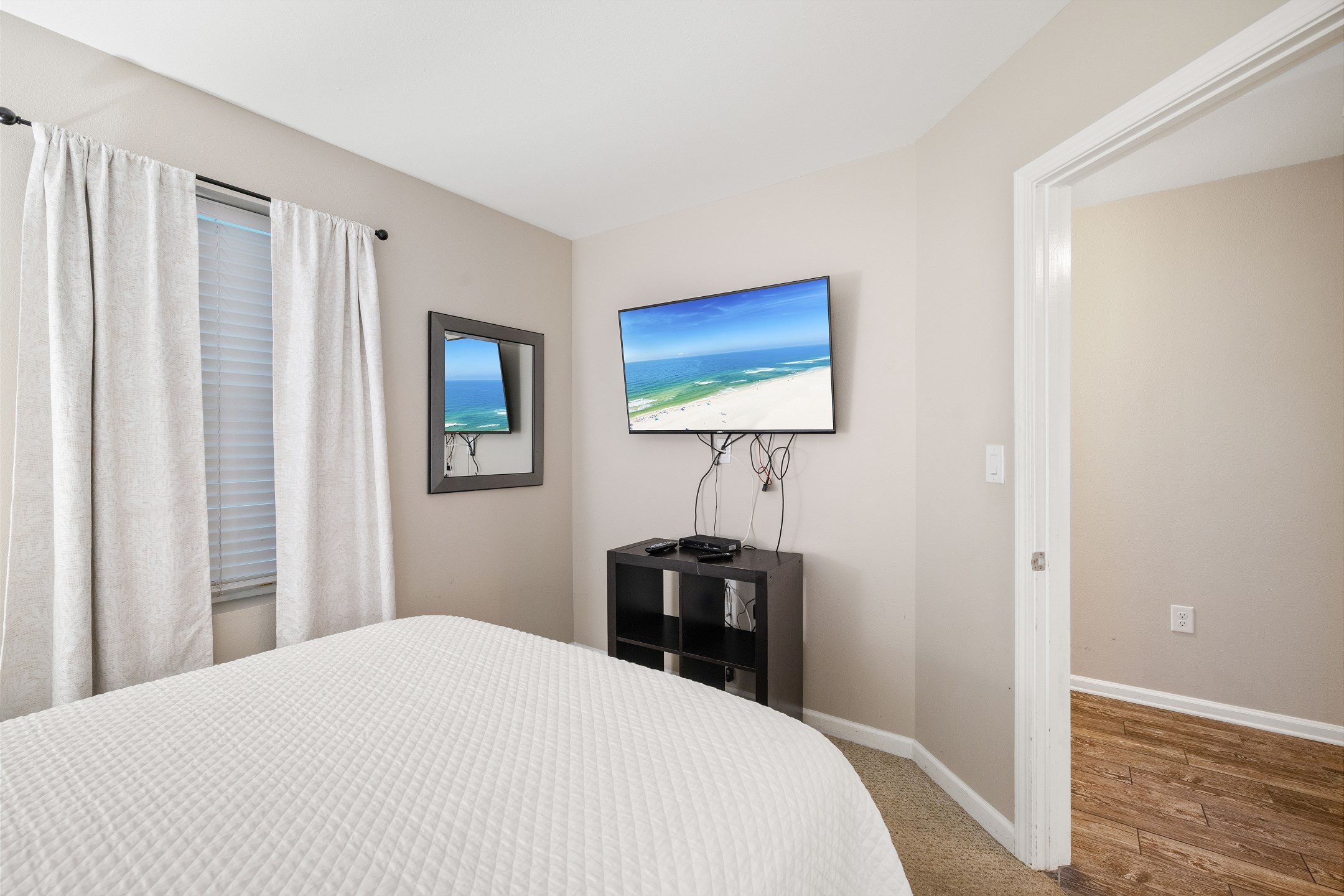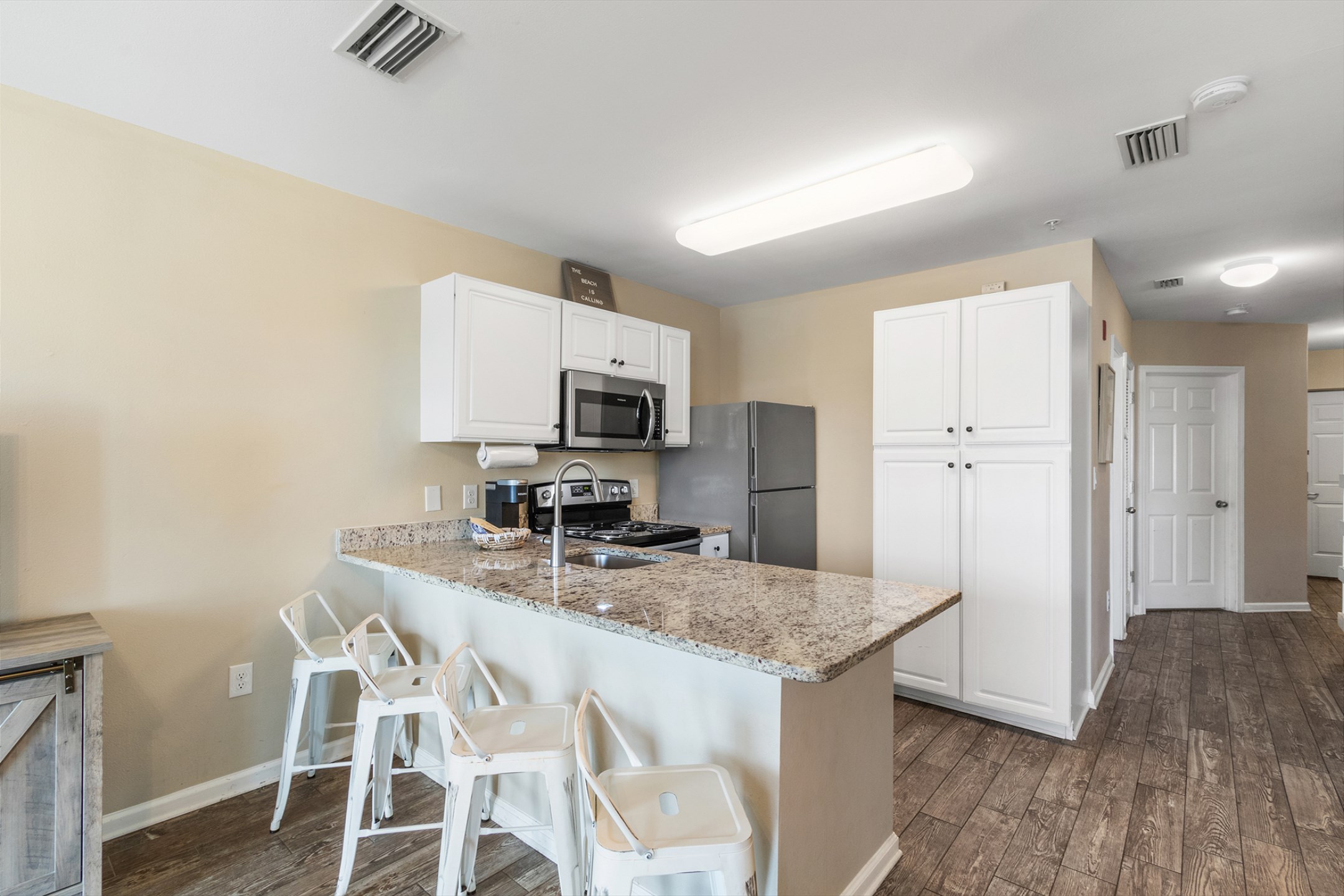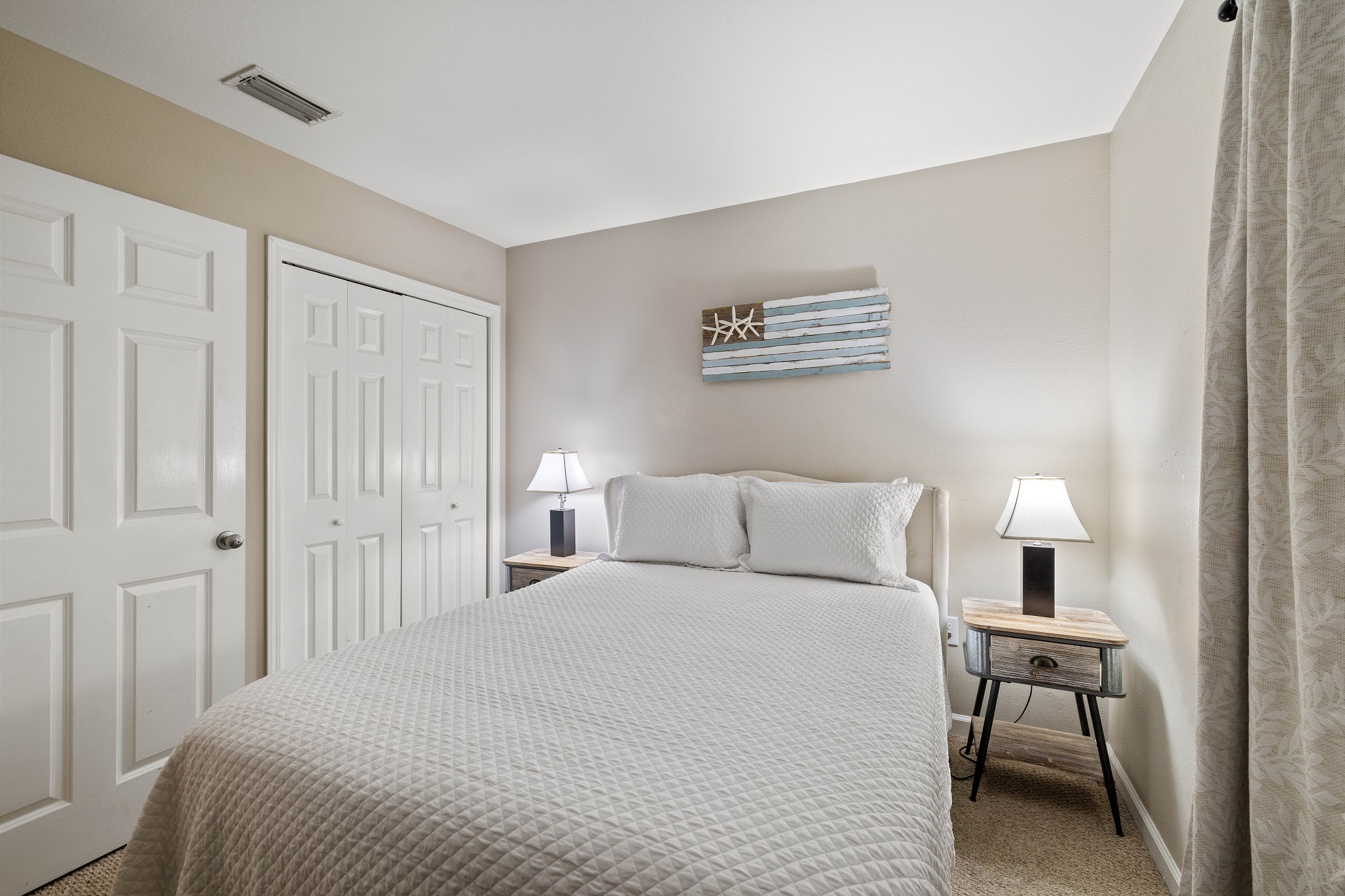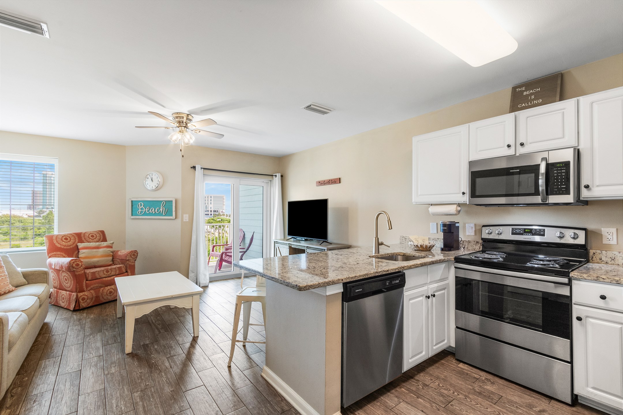 The primary bedroom features a cozy queen bed, while built-in twin-over-twin bunks in the hallway are perfect for kids or extra guests. A sleeper sofa in the living room offers additional sleeping accommodations. For added convenience, the unit includes a washer and dryer, so you can pack light and refresh with ease.