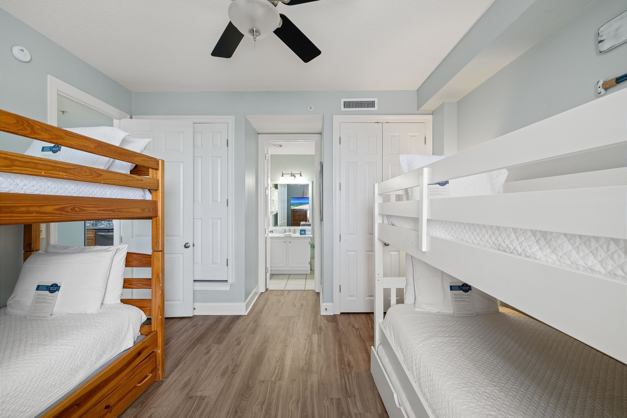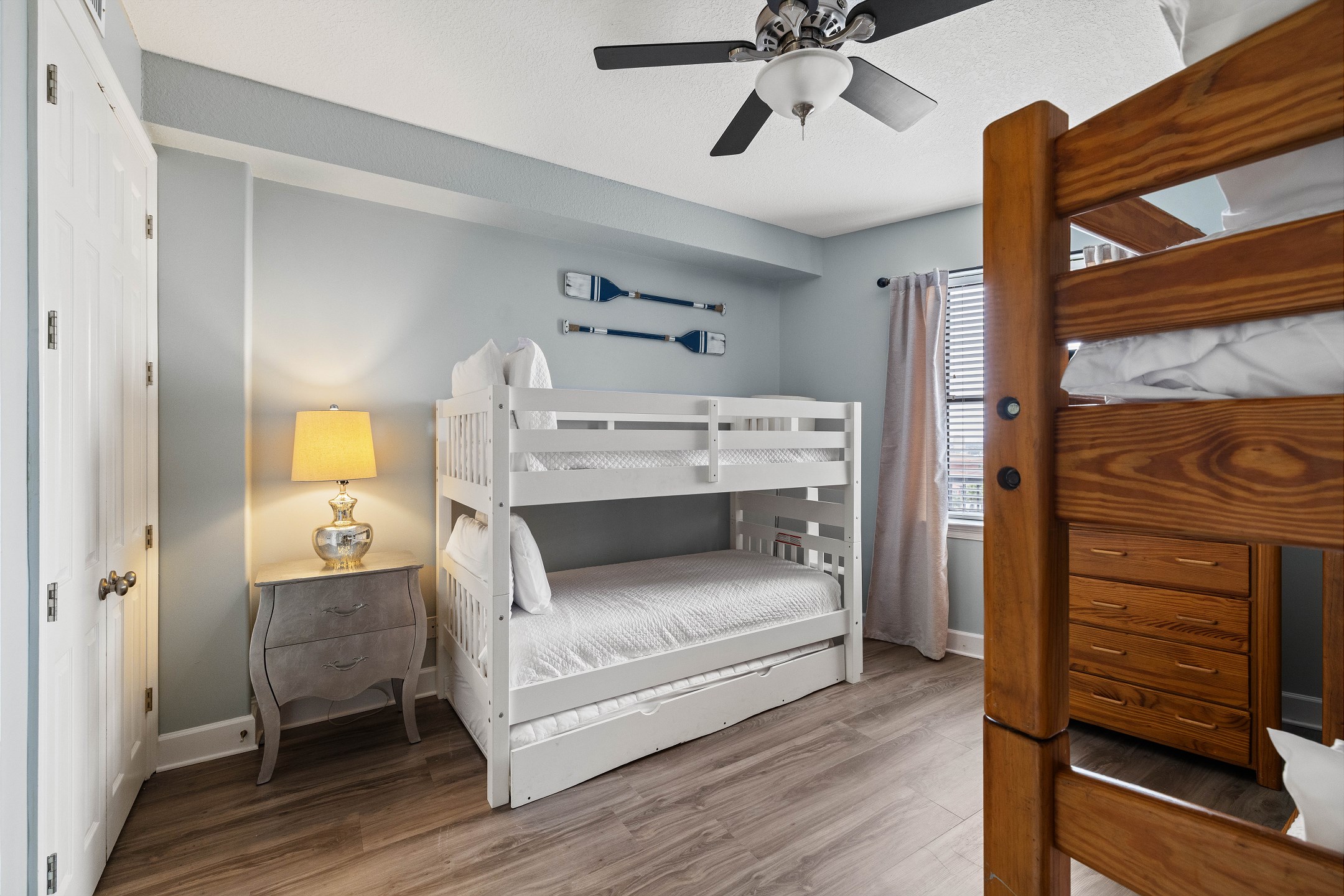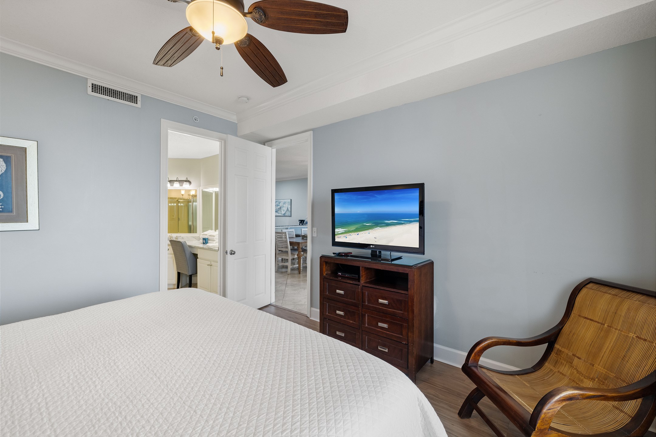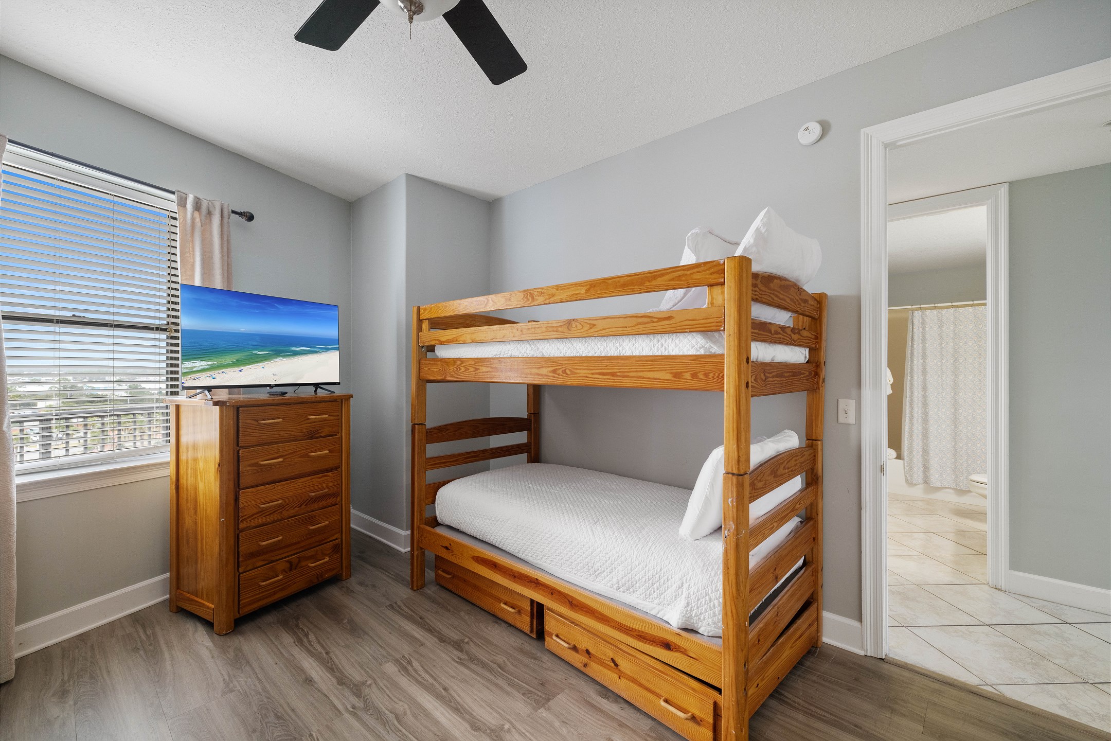 The Primary suite in this home away from home is a haven of relaxation, featuring a luxurious King bed, direct balcony access, and a flat-screen TV. The en-suite bath comes with a whirlpool tub and walk-in shower, adding an extra touch of indulgence. The second bedroom offers a comfortable Queen bed, while the third bedroom is perfect for younger guests or additional visitors, with a Twin bunk bed and a Twin trundle bed. Both rooms provide the comfort of a private bath and a flat-screen TV.