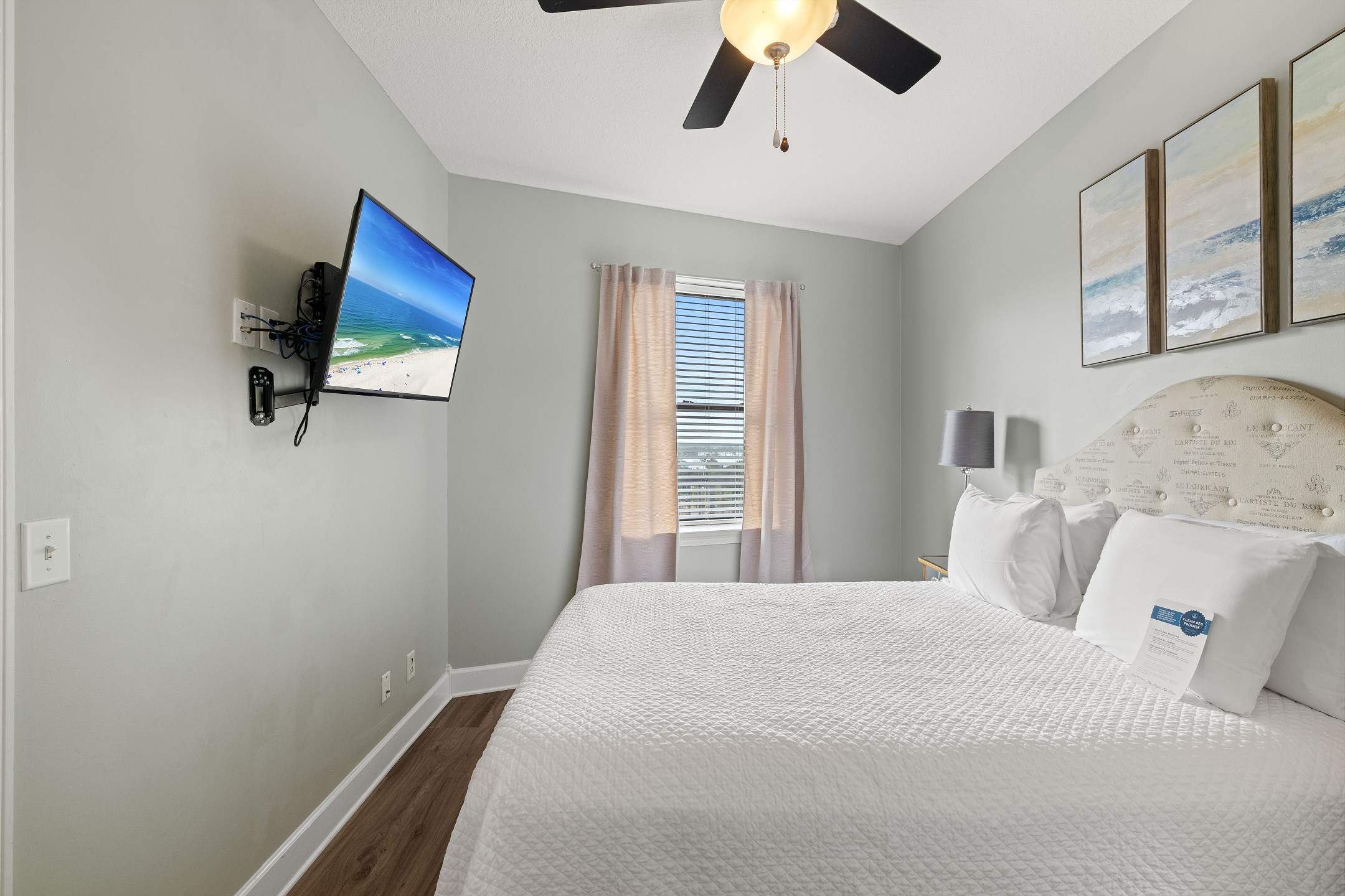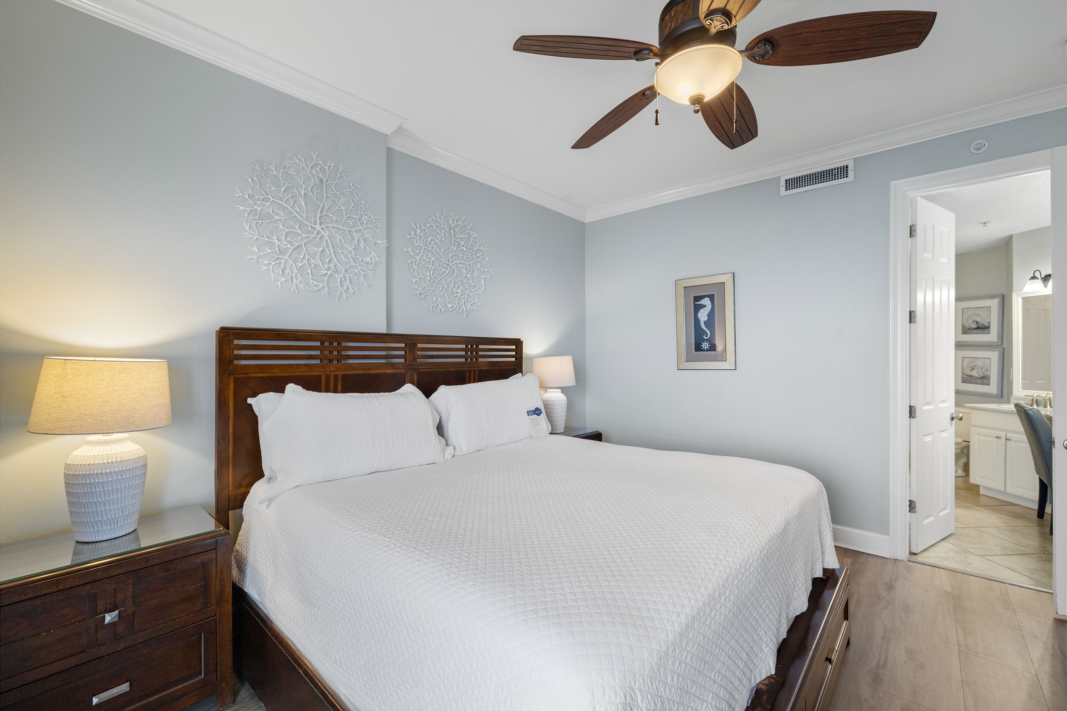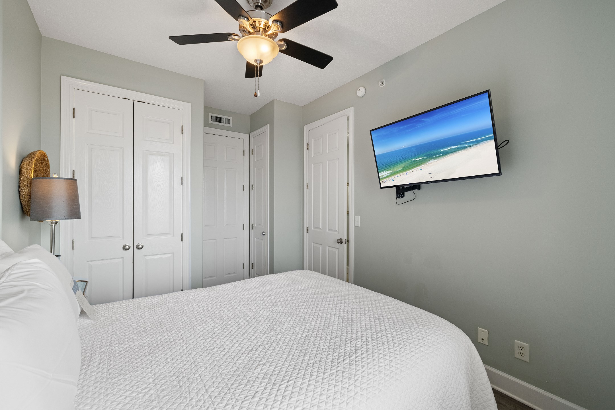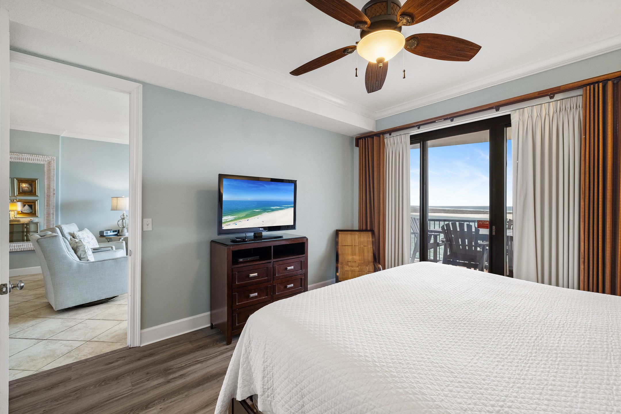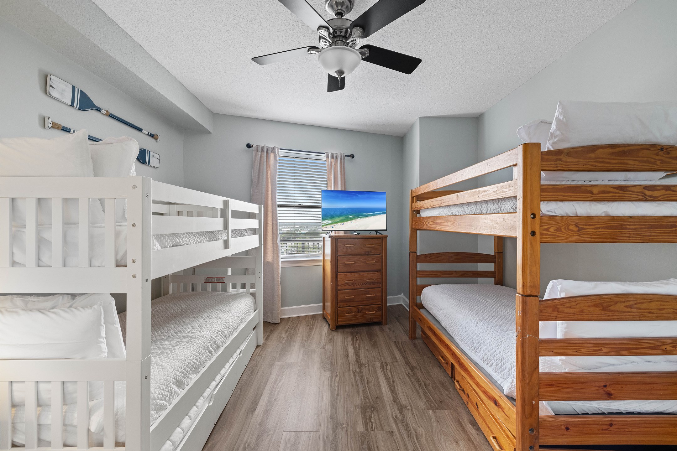 The Primary suite in this home away from home is a haven of relaxation, featuring a luxurious King bed, direct balcony access, and a flat-screen TV. The en-suite bath comes with a whirlpool tub and walk-in shower, adding an extra touch of indulgence. The second bedroom offers a comfortable Queen bed, while the third bedroom is perfect for younger guests or additional visitors, with a Twin bunk bed and a Twin trundle bed. Both rooms provide the comfort of a private bath and a flat-screen TV.