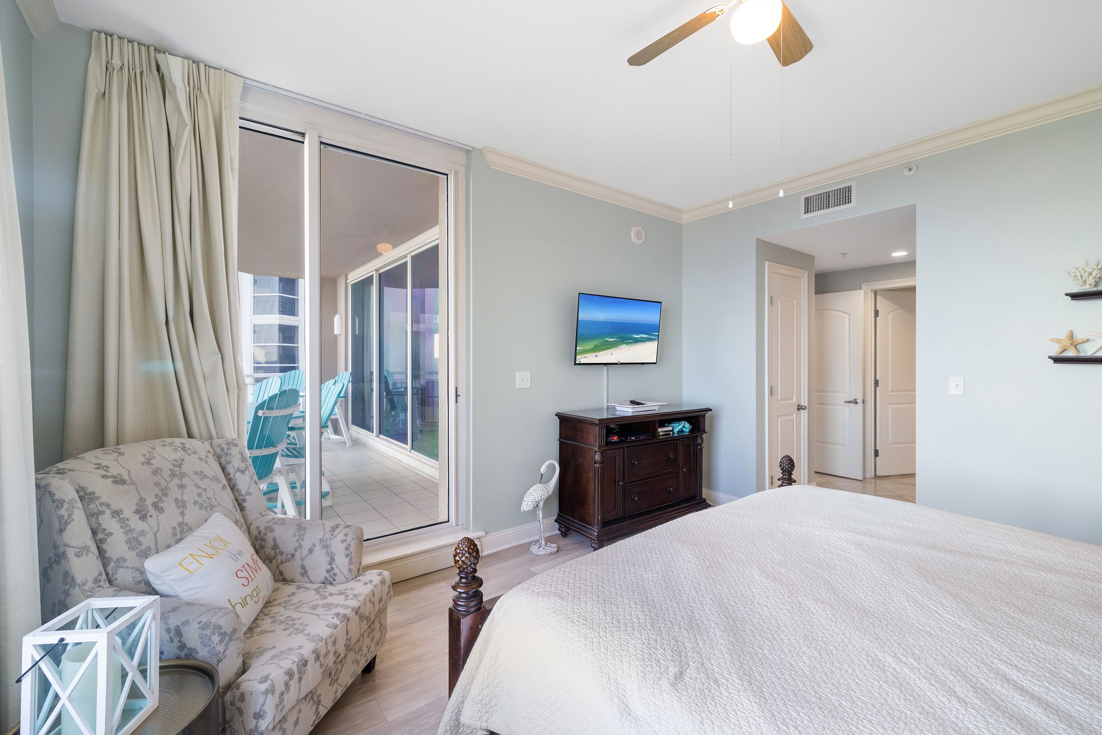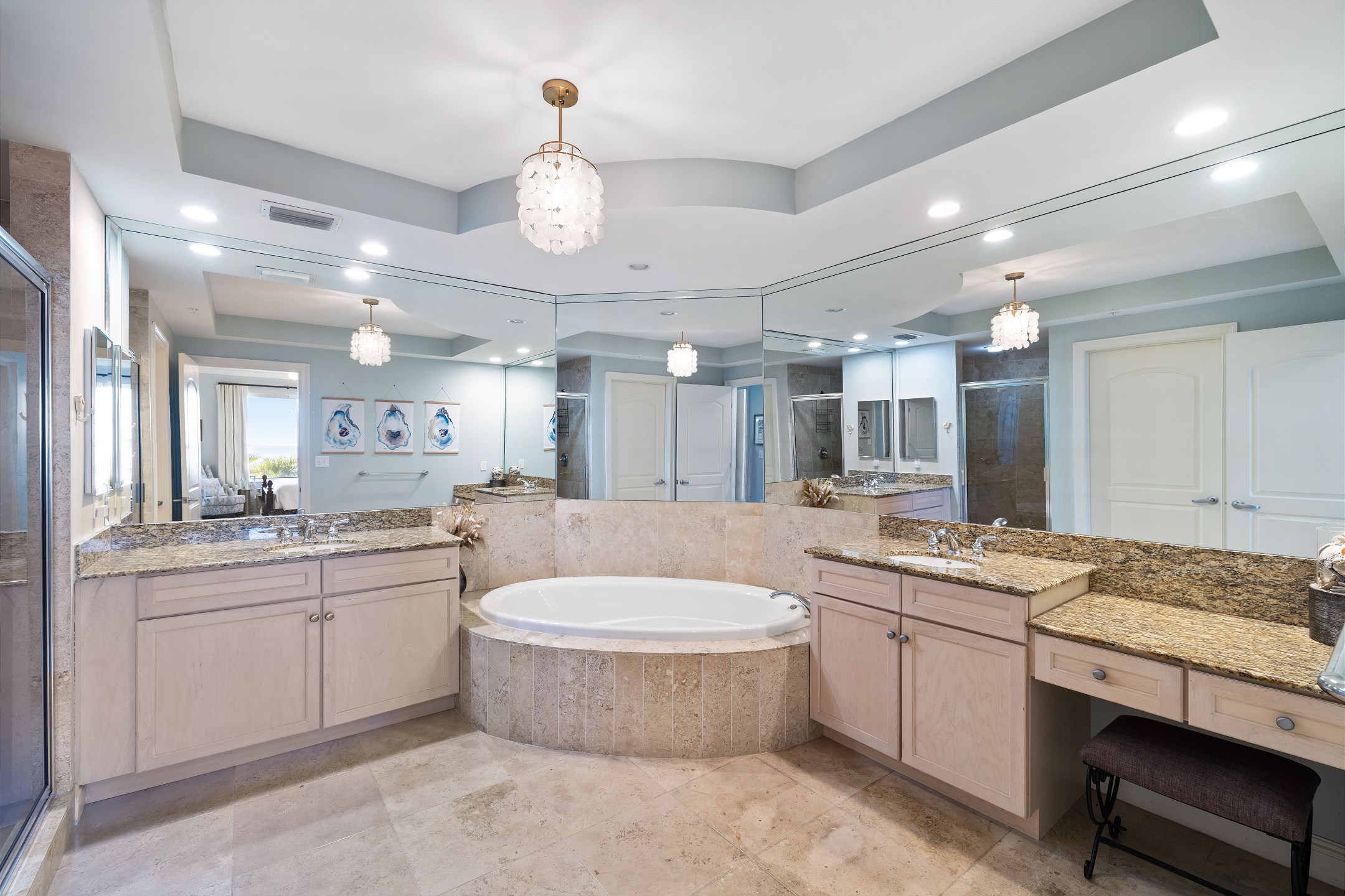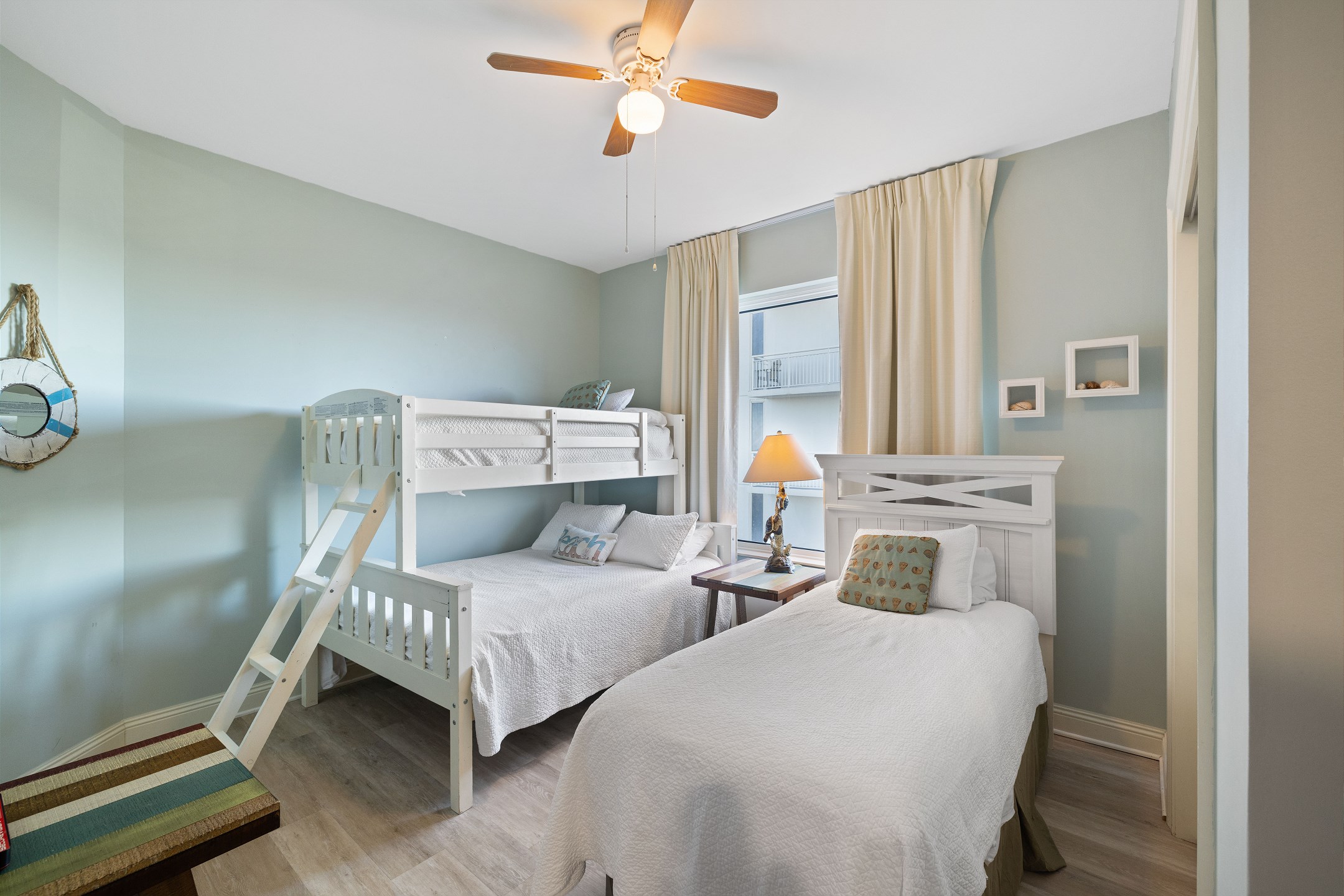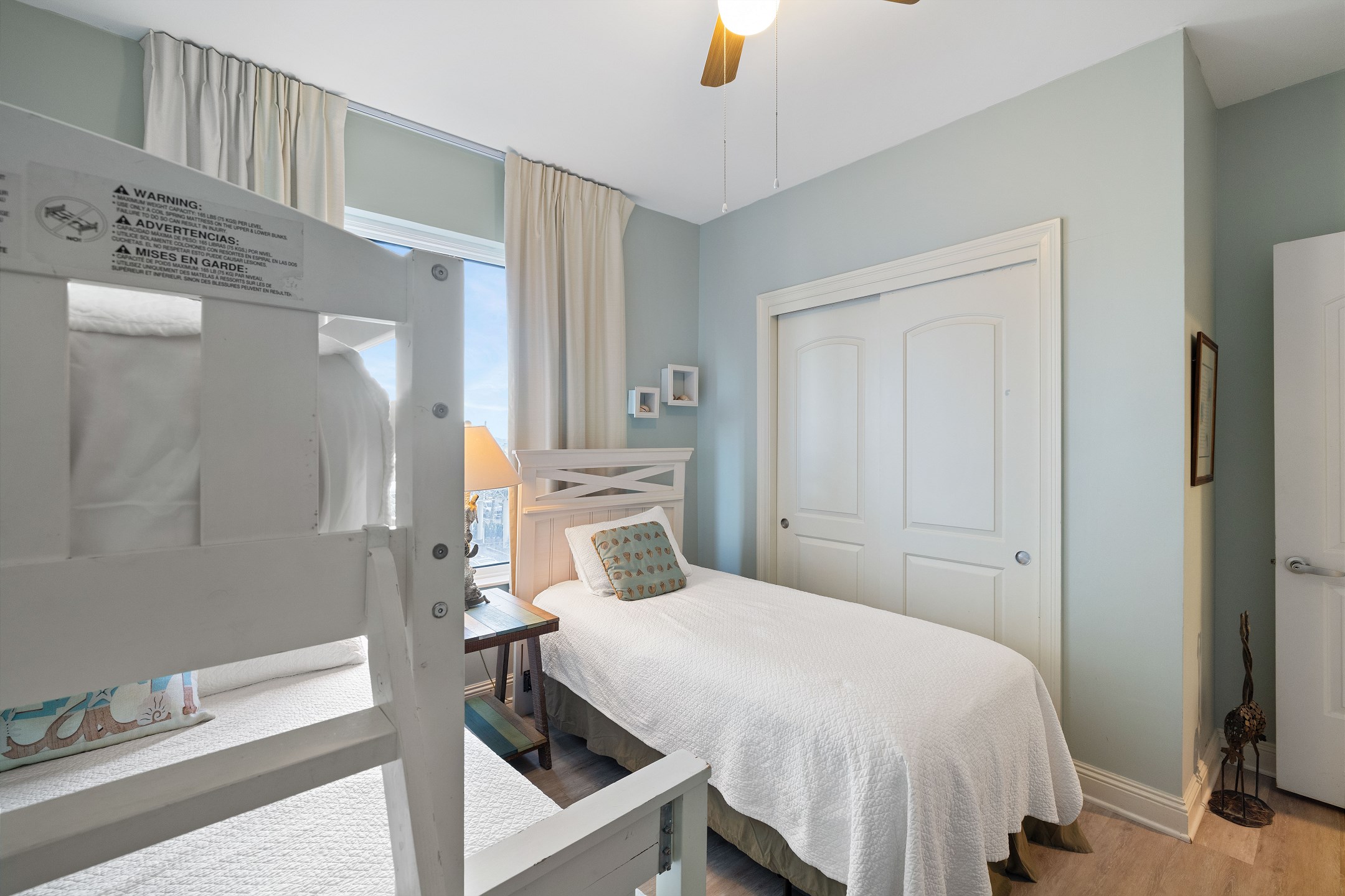 The primary bedroom is a relaxing retreat with a king bed, floor-to-ceiling windows leading out to the balcony, and a private ensuite bathroom featuring a jetted tub and a walk-in shower. The second bedroom also offers a king bed and an ensuite bathroom with granite countertops and a tiled shower tub combination. The third bedroom includes a twin over full bunk bed along with an additional twin bed, while the fourth bedroom features two twin beds, providing flexible sleeping options for families or groups.